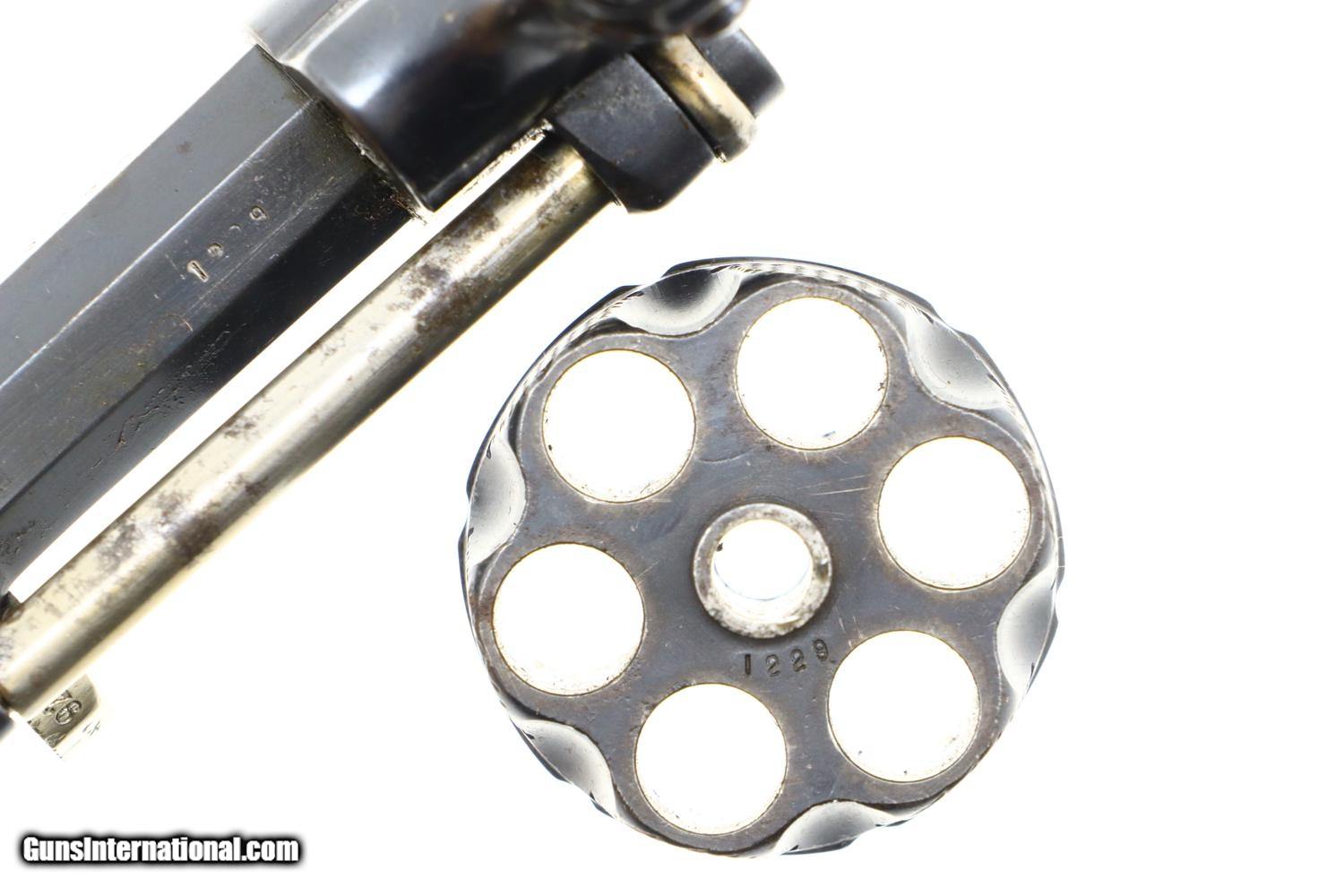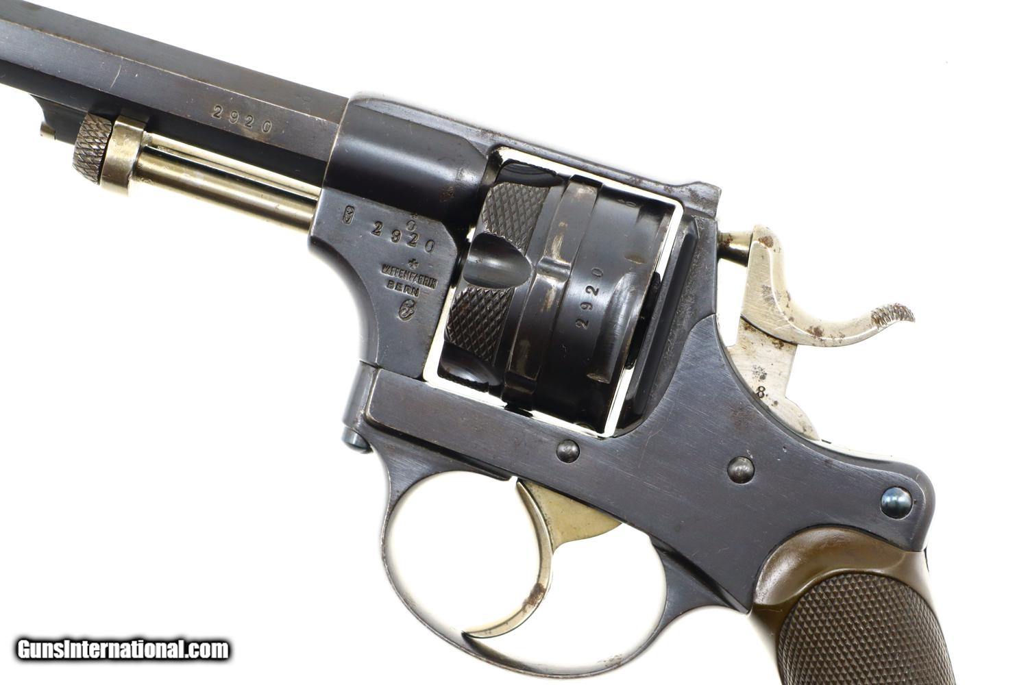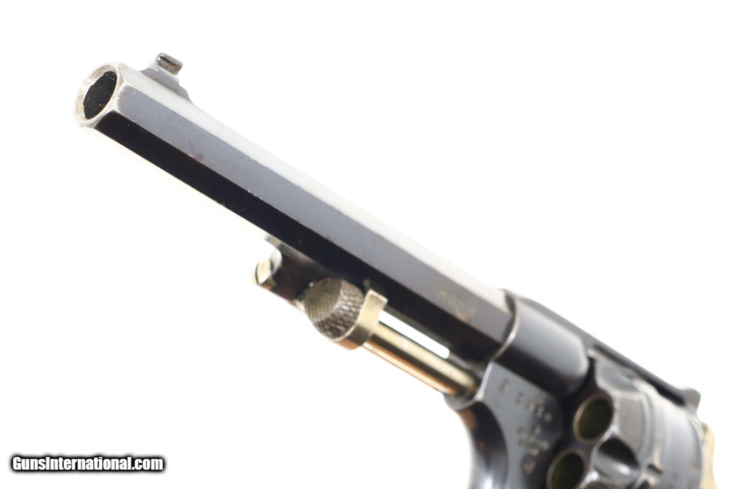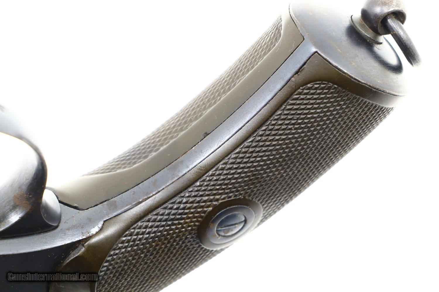 Description: Relatively scarce Swiss Bern 1878 military revolver in 10.4mm. Major components with original rust blue. Small parts strawed or fire blued. Cardinal serial number is 2920; matching assembly number is “1229”. Production was limited to 5000 units. Synopsis: Original Swiss Bern, Military Revolver, 1878, Matching, 10.4mm, ANTIQUE. Condition: VG original rust blue finish with browning/oxidation as carefully photographed. Small parts with faded straw or fire blue, flecks of oxidation. Crisp original grips. Bright near-mirror bore with strong rifling. Perfect manual mechanics with each cylinder properly indexing with tight lockup. A large, antique, Swiss Military revolver with original rust blue. ~~Insured shipping fee of $55; most packages shipped using FedEx 2nd Day.~~ SOLD Antique: Yes Manufacturer: Bern Serial Number: 2920 Caliber Info: 10.4mm |