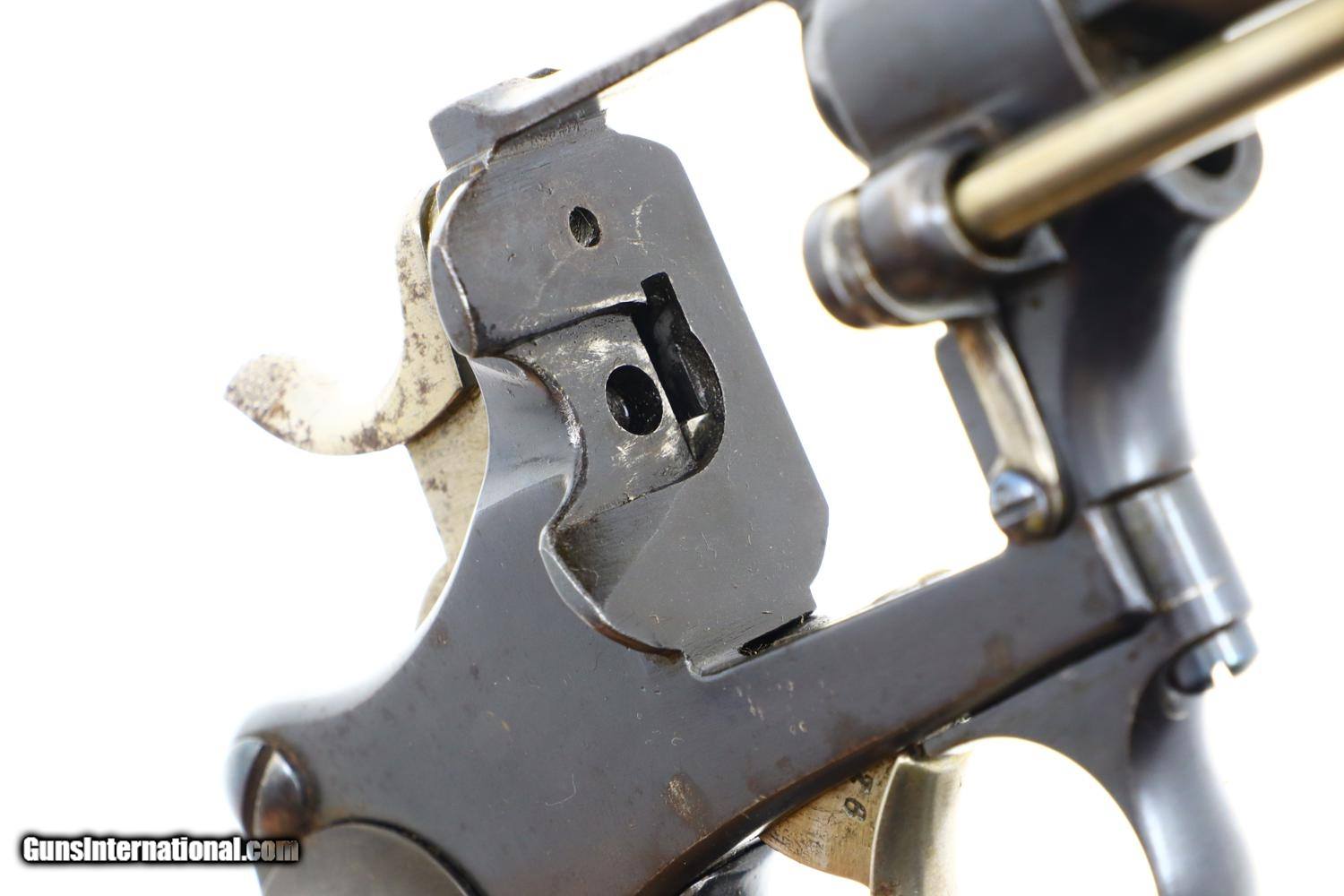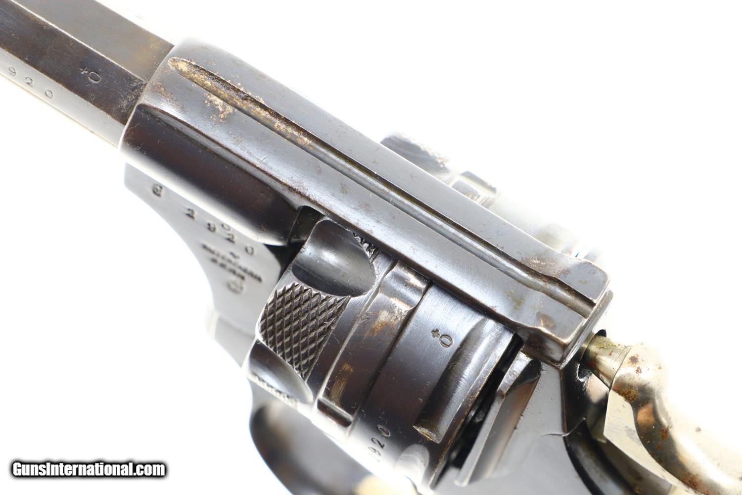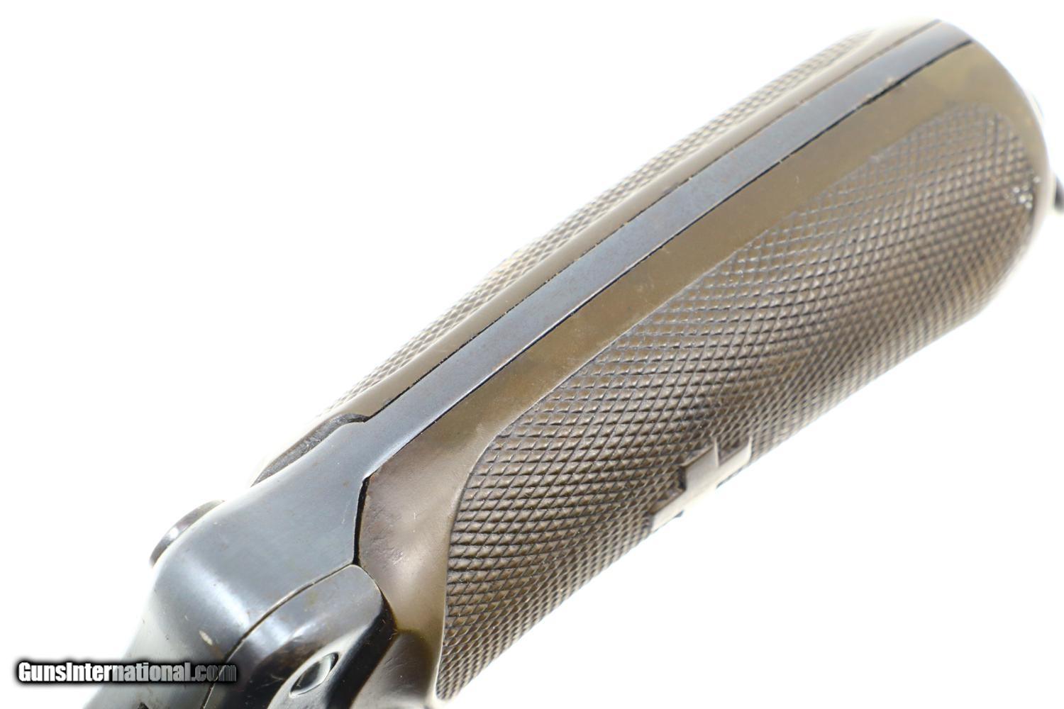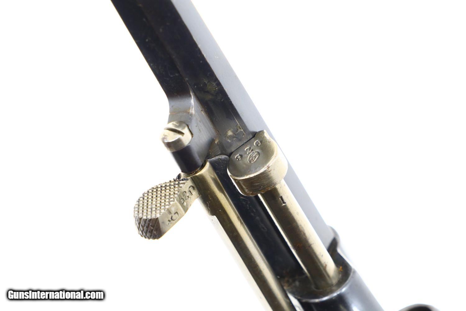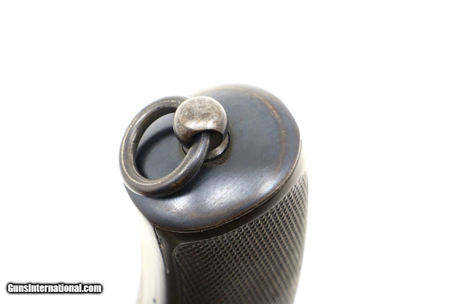 Description: Relatively scarce Swiss Bern 1878 military revolver in 10.4mm. Major components with original rust blue. Small parts strawed or fire blued. Cardinal serial number is 2920; matching assembly number is “1229”. Production was limited to 5000 units. Synopsis: Original Swiss Bern, Military Revolver, 1878, Matching, 10.4mm, ANTIQUE. Condition: VG original rust blue finish with browning/oxidation as carefully photographed. Small parts with faded straw or fire blue, flecks of oxidation. Crisp original grips. Bright near-mirror bore with strong rifling. Perfect manual mechanics with each cylinder properly indexing with tight lockup. A large, antique, Swiss Military revolver with original rust blue. ~~Insured shipping fee of $55; most packages shipped using FedEx 2nd Day.~~ SOLD Antique: Yes Manufacturer: Bern Serial Number: 2920 Caliber Info: 10.4mm |