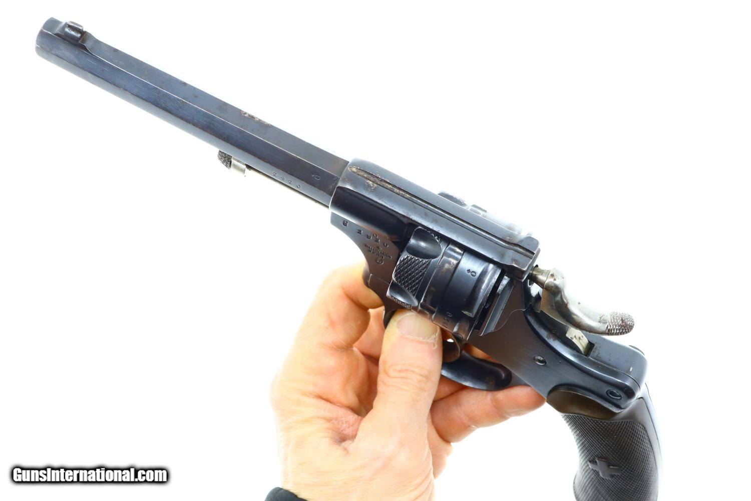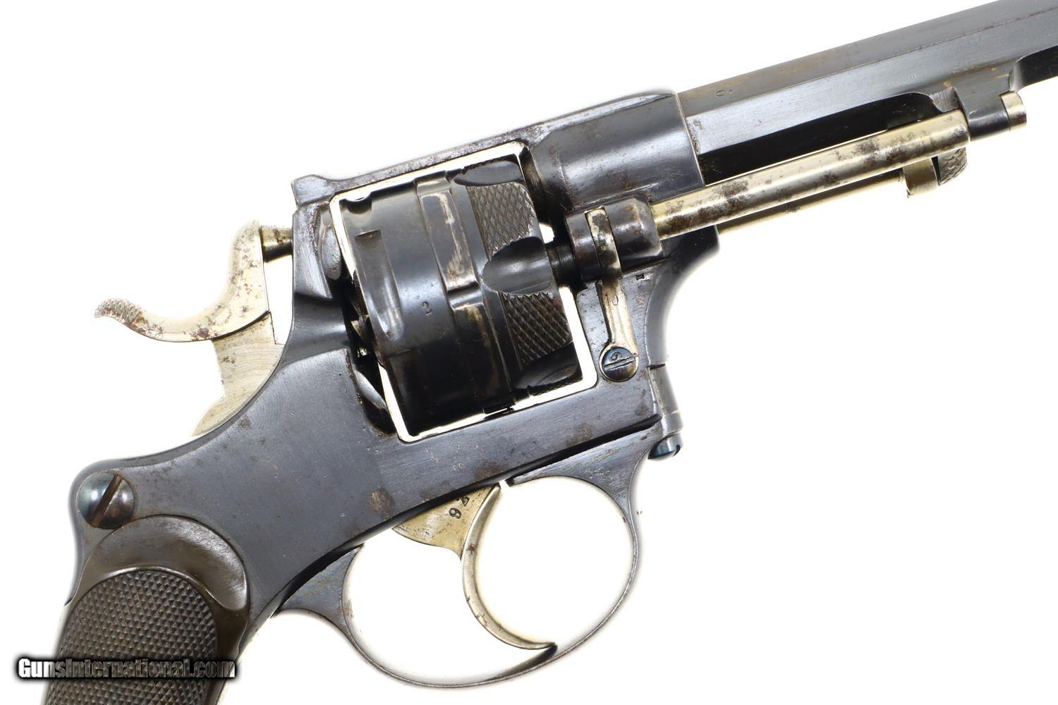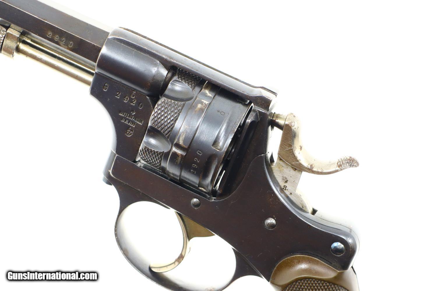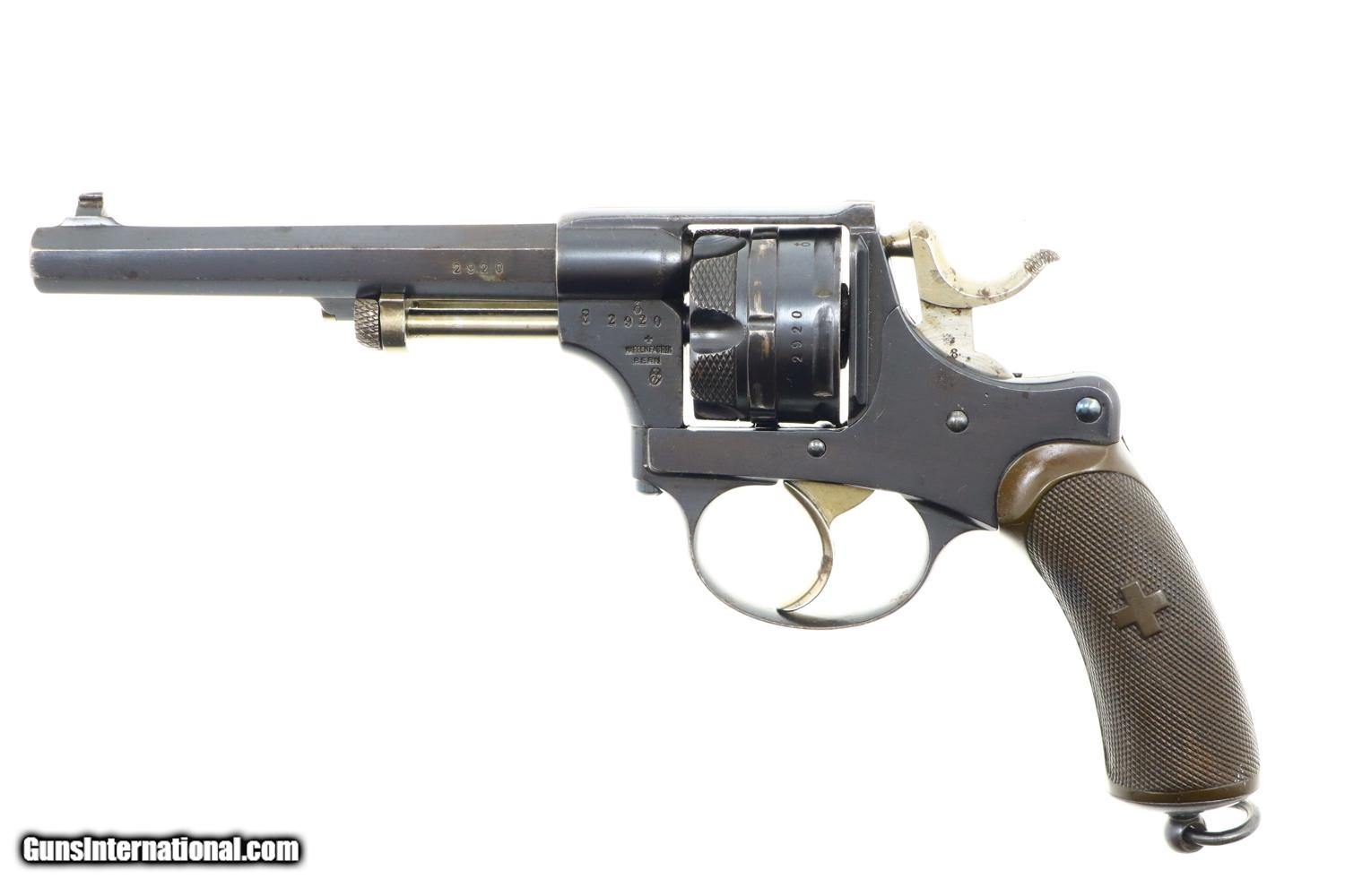 Description: Relatively scarce Swiss Bern 1878 military revolver in 10.4mm. Major components with original rust blue. Small parts strawed or fire blued. Cardinal serial number is 2920; matching assembly number is “1229”. Production was limited to 5000 units. Synopsis: Original Swiss Bern, Military Revolver, 1878, Matching, 10.4mm, ANTIQUE. Condition: VG original rust blue finish with browning/oxidation as carefully photographed. Small parts with faded straw or fire blue, flecks of oxidation. Crisp original grips. Bright near-mirror bore with strong rifling. Perfect manual mechanics with each cylinder properly indexing with tight lockup. A large, antique, Swiss Military revolver with original rust blue. ~~Insured shipping fee of $55; most packages shipped using FedEx 2nd Day.~~ SOLD Antique: Yes Manufacturer: Bern Serial Number: 2920 Caliber Info: 10.4mm |