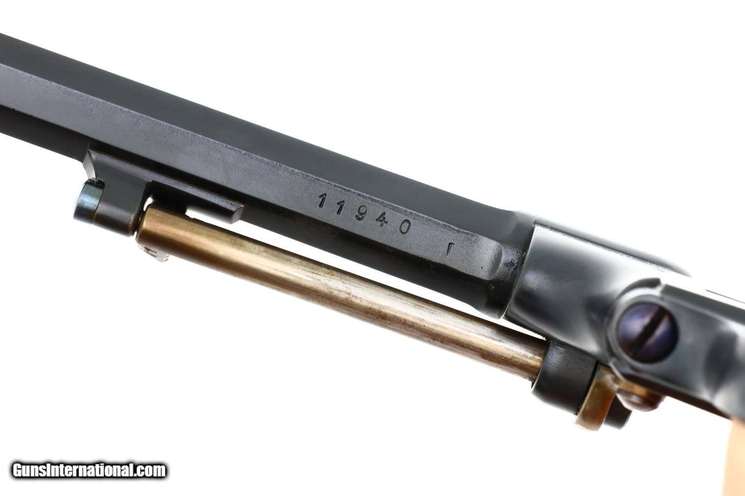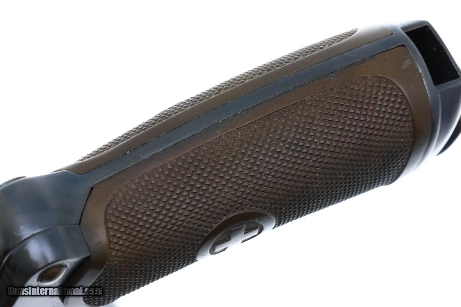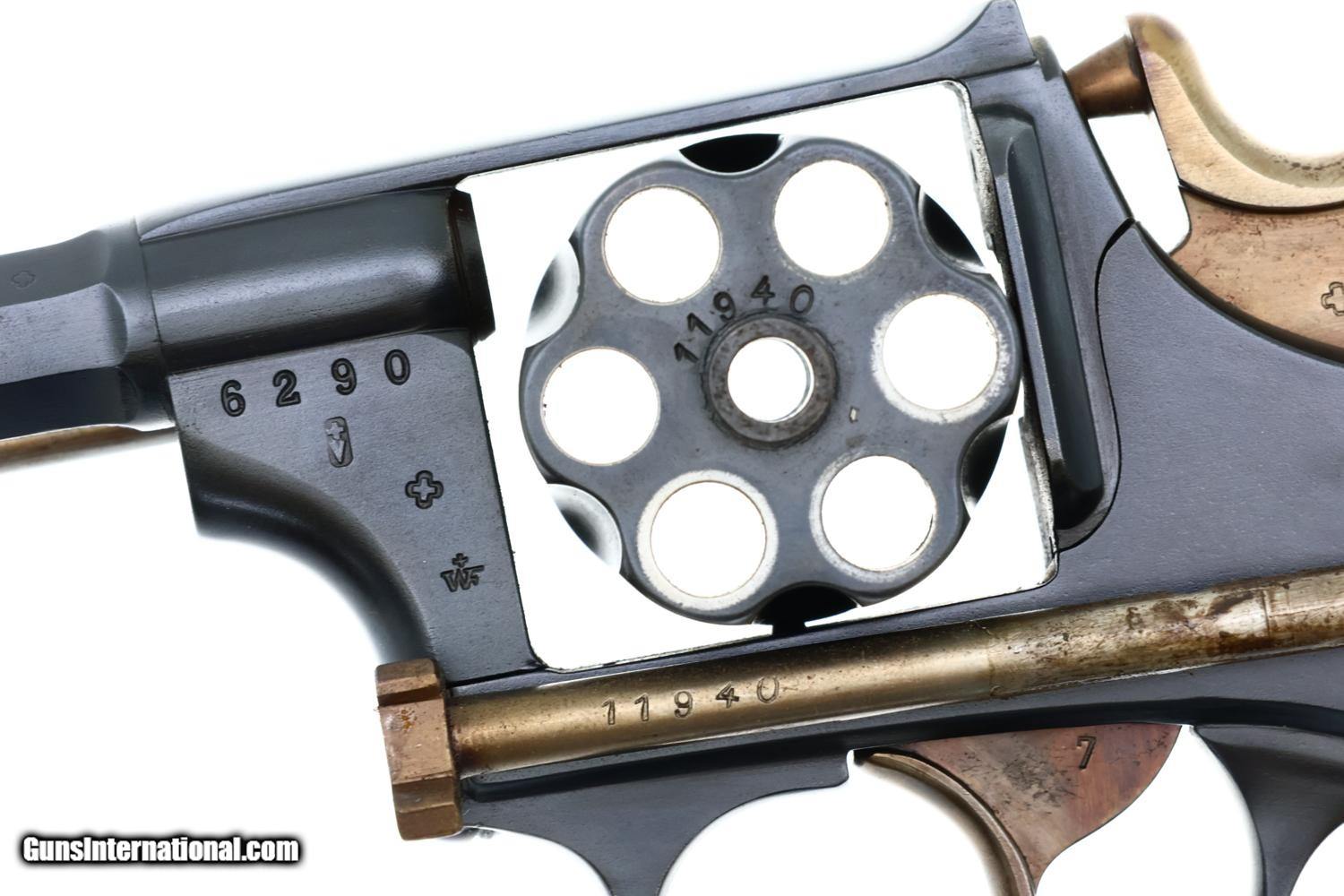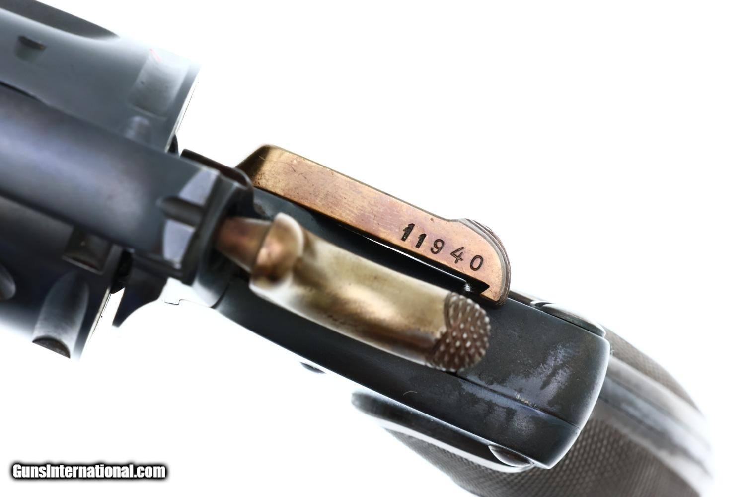 Description: Synopsis: Attractive, All Matching, Arsenal Reworked Bern 1882 Swiss Military Revolver, cal. 7.5mm THAT IS AN ANTIQUE! Description: Standard early configuration Waffenfabrik Bern Model 1882 Military Revolver with thin top strap, chambered in 7.5mm, having a 6" octagonal barrel with fixed front and notched rear sight. Waffenfabrik Bern logo on left side of frame under the full serial number 6290, the serial number repeated on left side of barrel, cylinder axle, ejector rod, hammer, and trigger. Separate assembly numbers on various parts most notably ‘11940’. Original hard rubber grips, left panel molded with Swiss Cross enclosed by checkered field. Single transverse screw. Lanyard ring present. Condition: Revolver retains virtually all of its re-applied Arsenal rust blue, the muzzle having been re-crowned and in-the-white. Comparable condition re-strawed small parts. The cylinder axle having file marks on the lower surface under the straw. Bright bore with sharp rifling. Correct manual mechanics with all cylinder lockings up super tightly on full cock (No play whatsoever)! SOLD Manufacturer: Waffenfabrik Bern Model: Model 1882 Serial Number: 6290 Caliber Info: 7.5mm Revolver Condition: EXC |