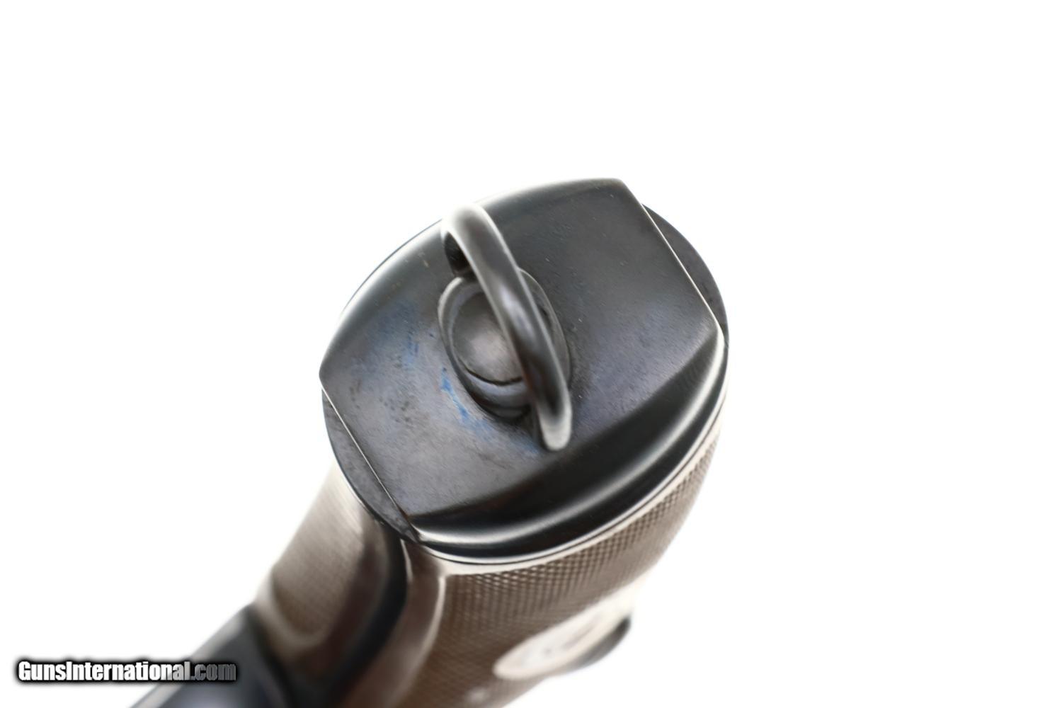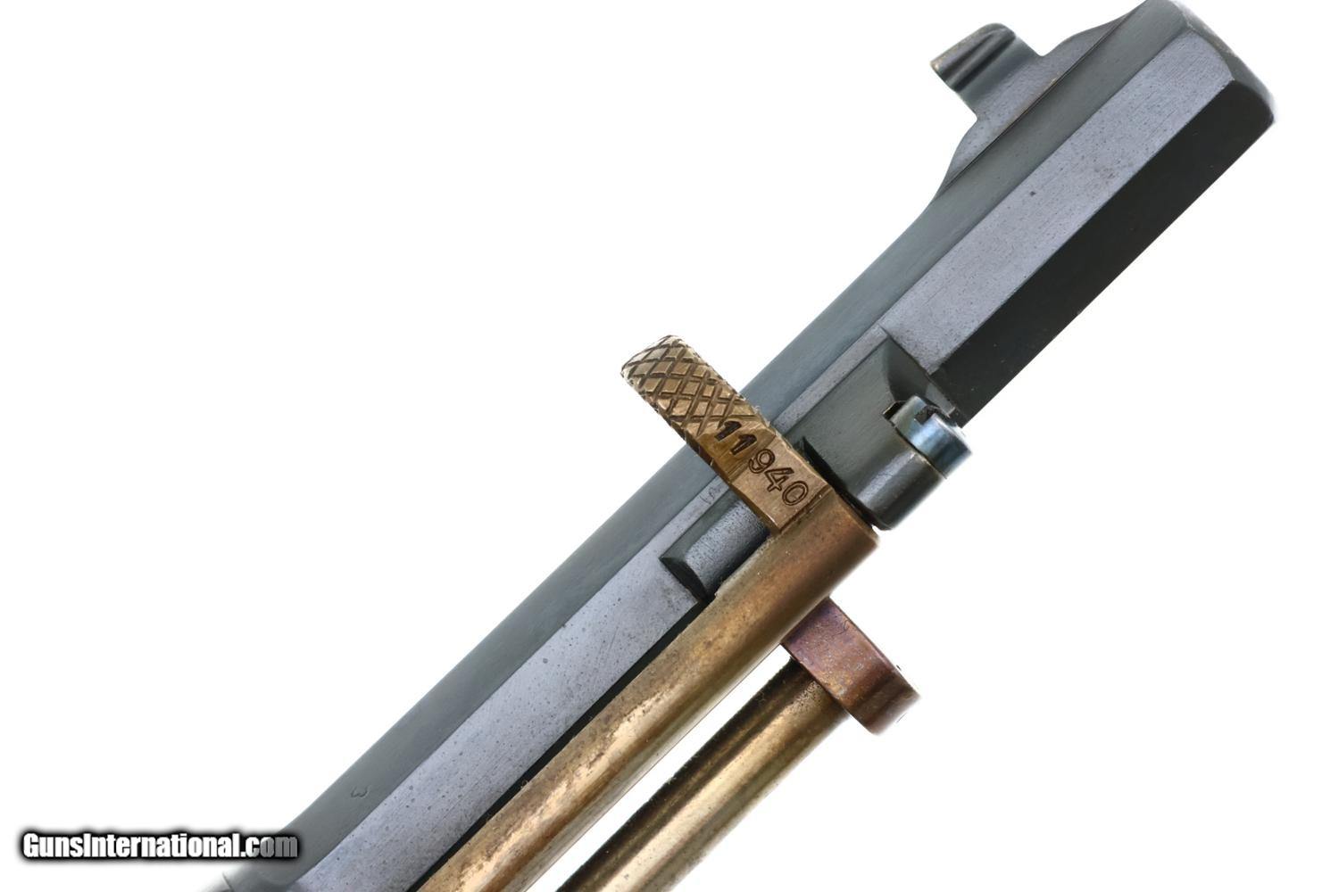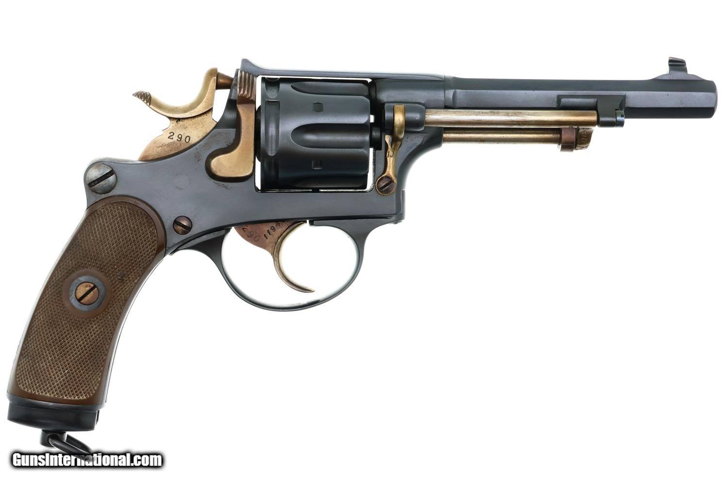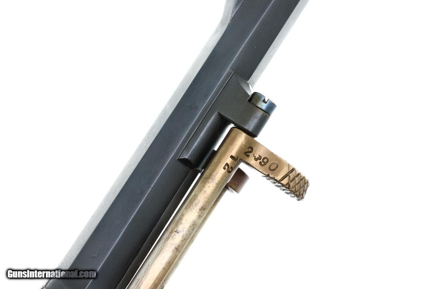 Description: Synopsis: Attractive, All Matching, Arsenal Reworked Bern 1882 Swiss Military Revolver, cal. 7.5mm THAT IS AN ANTIQUE! Description: Standard early configuration Waffenfabrik Bern Model 1882 Military Revolver with thin top strap, chambered in 7.5mm, having a 6" octagonal barrel with fixed front and notched rear sight. Waffenfabrik Bern logo on left side of frame under the full serial number 6290, the serial number repeated on left side of barrel, cylinder axle, ejector rod, hammer, and trigger. Separate assembly numbers on various parts most notably ‘11940’. Original hard rubber grips, left panel molded with Swiss Cross enclosed by checkered field. Single transverse screw. Lanyard ring present. Condition: Revolver retains virtually all of its re-applied Arsenal rust blue, the muzzle having been re-crowned and in-the-white. Comparable condition re-strawed small parts. The cylinder axle having file marks on the lower surface under the straw. Bright bore with sharp rifling. Correct manual mechanics with all cylinder lockings up super tightly on full cock (No play whatsoever)! SOLD Manufacturer: Waffenfabrik Bern Model: Model 1882 Serial Number: 6290 Caliber Info: 7.5mm Revolver Condition: EXC |
