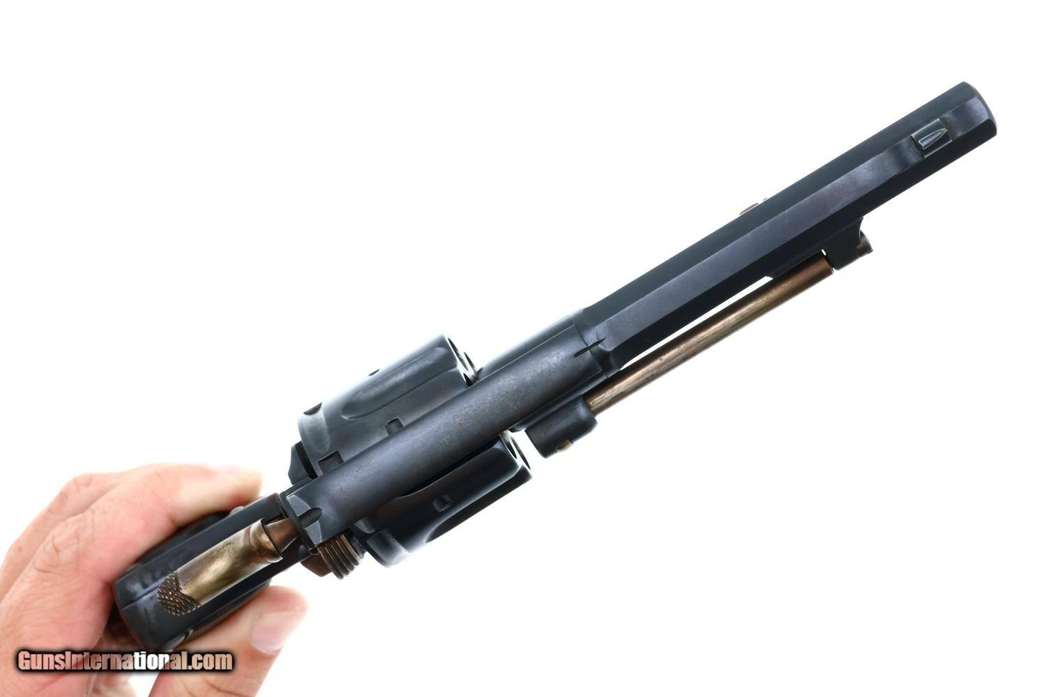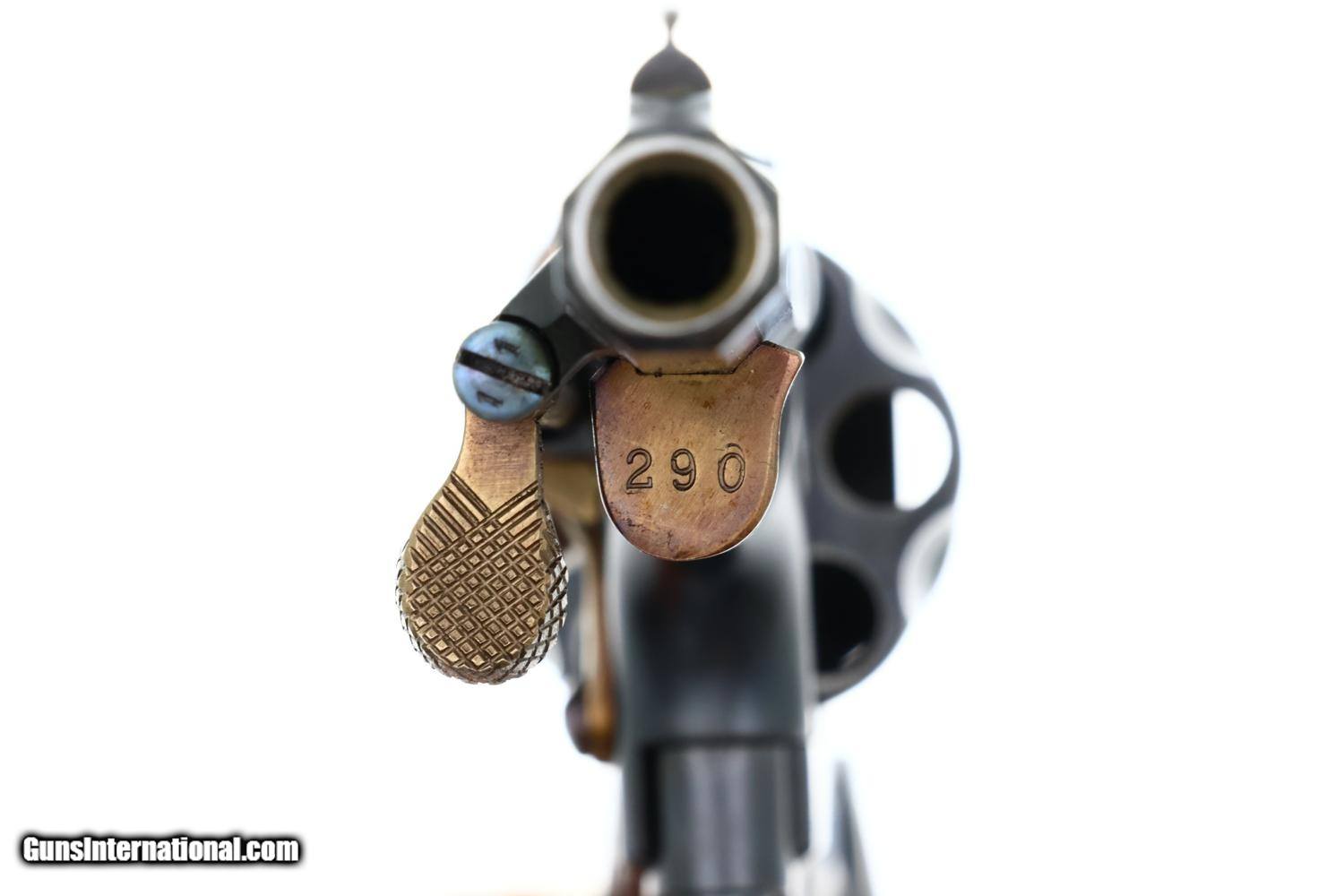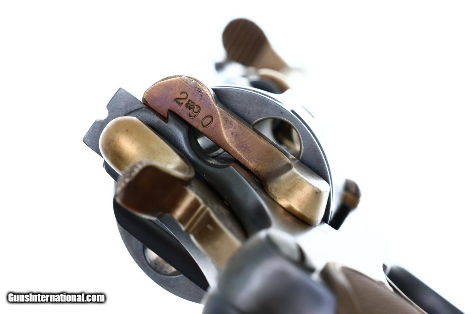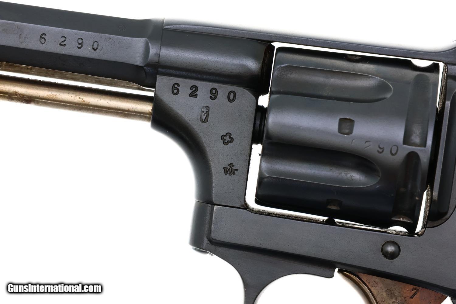 Description: Synopsis: Attractive, All Matching, Arsenal Reworked Bern 1882 Swiss Military Revolver, cal. 7.5mm THAT IS AN ANTIQUE! Description: Standard early configuration Waffenfabrik Bern Model 1882 Military Revolver with thin top strap, chambered in 7.5mm, having a 6" octagonal barrel with fixed front and notched rear sight. Waffenfabrik Bern logo on left side of frame under the full serial number 6290, the serial number repeated on left side of barrel, cylinder axle, ejector rod, hammer, and trigger. Separate assembly numbers on various parts most notably ‘11940’. Original hard rubber grips, left panel molded with Swiss Cross enclosed by checkered field. Single transverse screw. Lanyard ring present. Condition: Revolver retains virtually all of its re-applied Arsenal rust blue, the muzzle having been re-crowned and in-the-white. Comparable condition re-strawed small parts. The cylinder axle having file marks on the lower surface under the straw. Bright bore with sharp rifling. Correct manual mechanics with all cylinder lockings up super tightly on full cock (No play whatsoever)! SOLD Antique: Yes Manufacturer: Waffenfabrik Bern Model: Model 1882 Serial Number: 6290 Caliber Info: 7.5mm Revolver Condition: EXC |