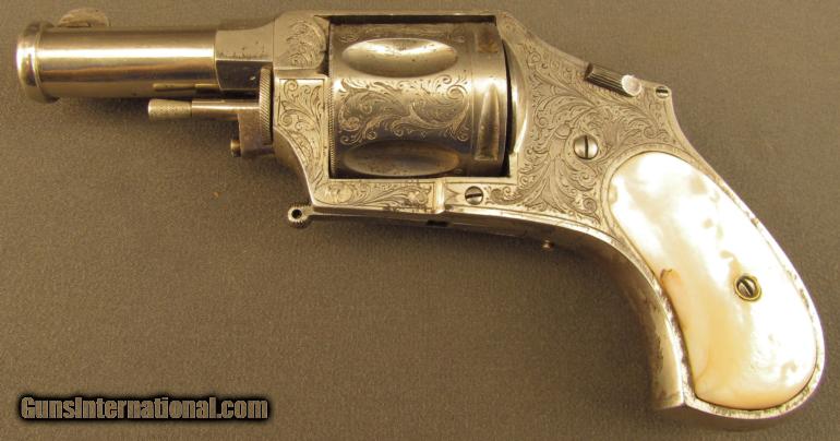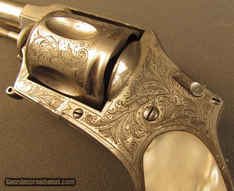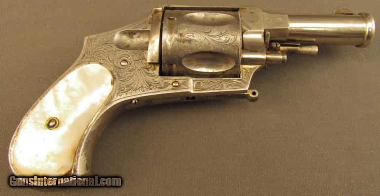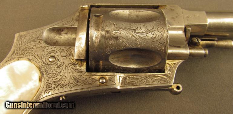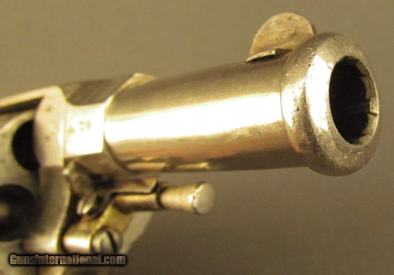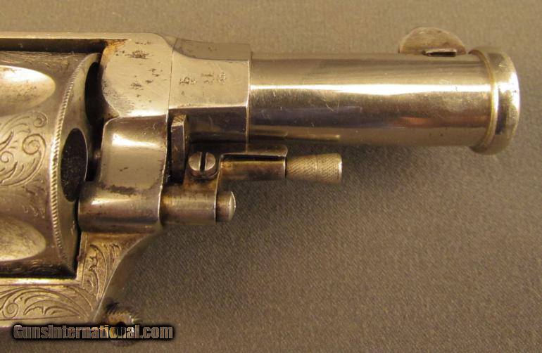 Description: Assembly #3, .44 Caliber CF, 2 3/4" barrel with cannon muzzle and a very good bore with some minor freckling within the grooves. This is an interesting, Liege-proofed revolver that has a folding trigger, manual safety, and coverage floral scroll engraving. The metal retains 85% plus of the original nickel plated finish with the balance of the metal flaked to a lightly mottled pewter gray patina. Additionally, there are traces of the original gold wash finish remaining on the trigger, right front of the frame below the ejector, and on the swiveling ejector housing itself. The topstrap is engraved "J. NIKITITS ERBEN/CONSTANTINOPLE" and there are extensive Belgian proofs on both the frame and cylinder. The genuine mother-of-pearl grips are in very good condition with a single small chip missing from the toe of the butt on the right side panel. The revolver lock-up is still tight and the mechanism functions flawlessly. The entry in "Heer Der Neue St'ckel Vol. 2"; (1979), lists Nikitits Erben as a revolver maker and retailer ca. 1860 who sold Colt firearms. A check of the internet reveals firearms marked "J. NIKITITS ERBEN/ISTANBUL" which would mean that the company was in business at least until 1930 when Turkey officially adopted the name "Istanbul" over "Constantinople" for its largest city. This is a beautiful and and rare revolver with unusual features that has lots of original finish remaining in addition to a seldom seen Ottoman Turkish retailer's marking. It would make a great addition to any collection of high grade revolvers or European firearms. Antique SOLD Antique: Yes Manufacturer: J. Nikitits Erben Model: Folding Trigger Serial Number: 3 Caliber Info: .44 CF Gauge Info: .44 CF |