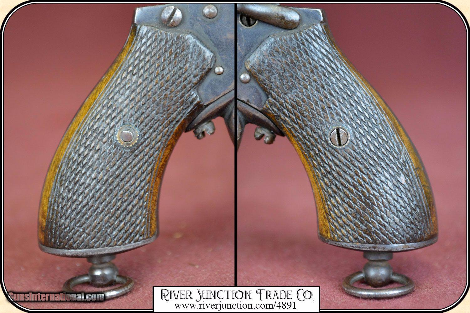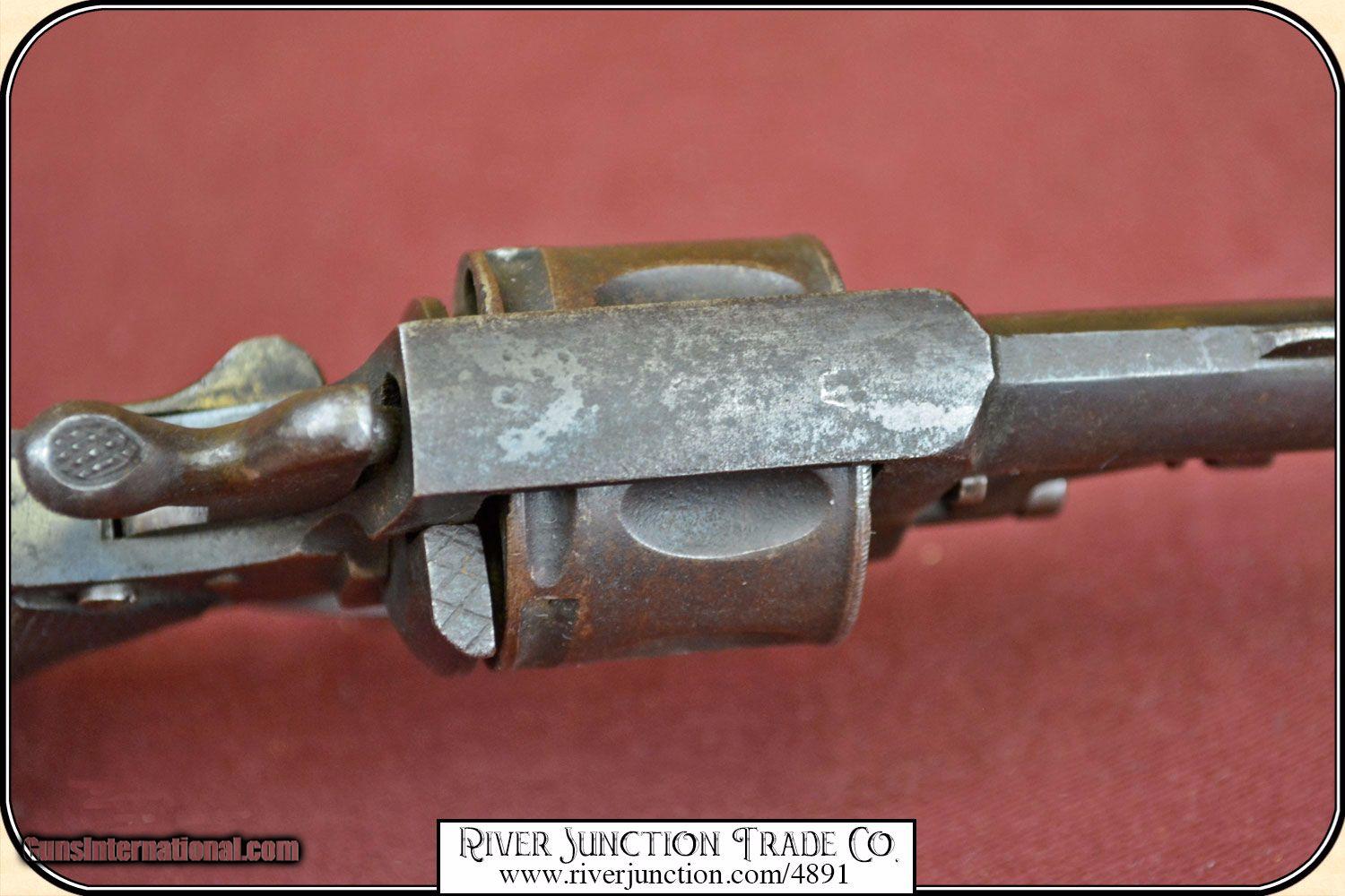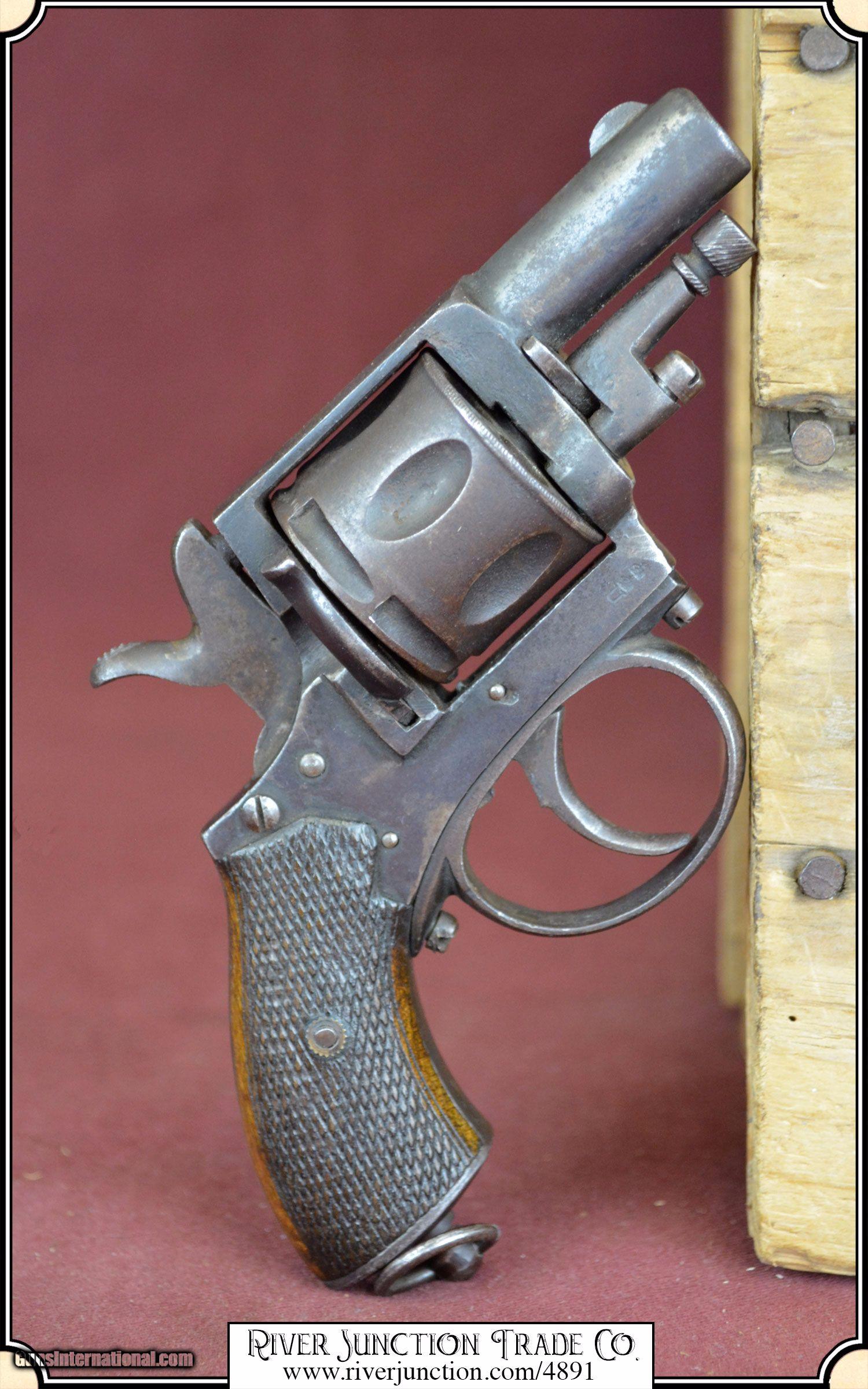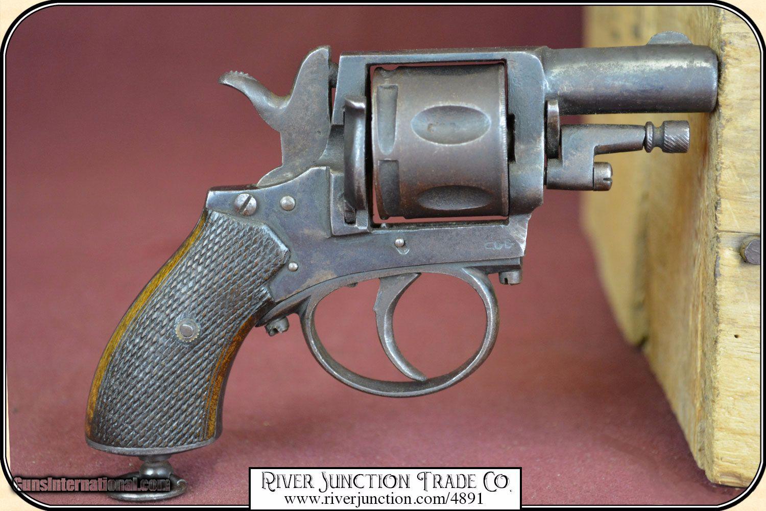 Description: "British Bulldog" style pocket revolver, six-shot fluted cylinder .32 caliber extra short,( The cartridge is properly call ".320 REVOLVER") unknown manufacturer. Foreign proofs are legible. These were manufactured 1872-1890. Barrel length 1-1/2". has strong and deep rifling for close shooting. Checkered wood grips. Single Action and Double Action works perfectly. Fixed front sight. Loading is achieved via a gate on right side of frame. Very good condition smooth overall with no pitting. Has a safety lever on the left side to keep from cocking while in you pocket or purse. Proof marks on the right side of the frame. Antique gun, manufactured before 1899. Has a lanyard ring on the butt that I think would be great with a ribbon type watch fob attached to it and have it hang out of you vest pocket. That would hang out of your vest pocket. This is an ANTIQUE and can be shipped directly to you. no guarantees, warranties, or liabilities for any actual usage. If any firearms are to be used for shooting purposes, a qualified gunsmith should inspect them first. Adult signature required. Payment Cash, postal money order, cashiers check, personal & business checks. Can be ordered with a credit card or paypal at wxx.riverjunction,cxx just type in the number 4891 in the search box. Shipping Hand Guns - $25.00 in the continental US SOLD |