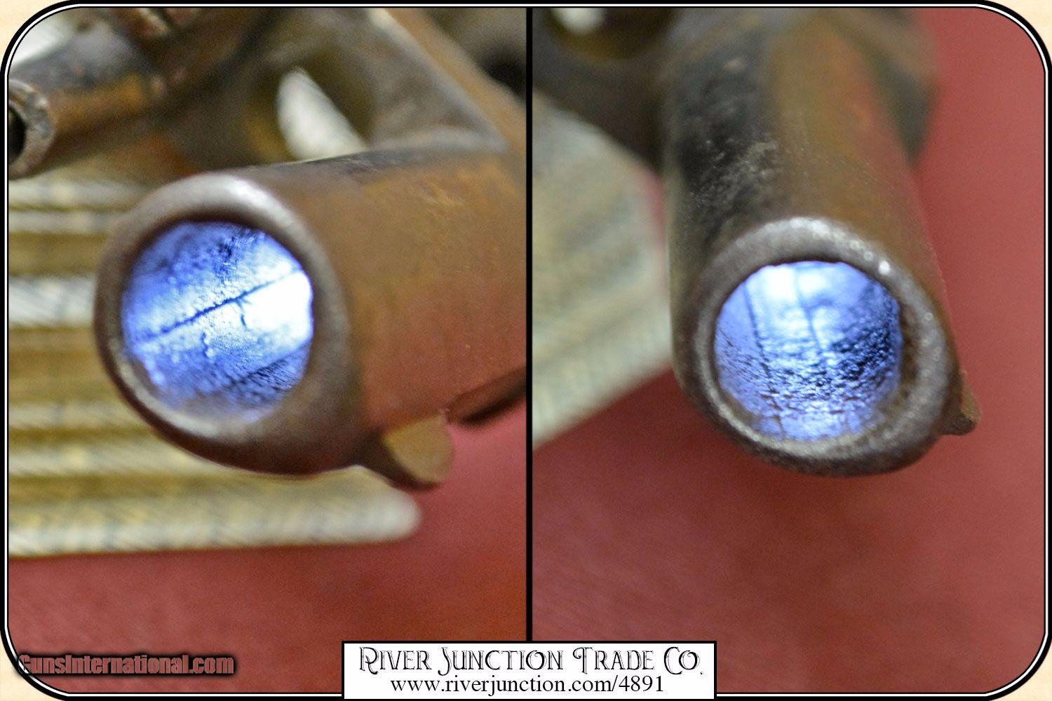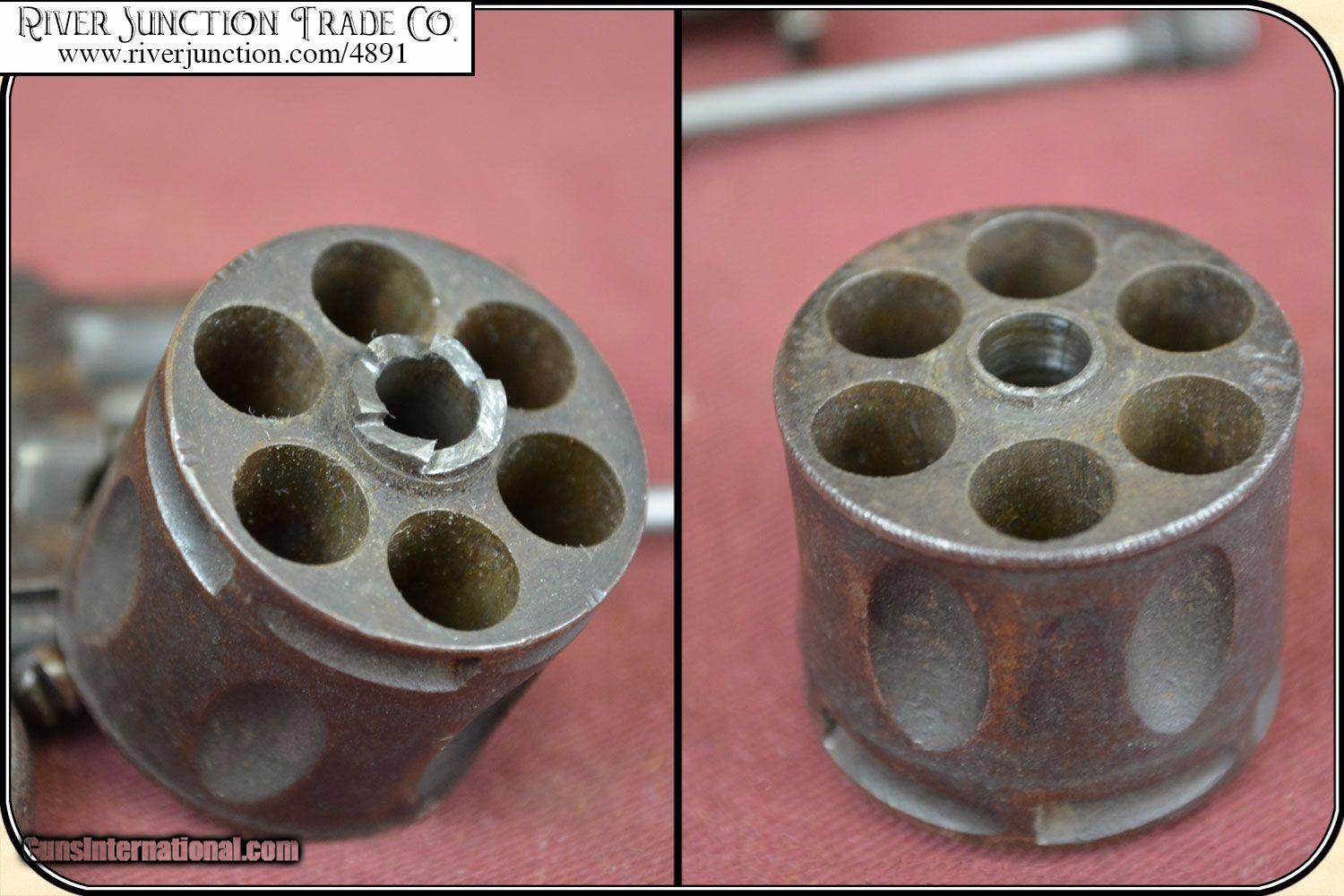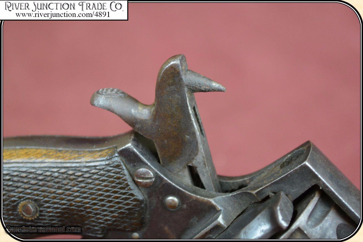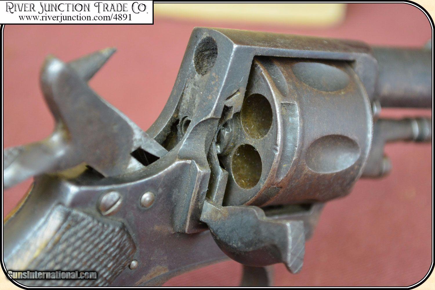 Description: "British Bulldog" style pocket revolver, six-shot fluted cylinder .32 caliber extra short,( The cartridge is properly call ".320 REVOLVER") unknown manufacturer. Foreign proofs are legible. These were manufactured 1872-1890. Barrel length 1-1/2". has strong and deep rifling for close shooting. Checkered wood grips. Single Action and Double Action works perfectly. Fixed front sight. Loading is achieved via a gate on right side of frame. Very good condition smooth overall with no pitting. Has a safety lever on the left side to keep from cocking while in you pocket or purse. Proof marks on the right side of the frame. Antique gun, manufactured before 1899. Has a lanyard ring on the butt that I think would be great with a ribbon type watch fob attached to it and have it hang out of you vest pocket. That would hang out of your vest pocket. This is an ANTIQUE and can be shipped directly to you. no guarantees, warranties, or liabilities for any actual usage. If any firearms are to be used for shooting purposes, a qualified gunsmith should inspect them first. Adult signature required. Payment Cash, postal money order, cashiers check, personal & business checks. Can be ordered with a credit card or paypal at wxx.riverjunction,cxx just type in the number 4891 in the search box. Shipping Hand Guns - $25.00 in the continental US SOLD |