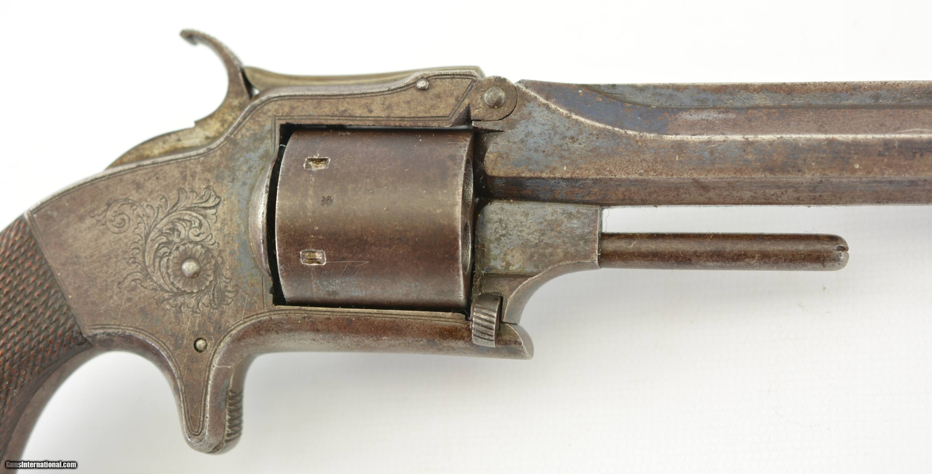 Description: NSN, .32 RF, 5 3/4" octagon barrel with a very good bore that has dark freckling along its length. This is a high quality, British-proofed copy of the famous S&W No. 2 tip-up revolver that has only a small “MEYERS" markings on the underside of the barrel, and retains some traces of original bright blue on protected areas, most noticeably on the frame behind the recoil shield. The remainder of the metal has an overall dark plum-brown patina with thin freckling throughout, and there are some small peen marks on the barrel assembly at the base of the ejector rod. The checkered walnut grips are in very good shape with only minor handling marks and light wear at the butt, as well as some flattening of the points, especially a small area near the top of the right panel. The lock-up is good, although there is a small amount of lateral play in the barrel. This is a very unusual and interesting revolver; itself a copy of an iconic American handgun, and rates very good-near fine condition overall. Antique SOLD Antique: Yes Manufacturer: Webley Model: No. 1 Caliber Info: .32 Gauge Info: .32 |