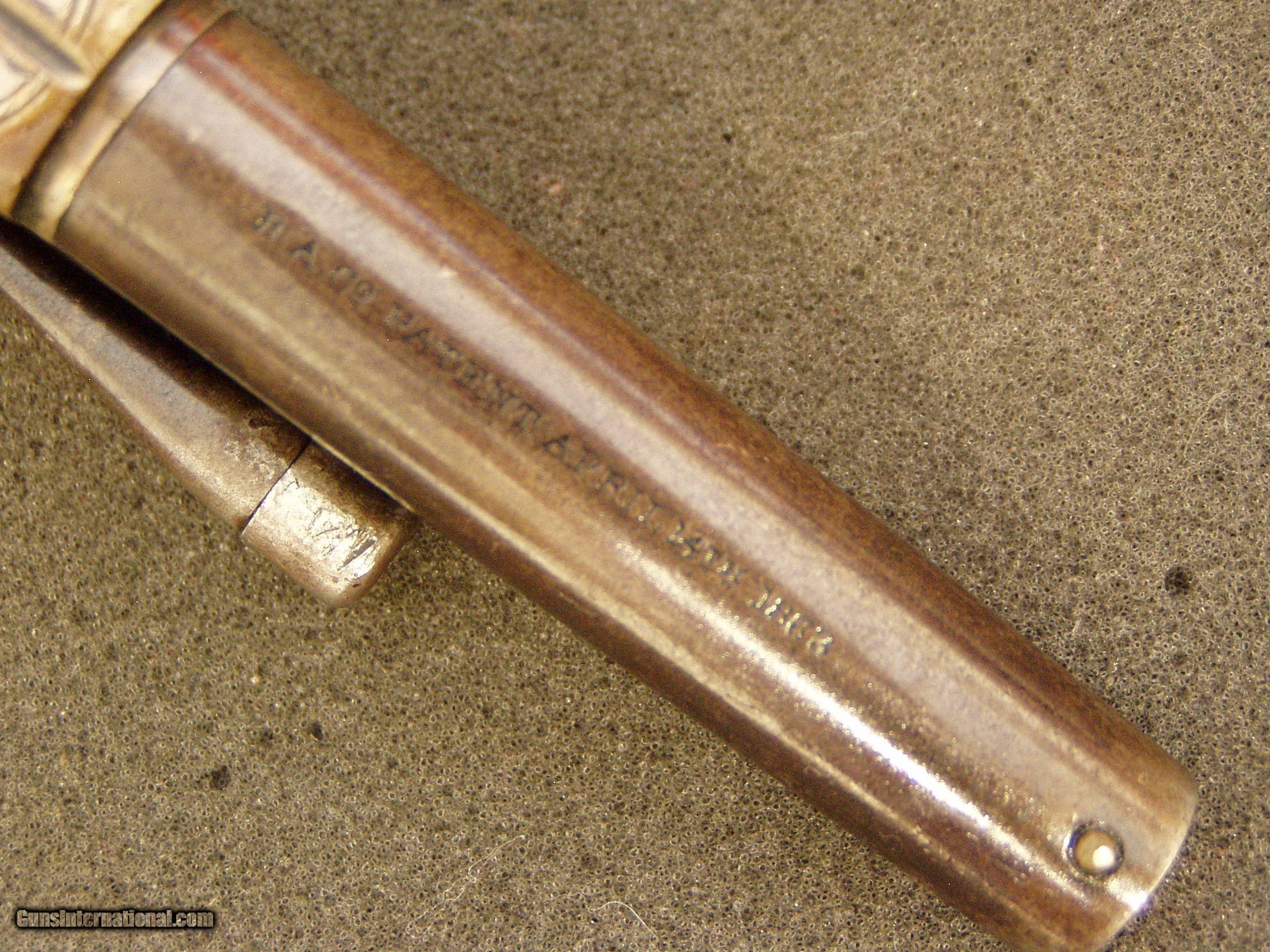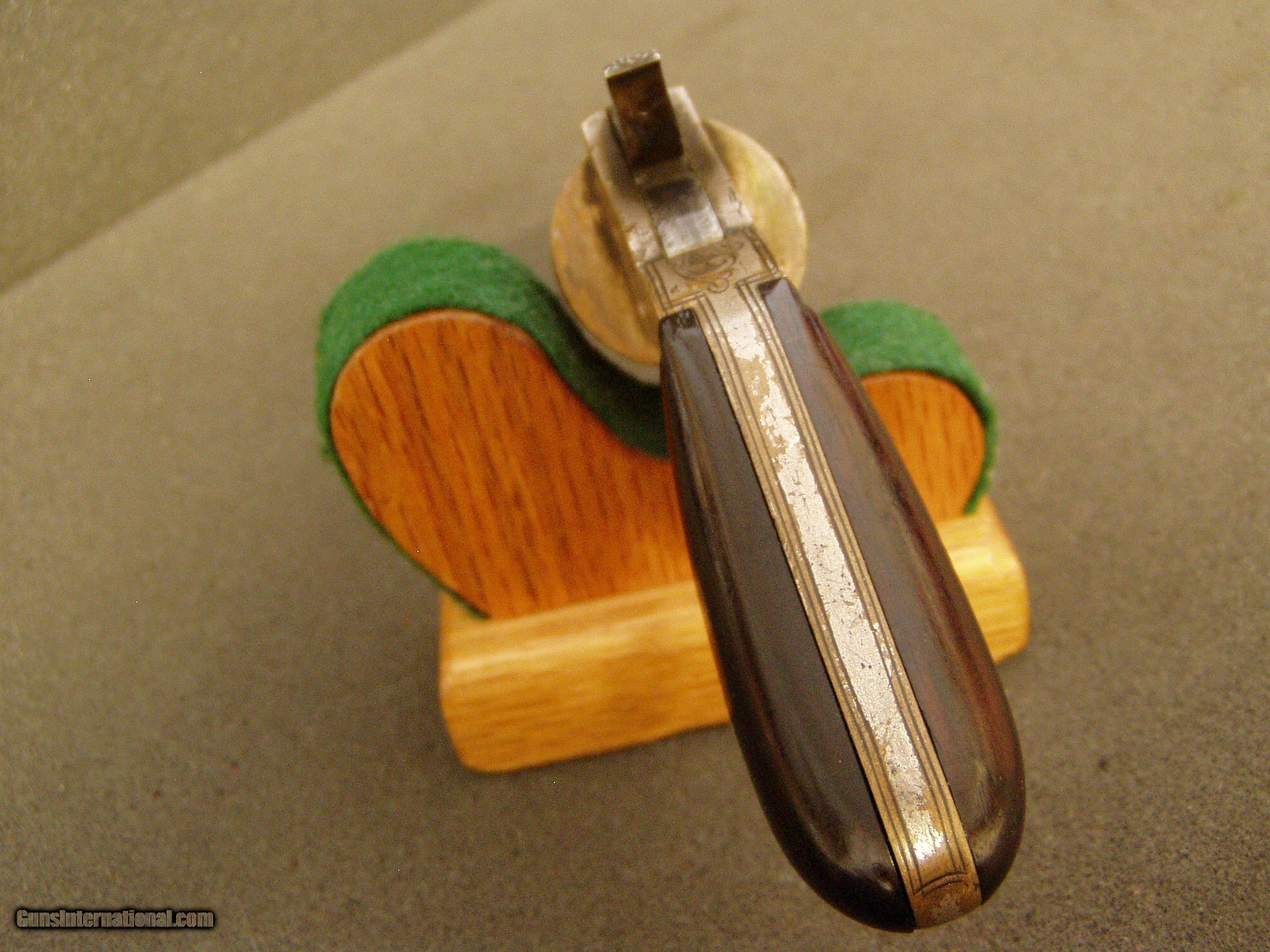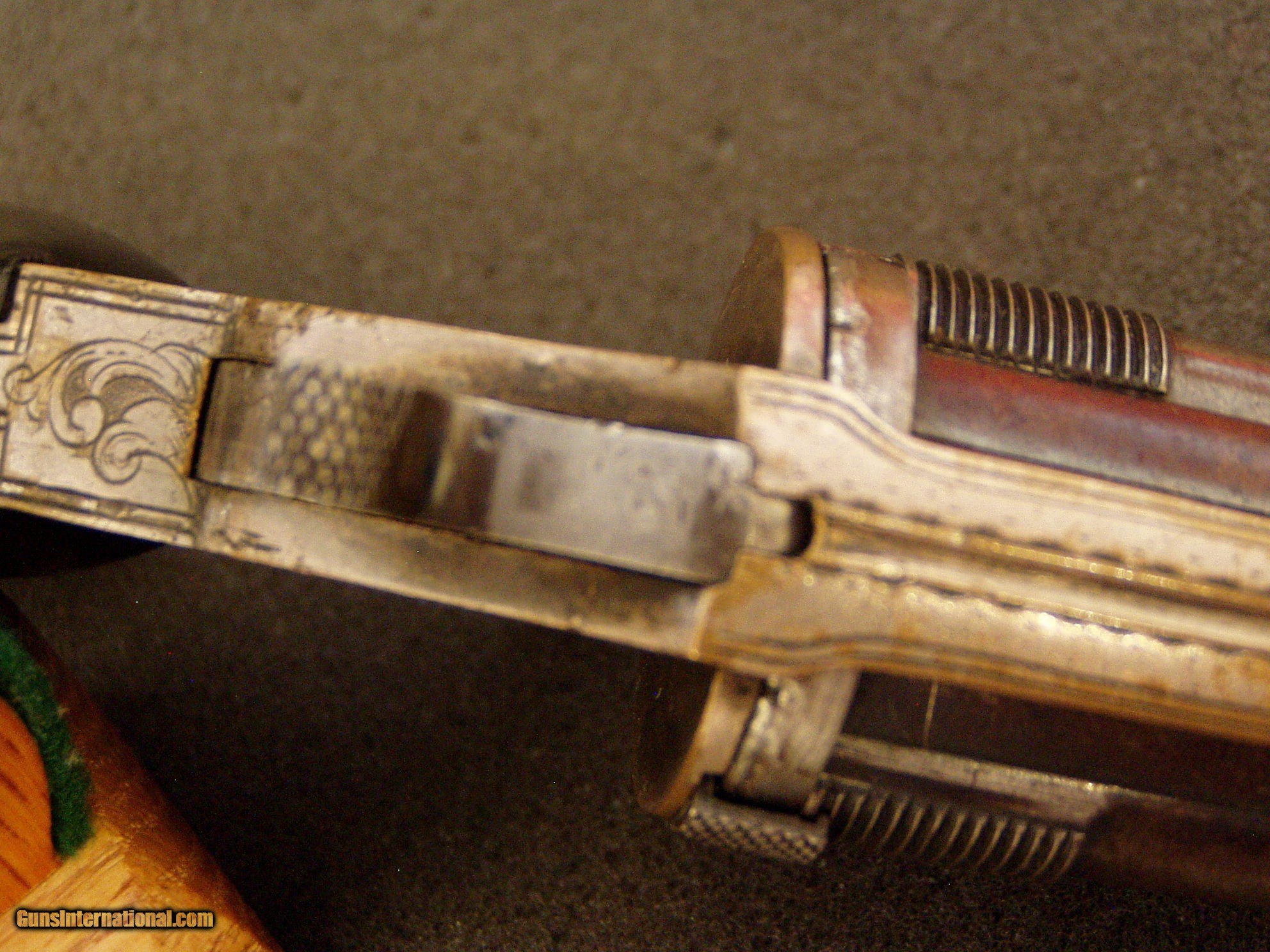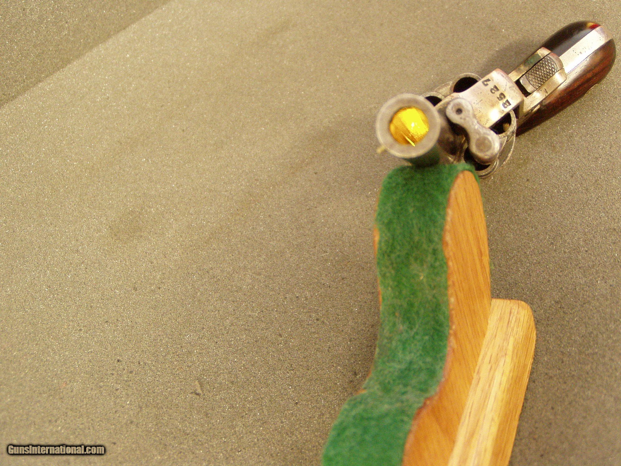 Description: Brooklyn Arms Co. Slocum Revolver. Serial number #2527, .32 RimFire, 3" Barrel. Blued finish, silver plated brass frame, varnished Rosewood grips. Barrel marked, "B.A. Co PATENT APRIL 14, 1863". Frame engraved with loose foliate scrolls in a New York style with a punch dot shading, with about half of the barrel engraved. 5-shot, single action revolver with unique sliding chambers to allow loading and unloading was an attempt to circumvent the Rollin White patent. Some 10,000 were produced , 1863-1864. The condition, overall is Very Good. Retains very little blue with freckeled pewter patina. Frame is about 50% of silver plating remaing. Some areas of Brass frame can be seen. Markings and engraving is very clear. Mechanically it works very well and has a very good bore. Rosewood grips are very good, solid with some smoothing from wear. Buyer pays $20.00 shipping to lower 48 states. accept USPS Money Orders or Bank Cashier's Check. Will accept Personal check, with shipping hold. Layaway Available! Three day non-firing, non-disassembly inspection period. If returned, for any reason, full refund less shipping. ANTIQUE SOLD Antique: Yes Manufacturer: BROOKLYN ARMS CO. Model: SLOCUM MODEL Serial Number: SERIAL#2527 Caliber Info: .32 RF Bore: 3 Chambers: 5 Ejectors: MANUAL Condition: VERY GOOD Metal Condition: VERY GOOD Wood Condition: VERY GOOD Bore Condition: Excellent Barrels: ONE Barrel Type: ROUND Action: SINGLE ACTION Triggers: SPUR Stock: ROSEWOOD Finish: PATINA Sights: BARREL Manufacture Date: 1863-1864 Engraving: FOLIATE SCROLLWORK |