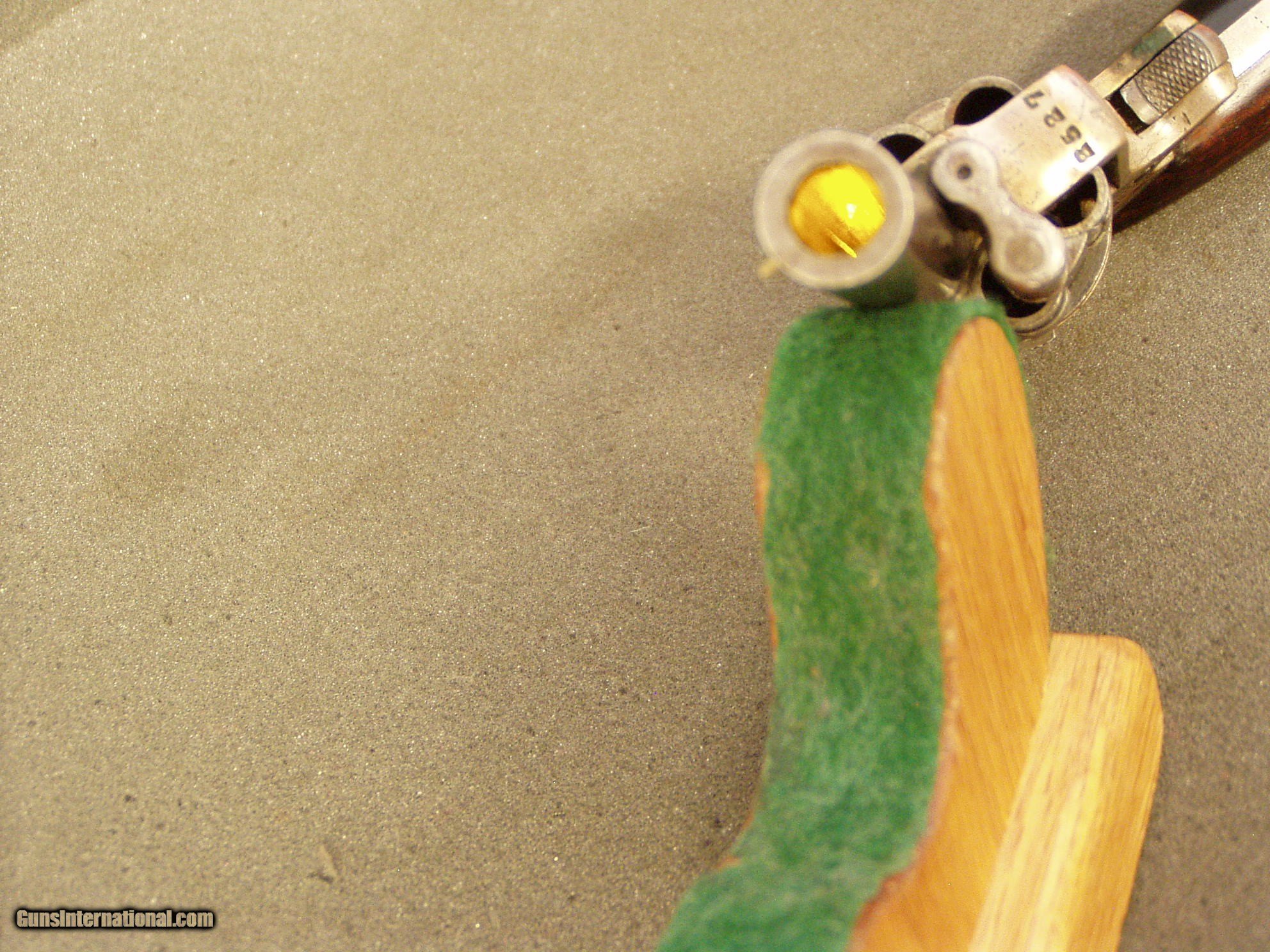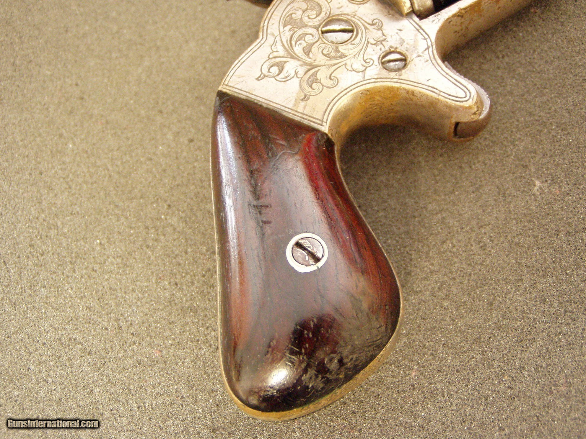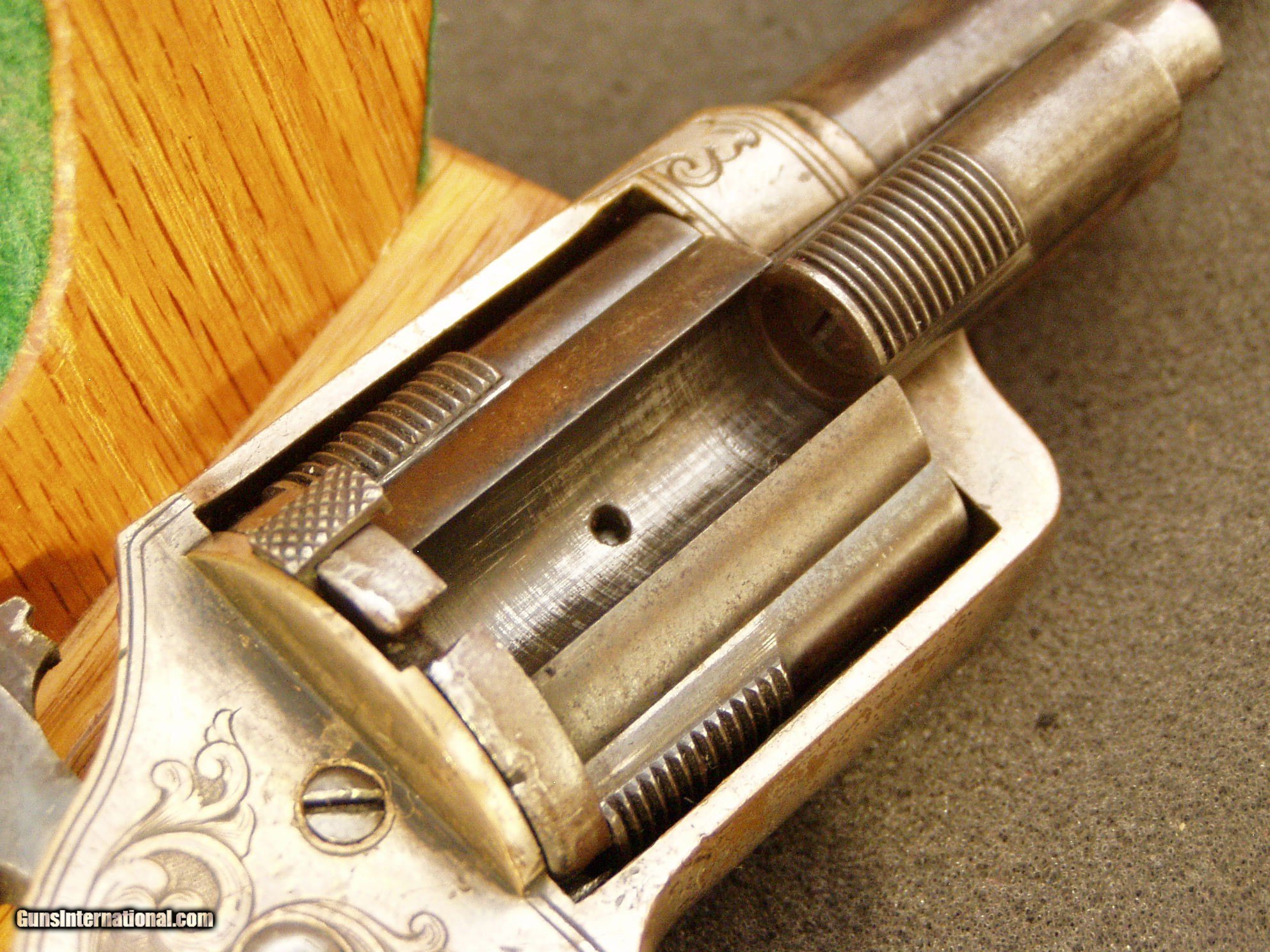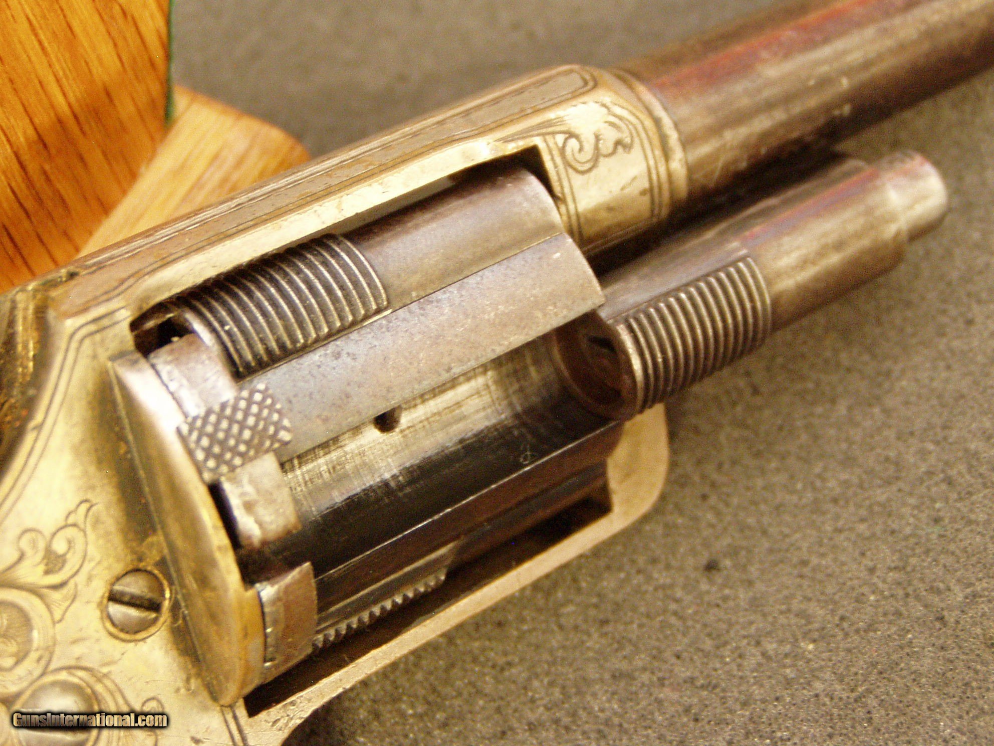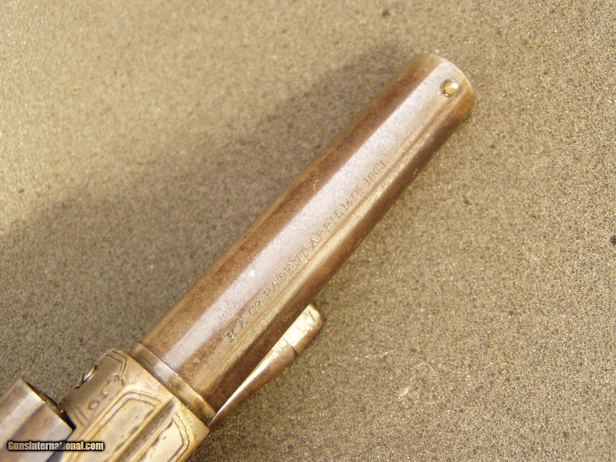 Description: Brooklyn Arms Co. Slocum Revolver. Serial number #2527, .32 RimFire, 3" Barrel. Blued finish, silver plated brass frame, varnished Rosewood grips. Barrel marked, "B.A. Co PATENT APRIL 14, 1863". Frame engraved with loose foliate scrolls in a New York style with a punch dot shading, with about half of the barrel engraved. 5-shot, single action revolver with unique sliding chambers to allow loading and unloading was an attempt to circumvent the Rollin White patent. Some 10,000 were produced , 1863-1864. The condition, overall is Very Good. Retains very little blue with freckeled pewter patina. Frame is about 50% of silver plating remaing. Some areas of Brass frame can be seen. Markings and engraving is very clear. Mechanically it works very well and has a very good bore. Rosewood grips are very good, solid with some smoothing from wear. Buyer pays $20.00 shipping to lower 48 states. accept USPS Money Orders or Bank Cashier's Check. Will accept Personal check, with shipping hold. Layaway Available! Three day non-firing, non-disassembly inspection period. If returned, for any reason, full refund less shipping. ANTIQUE SOLD Antique: Yes Manufacturer: BROOKLYN ARMS CO. Model: SLOCUM MODEL Serial Number: SERIAL#2527 Caliber Info: .32 RF Bore: 3 Chambers: 5 Ejectors: MANUAL Condition: VERY GOOD Metal Condition: VERY GOOD Wood Condition: VERY GOOD Bore Condition: Excellent Barrels: ONE Barrel Type: ROUND Action: SINGLE ACTION Triggers: SPUR Stock: ROSEWOOD Finish: PATINA Sights: BARREL Manufacture Date: 1863-1864 Engraving: FOLIATE SCROLLWORK |