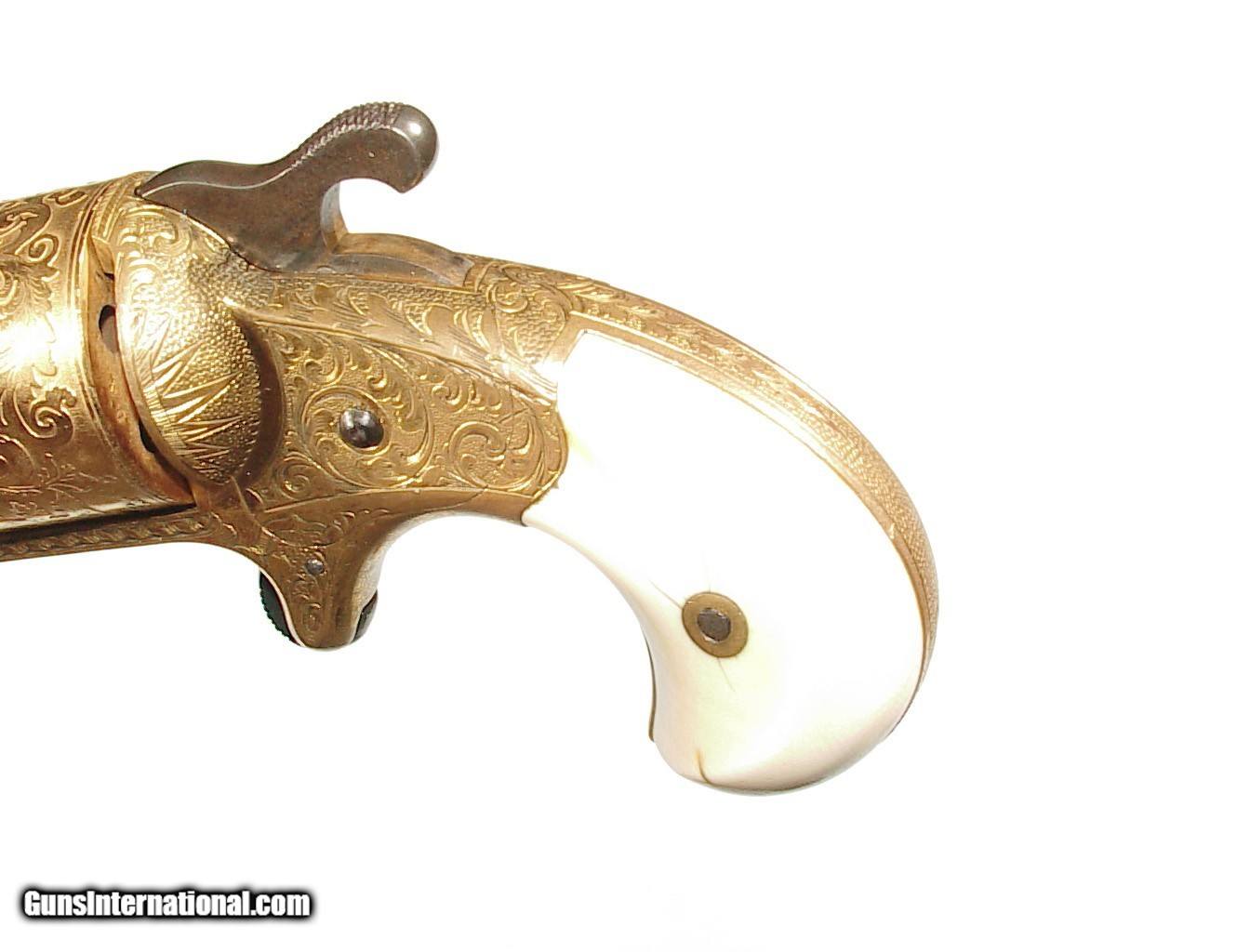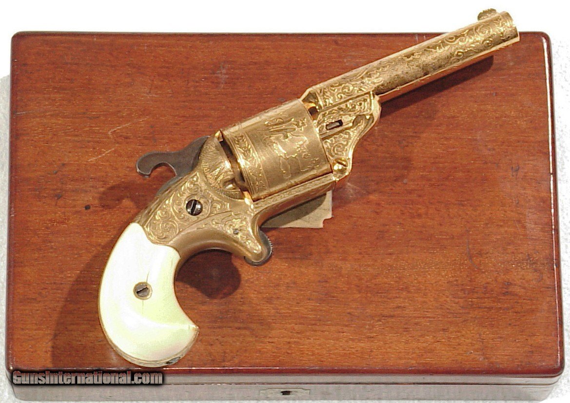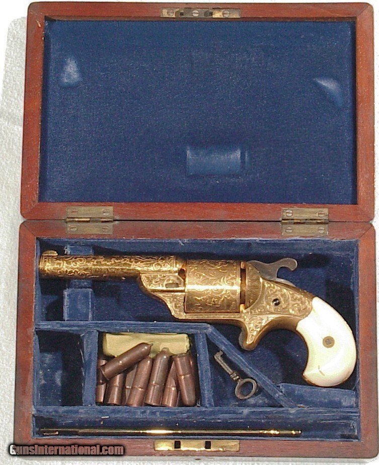 Description: .32 caliber teat fire cartridge. 3 1/4" barrel with hinged front loading gate. Gold plated and engraved with beautiful original ivory grips. A 1st model lacking the hooked extractor it is superb condition retaining a very high percentage of gold overall. Mechanically excellent with a very nice bore. In it's box with blue velvet lining and some original cartridges. SOLD Antique: Yes |