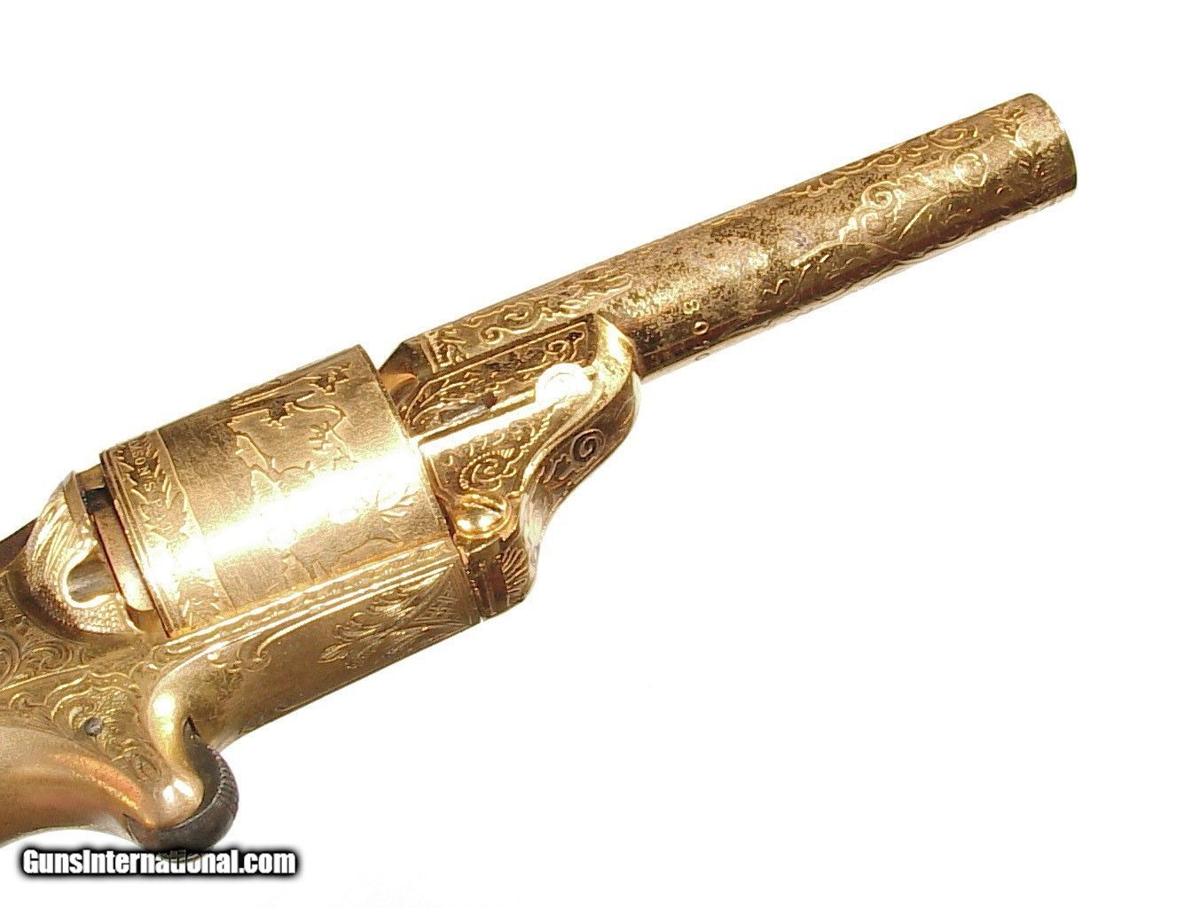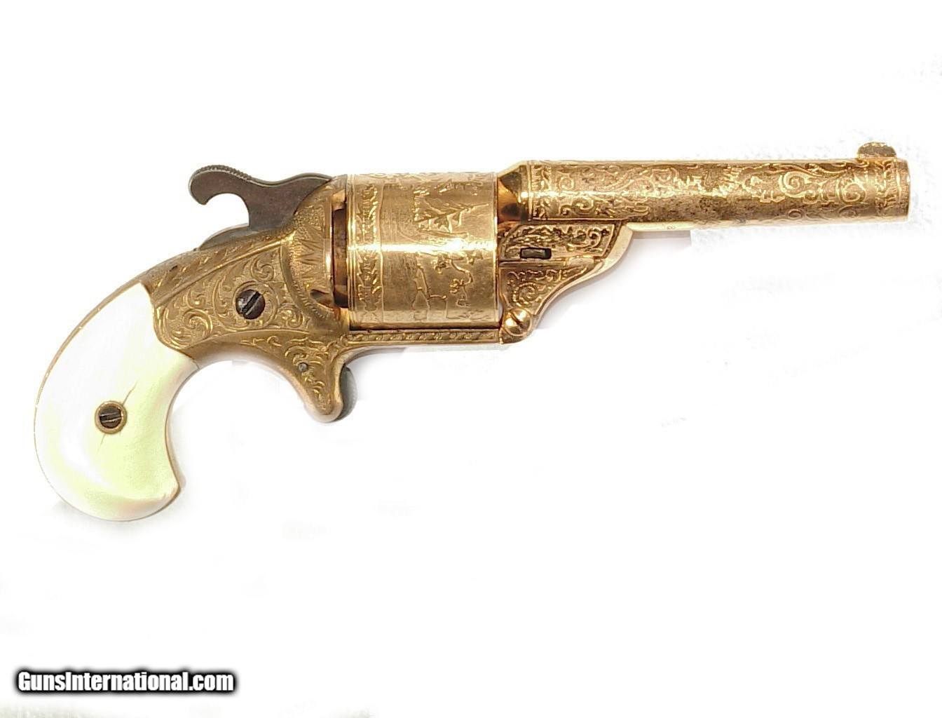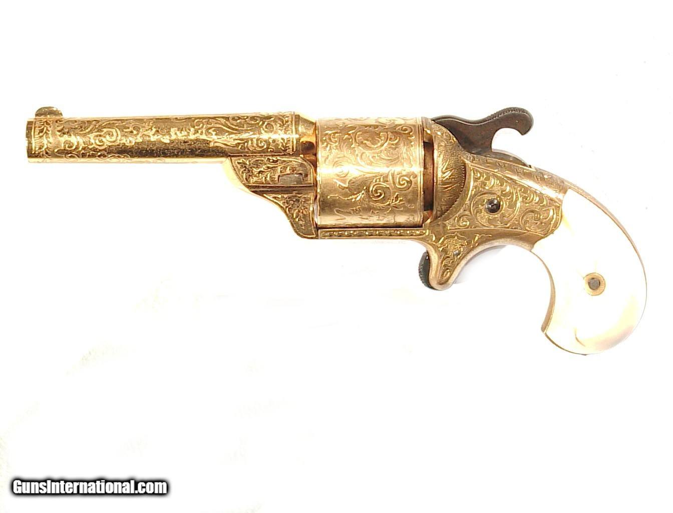 Description: .32 caliber teat fire cartridge. 3 1/4" barrel with hinged front loading gate. Gold plated and engraved with beautiful original ivory grips. A 1st model lacking the hooked extractor it is superb condition retaining a very high percentage of gold overall. Mechanically excellent with a very nice bore. In it's box with blue velvet lining and some original cartridges. SOLD Antique: Yes |