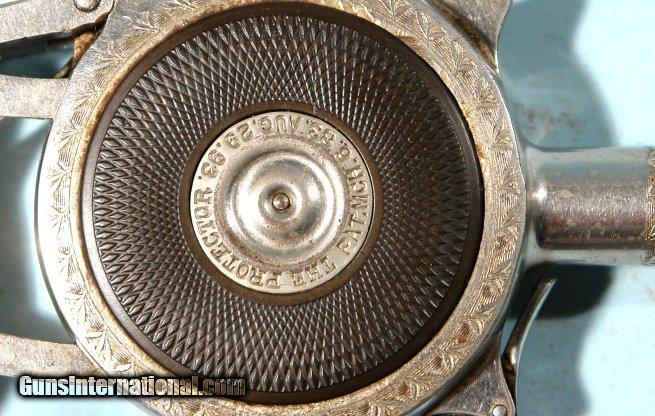 Description: CHICAGO FIRE ARMS COMPANY PROTECTOR PALM PISTOL CIRCA 1895. .32 rim fire. Excellent and all original with 98% original nickel finish. Original checkered hard rubber frame and firing lever panels. Light border engraving on the barrel and the sides of the circular frame. Center frame medallions stamped “CHICAGO FIRE ARMS CO., CHICAGO, ILL.” and “THE PROTECTOR” along with the March 6, 1883 and August 29, 1893 patent dates. Working order and fine bore. Light signs of use with a few minor nicks and dings but a very nice example overall. SOLD Antique: Yes |