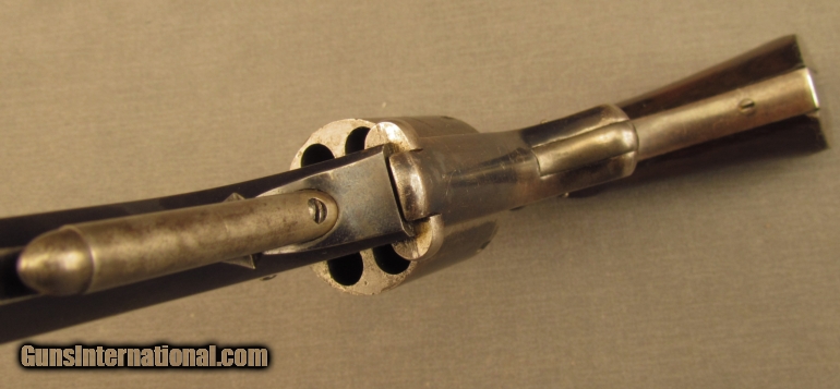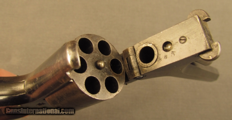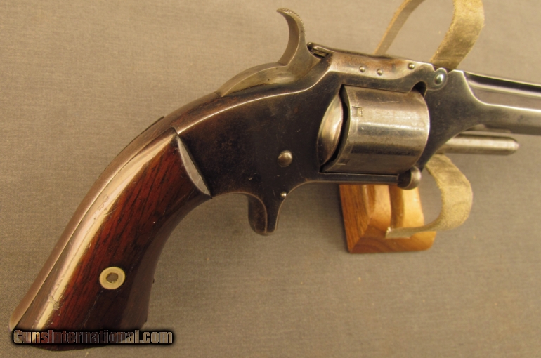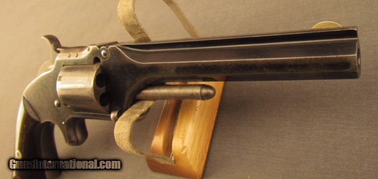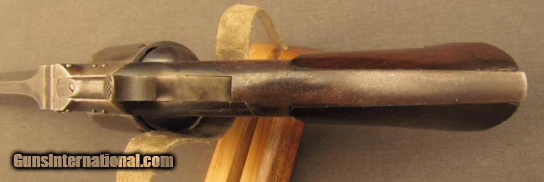 Description: Serial #31701, .32 RF, 5” octagon barrel with an excellent, bright bore. Built in 1865 this is a handsome revolver that has matching assembly numbers on the frame, cylinder, and barrel and retains about 90% of the original blue with some mild fading on the edges, a turn-ring on the cylinder with some attendant graying as well, and some plum-brown fading along the backstrap. The hammer has some traces of original color case-hardening but is predominantly a mottled gray overall and the barrel lock-up is tight with only a hint of lateral play. The rosewood grips are numbered to the gun on the interior and have almost all of the original piano varnish remaining with a few minor surface blemishes and grain separations on either panel. Additionally, someone flattened the grip flare on either side, presumably to aid in holster carry at some point. The mechanism functions flawlessly and the revolver rates fine condition overall. Only about 1000 numbers away from the No.2 found on Hickok when he was killed by some coward! Antique SOLD Antique: Yes Manufacturer: S&W Model: No.2 Serial Number: 31701 Caliber Info: .32RF Gauge Info: .32RF |