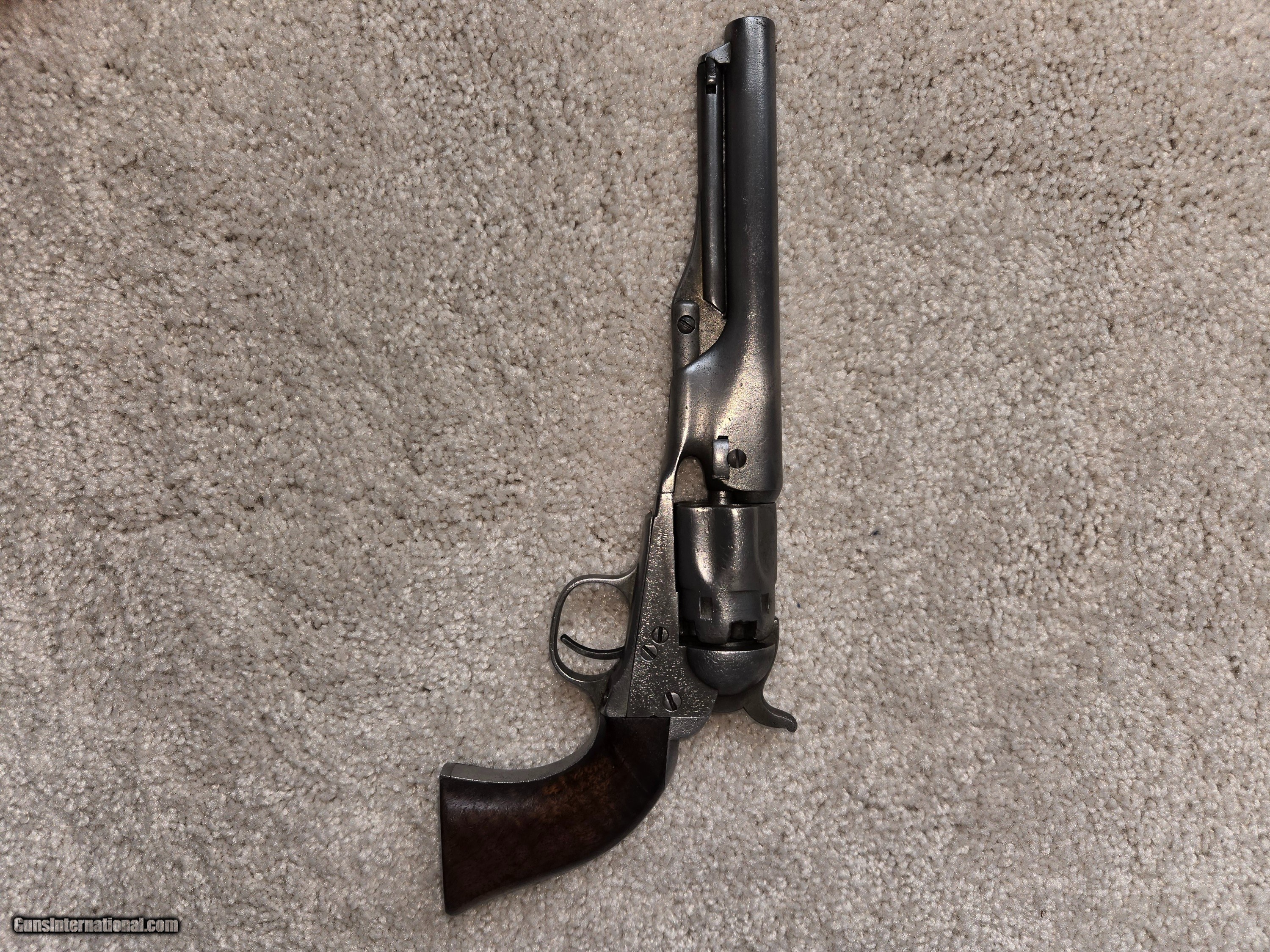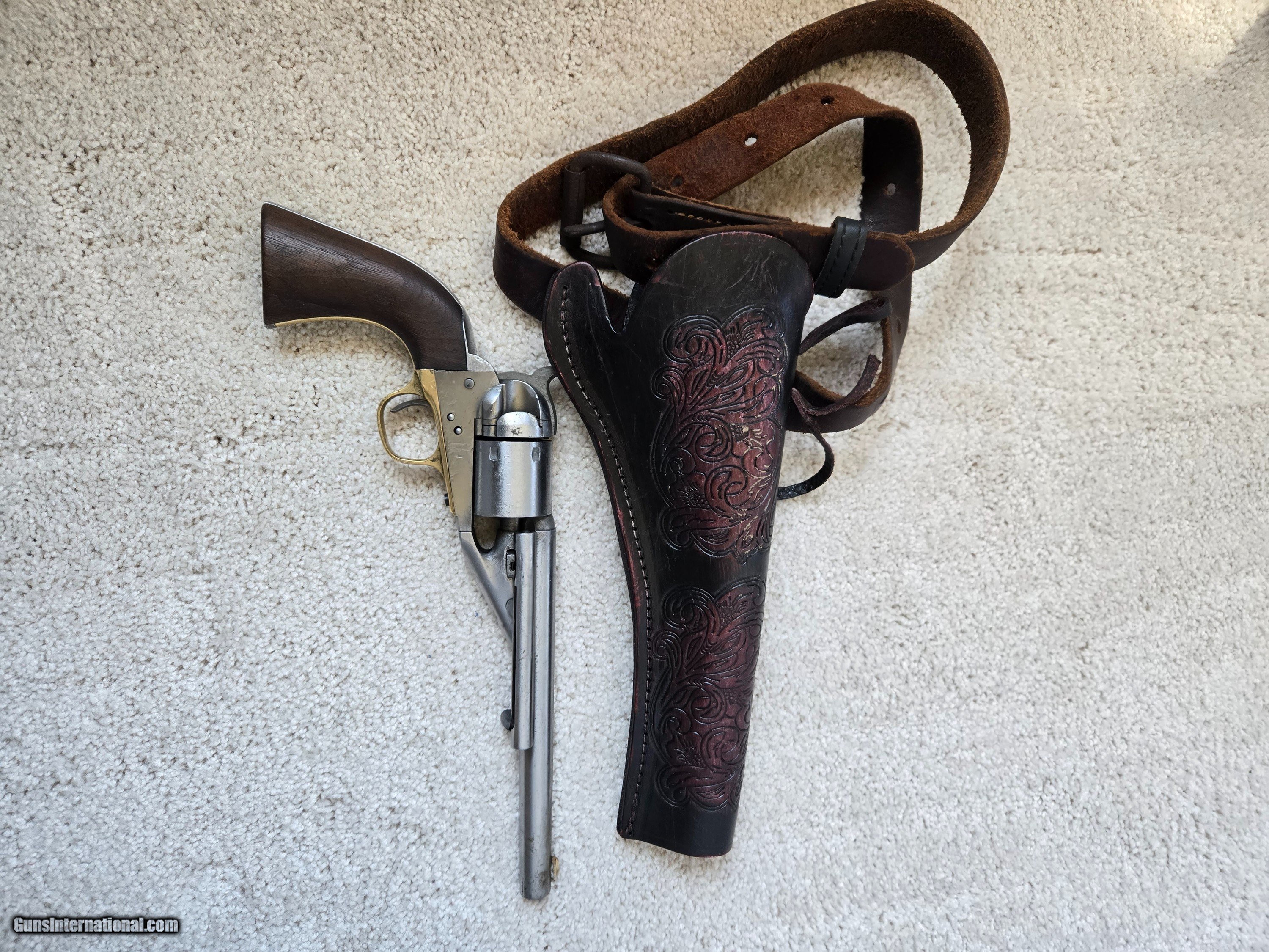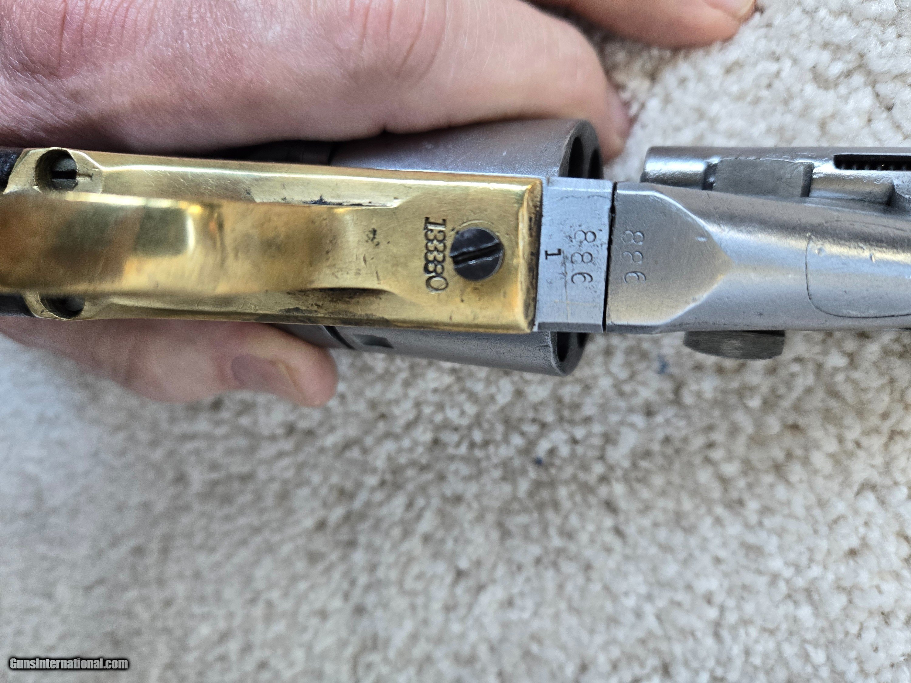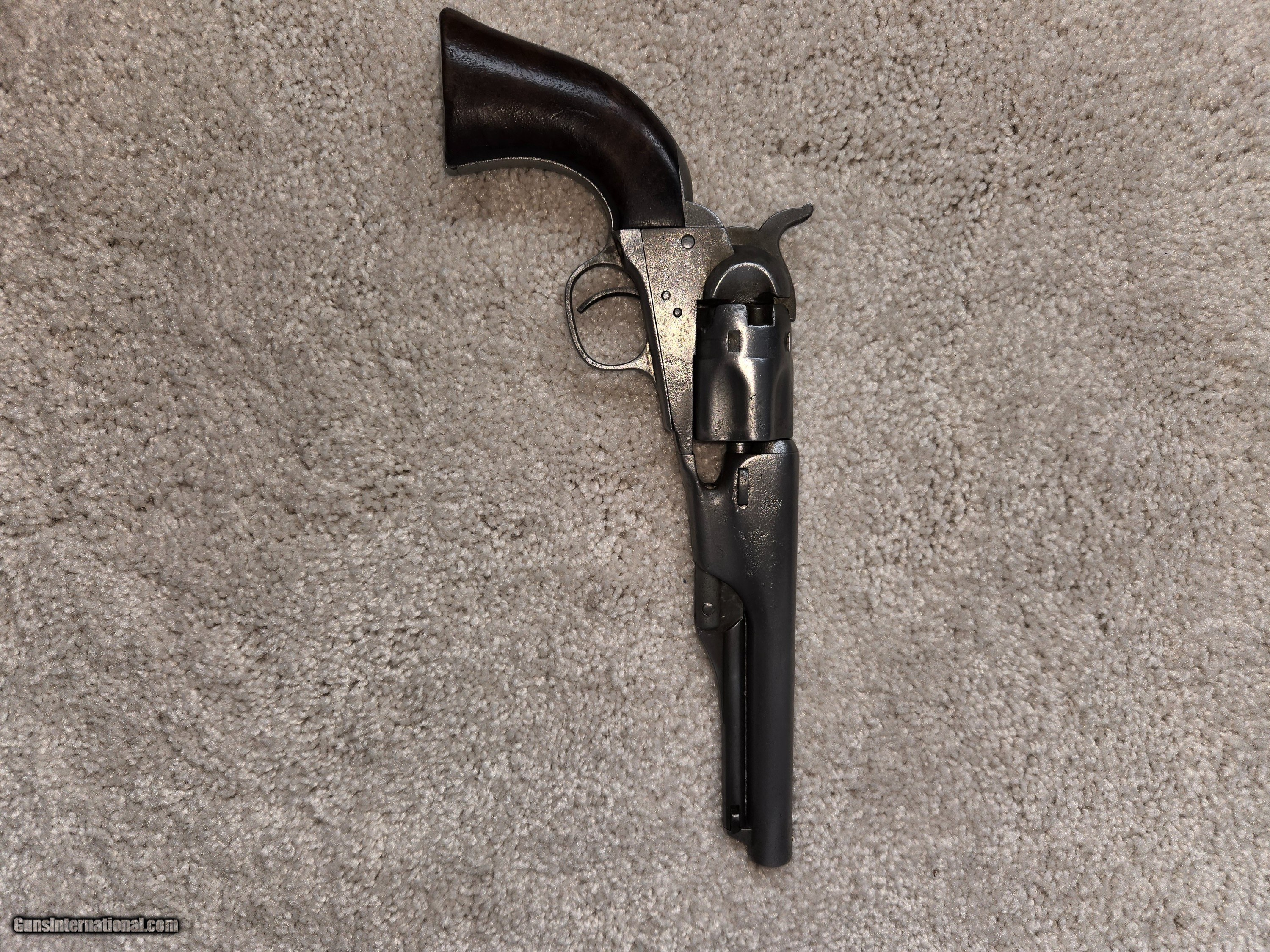 Description: Listed is a Colt Model 1861 Navy converted to 38 rim fire by the Richards Conversion. Serial numbers are displayed in the photos . It is tight and functions as it should. Bore is fair as in most of these guns of this age.There is light pitting in some places. Most of the scene is gone except the serial number. The initials PAR are scratched in the bottom of the grips . It coma with the original holster and belt. The holster is marked El Paso. Old repaired crack in right will consider offers. grip. A original Remington 38 bullets comes with the gun. Shells must be shipped separately. Any additional pictures please text me. 608 333 6354 SOLD Antique: Yes |