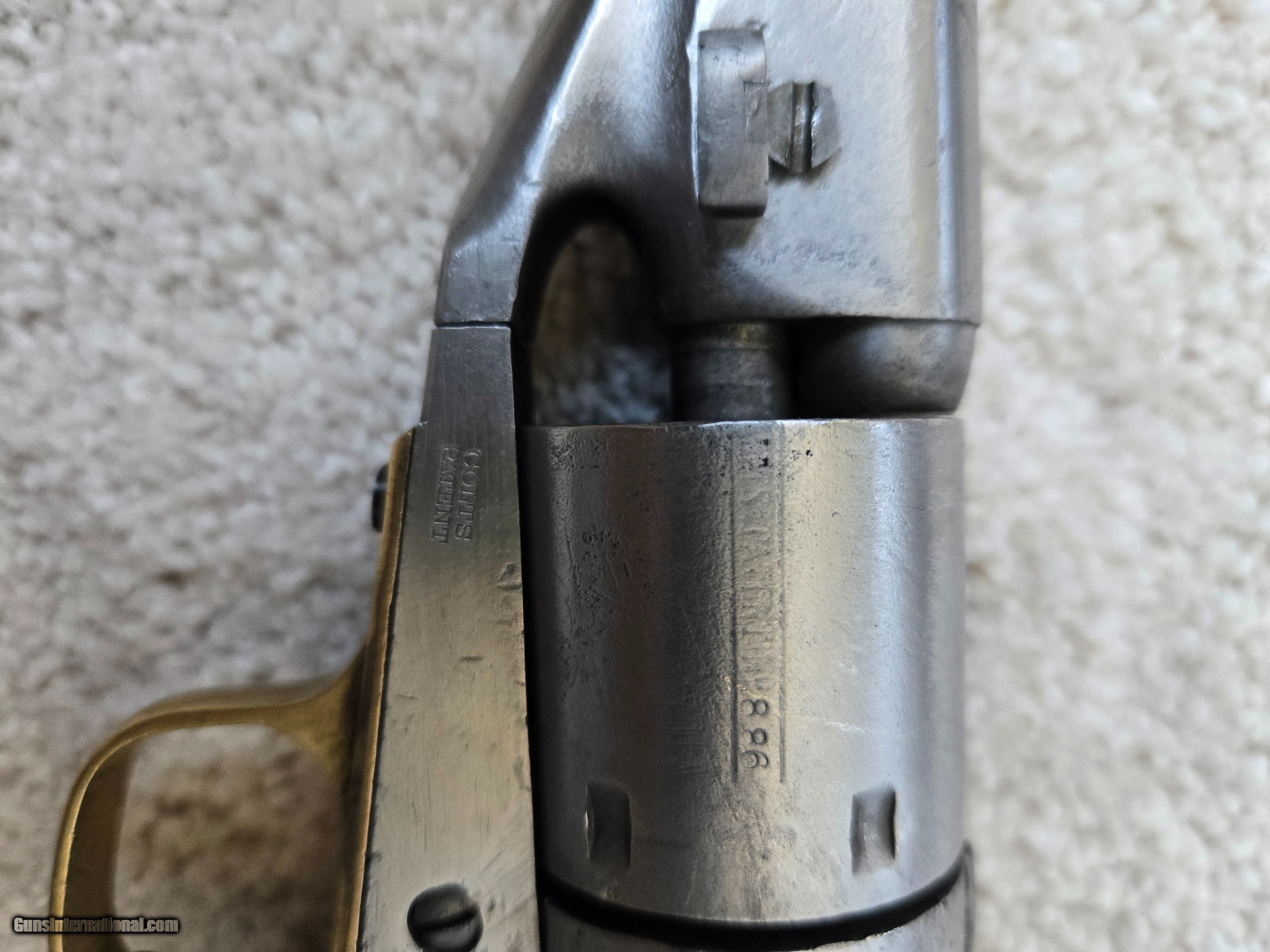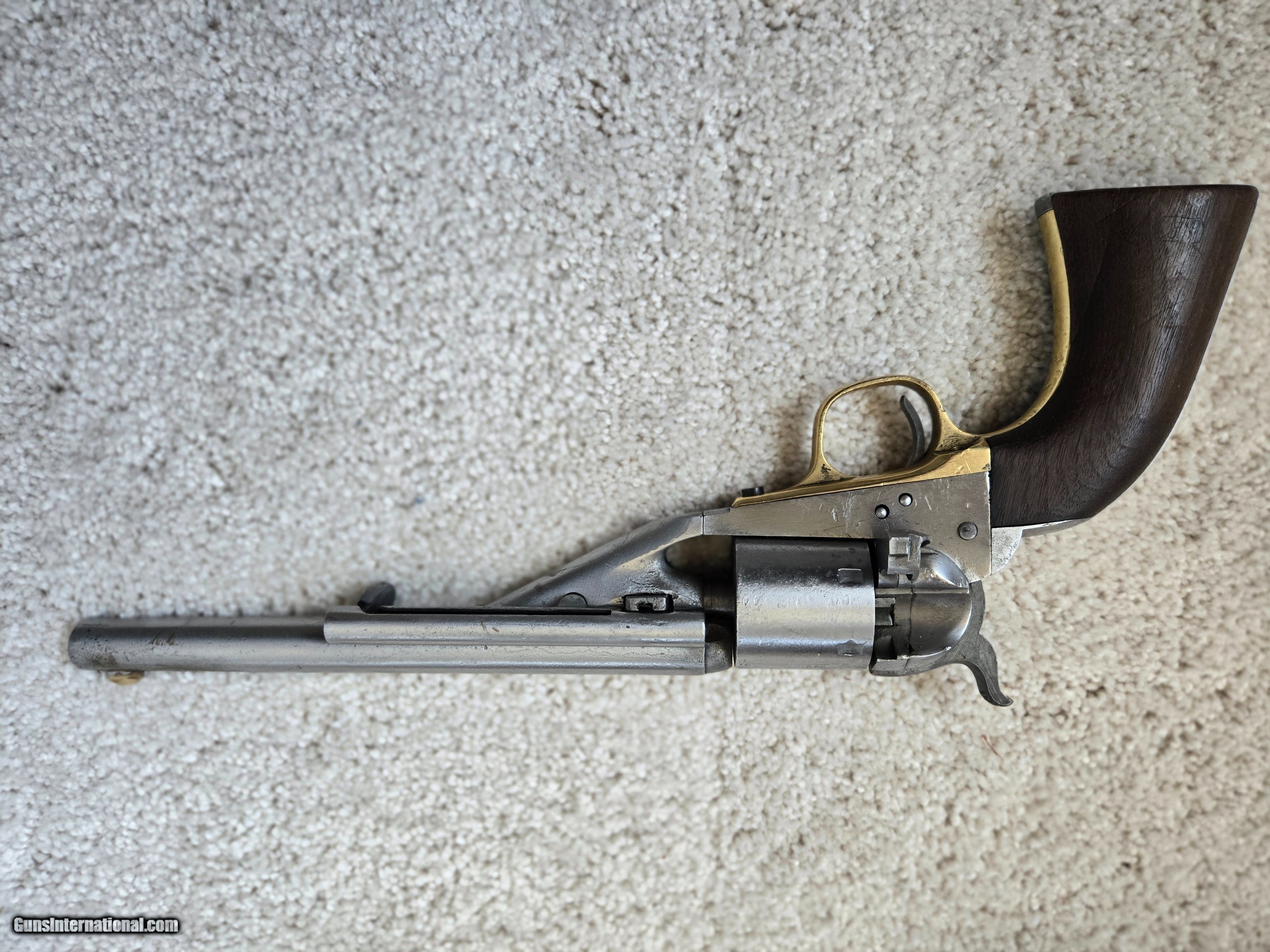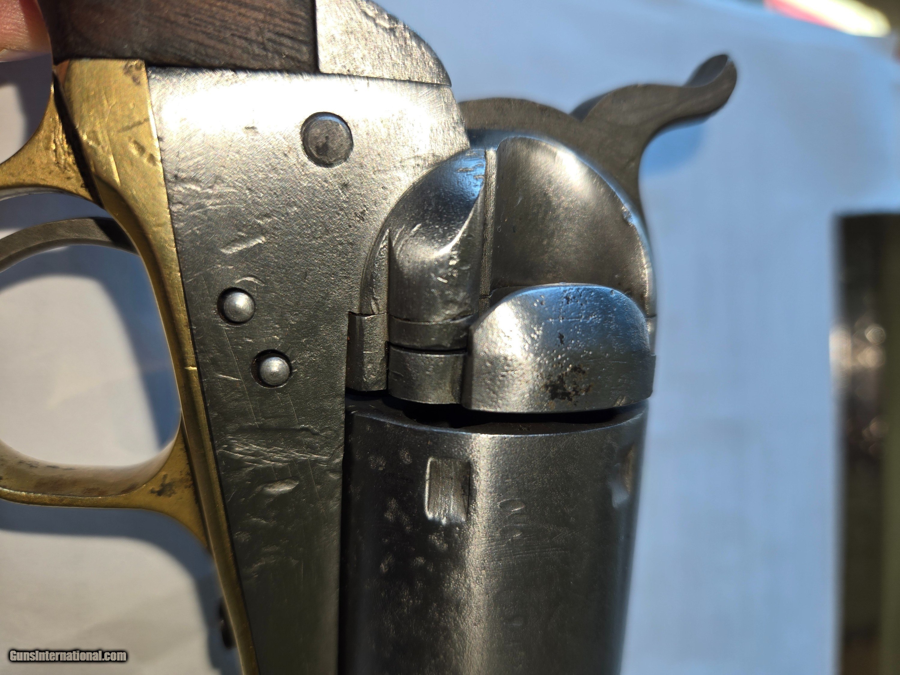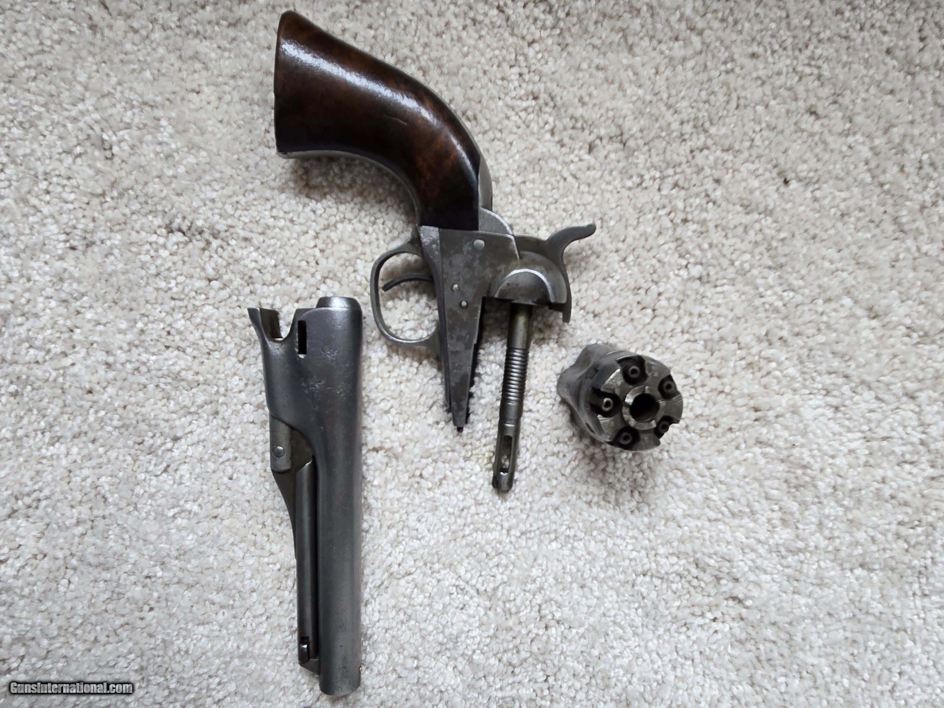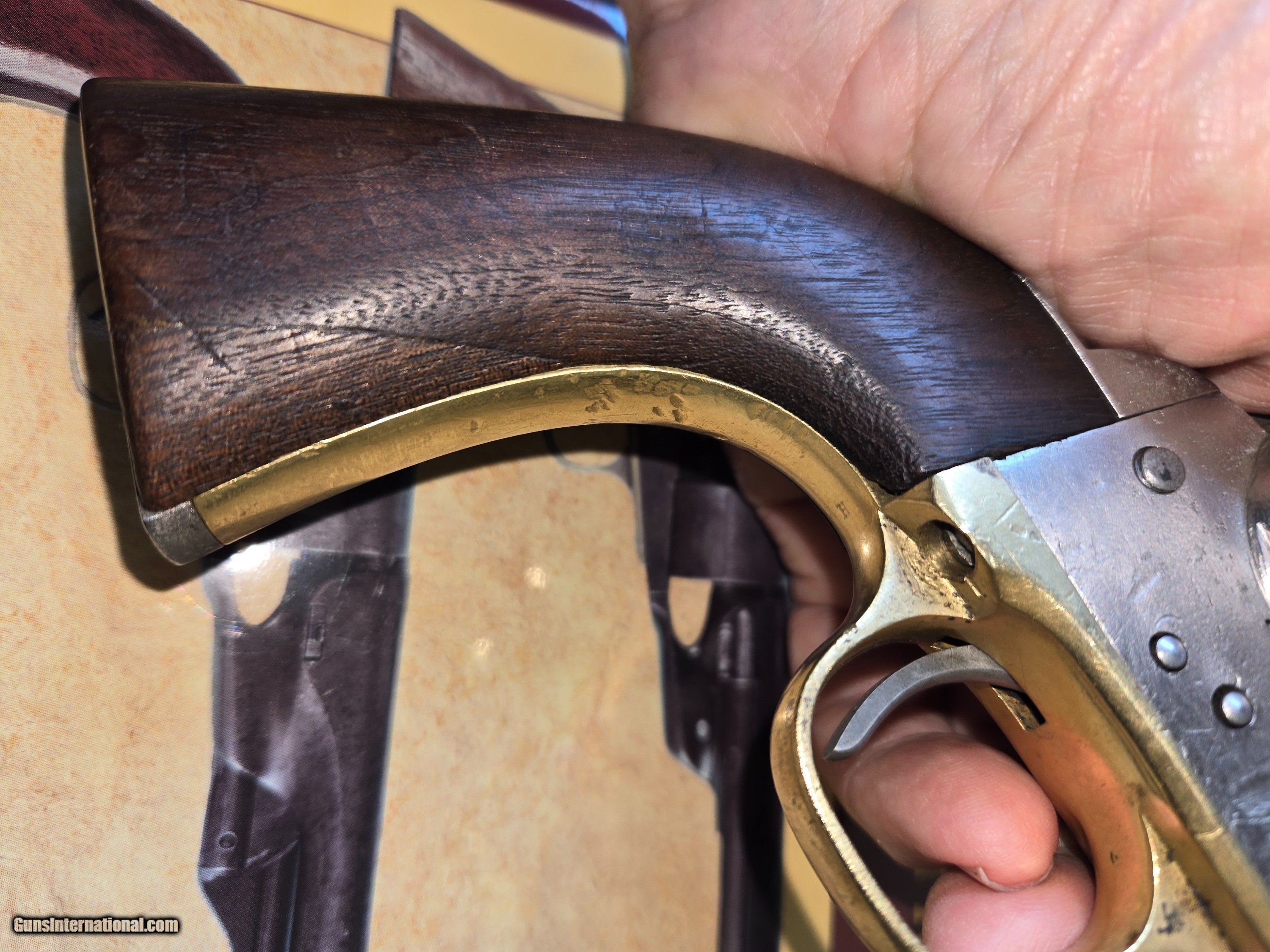 Description: Listed is a Colt Model 1861 Navy converted to 38 rim fire by the Richards Conversion. Serial numbers are displayed in the photos . It is tight and functions as it should. Bore is fair as in most of these guns of this age.There is light pitting in some places. Most of the scene is gone except the serial number. The initials PAR are scratched in the bottom of the grips . It coma with the original holster and belt. The holster is marked El Paso. Old repaired crack in right will consider offers. grip. A original Remington 38 bullets comes with the gun. Shells must be shipped separately. Any additional pictures please text me. 608 333 6354 SOLD Antique: Yes |