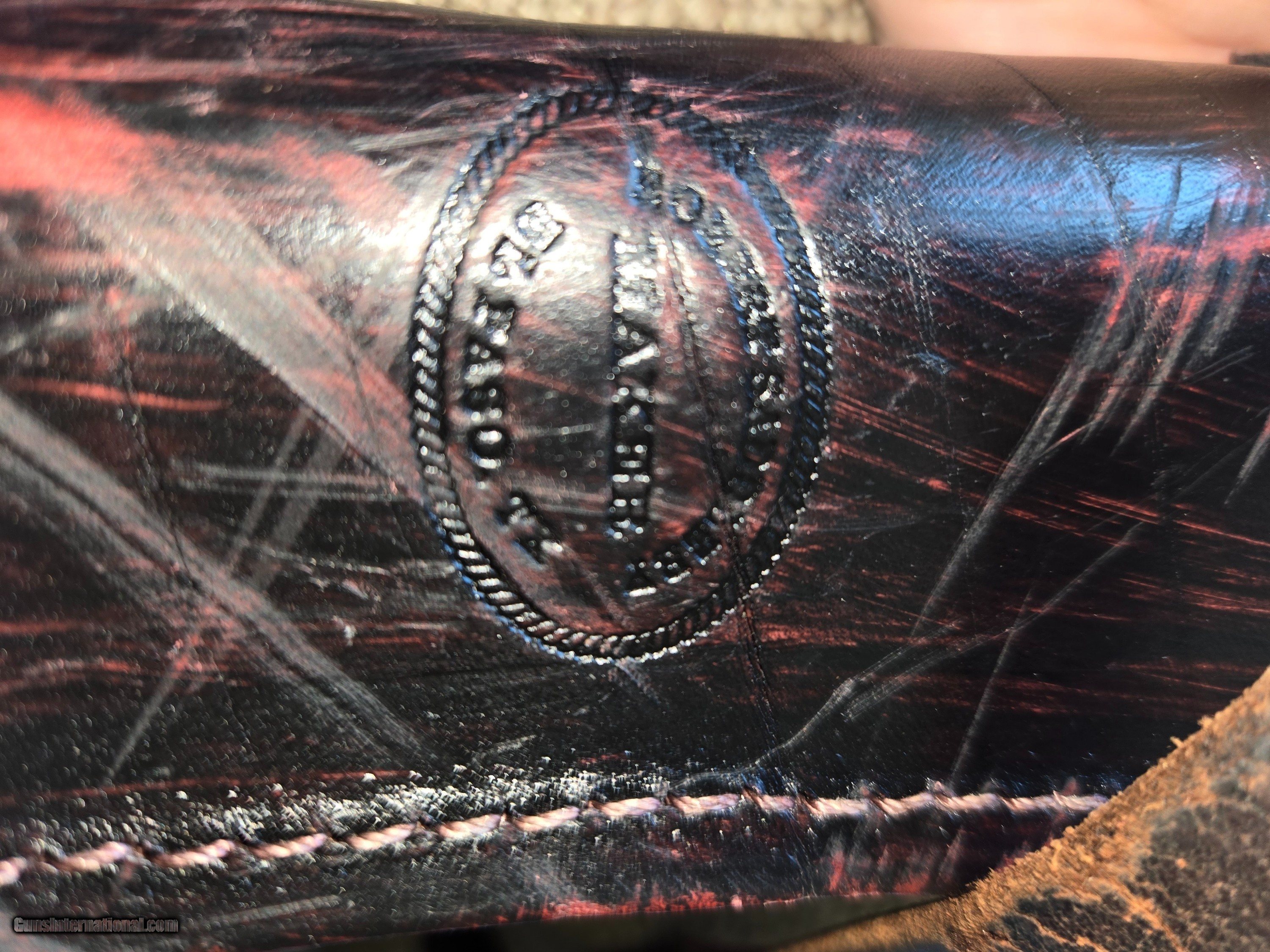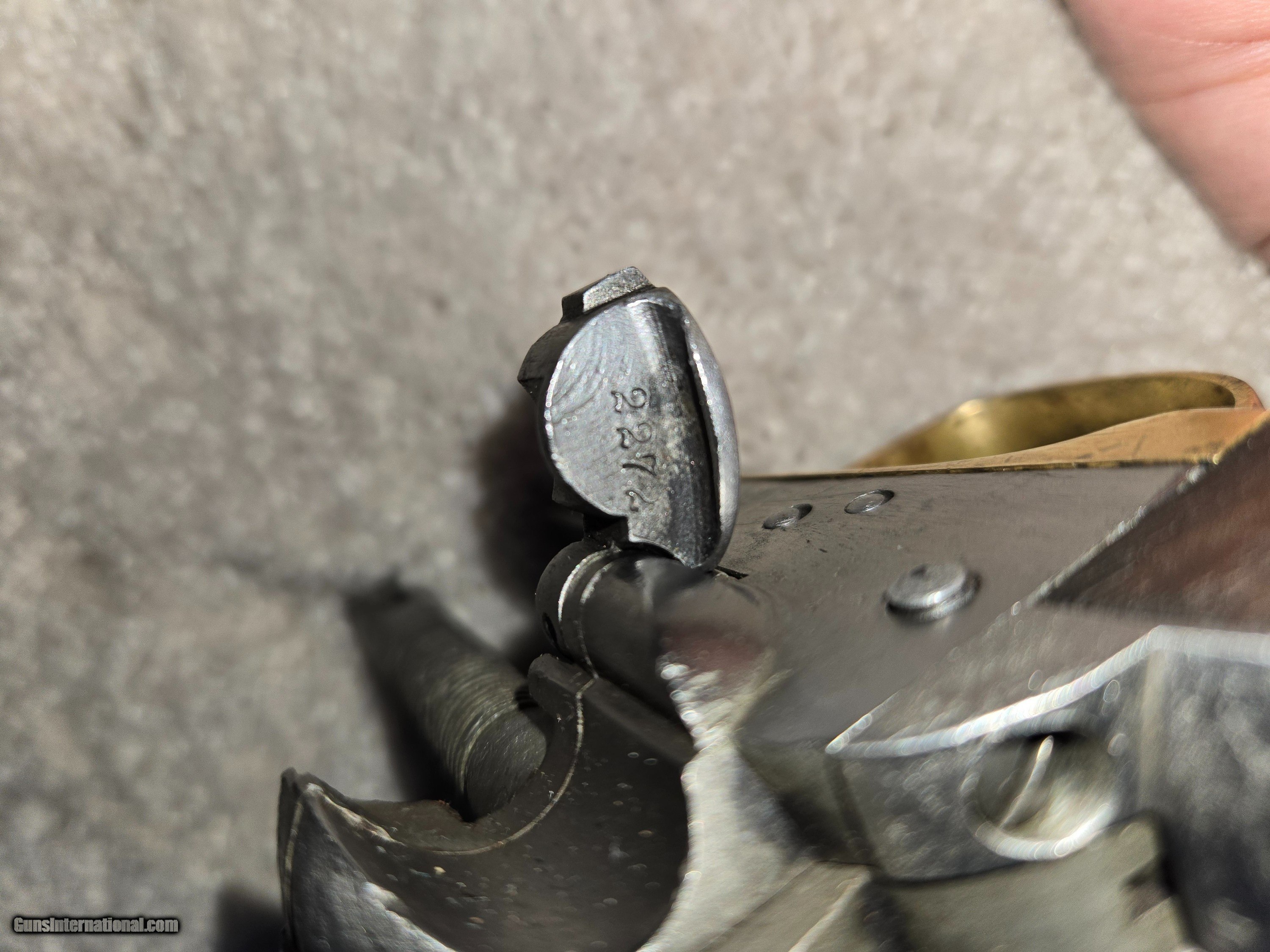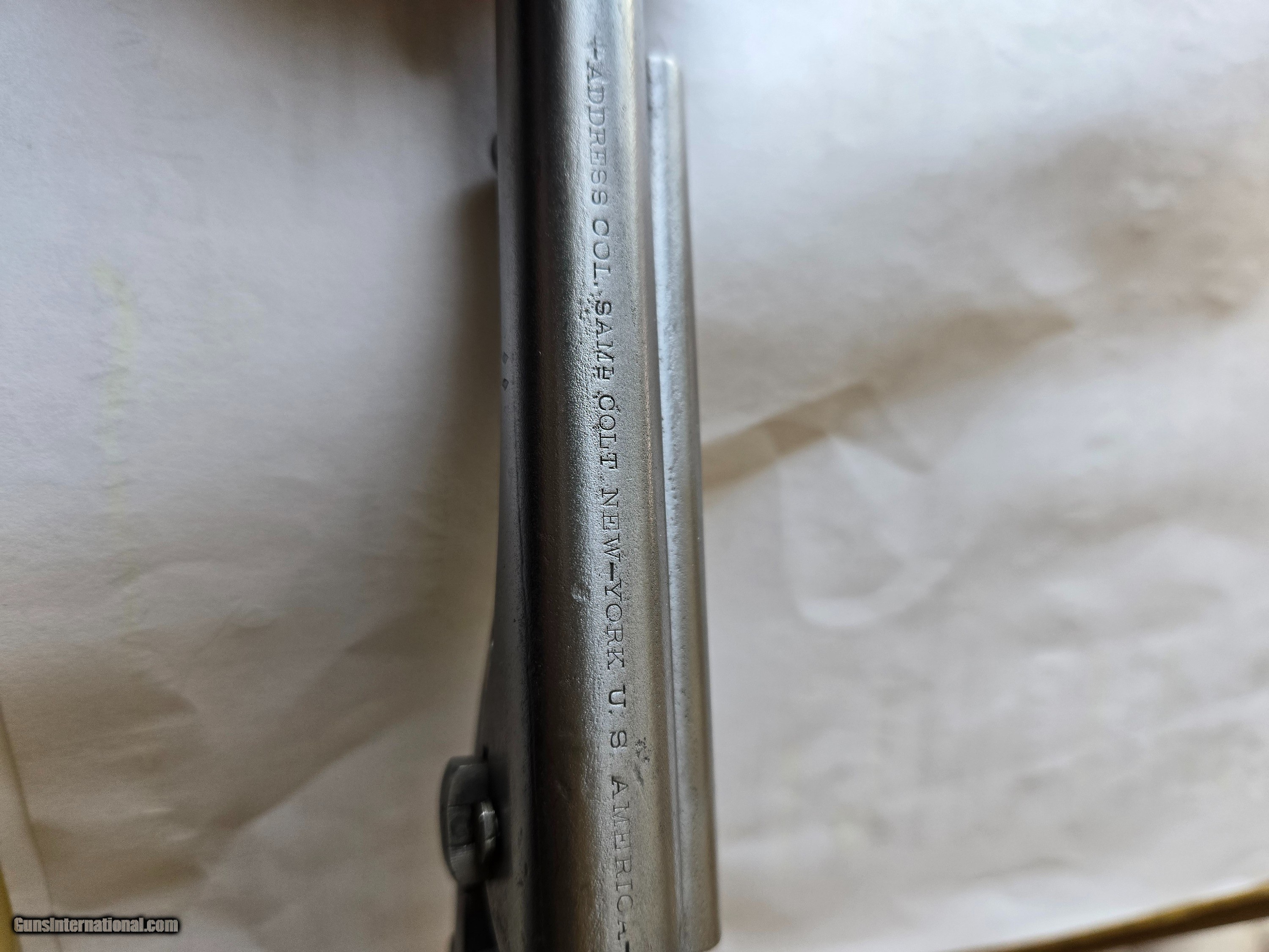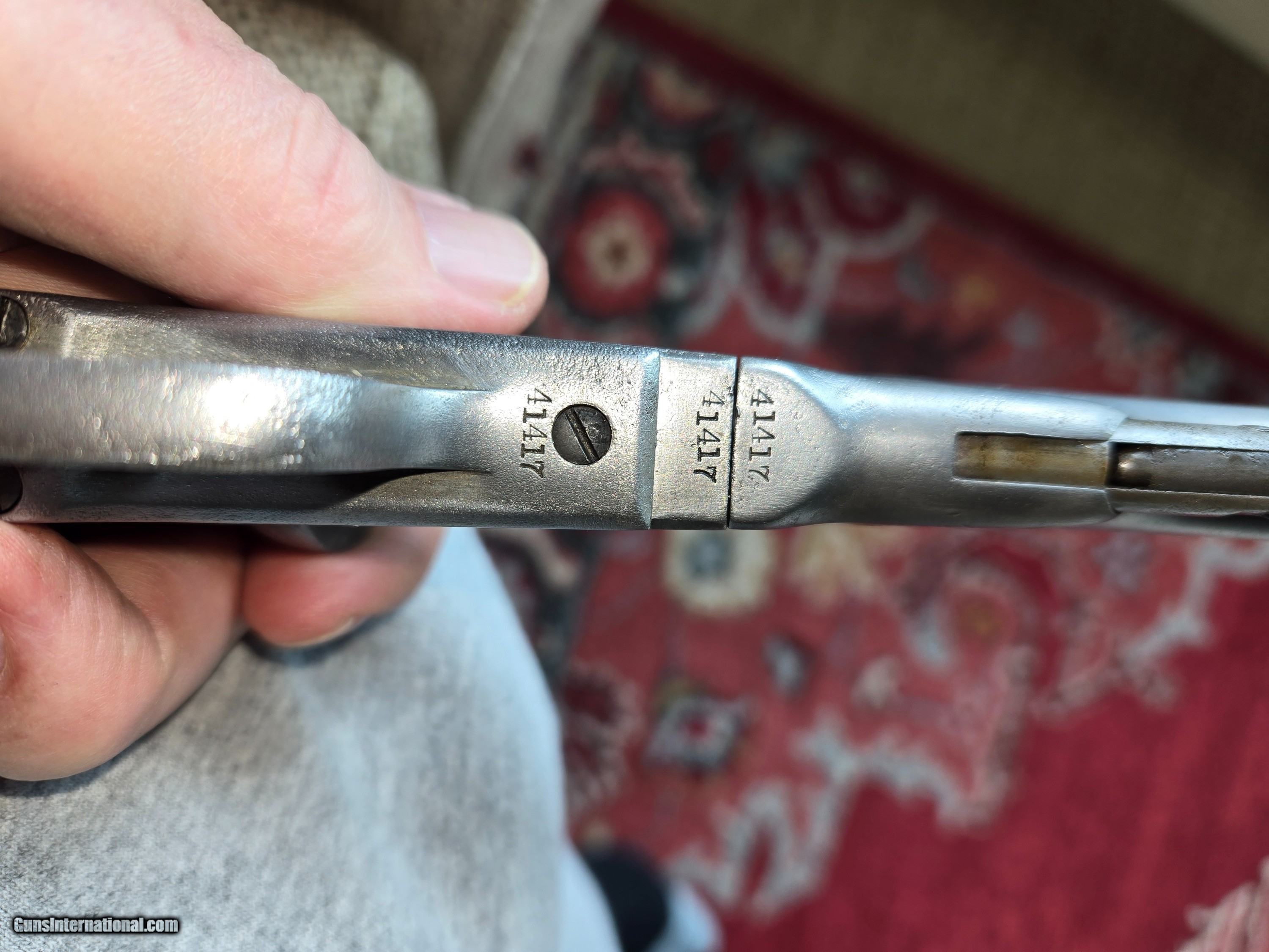 Description: Listed is a Colt Model 1861 Navy converted to 38 rim fire by the Richards Conversion. Serial numbers are displayed in the photos . It is tight and functions as it should. Bore is fair as in most of these guns of this age.There is light pitting in some places. Most of the scene is gone except the serial number. The initials PAR are scratched in the bottom of the grips . It coma with the original holster and belt. The holster is marked El Paso. Old repaired crack in right will consider offers. grip. A original Remington 38 bullets comes with the gun. Shells must be shipped separately. Any additional pictures please text me. 608 333 6354 SOLD Antique: Yes |