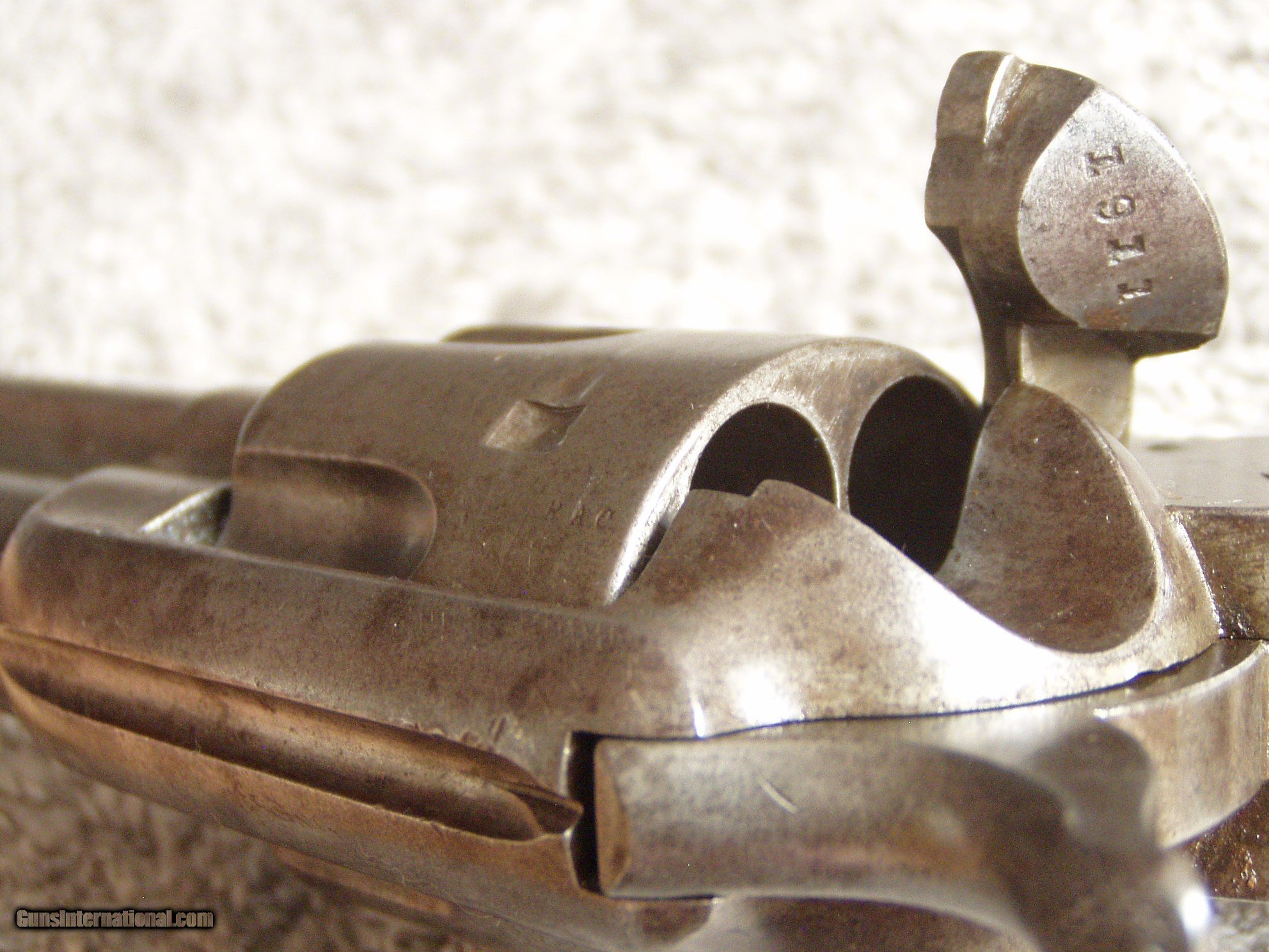 Description: Documented U.S. " Rinaldo A. Carr", Inspected Colt Single Action Army Cavalry Revolver with Factory Archive Letter. .45 LC Caliber, with a 7.5" barrel an excellent bore. The accompanying factory letter states the revolver was one of 250 units sold to the U.S. Government and delivered to the U.S. inspector at the Colt factory on April 29, 1891. The top of the barrel has the one-line Hartford address, the frame has the two-line patent dates marking followed by "U.S." The Rinaldo A. Carr sub inspection "RAC" stamp is located on the underside of the barrel, bottom of the frame and cylinder. There is a "P" proof mark is found on the barrel and cylinder. Matching serial numbers , #140032 are on the frame, trigger guard, back strap, and the cylinder. has the last 4 digits ,"0032" of serial number. The Loadind gate and the frame(under the trigger guard), have the same 4 digit assembley number "1911" Has a "K" insprctor's mark on the backstrap, triggerguard and end of ejector tube, has a "K" over an "O" in the hammer slot. Walnut grips are solid and show some shrinkage. I can find no markings on grips. The overall condition of this nice revolver is very good, retaining bright original of blue on/around/under the ejector rod housing and faint traces of original case colors, otherwise a smooth mottled brown/gray patina. . Mechanical fine with all 4 clicks, indexes properly and locks up tight. Buyer pays $20.00 shipping to lower 48 states. I accept USPS Money Orders or Bank Cashier's Check. Will accept Personal Check, with shipping hold. 3% Credit Card Fee! Three day, non-firing, non-disassembly, inspection period. If returned, for any reason, full refund, less shipping. Layaway Available! One third down, balance on or before end of 90 days. Other reasonable options considered. ANTIQUE! SOLD Antique: Yes Handgun Caliber: .45 Colt Manufacturer: COLT Model: MODEL 1873 U.S. CAVALRY Serial Number: SERIAL #140032 Barrel Length: 7.5 Bore: 7.5 Chambers: SIX Ejectors: BARREL ROD Condition: VERY GOOD Metal Condition: VERY GOOD Wood Condition: VERY GOOD Bore Condition: VERY GOOD Barrels: ONE Barrel Type: ROUND Action: SINGLE ACTION Triggers: ONE Stock: WALNUT Finish: BLUED &PATINA Sights: BARREL Manufacture Date: 1891 Extras: ARCHIVE LETTER |