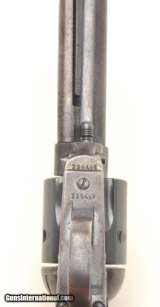 Description: pistol is in good overall condition with a replaced cylinder and grips. The 4 ¾” barrel retains a significant amount of thinning blue in the protected areas, while the frame and hammer show traces of muted case hardening. The barrel address remains sharp as do the caliber marking and Rampant Colt on the frame. The cylinder is a later Colt replacement, nice Colt madalion faux ivory grips. The bore is good, the action is crisp and the markings are sharp. . (C+R). SOLD Curio/Relic: Yes |