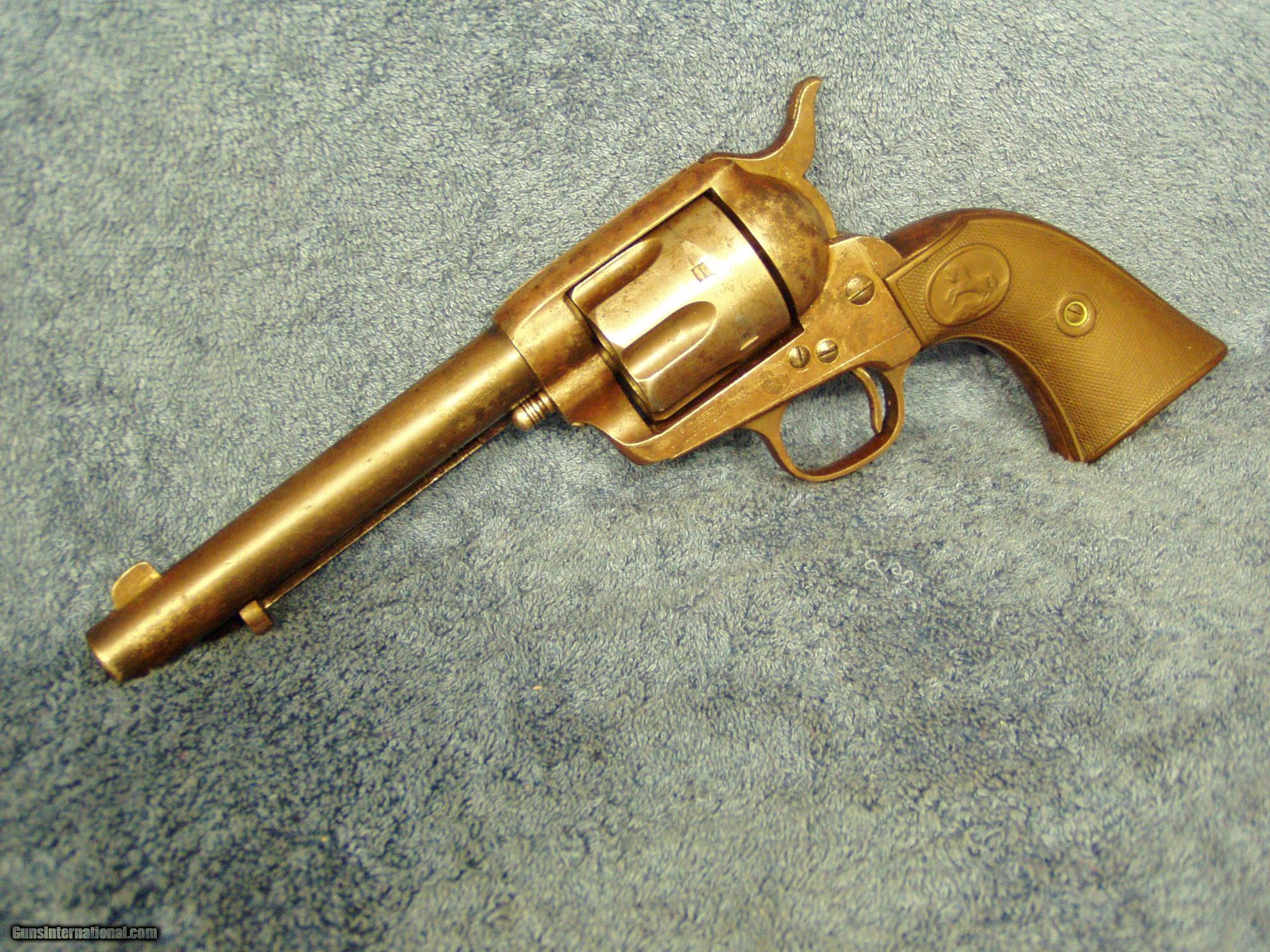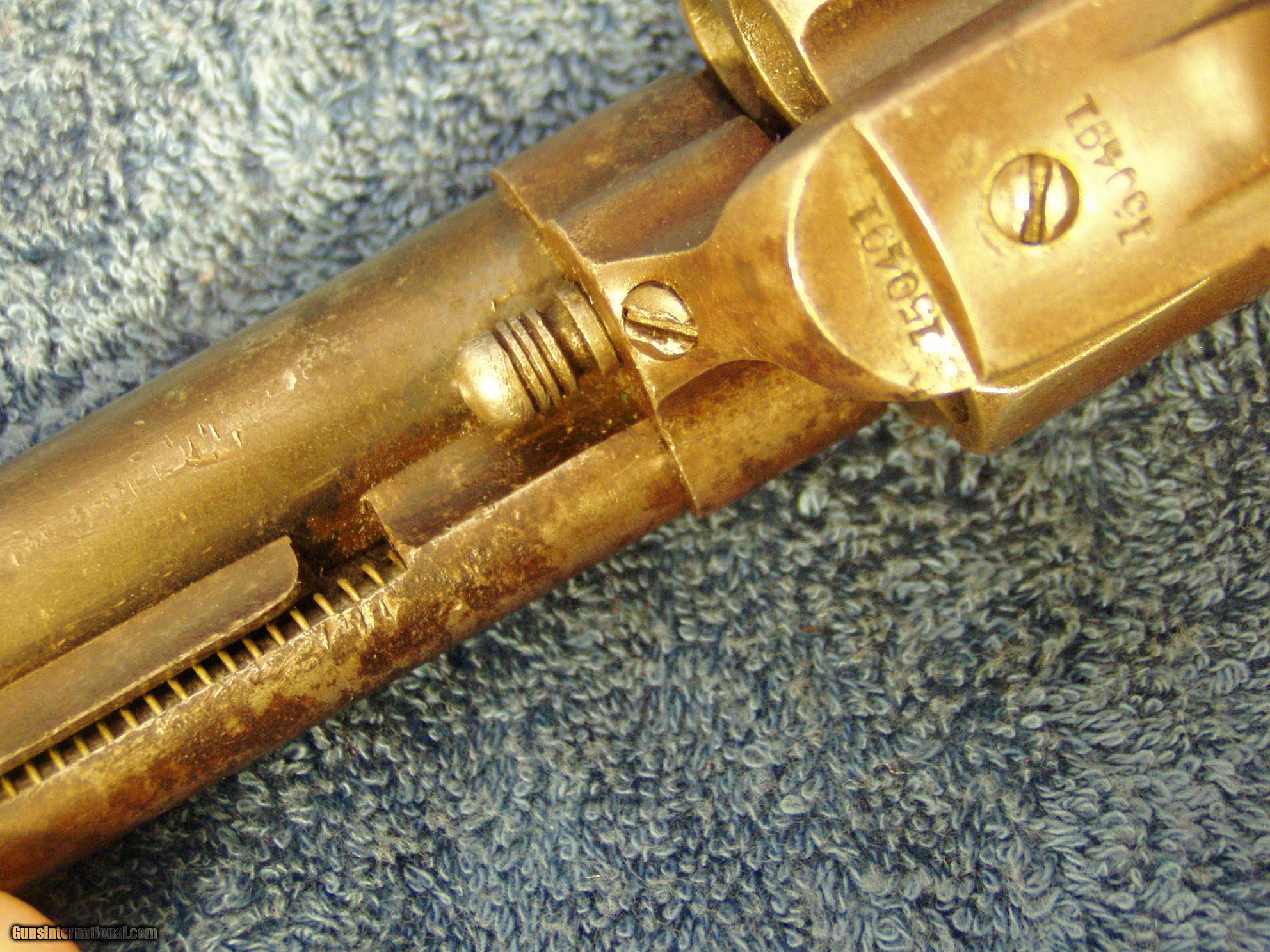 Description: Nice used Colt Single Action Army Revolver. .41 caliber. Has a 5.5" round barrel with a very good bore with moderate pitting. Has much much of the blue finish remaining on the barrel, case colors on frame turning to plum; has overall mottled oxidation. Grips show some wear but details remain sharp. Small chip on the front corner of left grip. Crisp ,strong action that functions like it should. Serial number #150491. All matching! Manufactured in 1893. Comes with Factory Letter! Buyer pays $35.00 Shipping to lower 48 states. I accept USPS Money Orders or Bank Cashier's Check. Will accept Personal check, with shipping hold. Layaway Available! ANTIQUE SOLD Antique: Yes Manufacturer: COLT Model: Single Action Army Serial Number: Serial # 150491 Caliber Info: .41 Colt Bore: 5.5 inch Chambers: 6 shot Ejectors: barrel ejector Condition: Very Good Metal Condition: Very Good Bore Condition: Very strong, light pitting Barrels: ONE Barrel Type: round Action: DA & SA Triggers: one Stock: Hard Rubber Finish: Blued Sights: open Manufacture Date: 1893 |