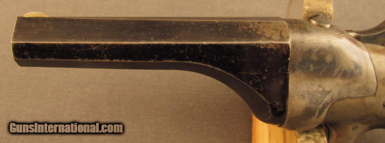 Description: Serial #1015, .41 RF, 4" part octagon barrel with an excellent, bright bore. This is a handsome pistol that retains 95% plus of the bright original blue on the barrel which has a few minor surface scratches and some silvering along the sharp edges. The frame and rotating breech have retained most of their original vivid color case-hardening with the balance having faded to a mottled gray patina. The hammer likewise retains a large amount of the original color case-hardening. The checkered gutta-percha grip panels are in excellent shape with only a few negligible spots of wear and very little flattening of the points. The mechanism is tight and the action functions flawlessly. This is an excellent example of a Hammond "Bulldog" with an unusually high degree of original finish remaining and would enhance any collection of pocket pistols or gambling paraphernalia. Antique SOLD Antique: Yes Manufacturer: Hammond Model: Bulldog Serial Number: 1015 Caliber Info: .41RF Gauge Info: .41RF |
