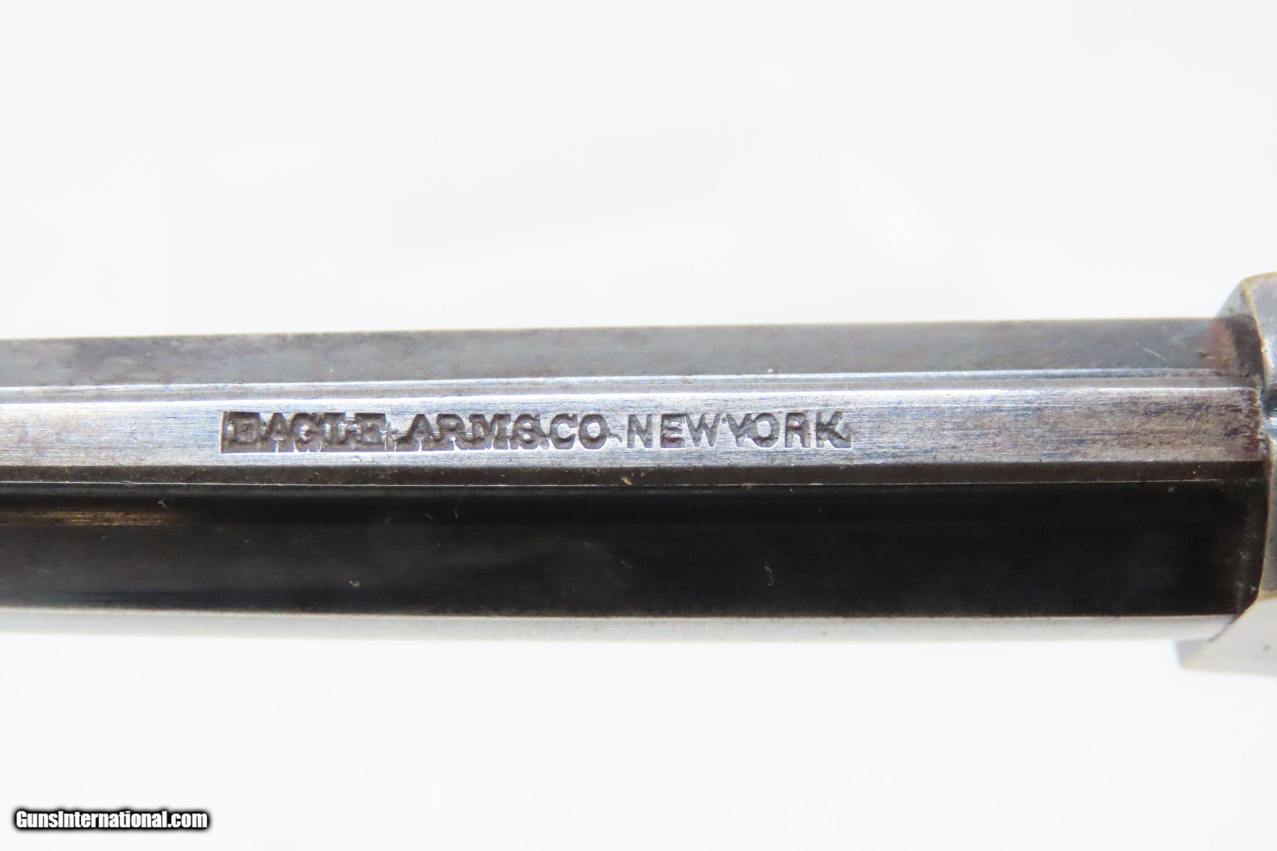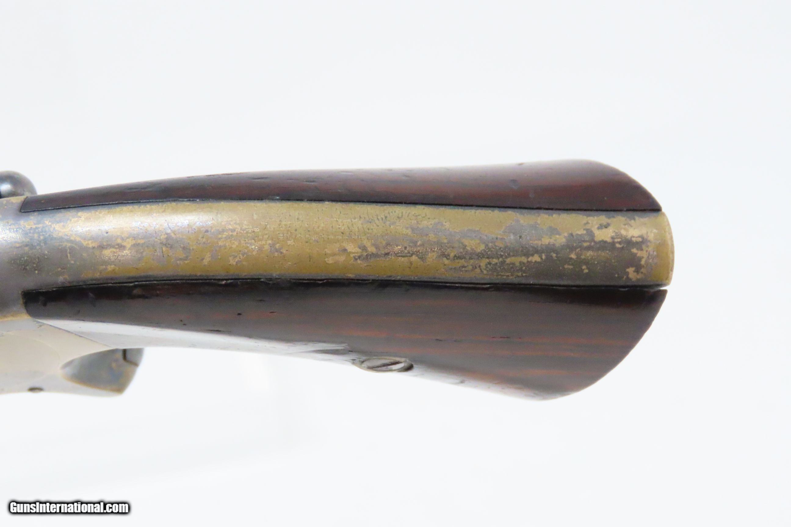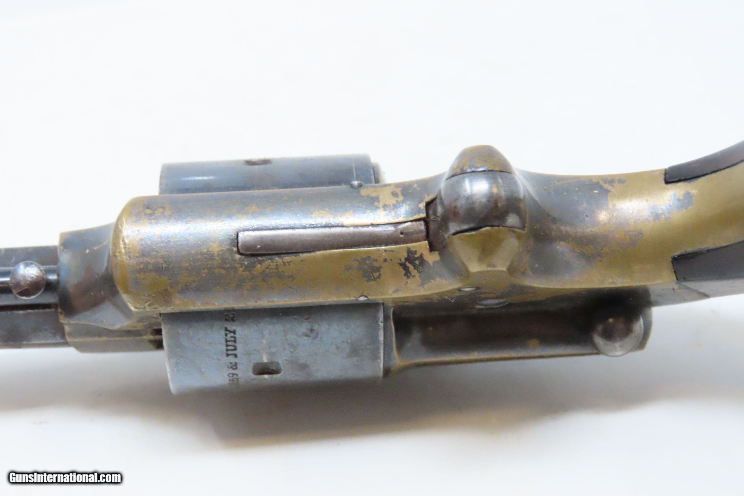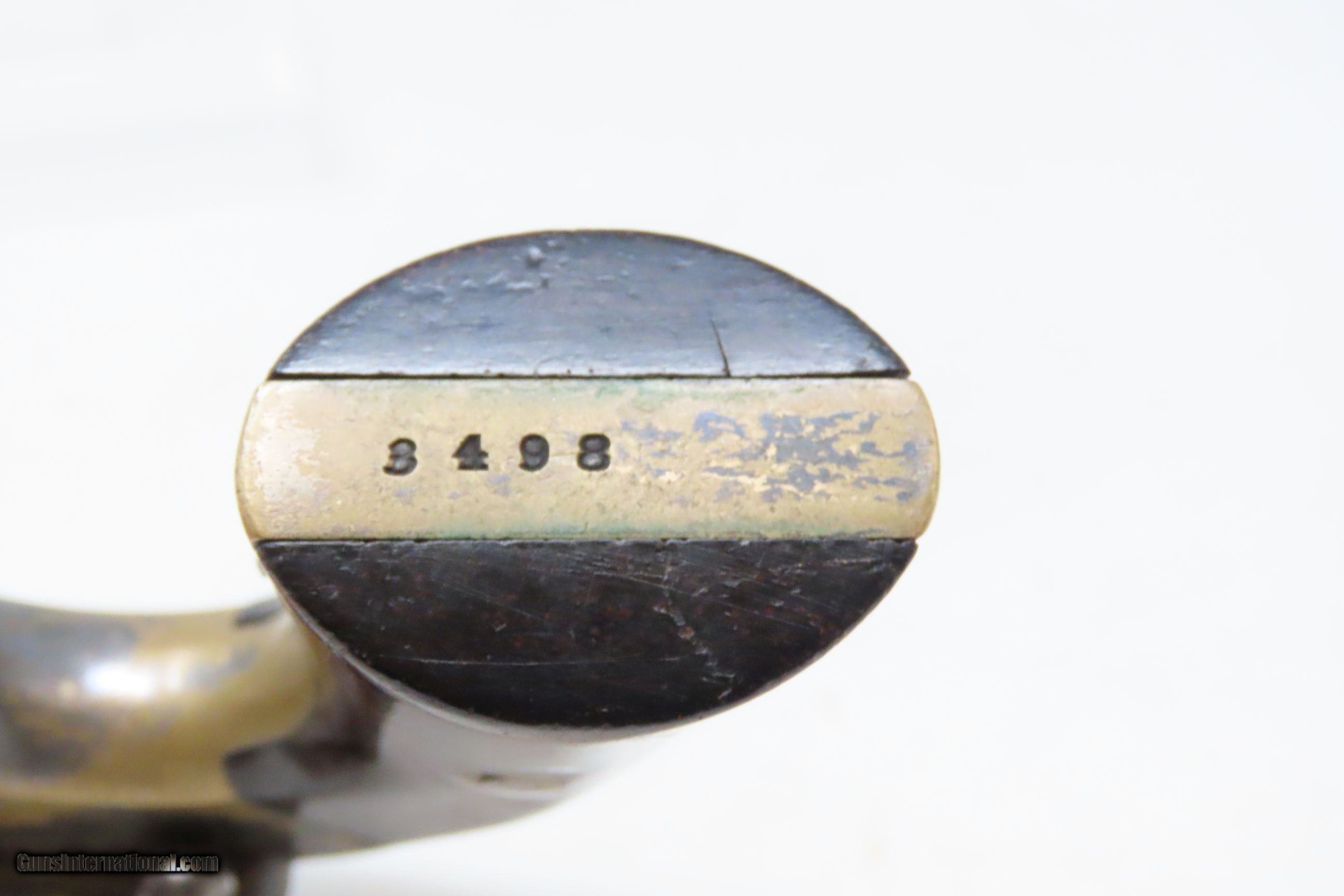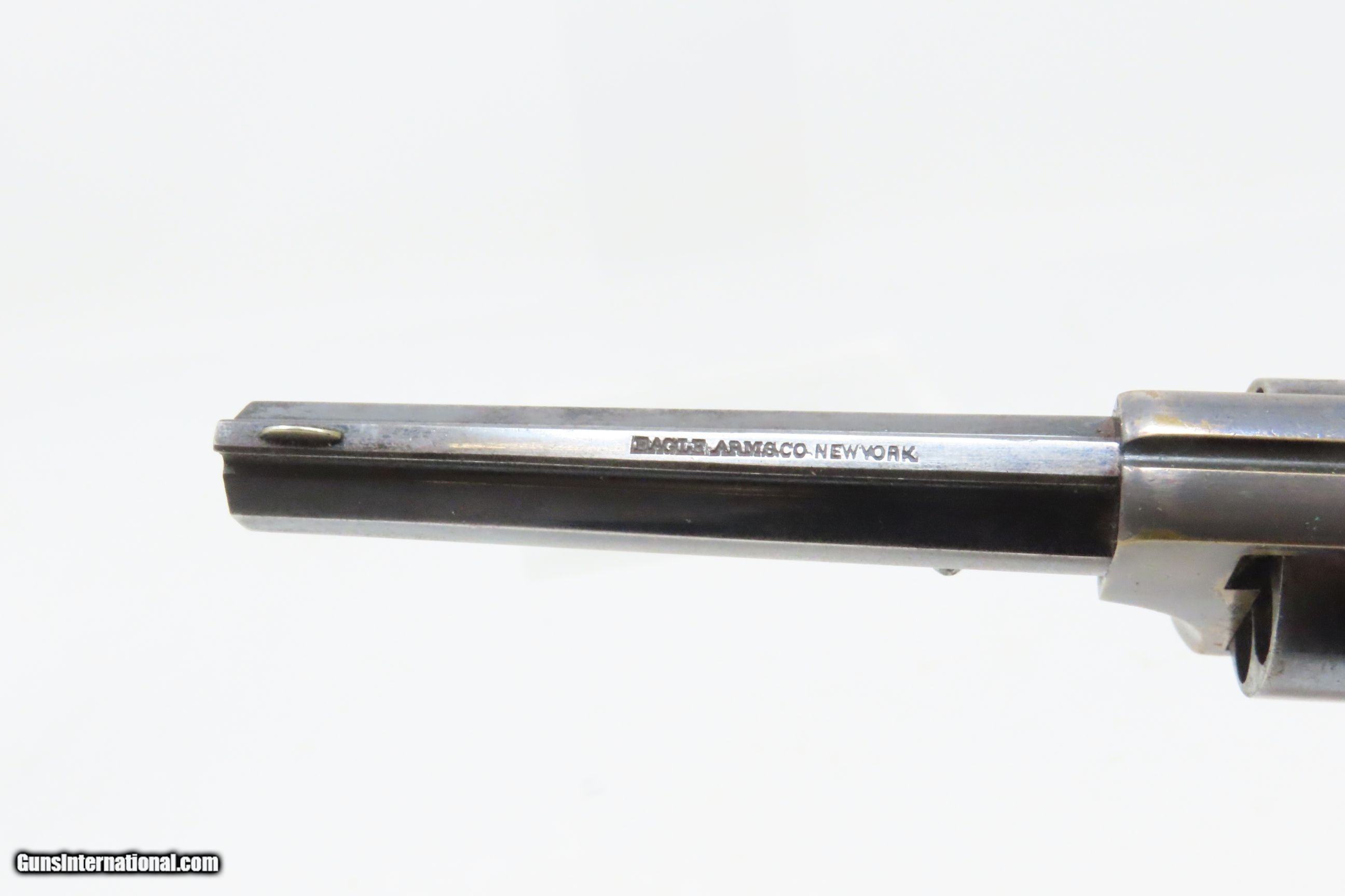 Description: EAGLE ARMS CO. Antique PLANTS Front Loading .30 Cup Primed Revolver HOLSTER Great Little Leather Holster Rig! Here we present an antique Eagle Arms Company Cup Primed Plant’s Front Loading Pocket Revolver and Leather Holster, made circa 1864 in New York, New York. The legendary firearms agents Merwin & Bray of New York City financed the manufacture of this revolver, and they were produced by Plant’s Manufacturing Company. Only 20,000 were made of all types. This was one of the few relatively successful designs that made it around the Smith & Wesson owned Rollin White Patent for the bored through cylinder, which was held and vigorously defended until about 1869. This was done by keeping a “lip” at the back of each cylinder chamber, so that the cylinder was not completely bored through and was loaded from the front versus the back of the cylinder. This is why the ejector is located behind the cylinder. The ammunition was unique to this gun in that the bullet’s tip sat flush or below the neck of the cartridge and then neck was flush with the leading edge of the chamber. The back of the cartridge had a distinct cup-shape in which the primer was located. This cartridge was designed by Willard C. Ellis and John H. White, and they were granted the patent in July of 1859. This represents the “Pocket” version of the design. There were belt-sized “Army” versions available as well. Though not a primary military arm during the American Civil War, handguns were commonly privately purchased by soldiers for use on the battlefield. Whether legend or fact, it is interesting to note something commonly read about pocket revolvers of the day: that while they could be used for self-defense against the enemy, many soldiers kept them on their person to defend themselves against an unwanted amputation in the primitive field hospitals that were notorious, even in their day. The overall condition is near fine. Original blue and silver finish. The action (hammer/trigger) is excellent though the cylinder does not lock up due to a weak spring. The grips are in great shape. The holster is in very good condition and the flap has been reworked slightly. Fits like a glove! A handsome little rig! Own the original! This is a legitimate antique and not a reproduction. Barrel is 3-1/2 inches. Caliber: .30 cup primed (teat-fire) cartridge Overall condition as seen in photos. Very Fast. Very Safe. FREE SHIPPING WORLDWIDE. Delivered directly to your door by express mail! Guaranteed AUTHENTIC & Includes CERTIFICATE OF AUTHENTICITY. ancestryguns $1700 #230915 SOLD Antique: Yes |