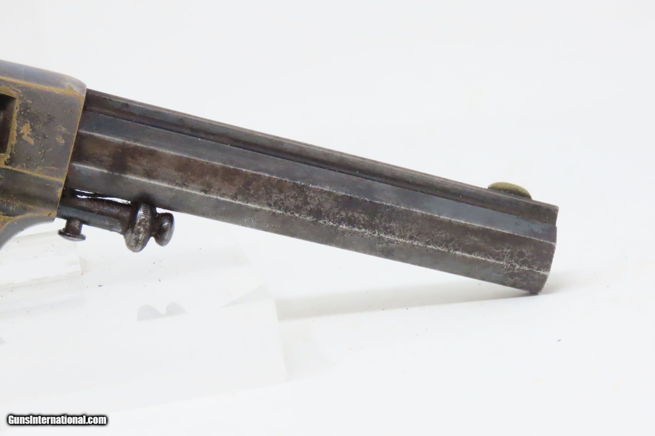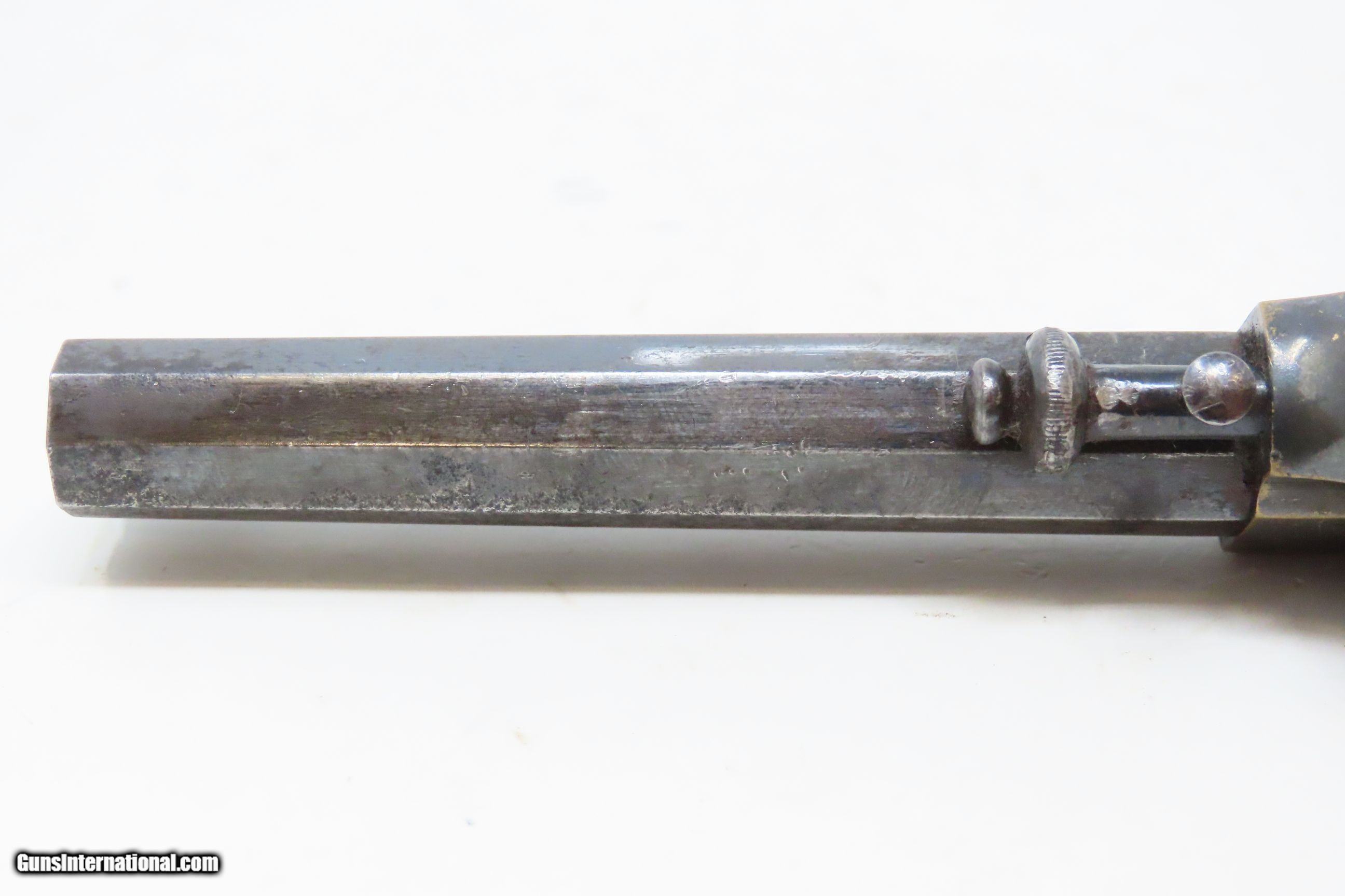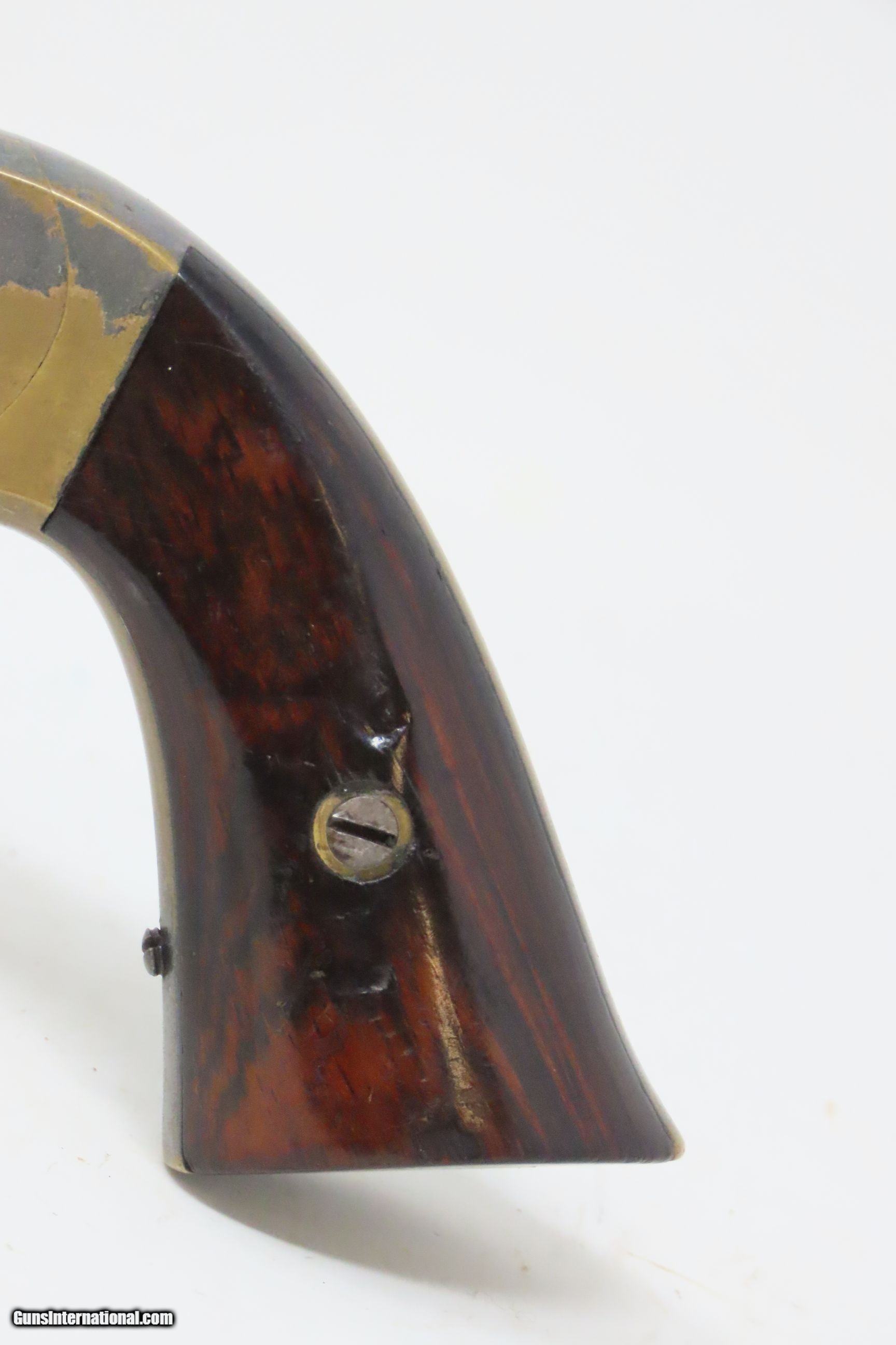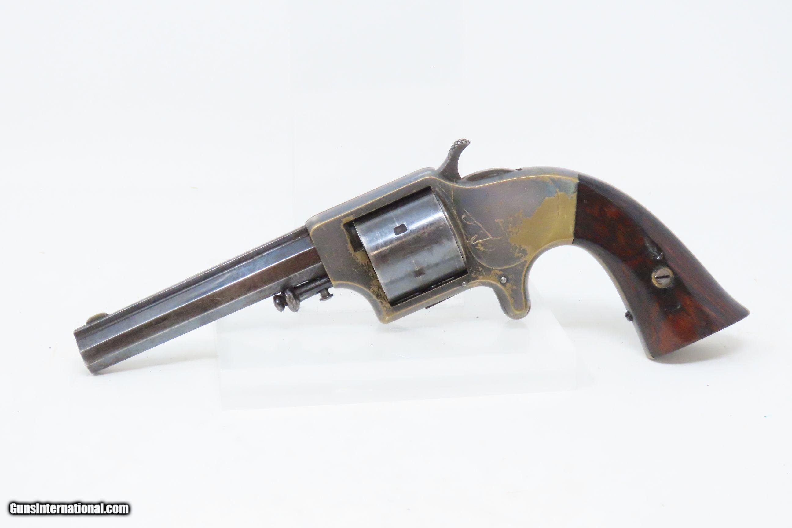 Description: EAGLE ARMS CO. Antique PLANTS Front Loading .30 Cup Primed Revolver HOLSTER Great Little Leather Holster Rig! Here we present an antique Eagle Arms Company Cup Primed Plant’s Front Loading Pocket Revolver and Leather Holster, made circa 1864 in New York, New York. The legendary firearms agents Merwin & Bray of New York City financed the manufacture of this revolver, and they were produced by Plant’s Manufacturing Company. Only 20,000 were made of all types. This was one of the few relatively successful designs that made it around the Smith & Wesson owned Rollin White Patent for the bored through cylinder, which was held and vigorously defended until about 1869. This was done by keeping a “lip” at the back of each cylinder chamber, so that the cylinder was not completely bored through and was loaded from the front versus the back of the cylinder. This is why the ejector is located behind the cylinder. The ammunition was unique to this gun in that the bullet’s tip sat flush or below the neck of the cartridge and then neck was flush with the leading edge of the chamber. The back of the cartridge had a distinct cup-shape in which the primer was located. This cartridge was designed by Willard C. Ellis and John H. White, and they were granted the patent in July of 1859. This represents the “Pocket” version of the design. There were belt-sized “Army” versions available as well. Though not a primary military arm during the American Civil War, handguns were commonly privately purchased by soldiers for use on the battlefield. Whether legend or fact, it is interesting to note something commonly read about pocket revolvers of the day: that while they could be used for self-defense against the enemy, many soldiers kept them on their person to defend themselves against an unwanted amputation in the primitive field hospitals that were notorious, even in their day. The overall condition is near fine. Original blue and silver finish. The action (hammer/trigger) is excellent though the cylinder does not lock up due to a weak spring. The grips are in great shape. The holster is in very good condition and the flap has been reworked slightly. Fits like a glove! A handsome little rig! Own the original! This is a legitimate antique and not a reproduction. Barrel is 3-1/2 inches. Caliber: .30 cup primed (teat-fire) cartridge Overall condition as seen in photos. Very Fast. Very Safe. FREE SHIPPING WORLDWIDE. Delivered directly to your door by express mail! Guaranteed AUTHENTIC & Includes CERTIFICATE OF AUTHENTICITY. ancestryguns $1700 #230915 SOLD Antique: Yes |