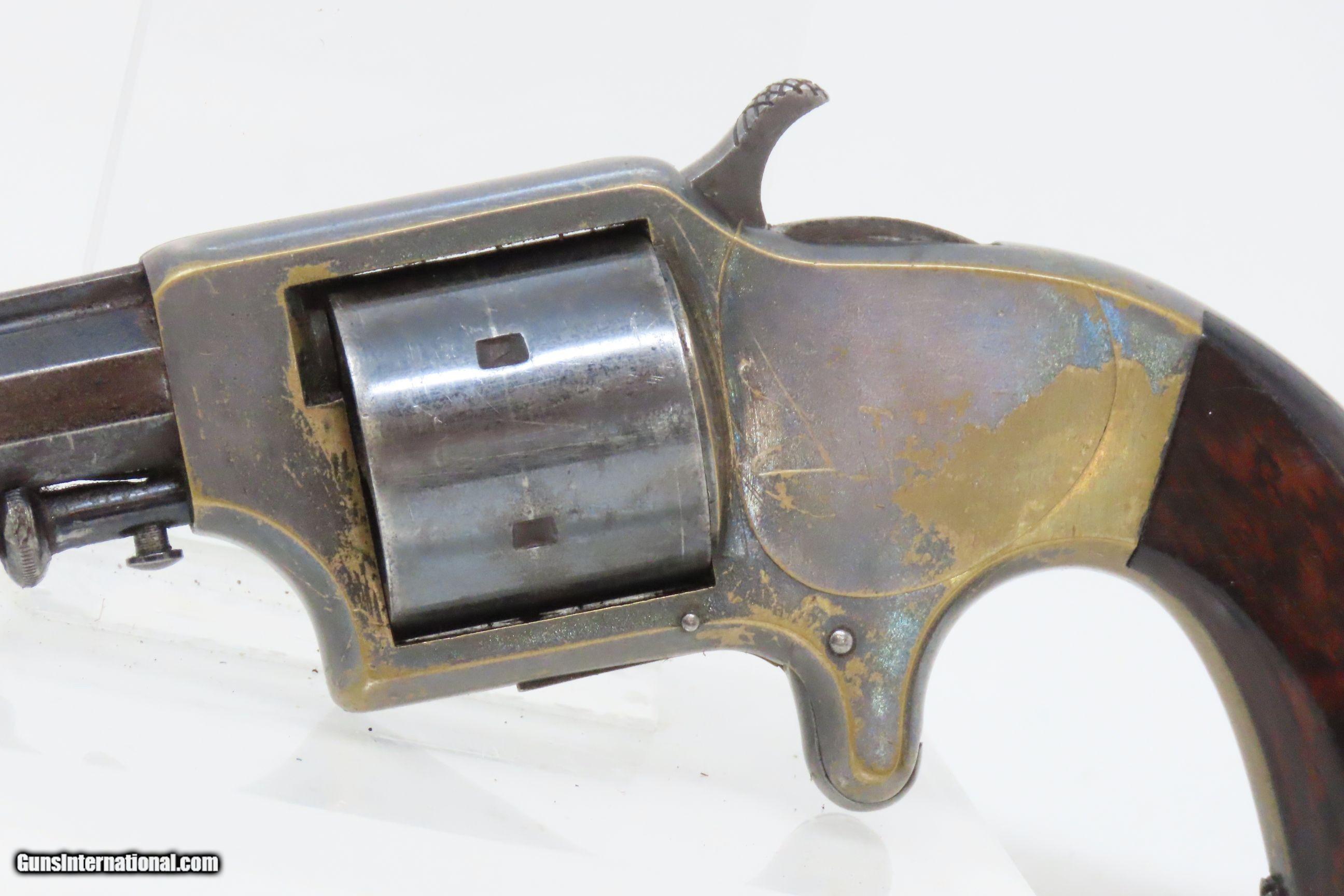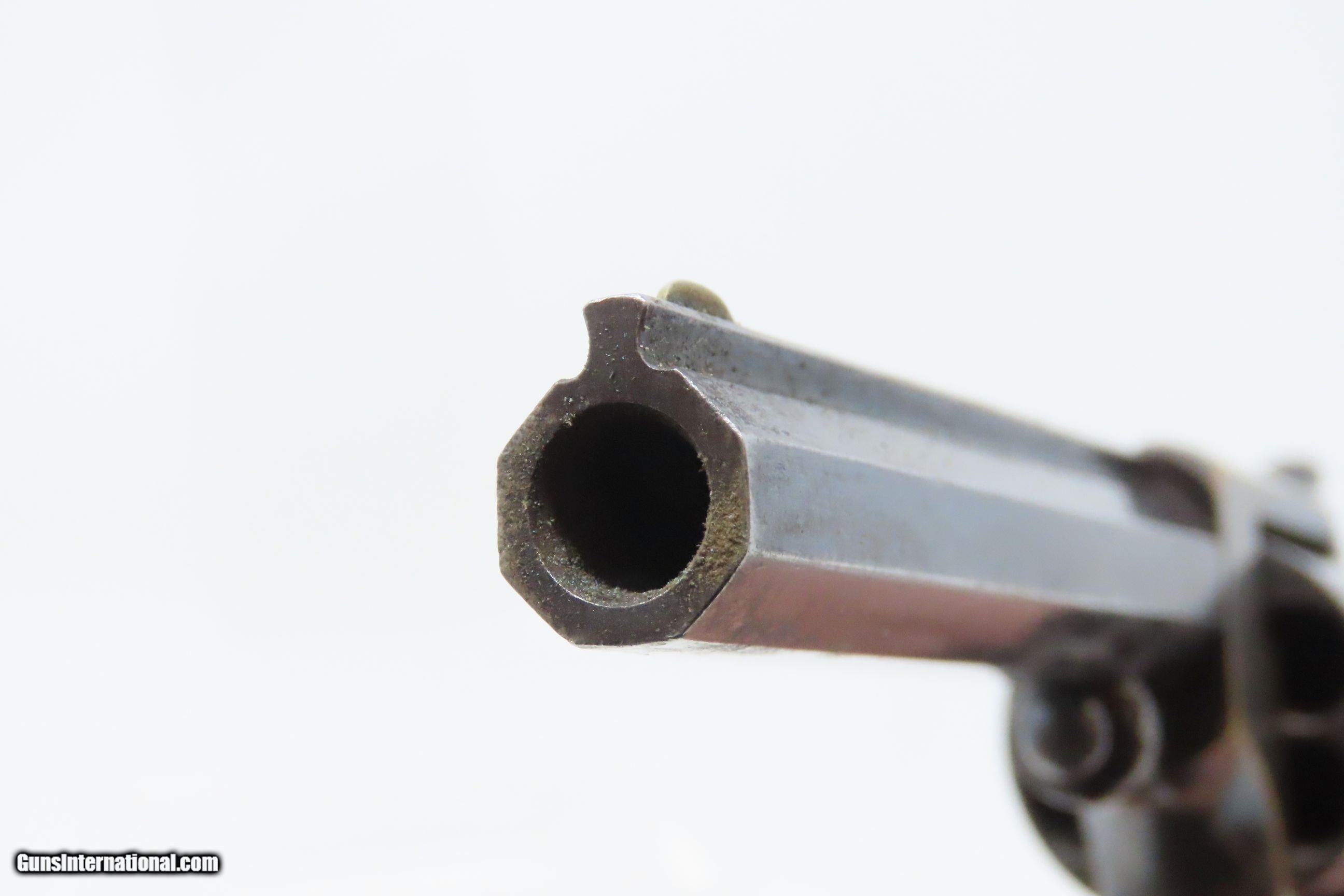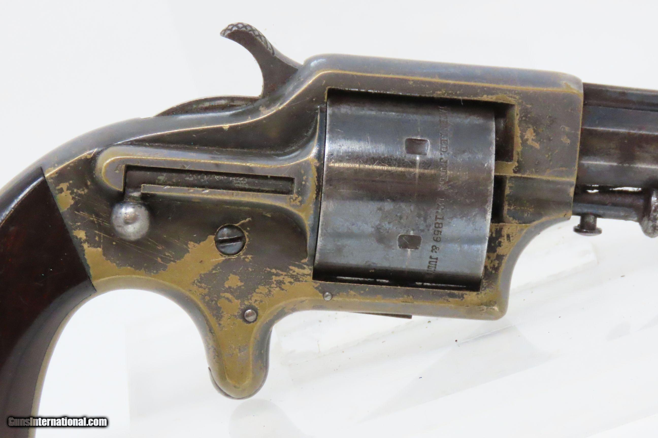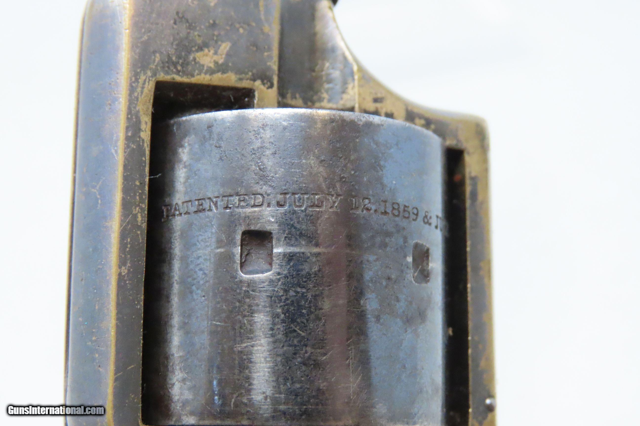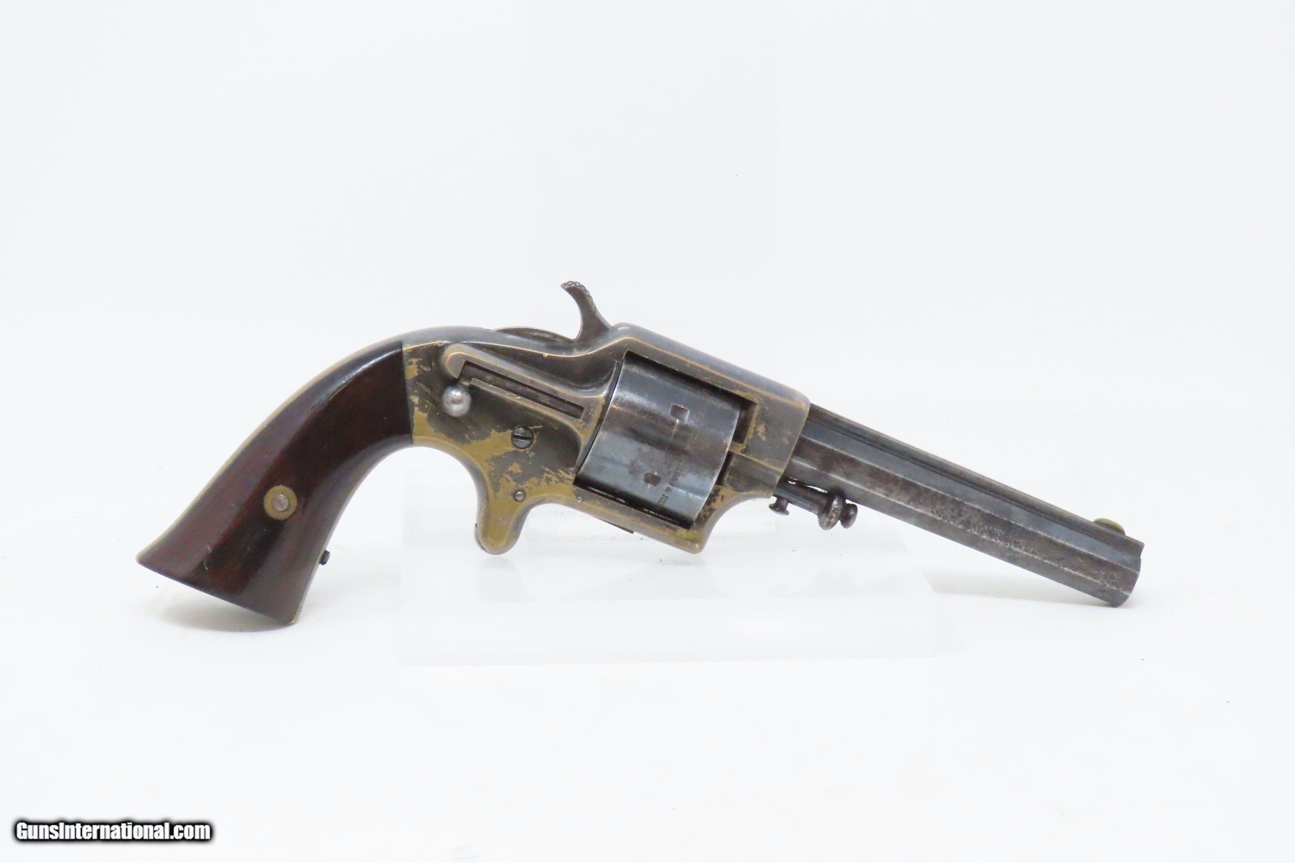 Description: EAGLE ARMS CO. Antique PLANTS Front Loading .30 Cup Primed Revolver HOLSTER Great Little Leather Holster Rig! Here we present an antique Eagle Arms Company Cup Primed Plant’s Front Loading Pocket Revolver and Leather Holster, made circa 1864 in New York, New York. The legendary firearms agents Merwin & Bray of New York City financed the manufacture of this revolver, and they were produced by Plant’s Manufacturing Company. Only 20,000 were made of all types. This was one of the few relatively successful designs that made it around the Smith & Wesson owned Rollin White Patent for the bored through cylinder, which was held and vigorously defended until about 1869. This was done by keeping a “lip” at the back of each cylinder chamber, so that the cylinder was not completely bored through and was loaded from the front versus the back of the cylinder. This is why the ejector is located behind the cylinder. The ammunition was unique to this gun in that the bullet’s tip sat flush or below the neck of the cartridge and then neck was flush with the leading edge of the chamber. The back of the cartridge had a distinct cup-shape in which the primer was located. This cartridge was designed by Willard C. Ellis and John H. White, and they were granted the patent in July of 1859. This represents the “Pocket” version of the design. There were belt-sized “Army” versions available as well. Though not a primary military arm during the American Civil War, handguns were commonly privately purchased by soldiers for use on the battlefield. Whether legend or fact, it is interesting to note something commonly read about pocket revolvers of the day: that while they could be used for self-defense against the enemy, many soldiers kept them on their person to defend themselves against an unwanted amputation in the primitive field hospitals that were notorious, even in their day. The overall condition is near fine. Original blue and silver finish. The action (hammer/trigger) is excellent though the cylinder does not lock up due to a weak spring. The grips are in great shape. The holster is in very good condition and the flap has been reworked slightly. Fits like a glove! A handsome little rig! Own the original! This is a legitimate antique and not a reproduction. Barrel is 3-1/2 inches. Caliber: .30 cup primed (teat-fire) cartridge Overall condition as seen in photos. Very Fast. Very Safe. FREE SHIPPING WORLDWIDE. Delivered directly to your door by express mail! Guaranteed AUTHENTIC & Includes CERTIFICATE OF AUTHENTICITY. ancestryguns $1700 #230915 SOLD Antique: Yes |