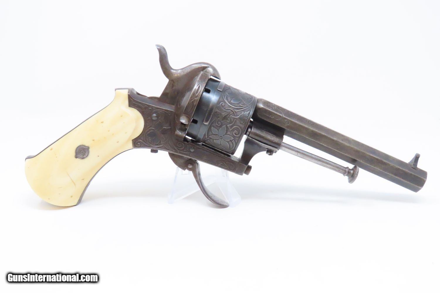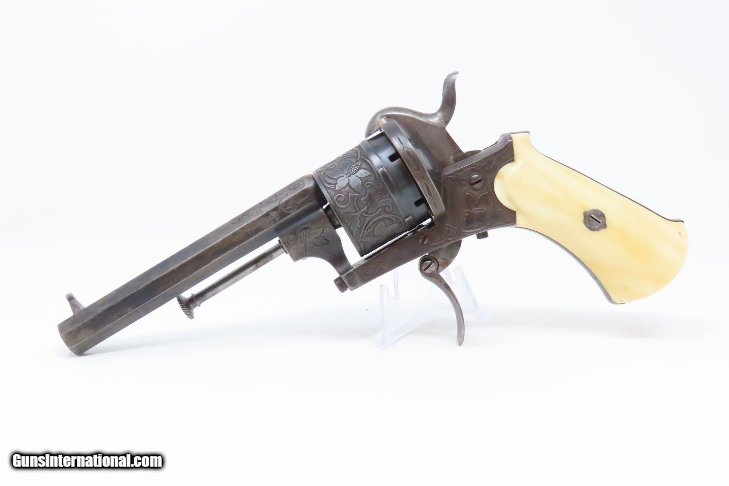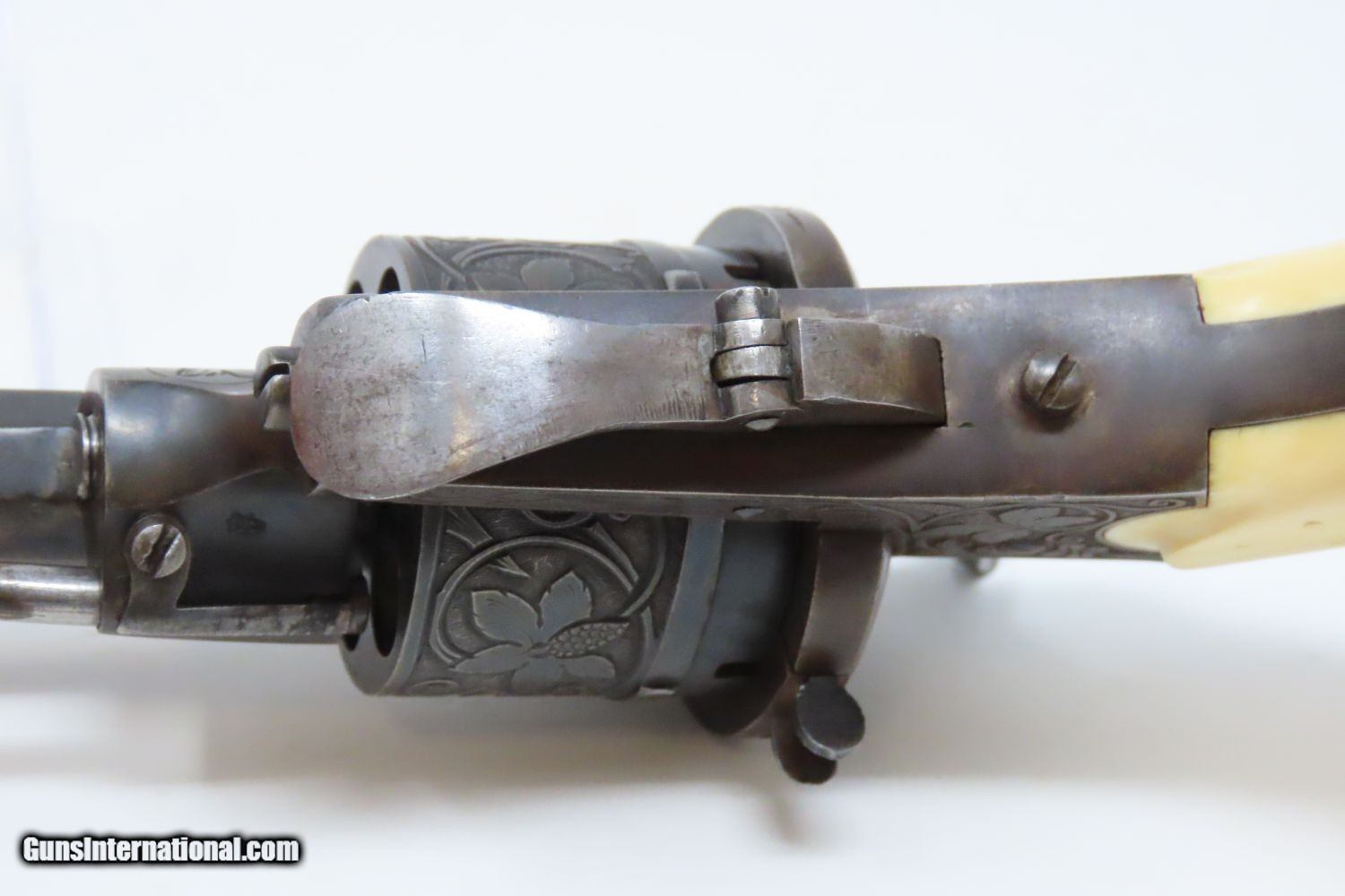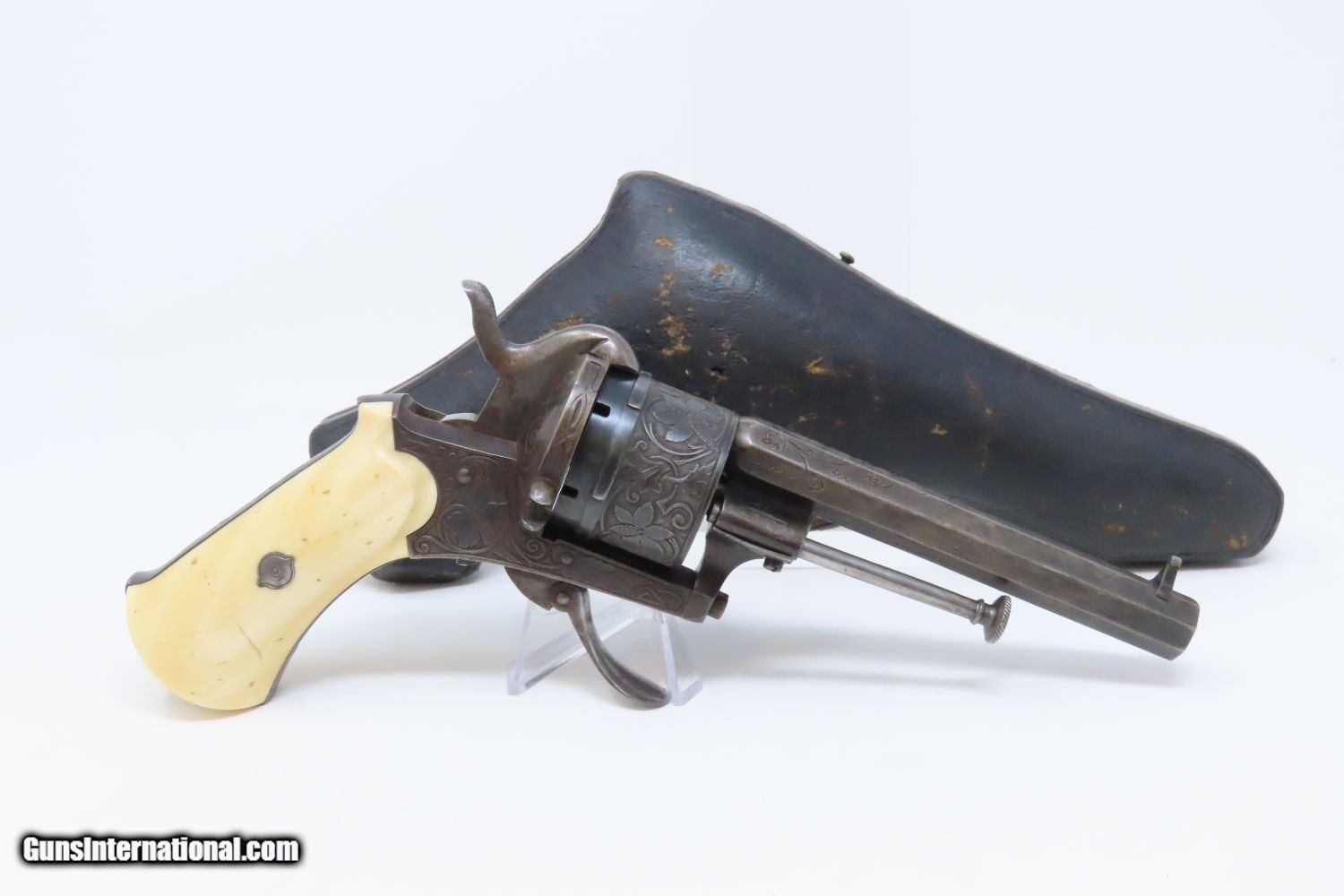 ENGRAVED Antique BELGIAN Proofed 9mm PINFIRE Revolver with PIPE CASE Folding Trigger European Sidearm with ANTIQUE IVORY GRIPS!