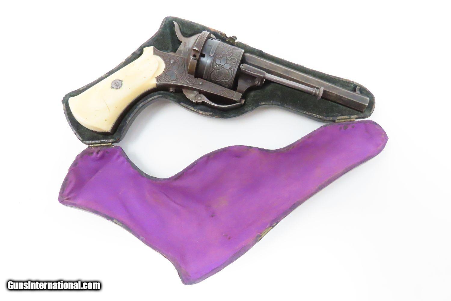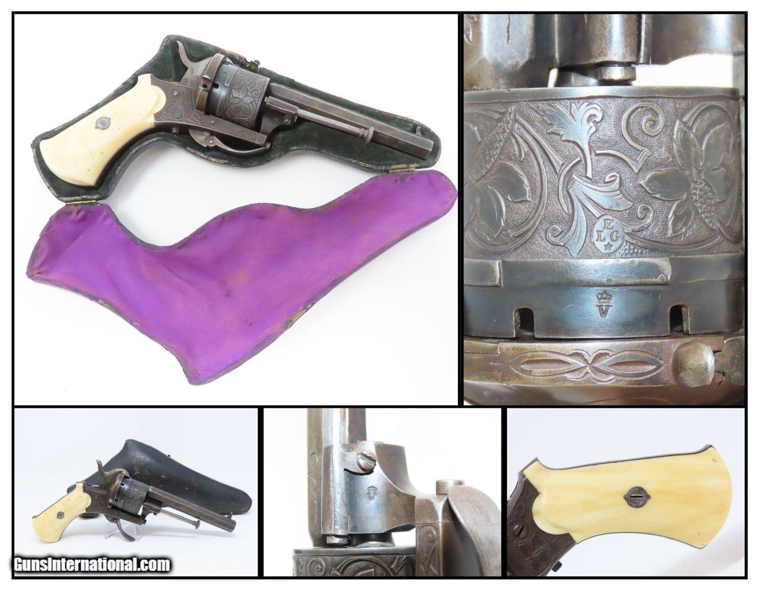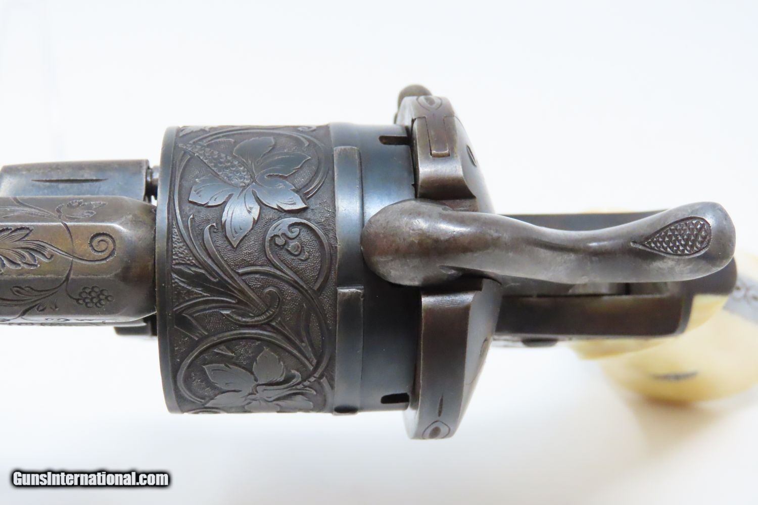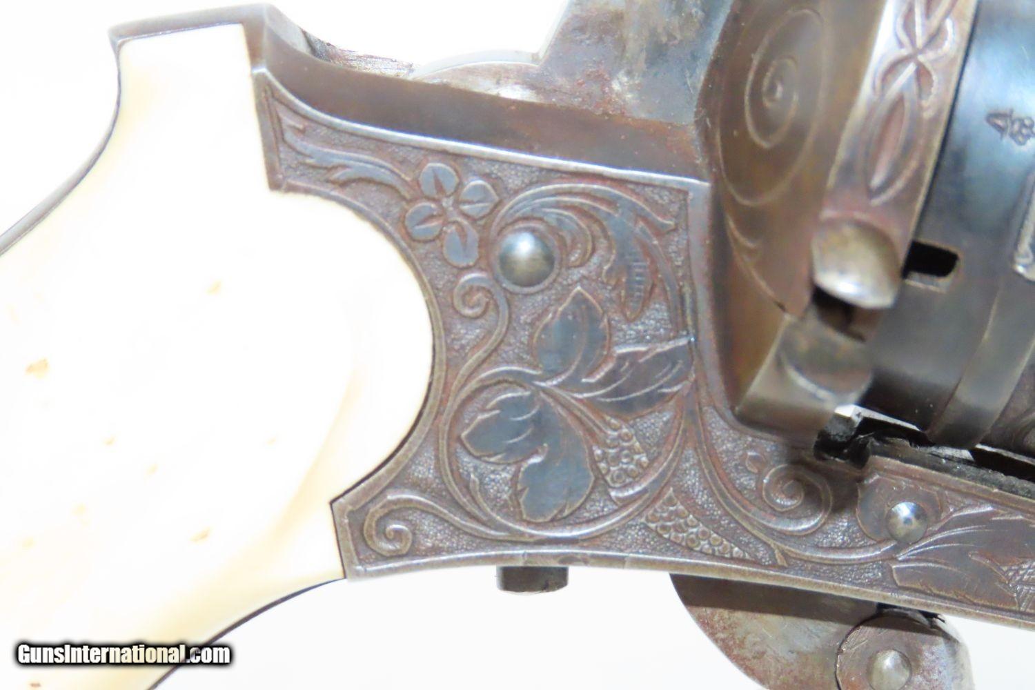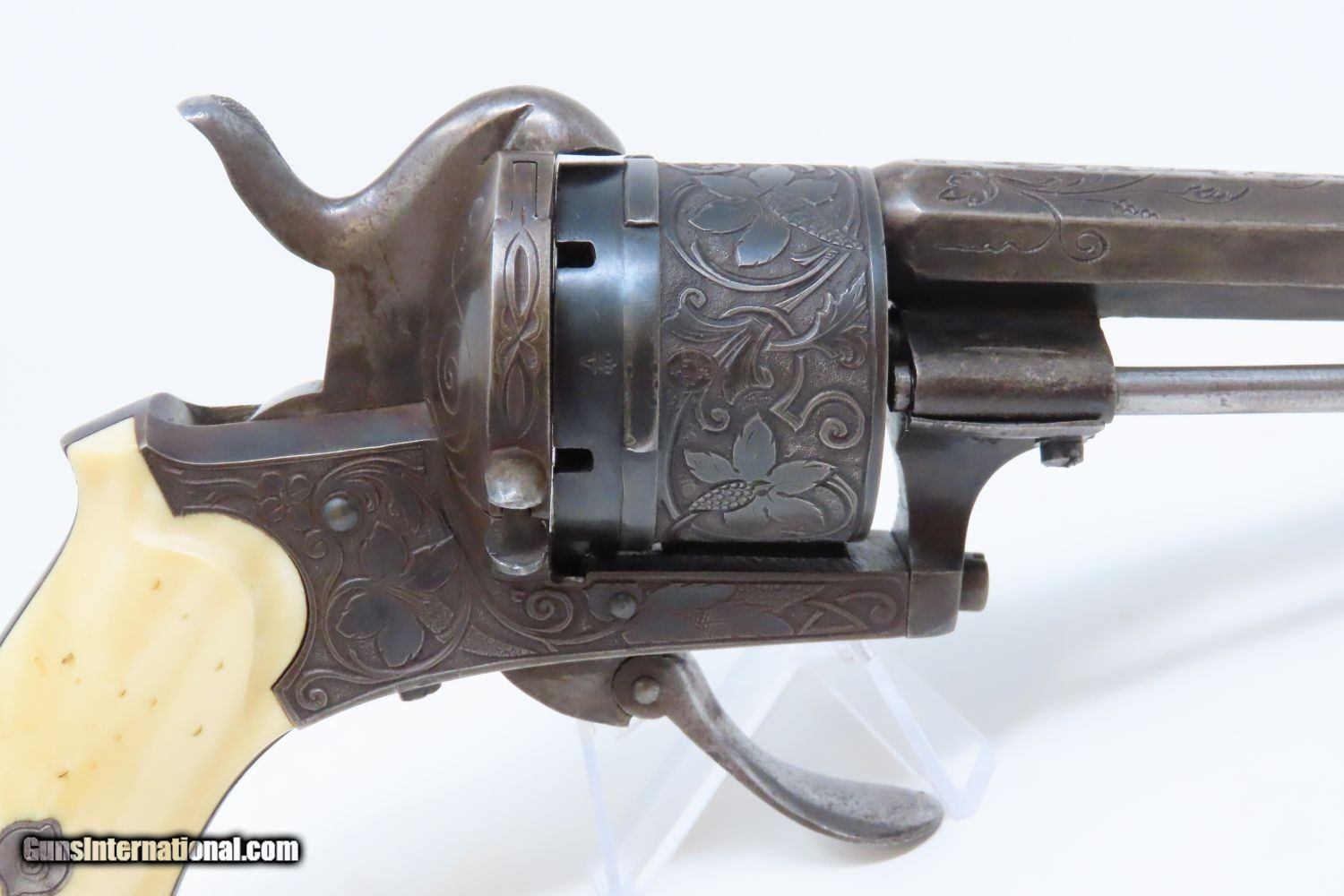 ENGRAVED Antique BELGIAN Proofed 9mm PINFIRE Revolver with PIPE CASE Folding Trigger European Sidearm with ANTIQUE IVORY GRIPS!