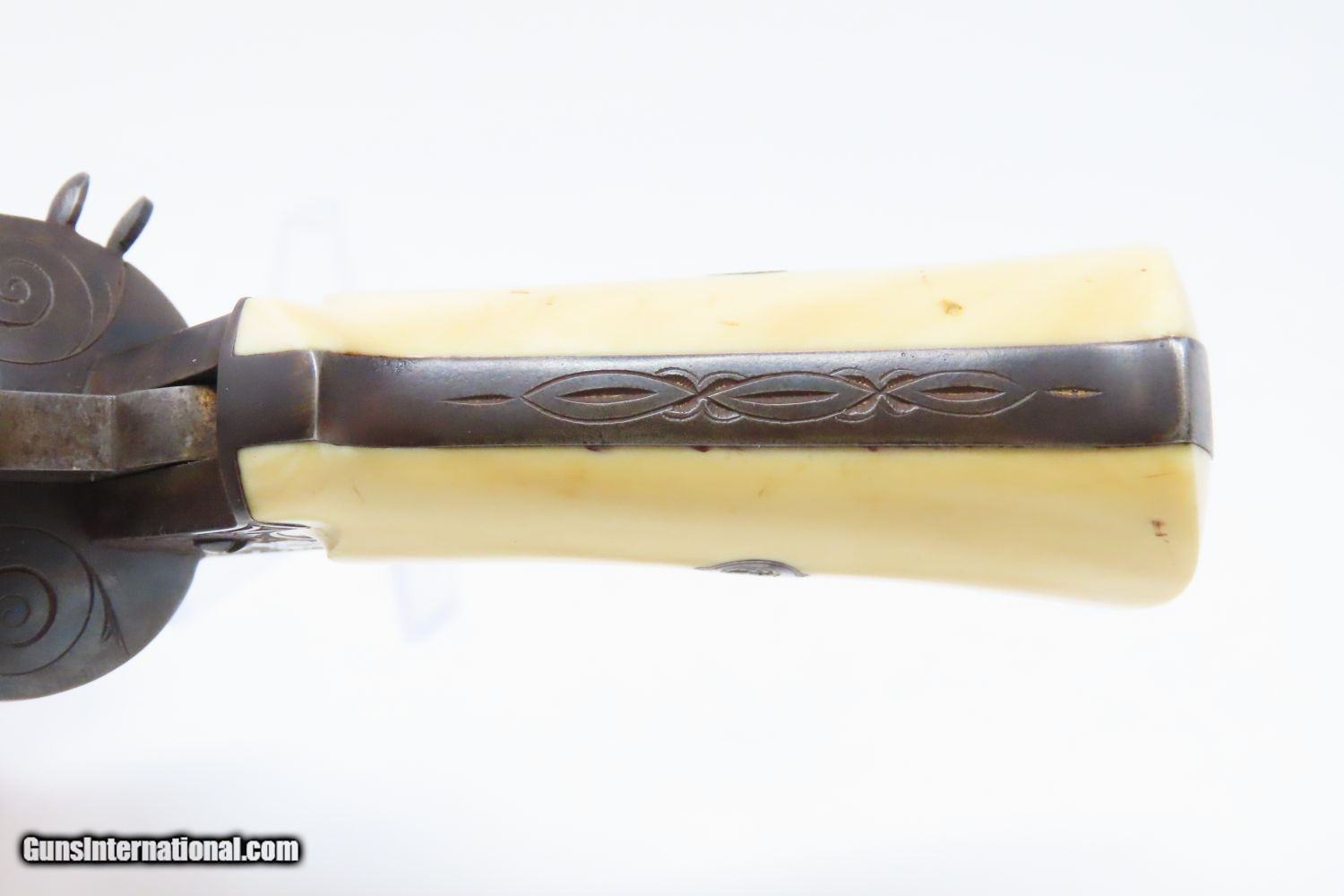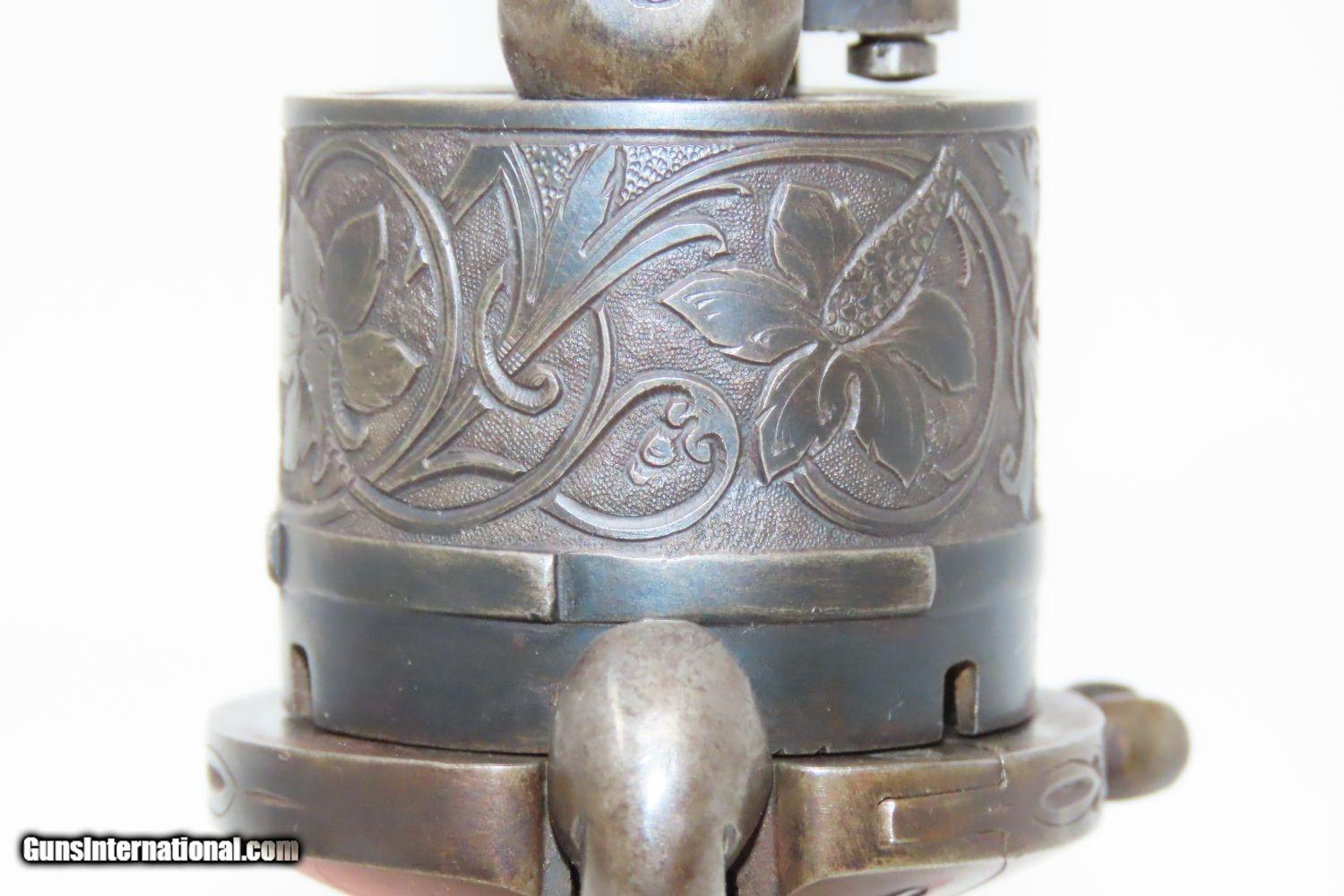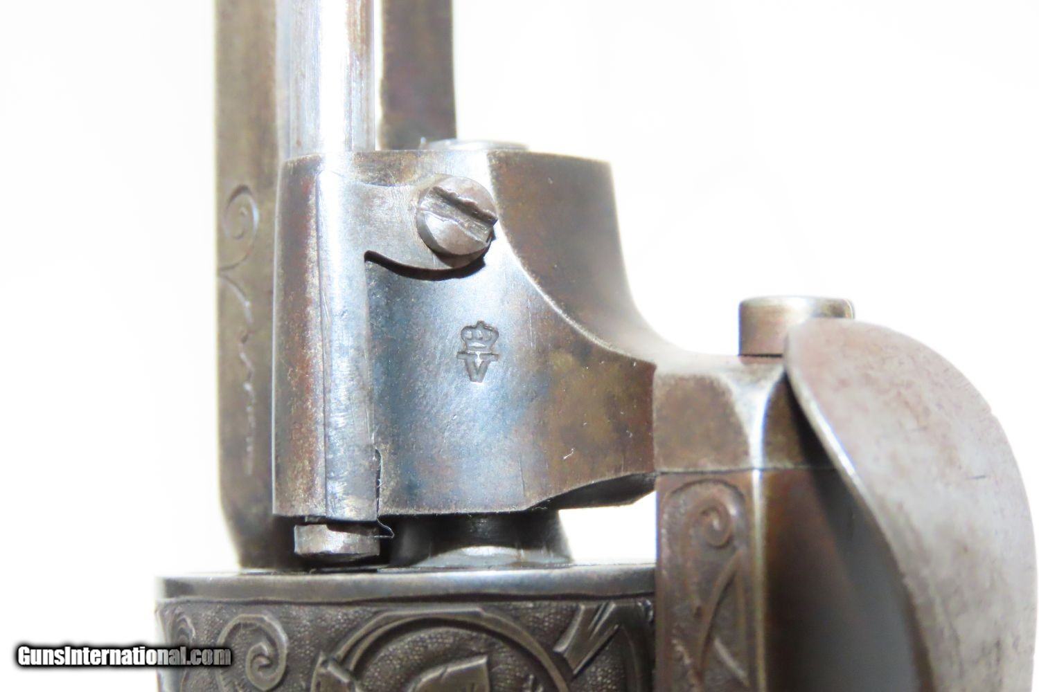 Description: ENGRAVED Antique BELGIAN Proofed 9mm PINFIRE Revolver with PIPE CASE Folding Trigger European Sidearm with ANTIQUE IVORY GRIPS! Here we present an antique Engraved, Ivory Gripped Liege proofed Belgian Pinfire Revolver in a Pipe Type Case, made in Belgium circa 1870. In 1835, notable gun maker and inventor Casimir Lefaucheux patented one of the first self-contained firearms cartridges. This very early design included a case with ball, powder and primer, but what made it different from what was to come later in cartridge development was the “firing pin” that projected out of the side of the case. It was this pin that was struck and detonated the primer inside. His son, Eugene, would build on Casimir’s invention, designing a pistol to take advantage of it. The hammer would be flat and smash down on the side of the cylinder, from which the pin of the cartridge would project. This revolver and pistol design would become prolific, especially in Europe throughout the 19th Century, being adopted by militaries, used by civilians and police, and even being sold for use during the American Civil War. Many makers made both licensed and unlicensed copies. This one features deep relief engraving, blue finish, and ivory grips. It comes inside a fitted pipe case with a purple lining. The case is a bit delicate but whole. The overall condition is fine. Nice blue finish. The action is strong all the way around. The bore is semi-bright in very good shape. All markings are clear and legible with the engravings remaining sharp and defined! The ivory grips are seated firmly with minimal handling wear! Here is a pristine piece of history for display in the collection! Own the original! This is a legitimate antique and not a reproduction. Barrel is 4-1/8 inches. Caliber: 9mm Pinfire Overall condition as seen in photos. Very Fast. Very Safe. FREE SHIPPING WORLDWIDE. Delivered directly to your door by express mail! Guaranteed AUTHENTIC & Includes CERTIFICATE OF AUTHENTICITY. ancestryguns $1075 #201239 SOLD Antique: Yes |