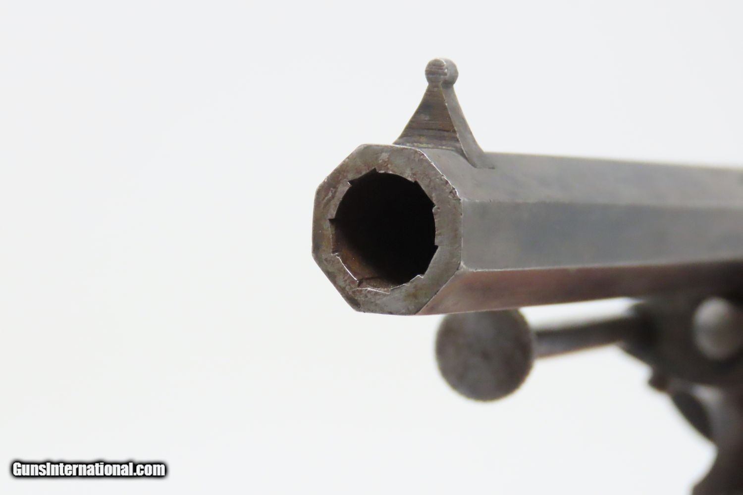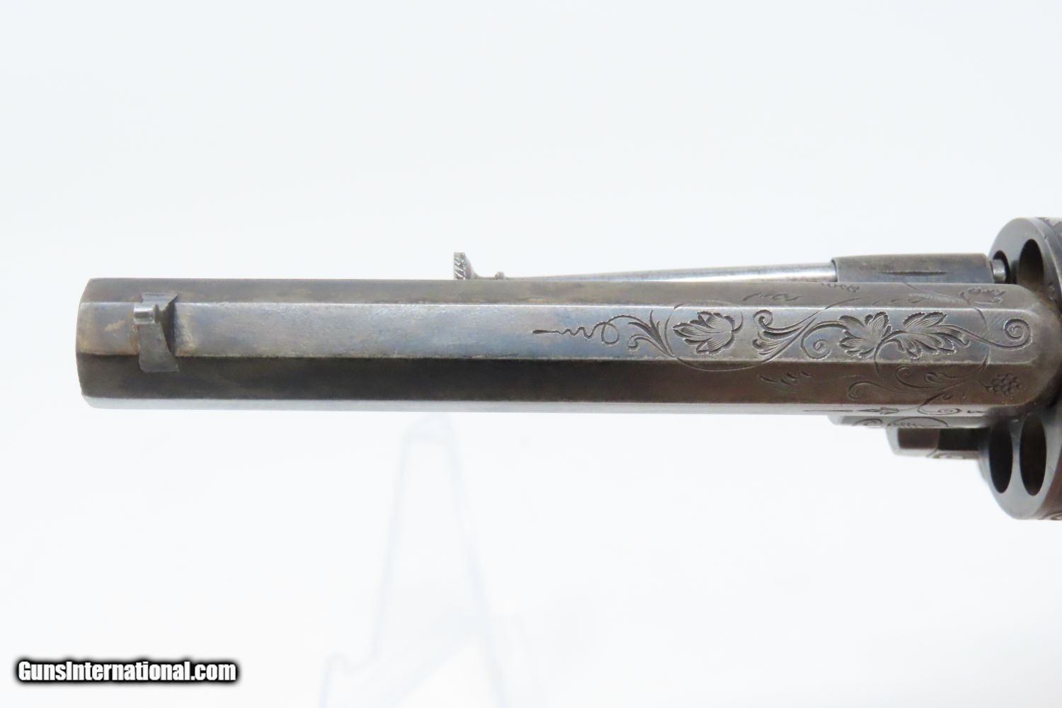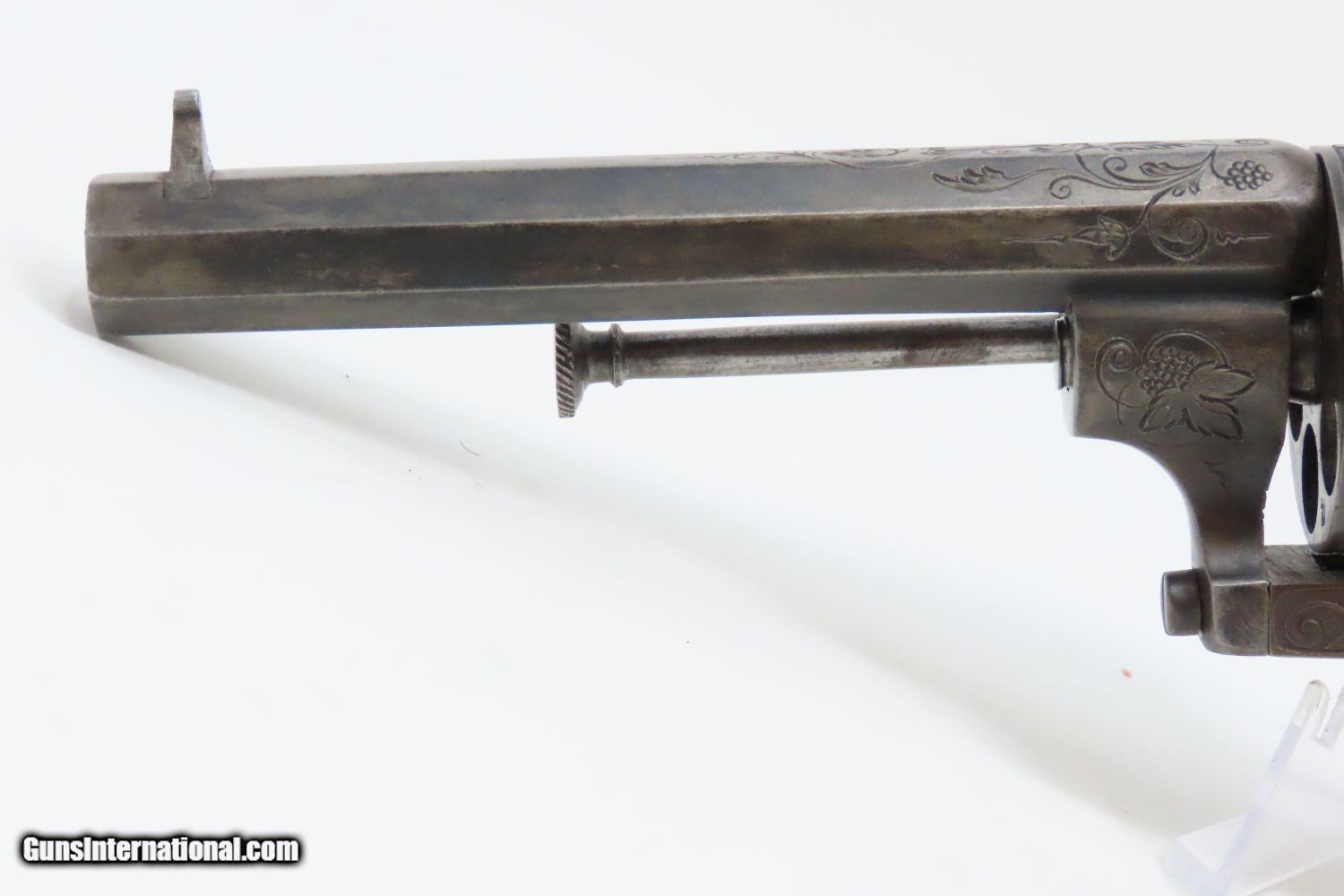 Description: ENGRAVED Antique BELGIAN Proofed 9mm PINFIRE Revolver with PIPE CASE Folding Trigger European Sidearm with ANTIQUE IVORY GRIPS! Here we present an antique Engraved, Ivory Gripped Liege proofed Belgian Pinfire Revolver in a Pipe Type Case, made in Belgium circa 1870. In 1835, notable gun maker and inventor Casimir Lefaucheux patented one of the first self-contained firearms cartridges. This very early design included a case with ball, powder and primer, but what made it different from what was to come later in cartridge development was the “firing pin” that projected out of the side of the case. It was this pin that was struck and detonated the primer inside. His son, Eugene, would build on Casimir’s invention, designing a pistol to take advantage of it. The hammer would be flat and smash down on the side of the cylinder, from which the pin of the cartridge would project. This revolver and pistol design would become prolific, especially in Europe throughout the 19th Century, being adopted by militaries, used by civilians and police, and even being sold for use during the American Civil War. Many makers made both licensed and unlicensed copies. This one features deep relief engraving, blue finish, and ivory grips. It comes inside a fitted pipe case with a purple lining. The case is a bit delicate but whole. The overall condition is fine. Nice blue finish. The action is strong all the way around. The bore is semi-bright in very good shape. All markings are clear and legible with the engravings remaining sharp and defined! The ivory grips are seated firmly with minimal handling wear! Here is a pristine piece of history for display in the collection! Own the original! This is a legitimate antique and not a reproduction. Barrel is 4-1/8 inches. Caliber: 9mm Pinfire Overall condition as seen in photos. Very Fast. Very Safe. FREE SHIPPING WORLDWIDE. Delivered directly to your door by express mail! Guaranteed AUTHENTIC & Includes CERTIFICATE OF AUTHENTICITY. ancestryguns $1075 #201239 SOLD Antique: Yes |