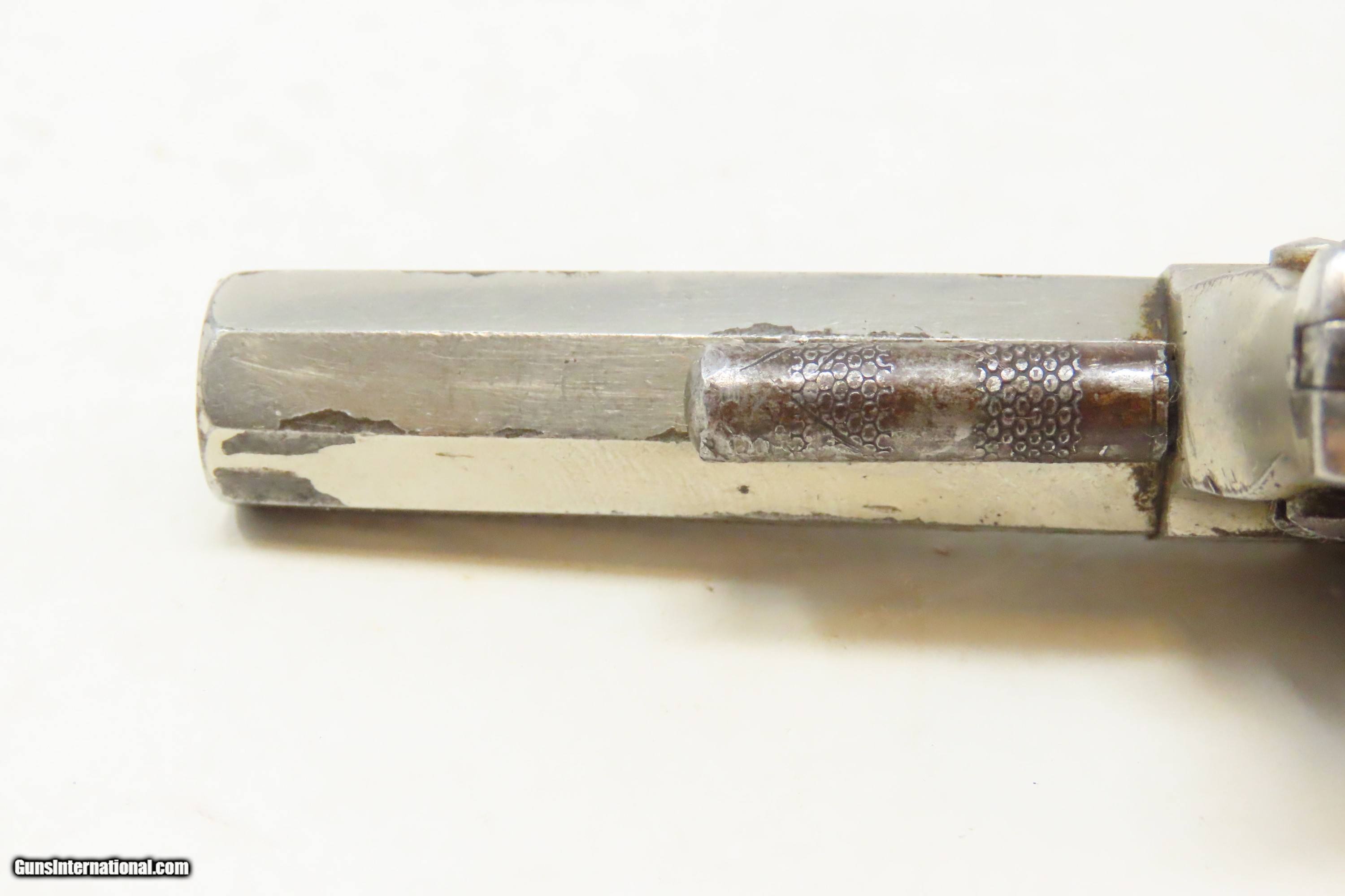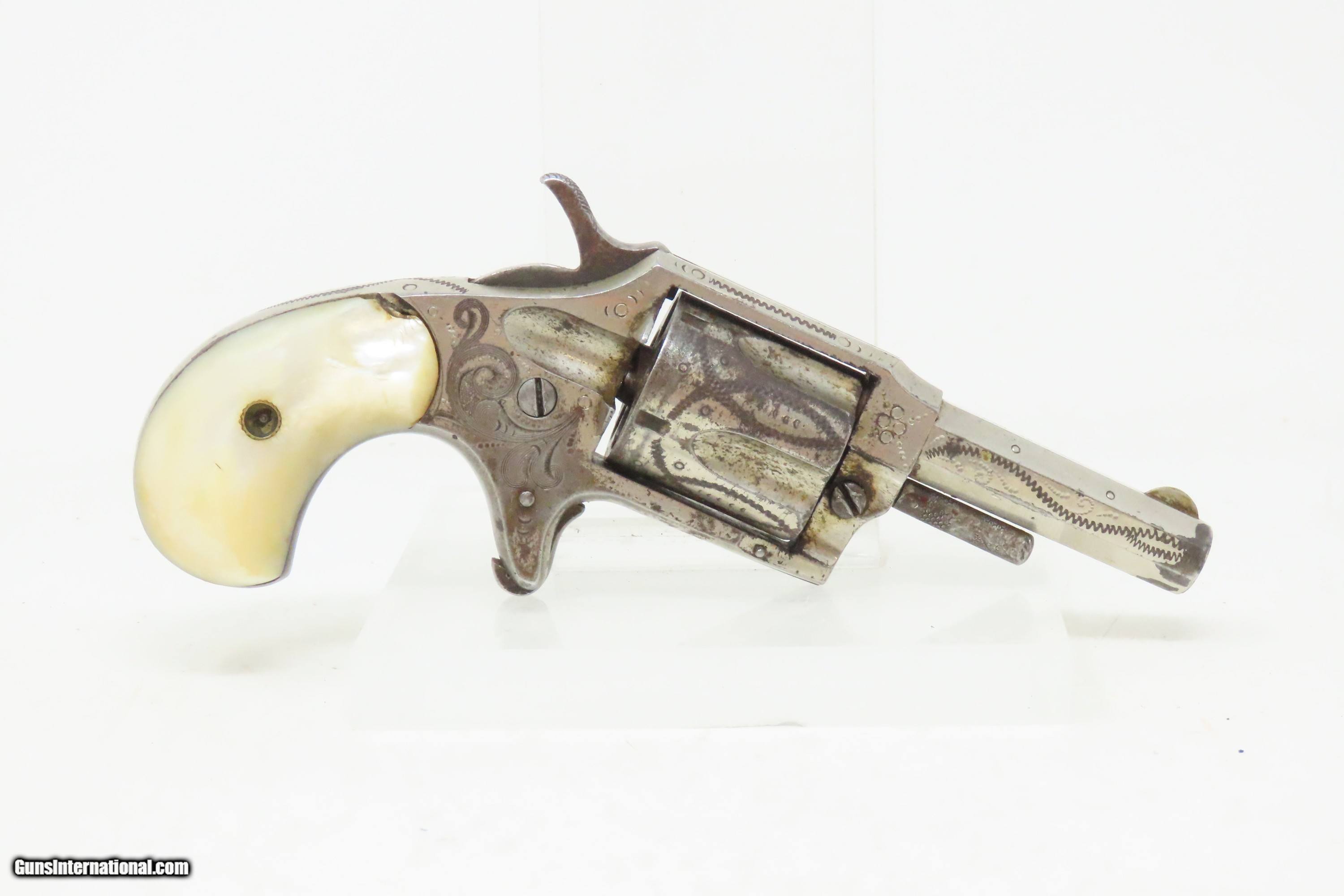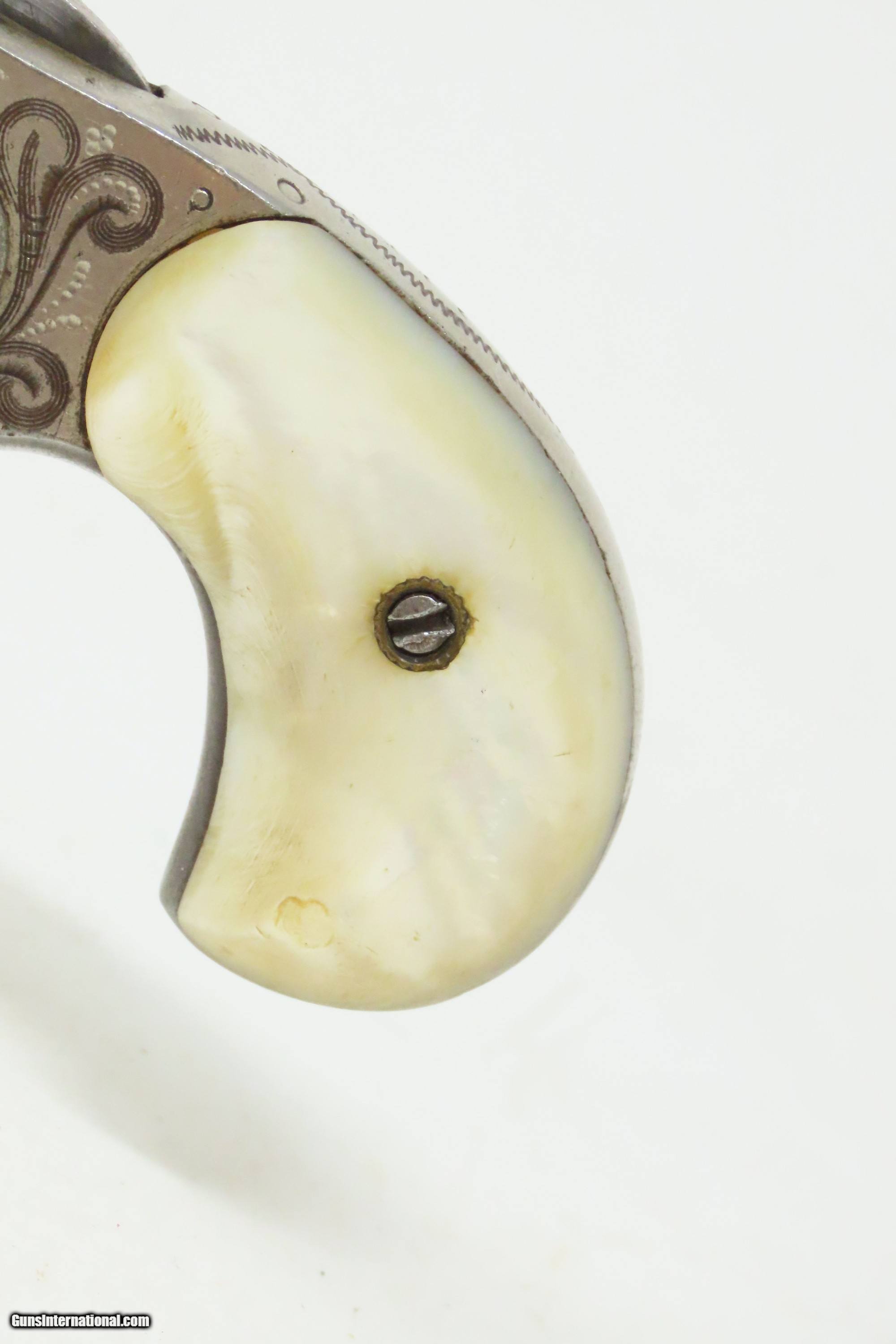 Description: ENGRAVED Antique LEE ARMS COMPANY “RED JACKET” No. 3 Spur Trigger Revolver Wild West Sidearm with PEARL GRIPS! Here we present an antique Lee Arms Co. “Red Jacket No. 3” Spur Trigger Pocket Revolver, made circa 1877 to 1880 in Wilkes-Barr, Pennsylvania. These pocket-sized revolvers and many like them were made by various companies such that the price easily undercut better known and established companies like Colt. As a result, many of Colt’s similar lines were shut down for their inability to compete. During a time when many, if not most people carried a firearm, these affordable little revolves were small enough to conceal and carry, yet provide some level of protection or peace of mind, even when the town did not allow firearms within its limits. Sometimes the name on this revolver causes confusion. "Red Jacket" was a brand name used by both the Lee Arms Company of Wilkes-Barre, PA and Hopkins & Allen. But this little .32 rimfire is marked as a Red Jacket No. 3, a designation used only by the Lee Arms Company from 1877 to 1880. The overall condition is good. Original nickel finish. Good bore for its age. The action does not function. Both pearl grips are in good shape with a small chip missing from the right side. Legible markings. The cylinder pin can be removed without pressing the release. This is a legitimate antique and not a reproduction. Barrel is 2-1/4 inches. Caliber: .32 Rimfire Overall condition as seen in photos. Very Fast. Very Safe. FREE SHIPPING WORLDWIDE. Delivered directly to your door by express mail! Guaranteed AUTHENTIC & Includes CERTIFICATE OF AUTHENTICITY. ancestryguns $1000 #240817 SOLD Antique: Yes |