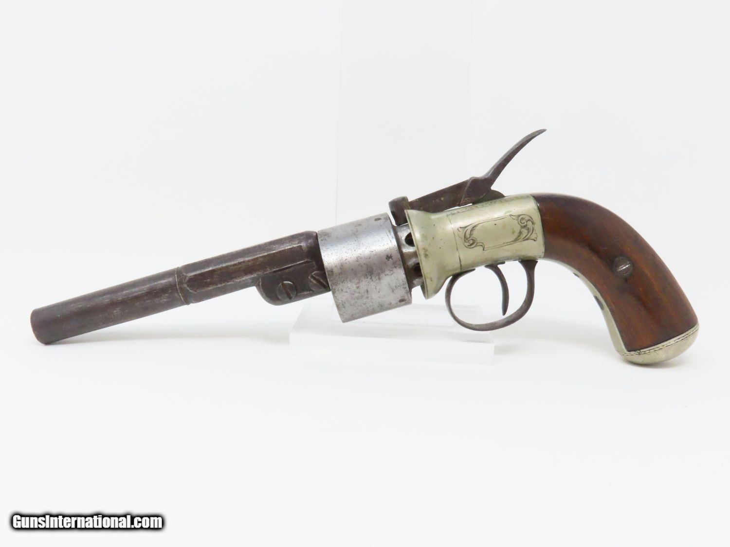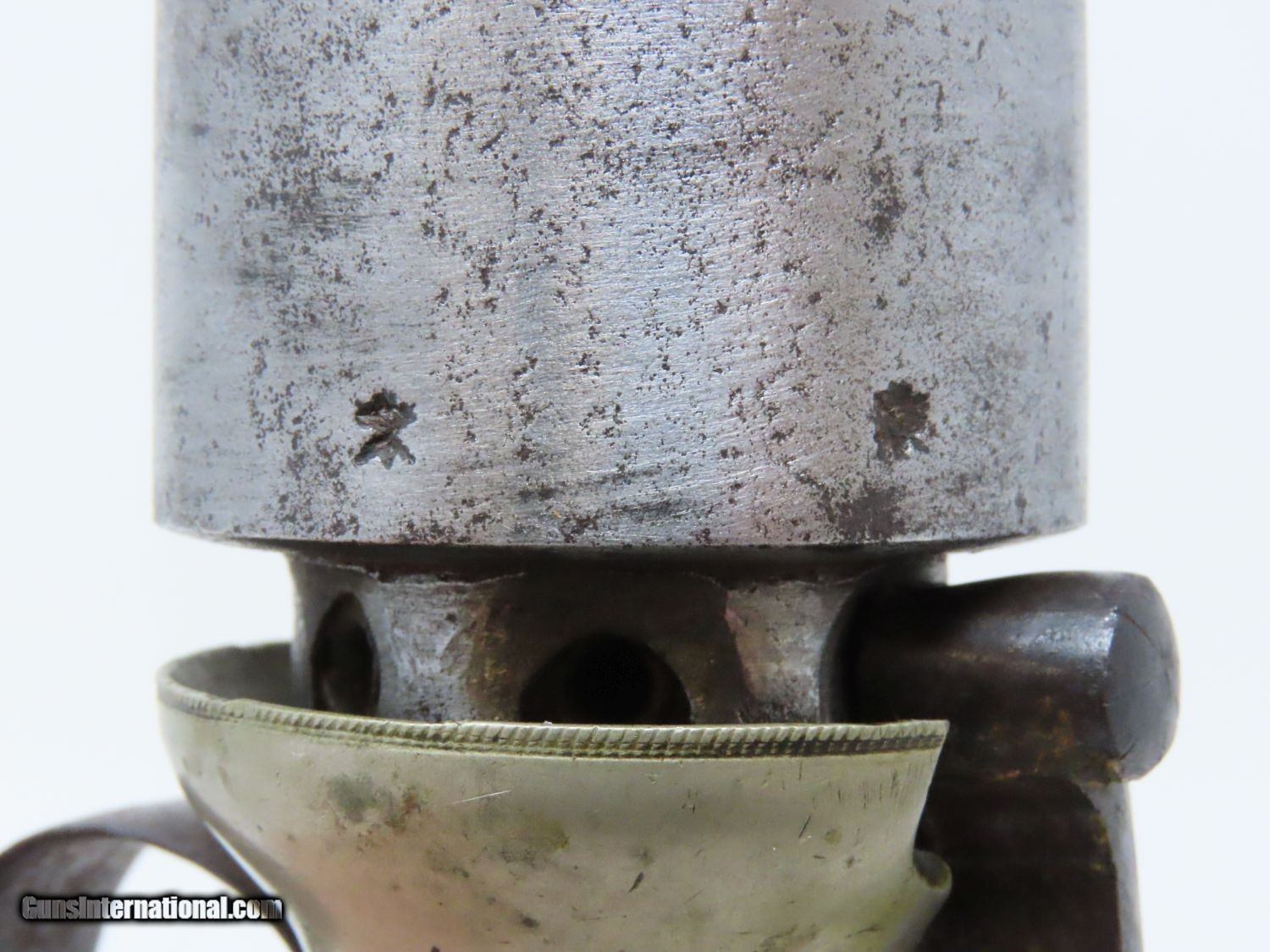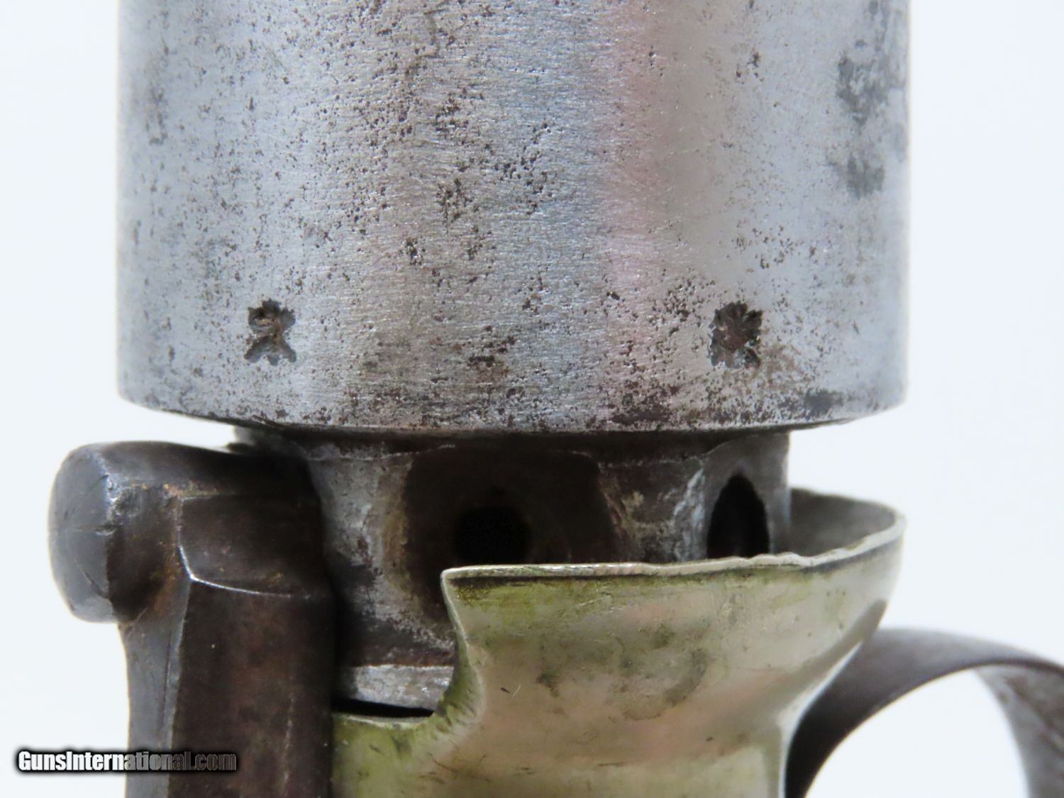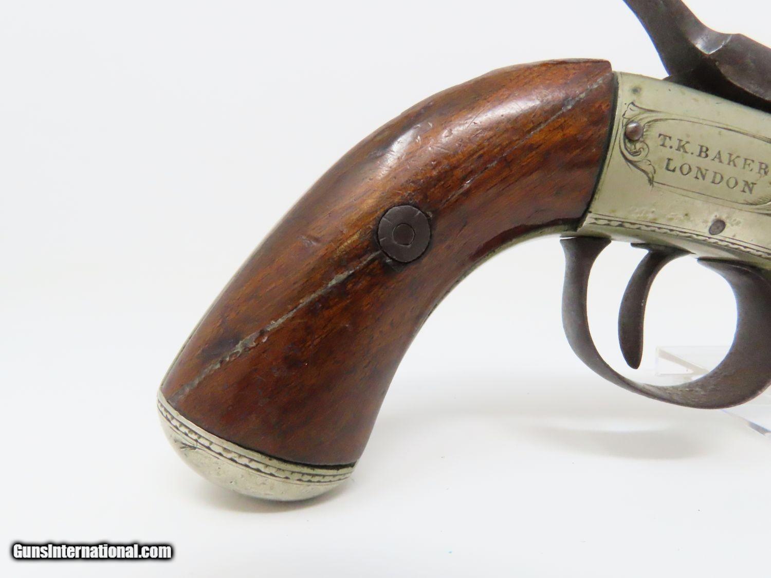 Description: ENGRAVED British Antique T.K. BAKER Transitional Caliber .44 Revolver The Link between Pepperboxes and Revolvers Here we present an antique T.K. Baker of London, England made circa the mid-1850s. This revolver was patented by Thomas Kerslake Baker. He was awarded British Registered Design No. 3230 on April 24, 1852, for his long spur hammer. The back strap has the serial number ("No. 1389.") marked in a foliate panel. The nipple shield has a fine knurled forward edge. Fitted with two-piece fine walnut grips. The frame is of German silver and nicely engraved. This revolver is considered a “transitional” revolver, transitioning from the Pepperbox design (a barrel cluster in which each chamber has its own barrel) to what we would consider a more conventional Revolver with a single barrel and a cylinder with individual chambers rather than a barrel cluster. You can see the resemblance to the pepperbox with the cane-like grip and the long and relatively flat hammer that operates from the top rather than the rear, as well as the cylinder, which simply appears as a shortened barrel cluster. This example is marked "T.K. BAKER/LONDON" in a foliate panel on the right side. Additional scrollwork is found on the buttcap and lower section of the back strap. The top of the frame reads “REGISTERED/APRIL 24, 1852” under the hammer. Birmingham proofs are located on the cylinder and barrel. The overall condition is fair. The action (hammer/trigger) is strong, though the cylinder does not index properly. There are no remaining nipples in the cylinder. The bore is dark and dusty with age. The right grip has been repaired as you can see. A fascinating steppingstone in firearms design! Own the original! This is a legitimate antique and not a reproduction. Barrel is 5 inches. Caliber: .44 Percussion Overall condition as seen in photos. Very Fast. Very Safe. FREE SHIPPING WORLDWIDE. Delivered directly to your door by express mail! Guaranteed AUTHENTIC & Includes CERTIFICATE OF AUTHENTICITY. ancestryguns $900 #20316 SOLD Antique: Yes |