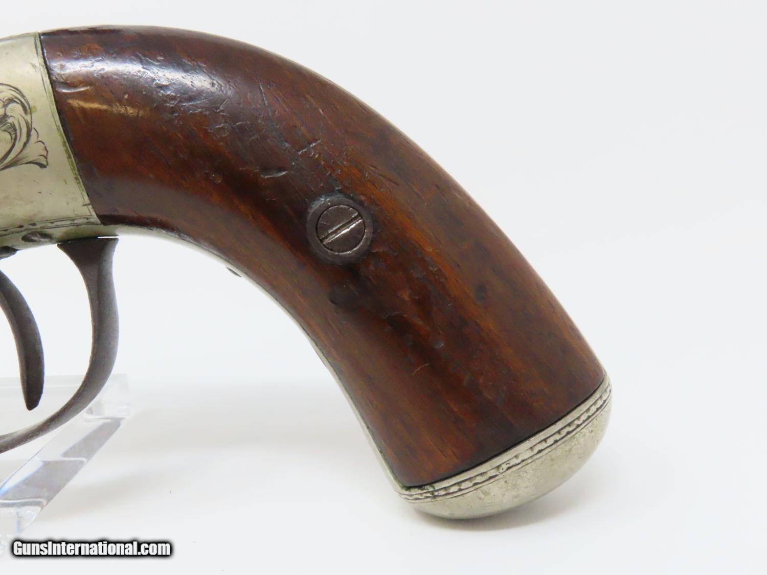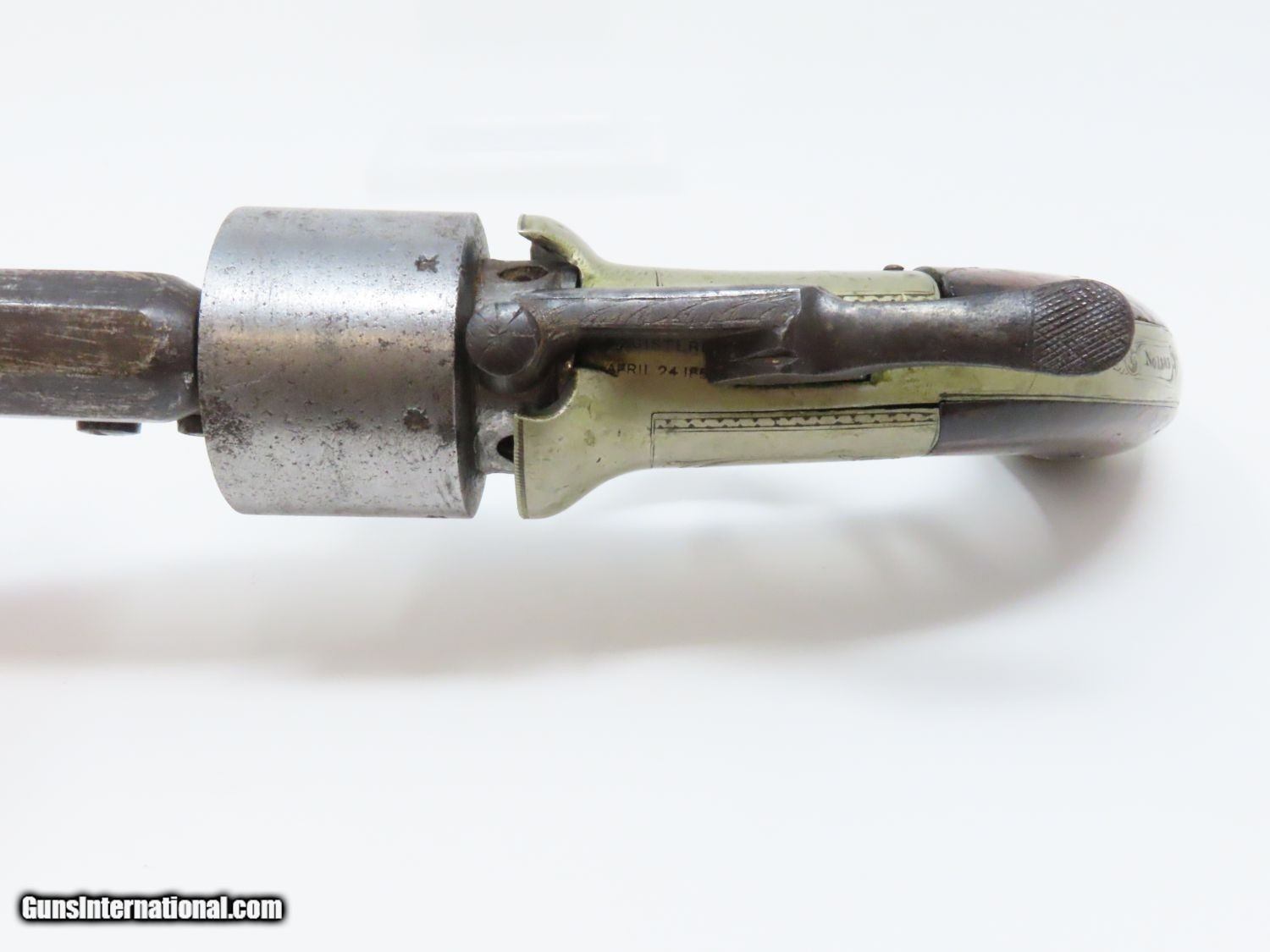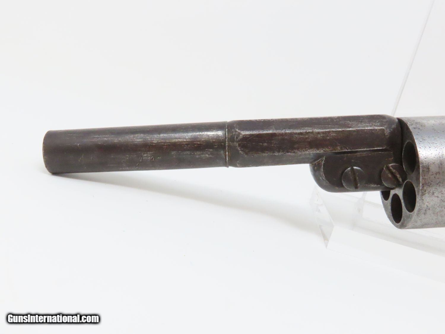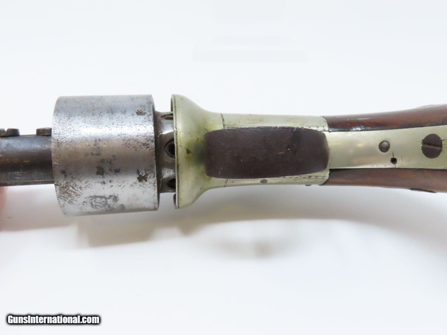 Description: ENGRAVED British Antique T.K. BAKER Transitional Caliber .44 Revolver The Link between Pepperboxes and Revolvers Here we present an antique T.K. Baker of London, England made circa the mid-1850s. This revolver was patented by Thomas Kerslake Baker. He was awarded British Registered Design No. 3230 on April 24, 1852, for his long spur hammer. The back strap has the serial number ("No. 1389.") marked in a foliate panel. The nipple shield has a fine knurled forward edge. Fitted with two-piece fine walnut grips. The frame is of German silver and nicely engraved. This revolver is considered a “transitional” revolver, transitioning from the Pepperbox design (a barrel cluster in which each chamber has its own barrel) to what we would consider a more conventional Revolver with a single barrel and a cylinder with individual chambers rather than a barrel cluster. You can see the resemblance to the pepperbox with the cane-like grip and the long and relatively flat hammer that operates from the top rather than the rear, as well as the cylinder, which simply appears as a shortened barrel cluster. This example is marked "T.K. BAKER/LONDON" in a foliate panel on the right side. Additional scrollwork is found on the buttcap and lower section of the back strap. The top of the frame reads “REGISTERED/APRIL 24, 1852” under the hammer. Birmingham proofs are located on the cylinder and barrel. The overall condition is fair. The action (hammer/trigger) is strong, though the cylinder does not index properly. There are no remaining nipples in the cylinder. The bore is dark and dusty with age. The right grip has been repaired as you can see. A fascinating steppingstone in firearms design! Own the original! This is a legitimate antique and not a reproduction. Barrel is 5 inches. Caliber: .44 Percussion Overall condition as seen in photos. Very Fast. Very Safe. FREE SHIPPING WORLDWIDE. Delivered directly to your door by express mail! Guaranteed AUTHENTIC & Includes CERTIFICATE OF AUTHENTICITY. ancestryguns $900 #20316 SOLD Antique: Yes |