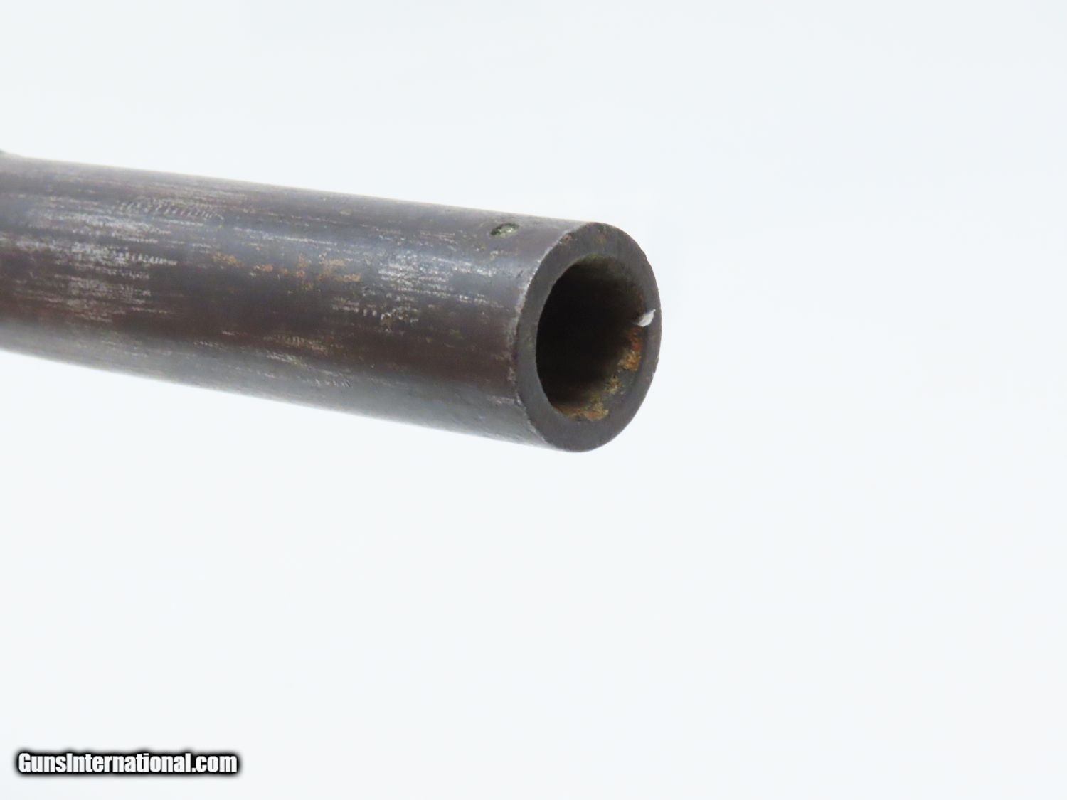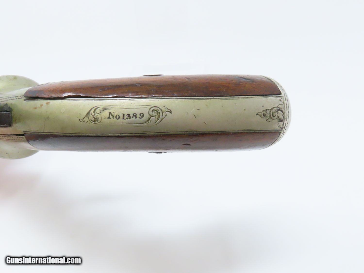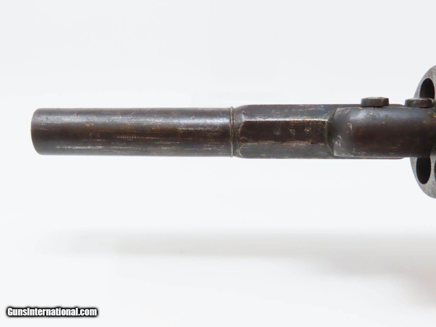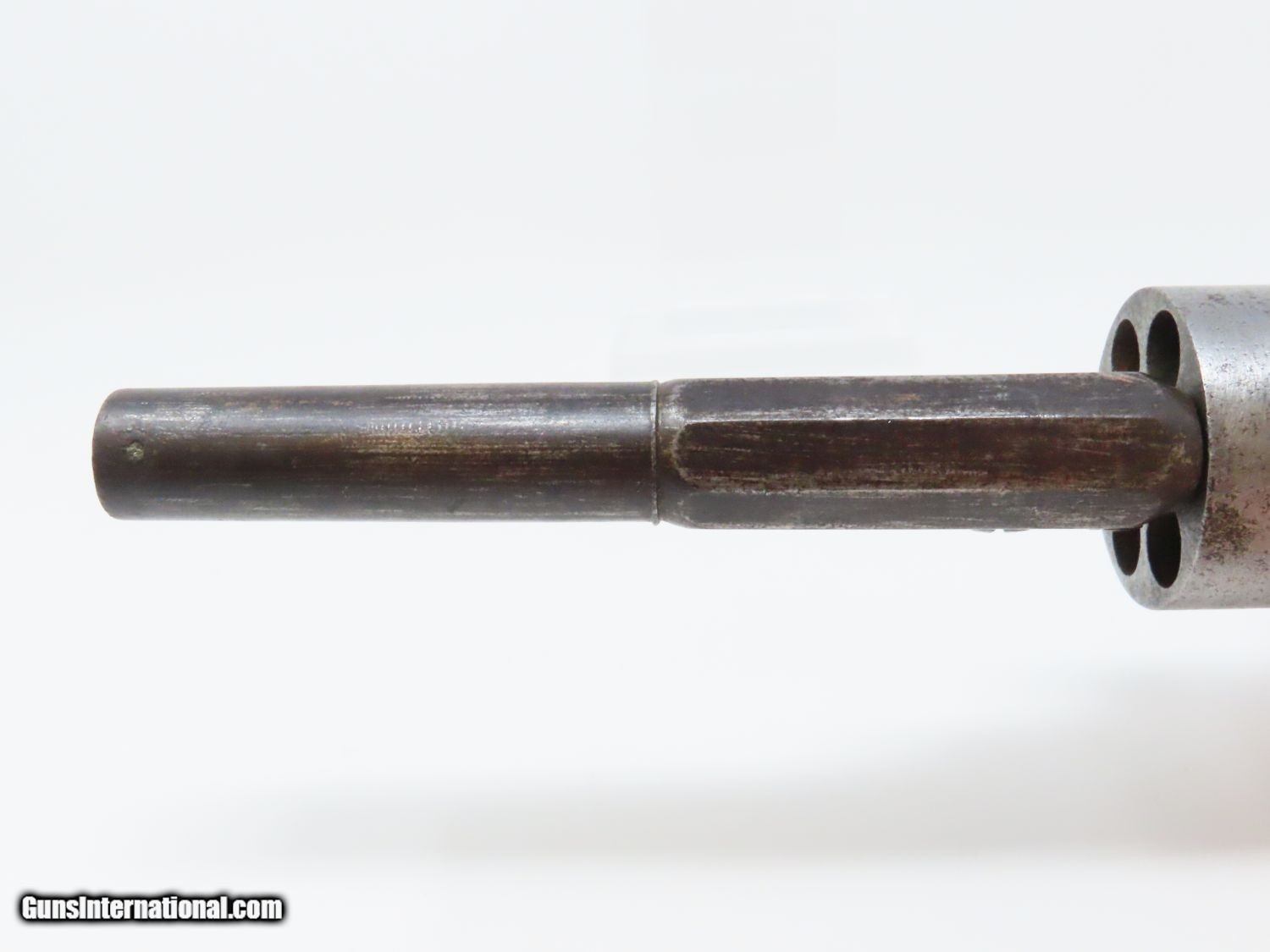 Description: ENGRAVED British Antique T.K. BAKER Transitional Caliber .44 Revolver The Link between Pepperboxes and Revolvers Here we present an antique T.K. Baker of London, England made circa the mid-1850s. This revolver was patented by Thomas Kerslake Baker. He was awarded British Registered Design No. 3230 on April 24, 1852, for his long spur hammer. The back strap has the serial number ("No. 1389.") marked in a foliate panel. The nipple shield has a fine knurled forward edge. Fitted with two-piece fine walnut grips. The frame is of German silver and nicely engraved. This revolver is considered a “transitional” revolver, transitioning from the Pepperbox design (a barrel cluster in which each chamber has its own barrel) to what we would consider a more conventional Revolver with a single barrel and a cylinder with individual chambers rather than a barrel cluster. You can see the resemblance to the pepperbox with the cane-like grip and the long and relatively flat hammer that operates from the top rather than the rear, as well as the cylinder, which simply appears as a shortened barrel cluster. This example is marked "T.K. BAKER/LONDON" in a foliate panel on the right side. Additional scrollwork is found on the buttcap and lower section of the back strap. The top of the frame reads “REGISTERED/APRIL 24, 1852” under the hammer. Birmingham proofs are located on the cylinder and barrel. The overall condition is fair. The action (hammer/trigger) is strong, though the cylinder does not index properly. There are no remaining nipples in the cylinder. The bore is dark and dusty with age. The right grip has been repaired as you can see. A fascinating steppingstone in firearms design! Own the original! This is a legitimate antique and not a reproduction. Barrel is 5 inches. Caliber: .44 Percussion Overall condition as seen in photos. Very Fast. Very Safe. FREE SHIPPING WORLDWIDE. Delivered directly to your door by express mail! Guaranteed AUTHENTIC & Includes CERTIFICATE OF AUTHENTICITY. ancestryguns $900 #20316 SOLD Antique: Yes |