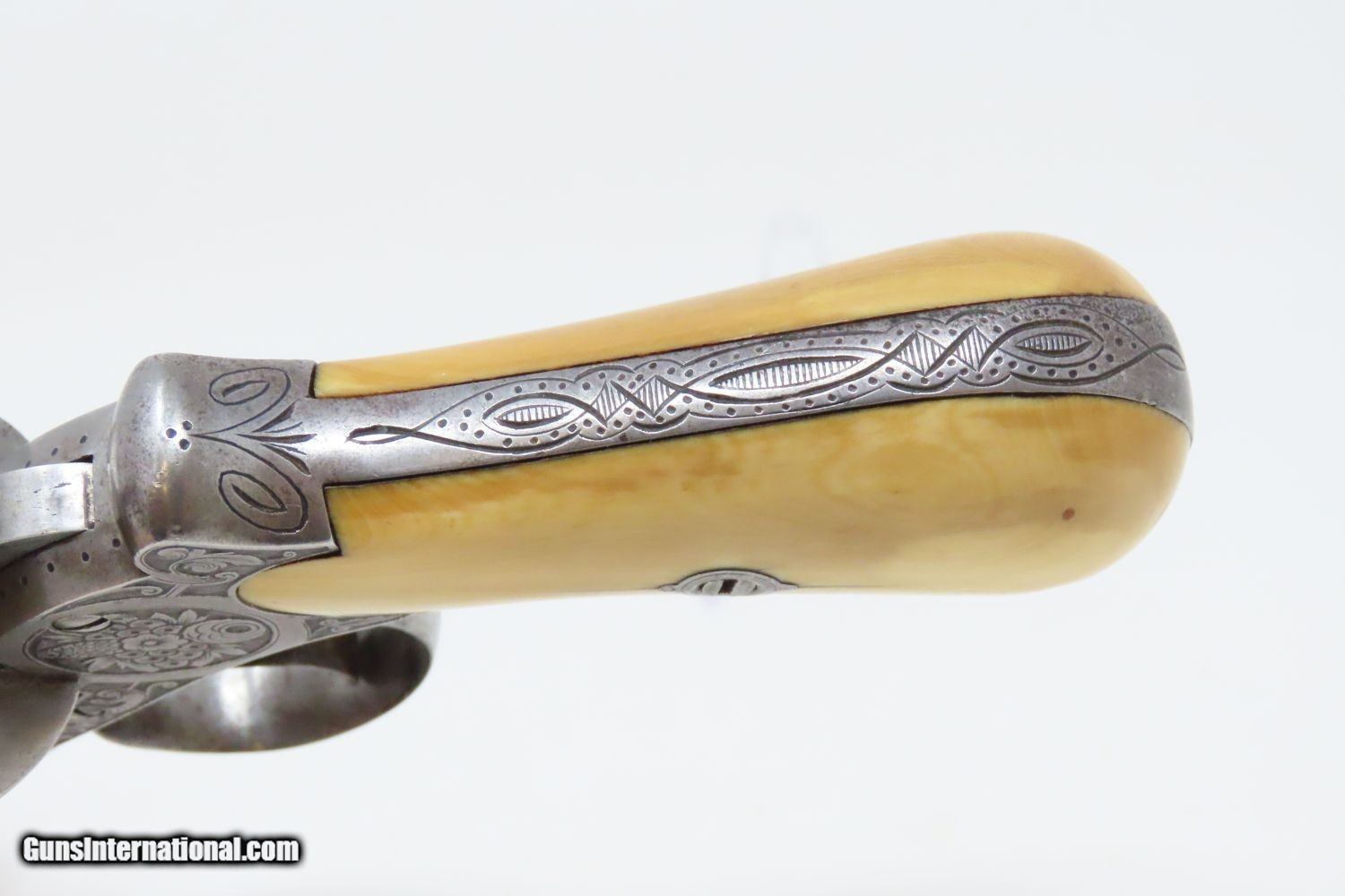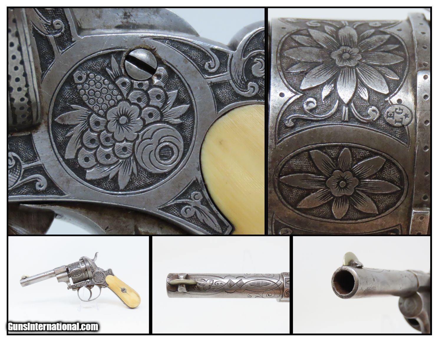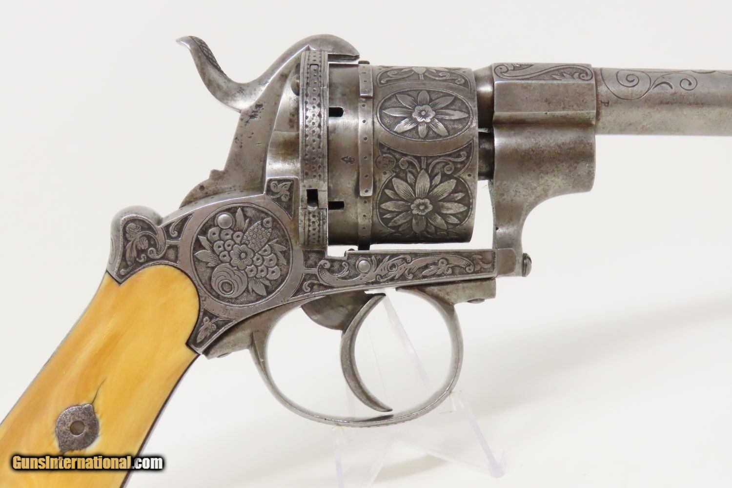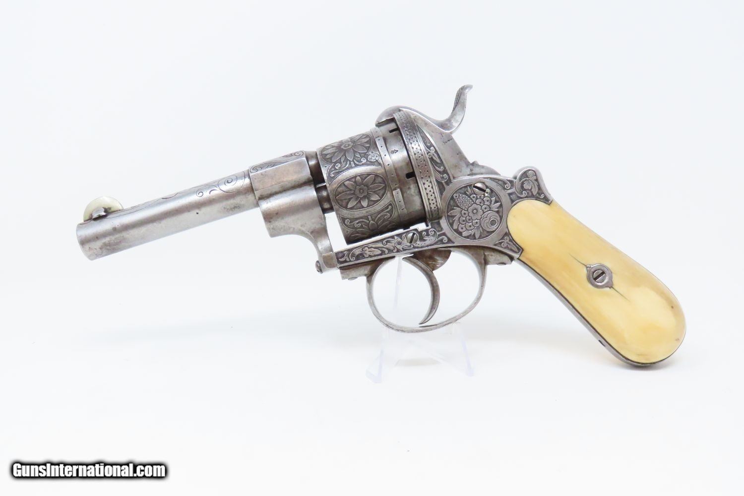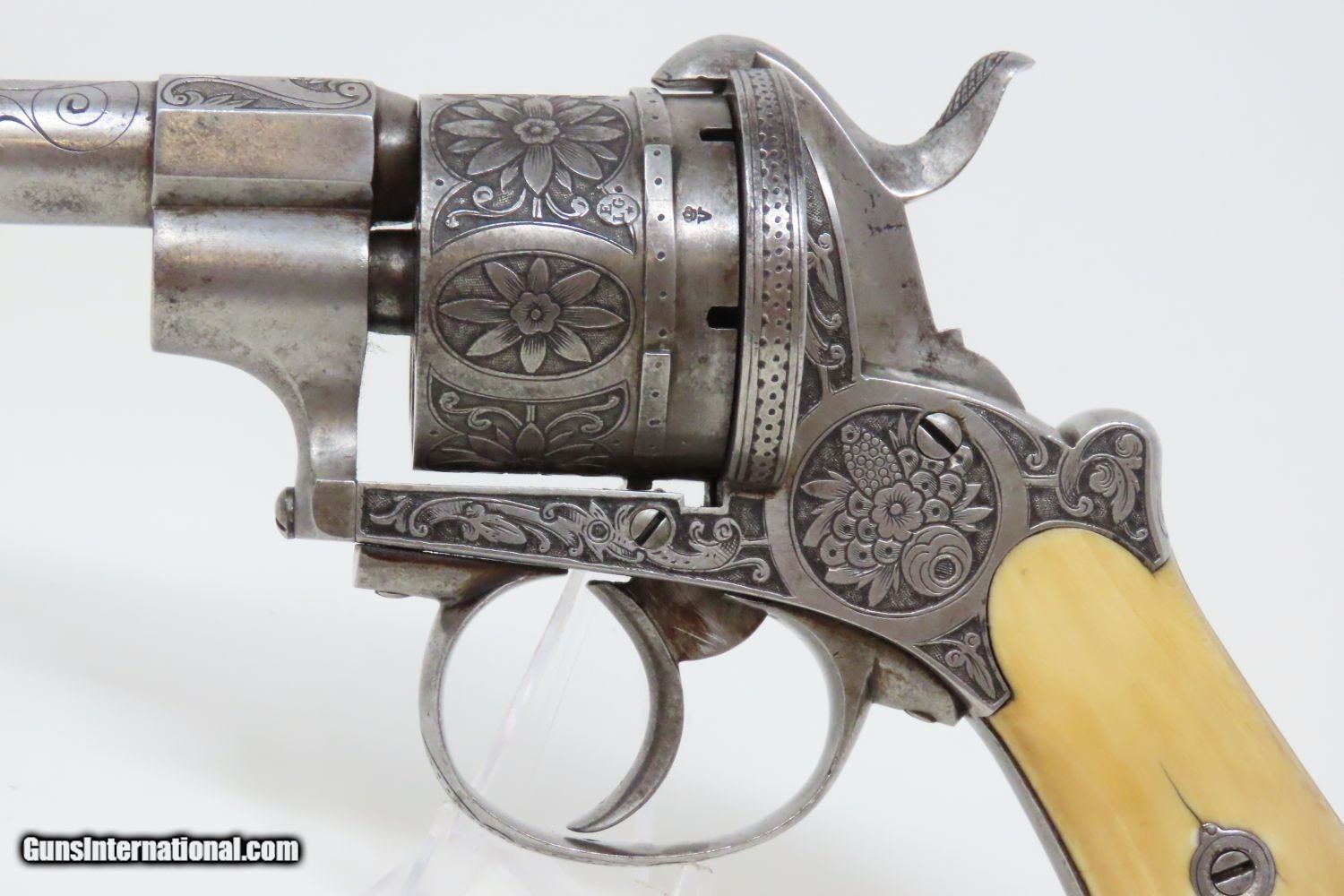 ENGRAVED, IVORY GRIPPED European Antique PINFIRE REVOLVER Double Action Liege Proofed Mid-19th European Sidearm
