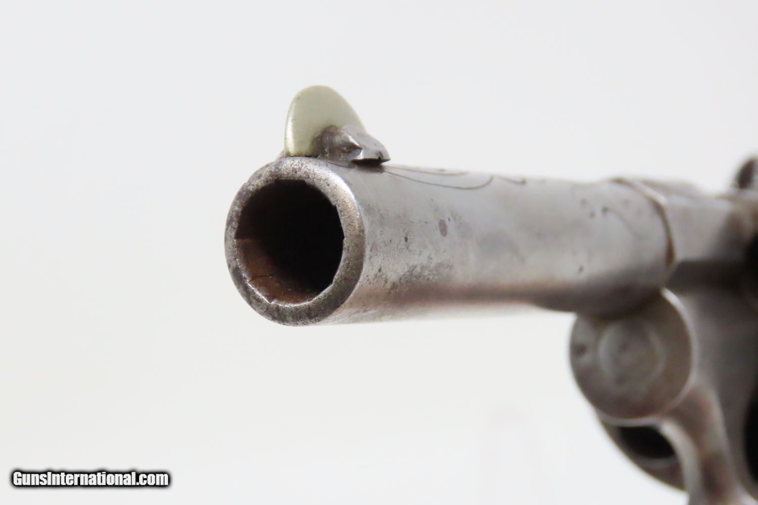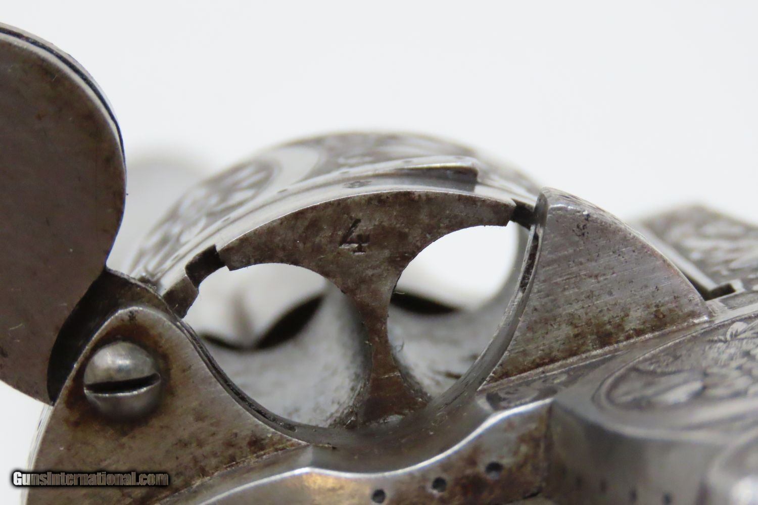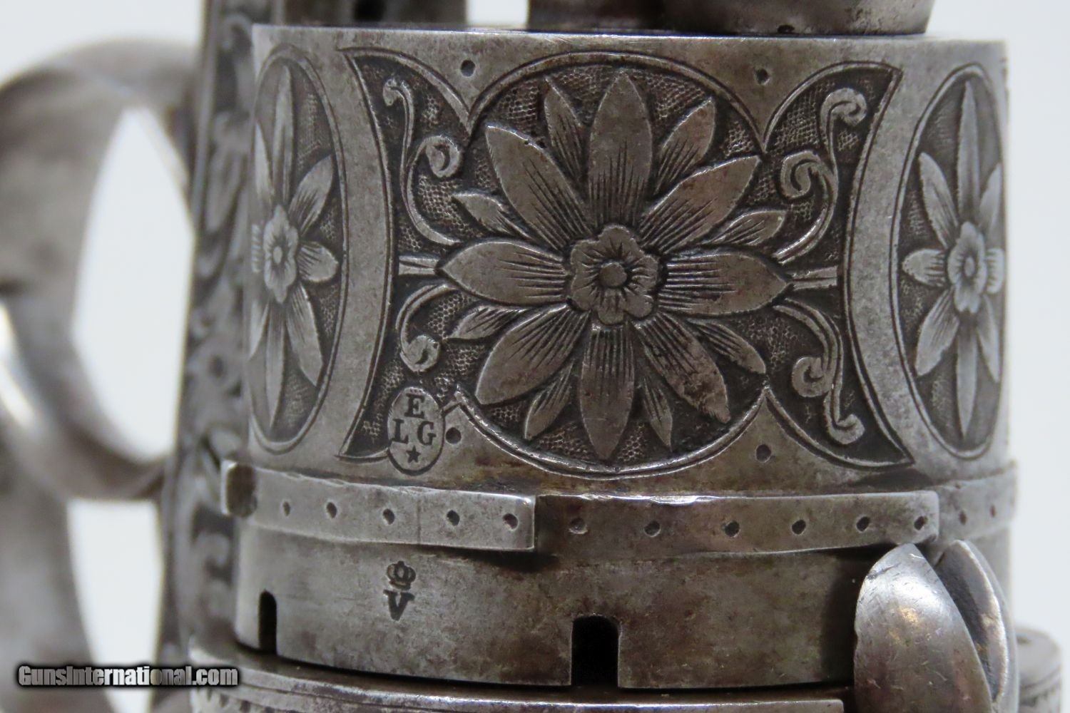 Description: ENGRAVED, IVORY GRIPPED European Antique PINFIRE REVOLVER Double Action Liege Proofed Mid-19th European Sidearm Here we present an antique Belgian Pinfire Double Action Revolver, made circa 1850. In 1830, notable gun maker and inventor Casimir Lefaucheux invented the pinfire cartridge and patented it in 1835 to become one of the first self-contained firearms cartridges. This very early design included a case with ball, powder and primer, but what made it different from what was to come later in cartridge development was the “firing pin” that projected out of the side of the case. It was this pin that was struck and detonated the primer inside. His son, Eugene, would build on Casimir’s invention, designing a pistol to take advantage of it. The hammer would be flat and smash down on the side of the cylinder, from which the pin of the cartridge would project. This revolver and pistol design would become prolific, especially in Europe throughout the 19th Century, being adopted by militaries, used by civilians and police, and even being sold for use during the American Civil War. Many makers made both licensed and unlicensed copies. This one features very nice, deep-set floral engraving throughout. The grips are of ivory. There is a large half-moon front sight that probably replaced a much smaller bead or post. The overall condition is very good. The action is strong all the way around. The bore is in good shape. All markings are clear and sharp. The floral engravings are elaborate and defined. Both grips remain in fine shape and are seated firmly. A gorgeous piece of European history! Own the original! This is a legitimate antique and not a reproduction. Barrel is 4 inches. Caliber: 11mm Pinfire Overall condition as seen in photos. Very Fast. Very Safe. FREE SHIPPING WORLDWIDE. Delivered directly to your door by express mail! Guaranteed AUTHENTIC & Includes CERTIFICATE OF AUTHENTICITY. ancestryguns $985 #201050 SOLD Antique: Yes |