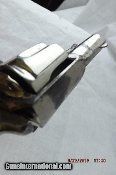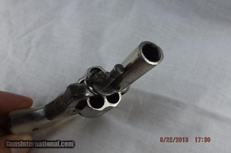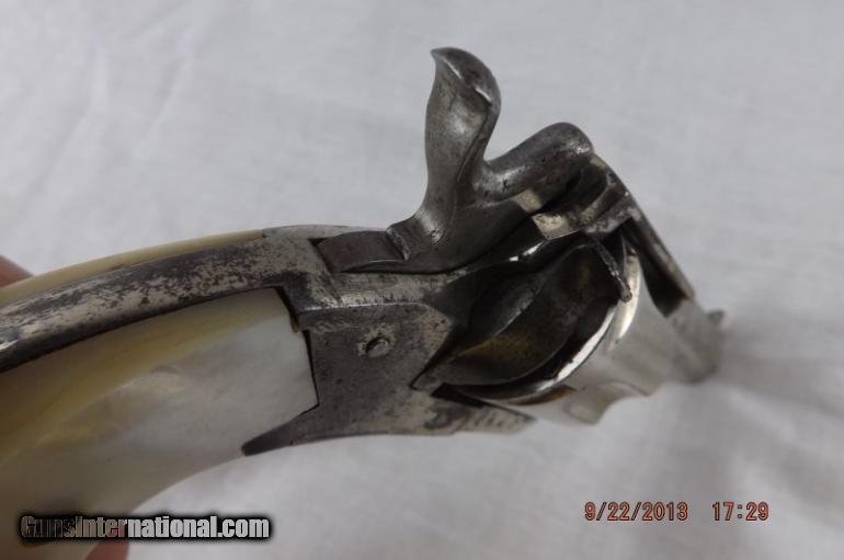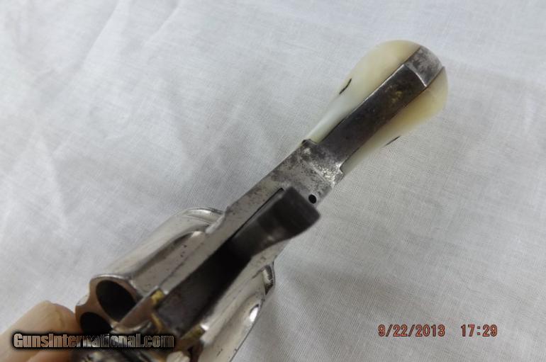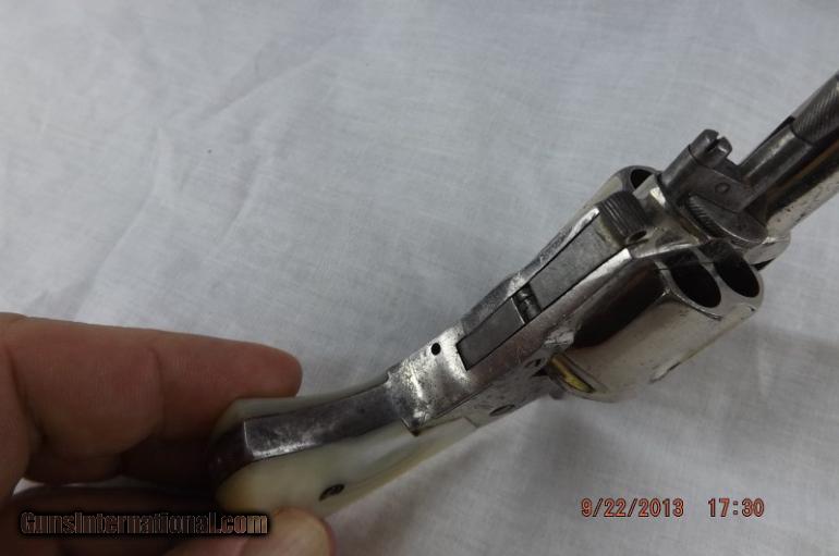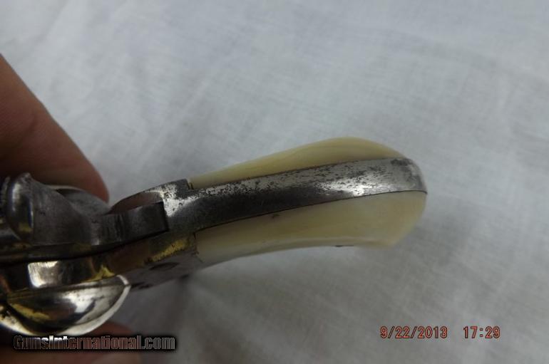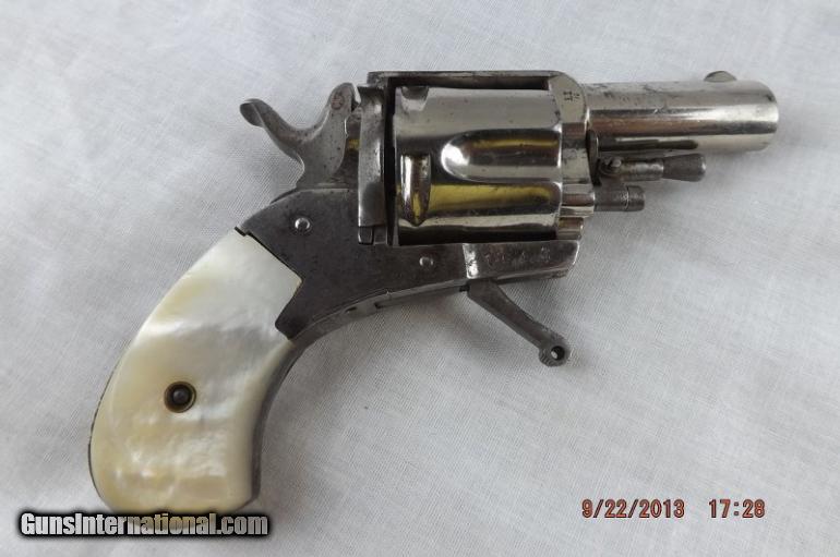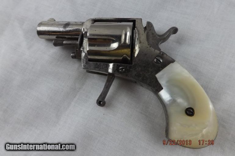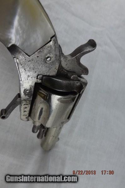 Unknown maker european folding trigger revolver. Very nice pearl grips. Nickel is over 90%