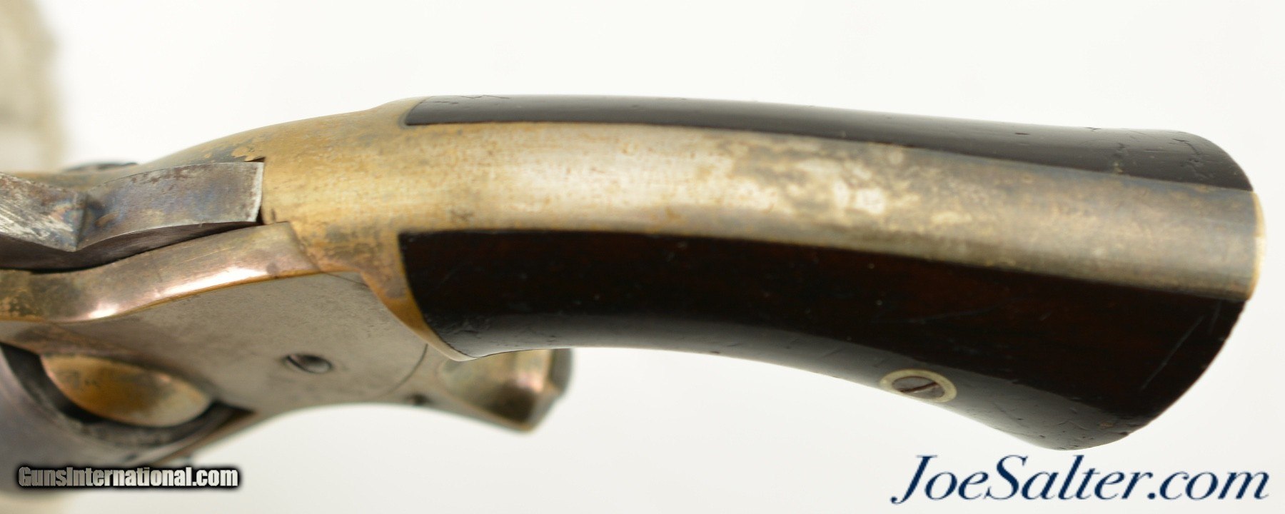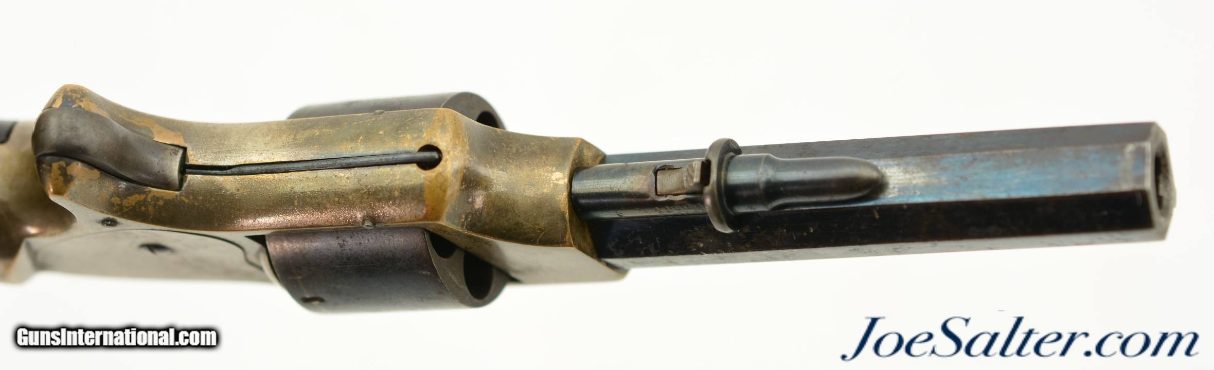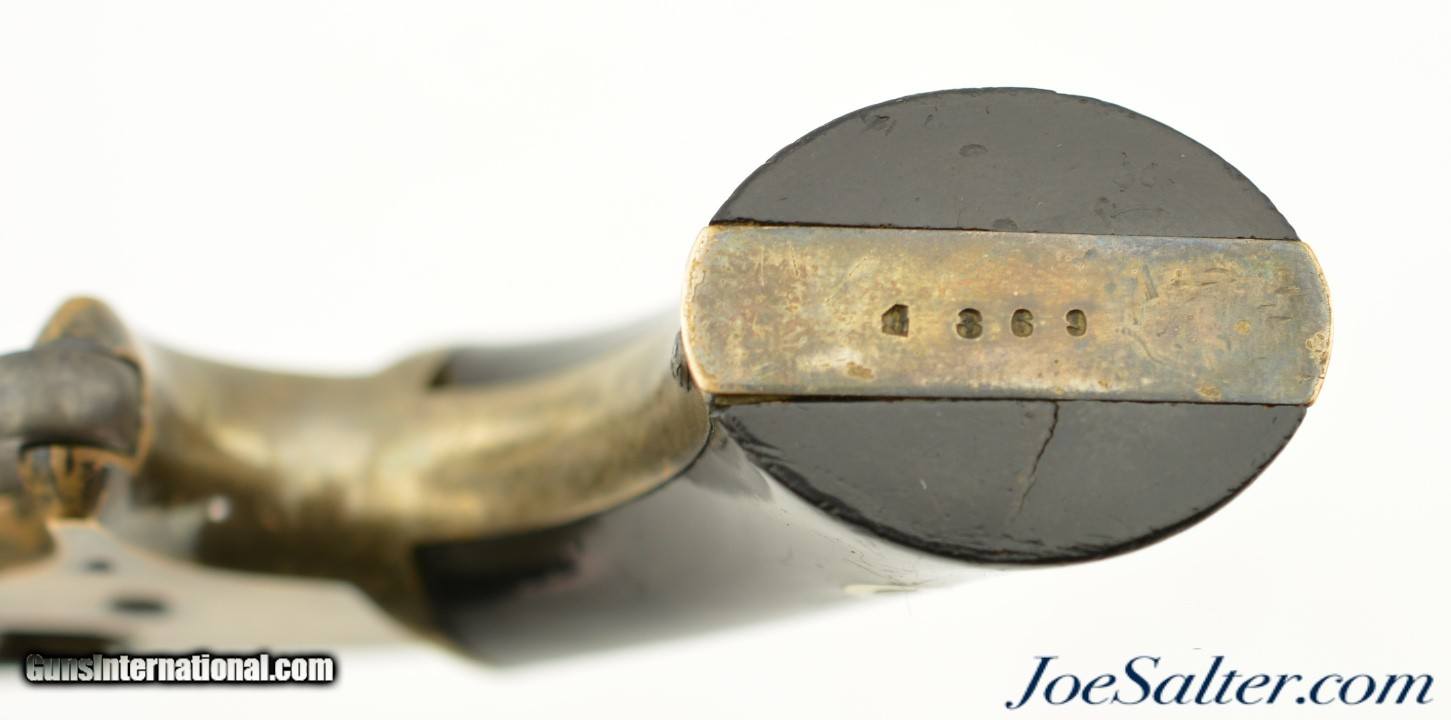Description: Serial #4369, .30 RF, 3 1/8" octagon barrel with a fine, bright bore. This is a seldom seen, solid frame pocket revolver that was manufactured by The Springfield Arms Company in defiance of the Rollin White patent prior to the eventual halt of production circa 1863. The barrel and cylinder pin retain about 75% plus of their original bright nitre blue with the balance having mottled freckling throughout. This carries over to the cylinder which still has visible bright, original blue within a mostly plum-brown patina. The brass frame (which has a remarkably fragile, and intact original loading gate assembly) has about 70-75% of the original silver finish remaining with the balance having turned to a dull ochre patina. The rosewood grips are in very good shape with some small handling marks and flaking of the original piano varnish finish along the butt flare. The cylinder lock-up is still tight and the mechanism is fully functional. These were very well-made little revolvers that are not often encountered today (even though a surprisingly high total of about 6,000 are estimated to have been made), and certainly not with this much original blue remaining. This example is in fine condition and would make a nice addition to any collection. Antique Antique: Yes Price: $1,295.00 Contact Seller |