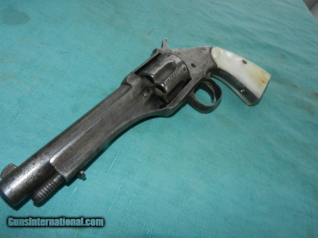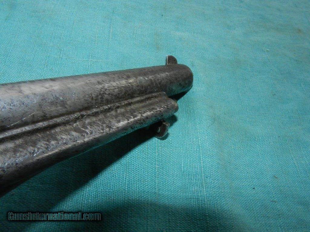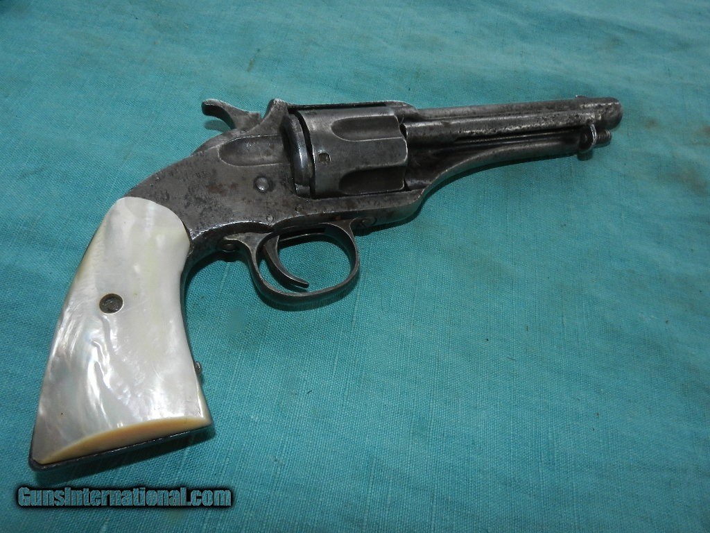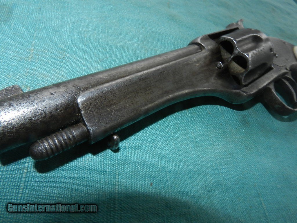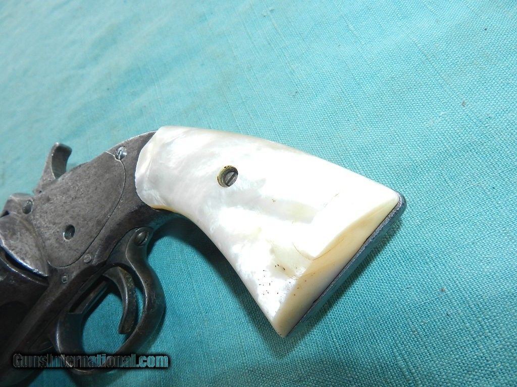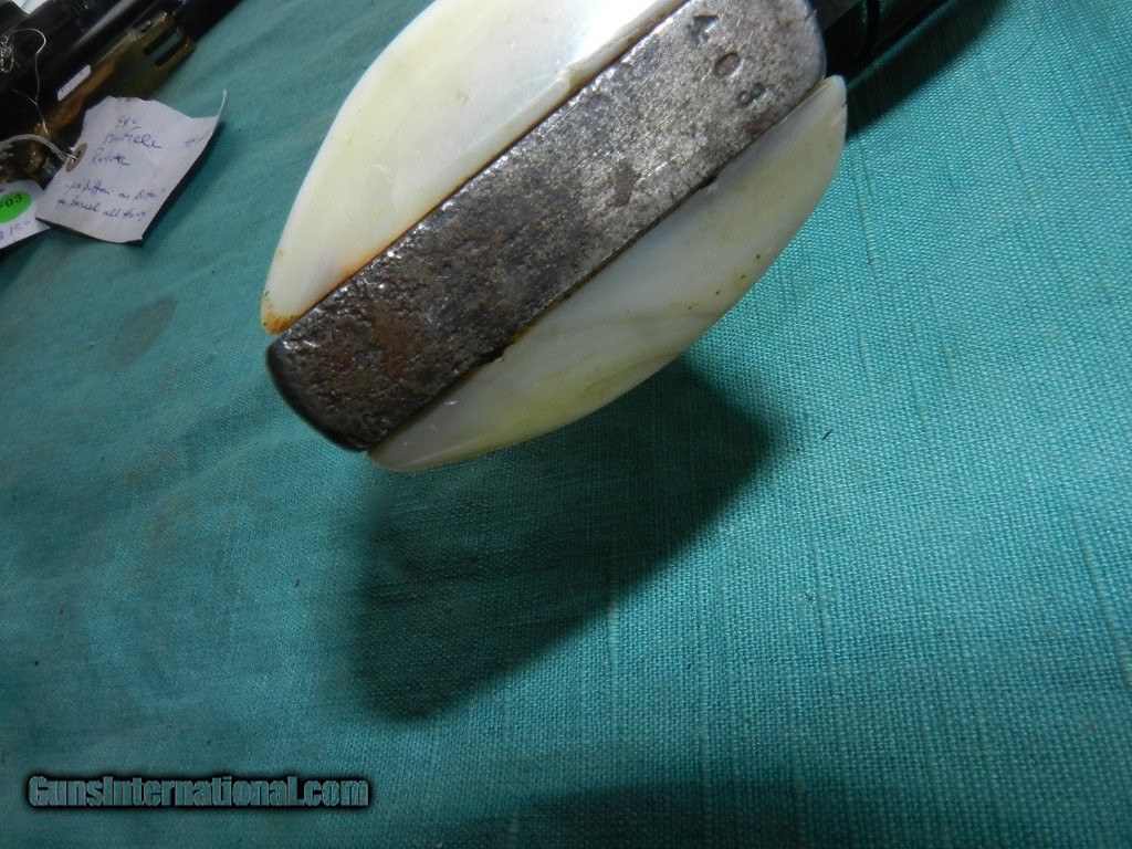 Description: <<<SOLD> >>>.A very Scarce Forehand & Wadsworth with serial #403, 44 S&W Russian, 5 3/8" round barrel with a fair bore showing scattered light pitting, oxidation and still good rifling throughout. The barrel of this scarce revolver has been slightly shortened no doubt very long ago during the period of use and the metal surfaces have toned to a mottled gunmetal patina showing evidence of an old cleaning with areas of moderate old pitting scattered about, scratches, dings and oxidation staining. Despite it all there are still a few flakes of original bright blue lurking about the protected areas of the frame. The barrel address is mostly intact with "FOREHAND & WADS" obscured by pitting and the remainder still quite clear. The screw heads show slot wear and a few are old replacements, the base pin retainer spring has been lost, the ejector rod head and firing pin show some old period repairs and the triggerguard appears to be from a different model and is not fitted perfectly. The smooth mother-of-pearl grips are un-numbered and remain in very good condition showing some light dings and handling marks. The base pin and cylinder are matching the frame and the action will require mechanical attention as half cock is somewhat worn, lock-up is loose but the action still times and the hammer functions at full cock. A good example piece of these low-production and desirable large frame Western Cowboy used Forehand & Wadsworth revolvers. Fitted with rare natural MOP grips original to the gun. Shipping may be higher than stated as shippers raise their prices twice year without notice! When buying a gun always have it examined by a competent gunsmith before shooting. To buy a gun from me you must get a direct email for me, with details, and shipping cost. We don’t have a web site .I prefer money orders or a check. Item ships when funds come in. If you can only pay with a card let me know. I try to keep guns affordable, which means I make less money than most dealers. You won’t get altitude sickness, or nose bleed, with my prices! I consistently have the best selection of older guns If you attempt to buy, you must still contact us for details . Best to email to buy. Sometimes a local person can stop buy and purchase before the gun is removed. Sometimes not home to get calls. Some guns are required shipment to a gun dealer near you for a transfer to you when it arrives. Otherwise many older or black powder guns ship to your door. With the widest selection of older guns at great prices, We don’t have a store, and sell on the internet only. I’m easy to get along with. Thank You. SOLD Antique: Yes |