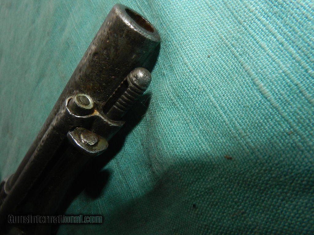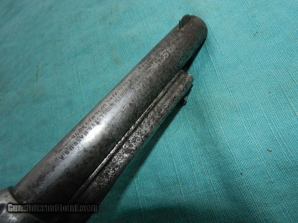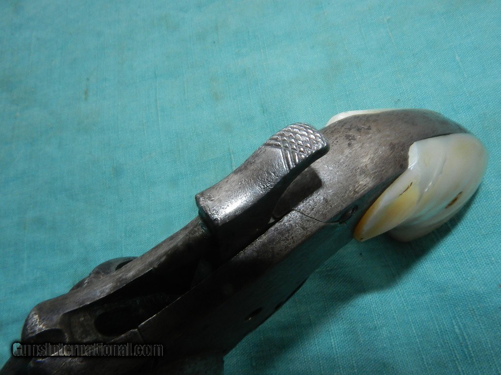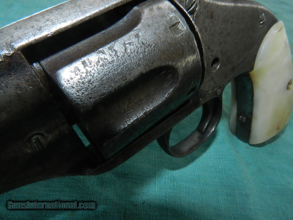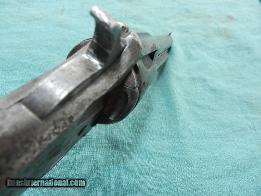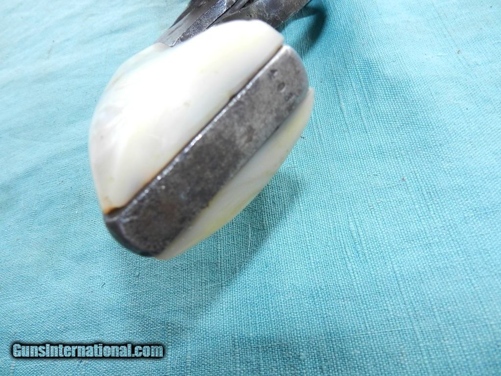 Description: <<<SOLD> >>>.A very Scarce Forehand & Wadsworth with serial #403, 44 S&W Russian, 5 3/8" round barrel with a fair bore showing scattered light pitting, oxidation and still good rifling throughout. The barrel of this scarce revolver has been slightly shortened no doubt very long ago during the period of use and the metal surfaces have toned to a mottled gunmetal patina showing evidence of an old cleaning with areas of moderate old pitting scattered about, scratches, dings and oxidation staining. Despite it all there are still a few flakes of original bright blue lurking about the protected areas of the frame. The barrel address is mostly intact with "FOREHAND & WADS" obscured by pitting and the remainder still quite clear. The screw heads show slot wear and a few are old replacements, the base pin retainer spring has been lost, the ejector rod head and firing pin show some old period repairs and the triggerguard appears to be from a different model and is not fitted perfectly. The smooth mother-of-pearl grips are un-numbered and remain in very good condition showing some light dings and handling marks. The base pin and cylinder are matching the frame and the action will require mechanical attention as half cock is somewhat worn, lock-up is loose but the action still times and the hammer functions at full cock. A good example piece of these low-production and desirable large frame Western Cowboy used Forehand & Wadsworth revolvers. Fitted with rare natural MOP grips original to the gun. Shipping may be higher than stated as shippers raise their prices twice year without notice! When buying a gun always have it examined by a competent gunsmith before shooting. To buy a gun from me you must get a direct email for me, with details, and shipping cost. We don’t have a web site .I prefer money orders or a check. Item ships when funds come in. If you can only pay with a card let me know. I try to keep guns affordable, which means I make less money than most dealers. You won’t get altitude sickness, or nose bleed, with my prices! I consistently have the best selection of older guns If you attempt to buy, you must still contact us for details . Best to email to buy. Sometimes a local person can stop buy and purchase before the gun is removed. Sometimes not home to get calls. Some guns are required shipment to a gun dealer near you for a transfer to you when it arrives. Otherwise many older or black powder guns ship to your door. With the widest selection of older guns at great prices, We don’t have a store, and sell on the internet only. I’m easy to get along with. Thank You. SOLD Antique: Yes |