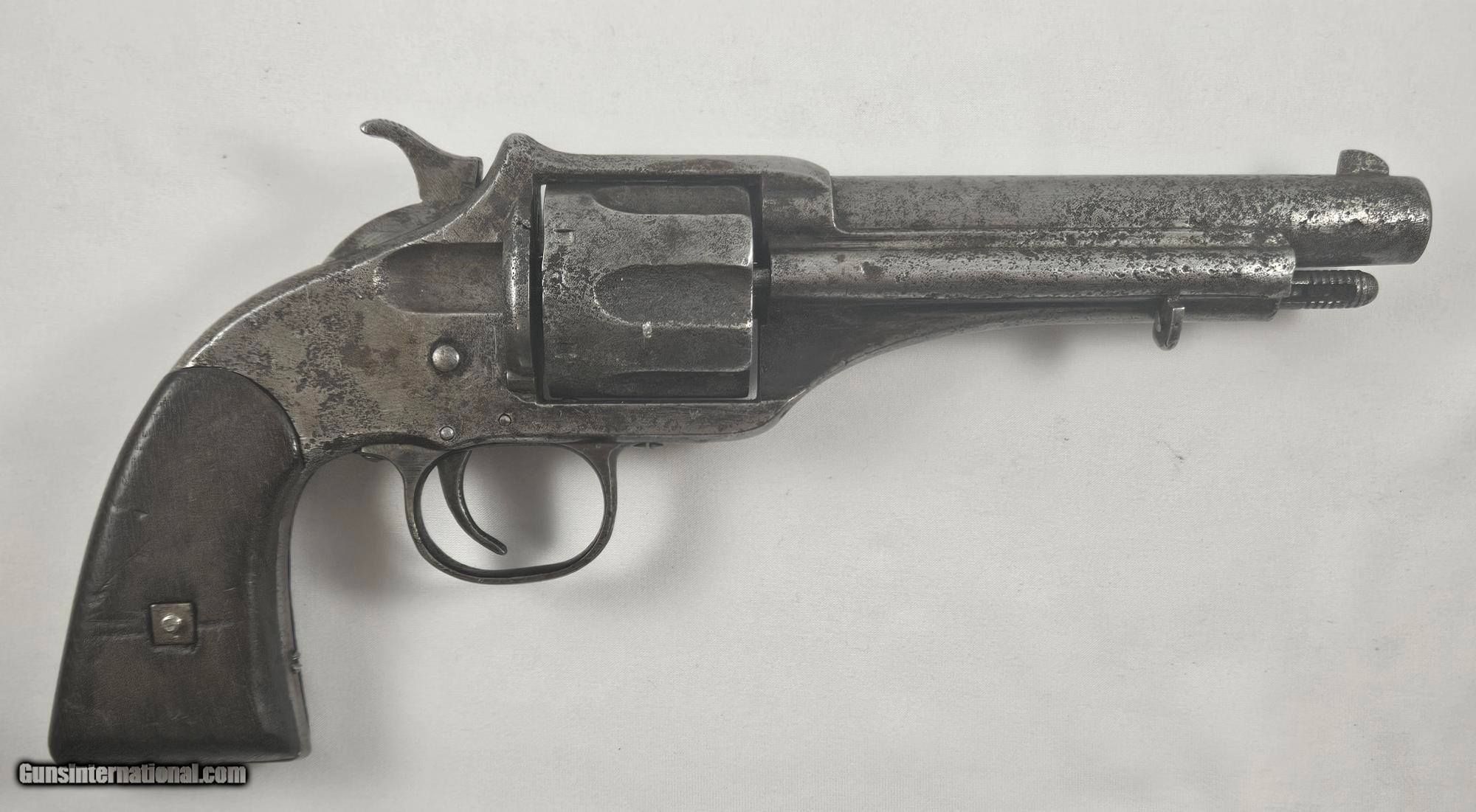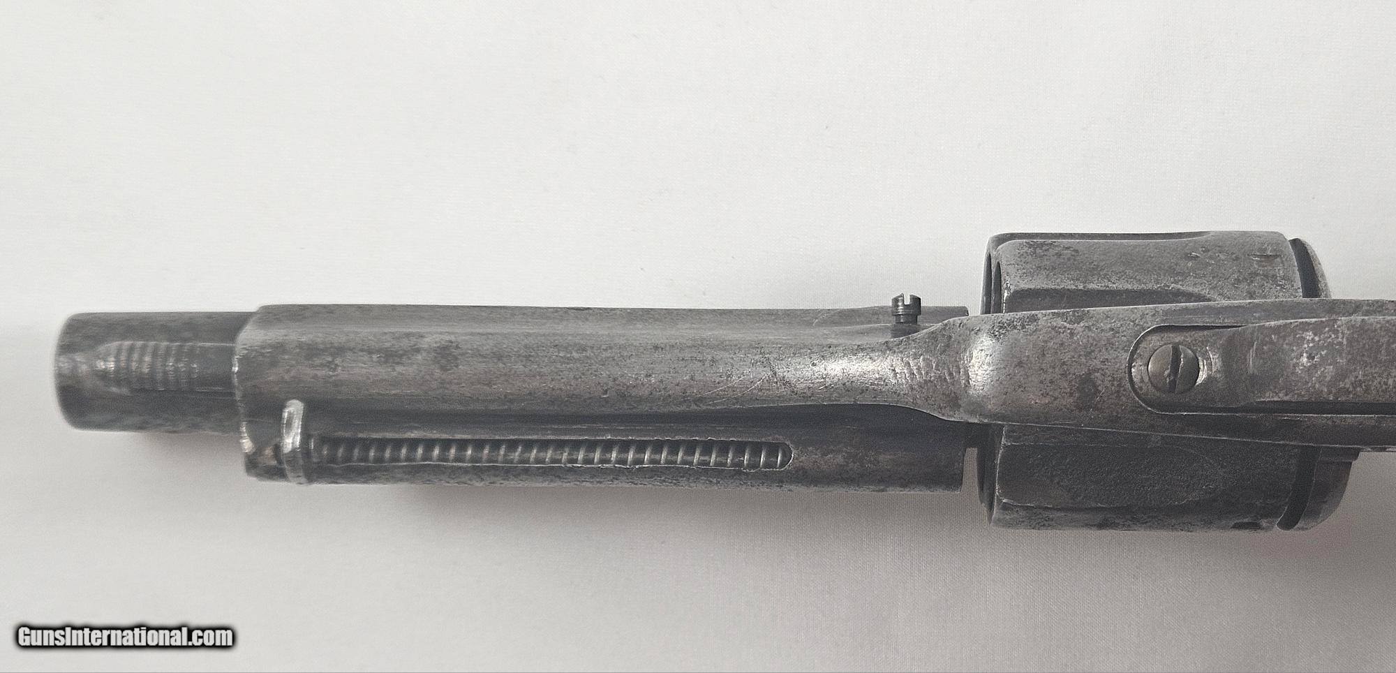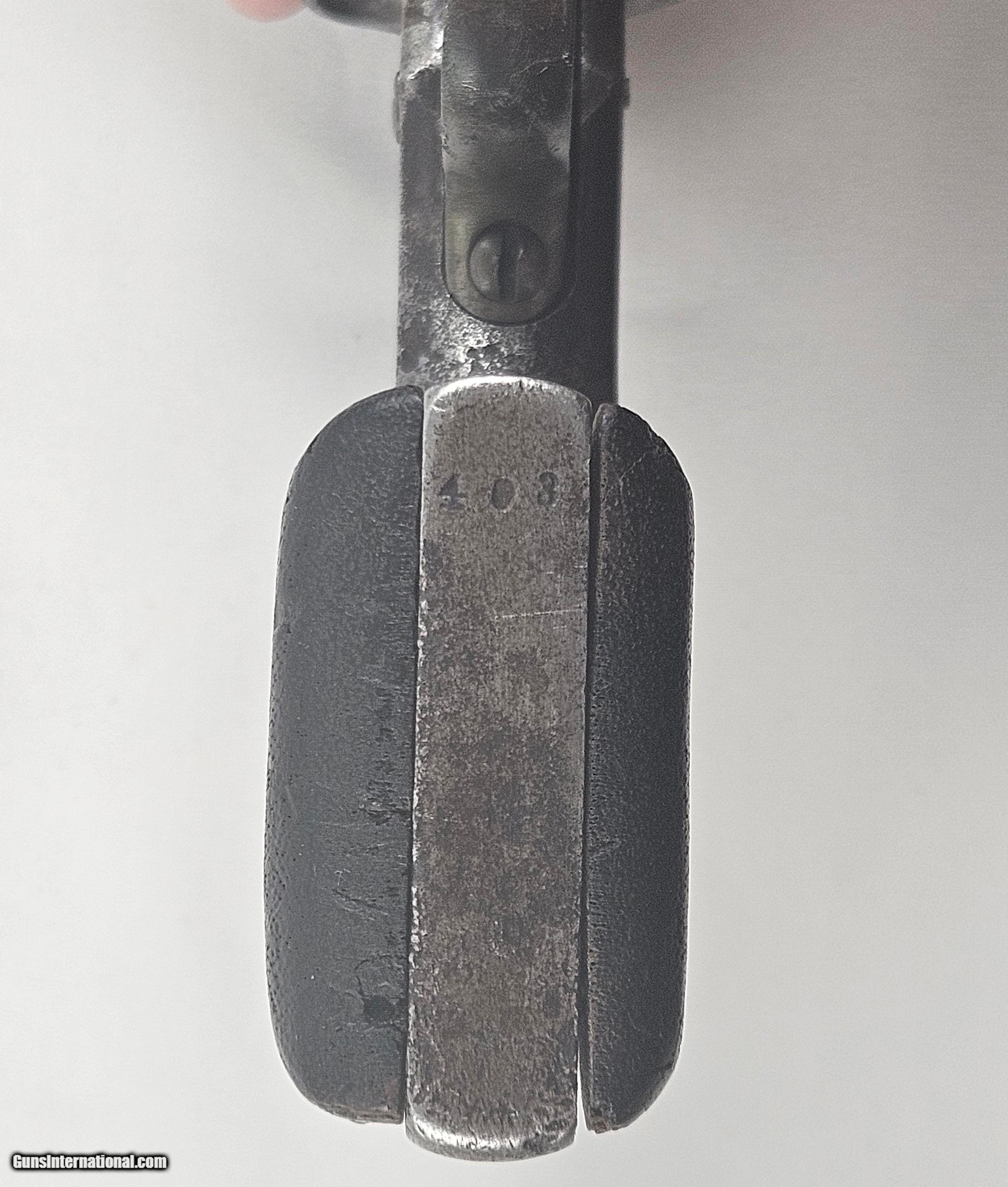 Description: Here is a Forehand and Wadsworth New Model Army. This one has been there and done that. The hammer cocks and the cylinder rotates but does not lock. The cylinder loading gate swings out and the ejector rod works but is rough. The cylinder release works and the cylinder is removable. The barrel is period cut and the grips are made by someone living on the frontier. Flaydermans estimates that under 1000 were made. I have scoured the Internet researching this model. I have found 28 of these guns listed with serial numbers from serial number 5 to 600. Its my opinion there are way less than 1000 made. On the other hand I did the same research for the Forehand and Wadsworth Old Model Army and found 32 guns ranging from serial number 74 to 1412. There were more that double of the Old Model Army ones made than this New Army Model. Cool old frontier revolver. This gun is an antique so it can ship direct to you. Shipping is $25 to the continuous States SOLD Antique: Yes Handgun Caliber: .44-40 Winchester (.44 WCF) Manufacturer: Forehand Wadsworth Model: New Model Army Serial Number: 403 Barrel Length: 5.25 |