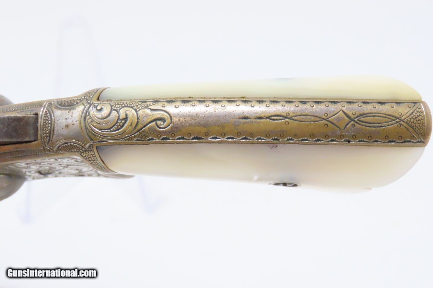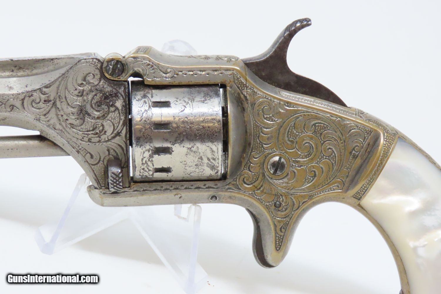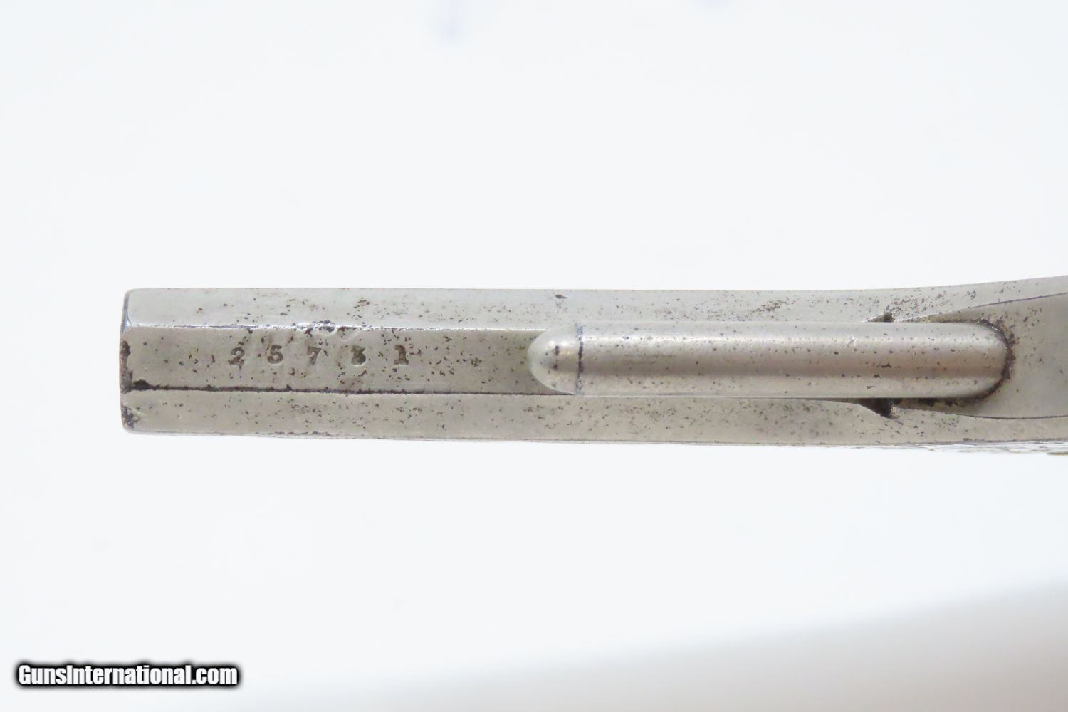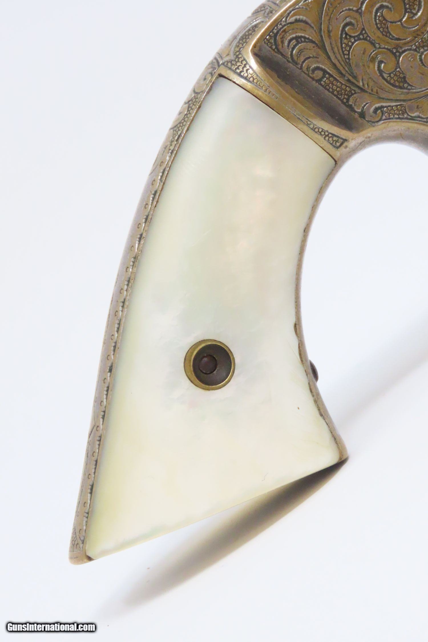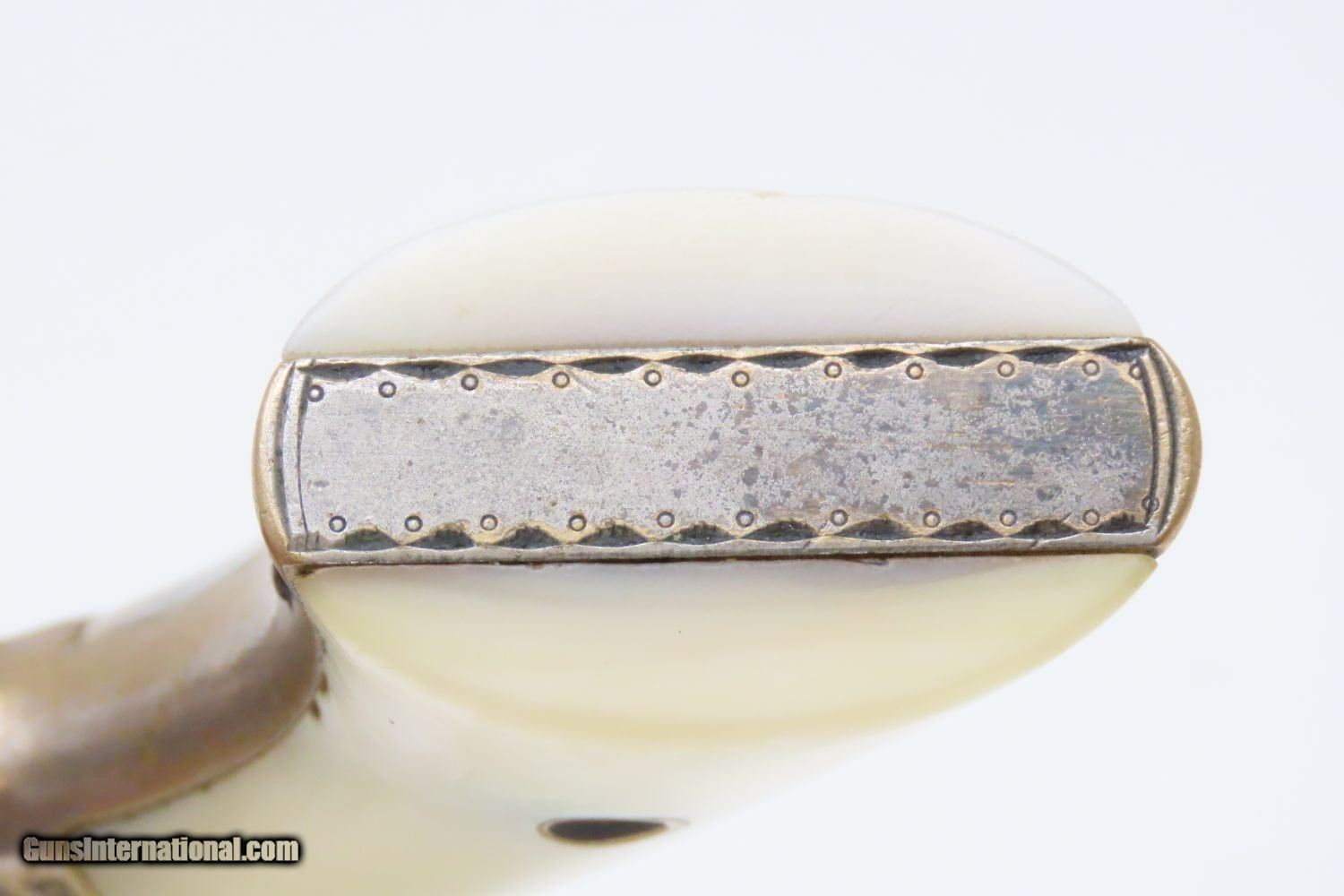 Description: GILDED AGE Antique Engraved AMERICAN STANDARD TOOL Tip-Up .22 Revolver Manufactured by MANHATTAN FIREARMS Co. with PEARL GRIPS Here we present an antique Factory Engraved American Standard Tool Co. Tip-Up .22 Rimfire Revolver, made circa 1870 in Newark, New Jersey. This small, 7 shot .22 revolver was a direct copy of the successful Smith & Wesson Model No. 1 Second Issue Revolver. While the making of the AST revolver commenced after S&W’s Rollin White patent expired in 1869, the Manhattan Firearms Mfg. Co. (the predecessor to American Standard Tool) made direct and quality copies of the S&W pistol without any regard to their patent infringement. The Manhattan Co. became part of AST in 1868 after briefly closing its doors. Interestingly, Manhattan was also famous for its virtual copies of Colt’s patents. In some ways, this is not terribly different than what goes on today in the firearms industry. Imitation is the sincerest form of flattery. The cylinder scene on these revolvers features settlers and Native Americans in a desperate fight. Cylinder scenes served multiple purposes at this time, primarily to make a gun difficult to forge, but certainly you can see the aesthetic value and the advertising that this one does for itself. A fascinating, if dark and gruesome, peek into mid-19th century America. The overall condition is fine. Original nickel finish. The action is strong and tight all around. The mother of pearl grips are luminescent and firmly seated. The bore is in good shape. A gorgeous little revolver from 1870s New Jersey! Own the original! This is a legitimate antique and not a reproduction. Barrel is 3-1/8 inches. Caliber: .22 Rimfire (short) Overall condition as seen in photos. Very Fast. Very Safe. FREE SHIPPING WORLDWIDE. Delivered directly to your door by express mail! Guaranteed AUTHENTIC & Includes CERTIFICATE OF AUTHENTICITY. ancestryguns $1685 #210571 SOLD Antique: Yes |