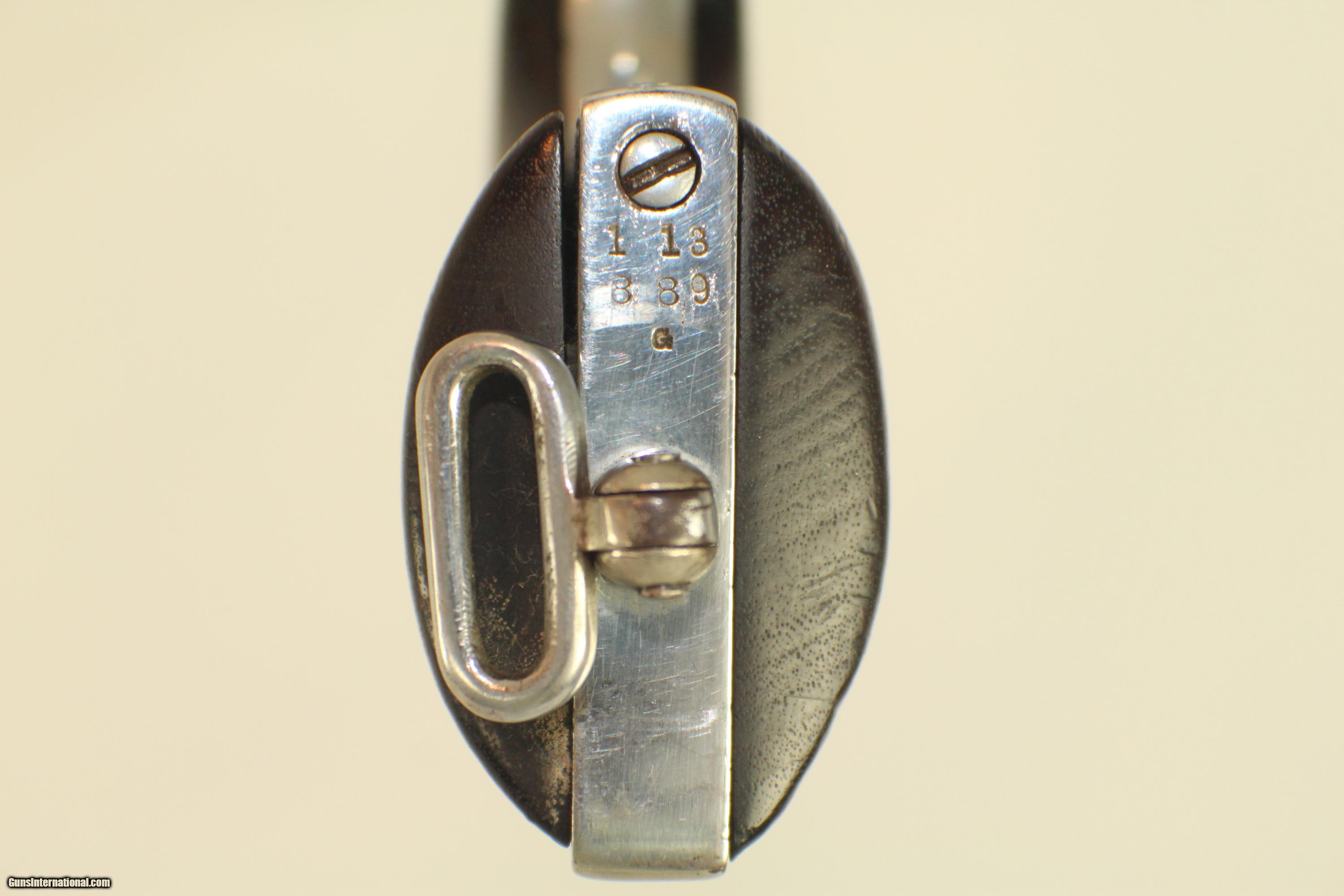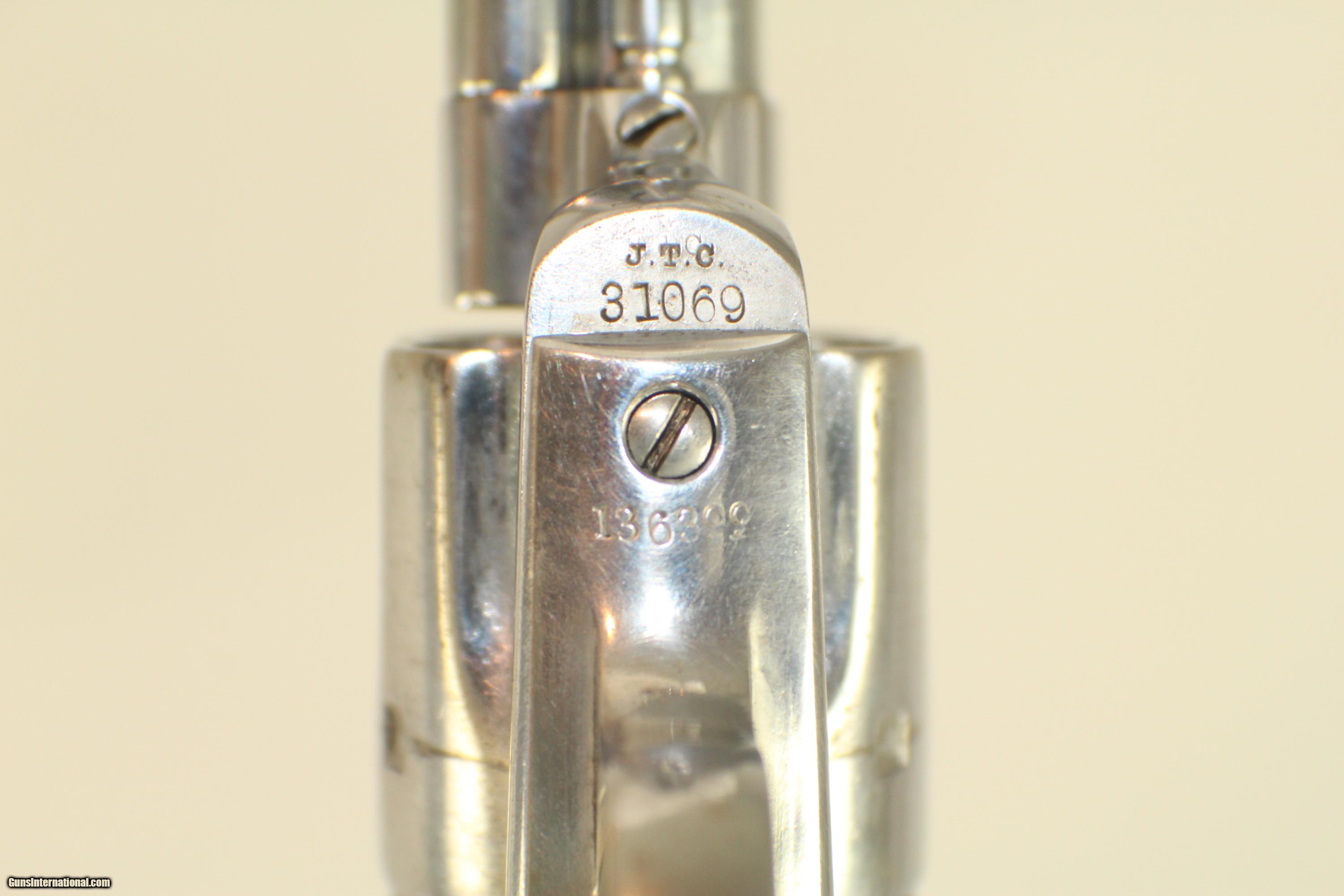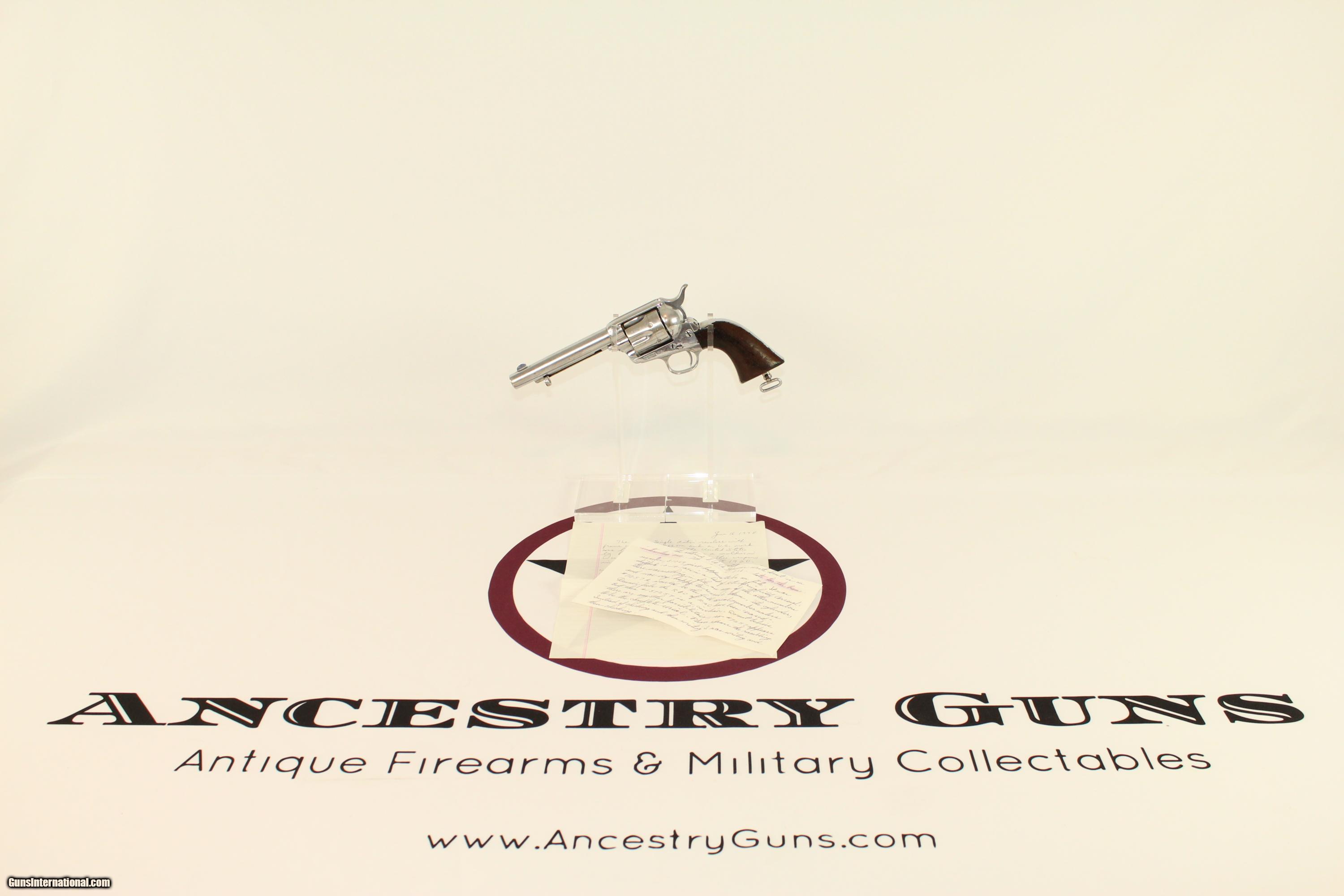 Description: Antique 1st Generation Colt Single Action Army Revolver Artillery Model With Springfield & Great War Provenance! Here we present an antique 1st Generation Colt Single Action Army Revolver Artillery Model, made prior to 1898 and brought back from Europe by a returning American G.I. The Colt Single Action Army is a worldwide icon of the United States of America and the Western Frontier. Wielded by both the worst of men and the best, the famous Single Action Army is also well-known as the Peacemaker. The Artillery or Springfield Armory Model of the Single Action Army is a period armory or factory refinished gun. In all but the rarest variant of the Artillery Model, the serial numbers will be mixed. There will also be a “U.S.” mark. This six-shooter is chambered in .45 Colt and features a 5.5 inch barrel. The grips are walnut and in excellent condition. This is the “Type I” Artillery Model, which is defined by the serial numbers not matching. The handsome nickel finish is nearly 100%. This gun is in excellent condition. The initials “J.T.C.” on the bottom of the frame indicate that it was inspected by John T. Cleveland. This fantastic revolver comes with two documents. One is a detailing of the different serial numbers on the gun. The serial number on the frame was confirmed as having been sent to Springfield Armory on October 19, 1896. The other document details part of its provenance, telling in brief how American G.I. Paul McInturff brought it back from Europe after World War I. It also details the chain of ownership from there. This is a legitimate antique and not a reproduction. Barrel is 5.5 inches in length. Caliber: .45 Colt Bore is in excellent condition and the firearm is in good working order. Overall condition as seen in photos. Here is a superb, nickel-finished 1st Generation Single Action Army for your fine collection. Very Fast. Very Safe. FREE SHIPPING WORLDWIDE. Delivered directly to your door by express mail! Guaranteed AUTHENTIC & Includes CERTIFICATE OF AUTHENTICITY. ancestryguns $7500 #21485 SOLD Antique: Yes |