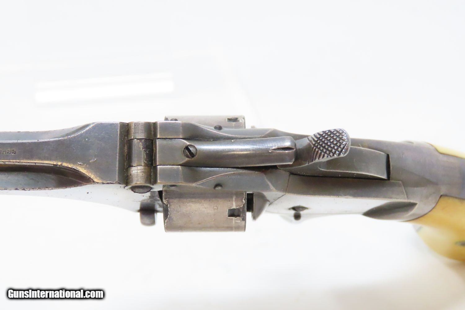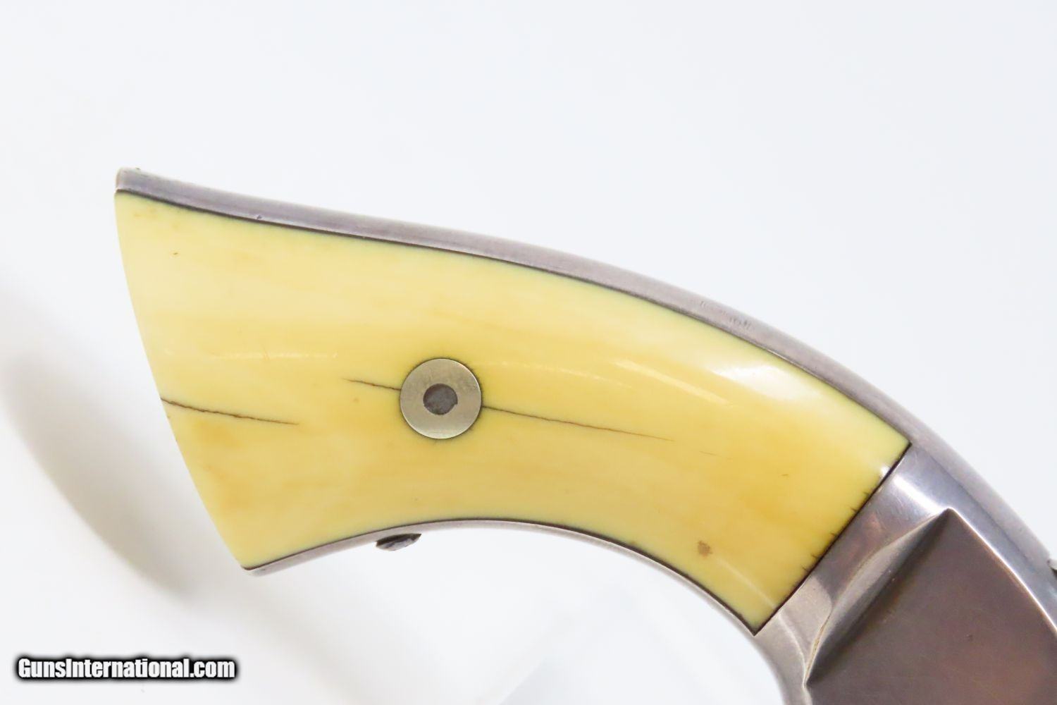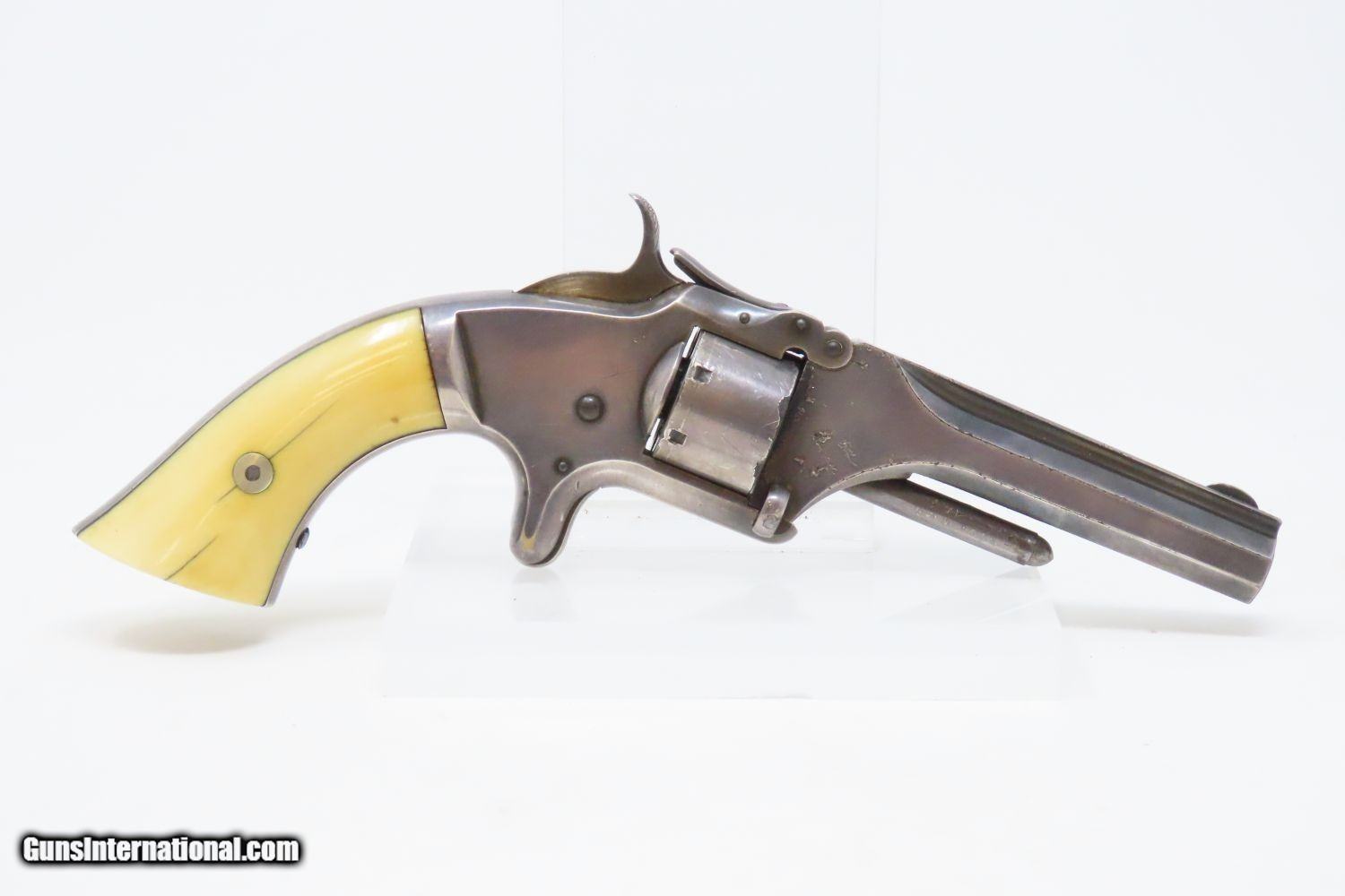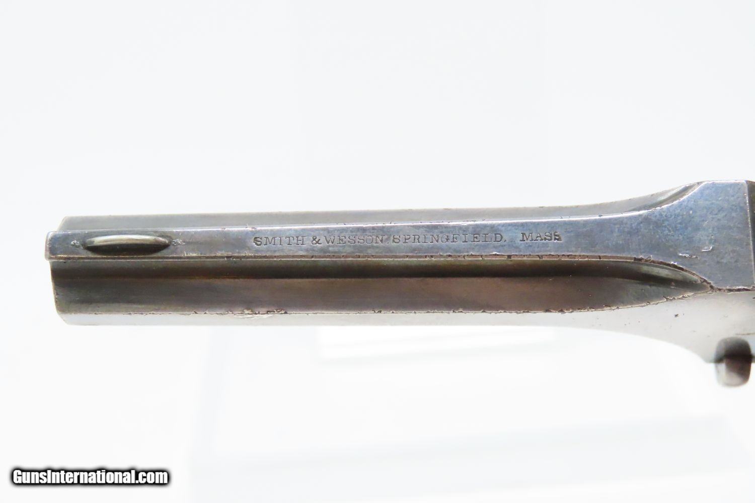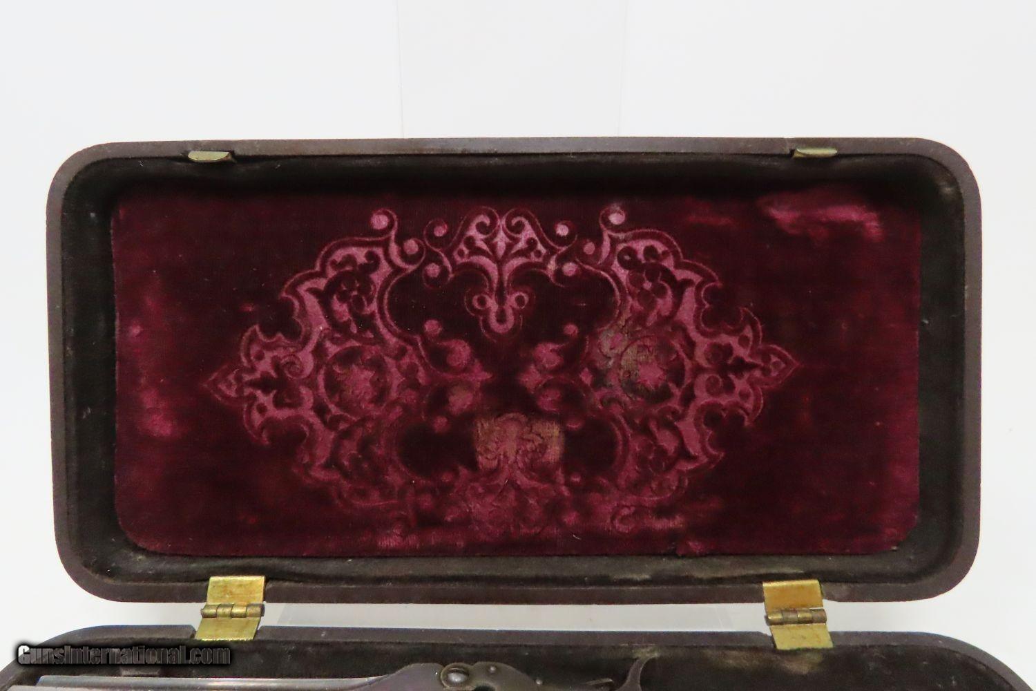 Description: GUTTA PERCHA CASED Antique SMITH & WESSON No. 1 .22 Rimfire REVOLVER VERY RARE MOLDED FACTORY BOX! Here we present an antique Smith & Wesson Model No. 1, Second Issue Revolver, manufactured circa 1860 to 1868 in Springfield, Massachusetts. Smith & Wesson manufactured approximately 115,000 of these revolvers between 1860 and 1868. Serial numbers started around 11000 where the 1st Issue left off and continued to 126400. The No. 1 was Smith & Wesson’s first metallic cartridge firearm. It utilized the idea of the “bored through cylinder”, which was patented by Rollin White and subsequently exclusively licensed by Smith & Wesson. This concept has forever changed revolving firearms design, and is the same idea used in revolvers today. S&W, via Rollin White himself, aggressively sued any patent infringers and were able to hold their monopoly on the American market for cartridge revolvers from about 1857 to 1870, whereupon their patent expired. The results were a very profitable business, a broke Rollin White, and a grudging U.S. Chief of Ordnance Alexander Dyer, who was still angry in 1870 about not being able to use the technology during the Civil War. The U.S. government ended up giving Colt their contracts since they valued the larger .44 caliber in the Colt 1860 Armies over the .32 caliber full sized No. 2 Armies. This small revolver is a 7-shot .22 rimfire. It was specifically designed to be a pocket gun, being very small and light. The No. 1 was the precursor to larger firearms that were simply scaled up to be more suitable for use as martial weapons. Though not a primary military arm during the American Civil War, handguns were commonly privately purchased by soldiers for use on the battlefield. Whether legend or fact, it is interesting to note something commonly read about pocket revolvers of the day: that while they could be used for self-defense against the enemy, many soldiers kept them on their person to defend themselves against an unwanted amputation in the primitive field hospitals that were notorious, even in their day. This case is quite a rarity. Very few have survived, especially in this condition as the choice of material is quite brittle. They were made for Smith & Wesson by Littlefield Parsons & Company. It is made of gutta percha, a hard-rubber-like substance derived from a tree that was in use for pistol grips and similar purposes in the mid-to-late-19th Century. This was molded with the figure of the revolver, the company’s information and the detail around the borders. The inside is lined with a burgundy-colored velvet with a fancy embossed portion on the inside of the lid. The lower portion of the case has space for a revolver and a block with spaces for ammunition. The cases themselves are extremely collectible! The overall condition is fine. Lovely silver plate finish throughout. Solid ivory grips. The action is strong. The bore is reflective with good rifling. The gutta percha factory case has weathered the storm of the years very well, remaining solid and showing a few chips and tiny, hairline cracks. It comes with a fully loaded ammunition holder with original cartridges, many of which are somewhat corroded. This is a very rare little set! Own the original! This is a legitimate antique and not a reproduction. Barrel is 3-3/16 inches. Caliber: .22 Rimfire (Short; black powder) Overall condition as seen in photos. Very Fast. Very Safe. FREE SHIPPING WORLDWIDE. Delivered directly to your door by express mail! Guaranteed AUTHENTIC & Includes CERTIFICATE OF AUTHENTICITY. ancestryguns $4225 #215135 SOLD Antique: Yes |