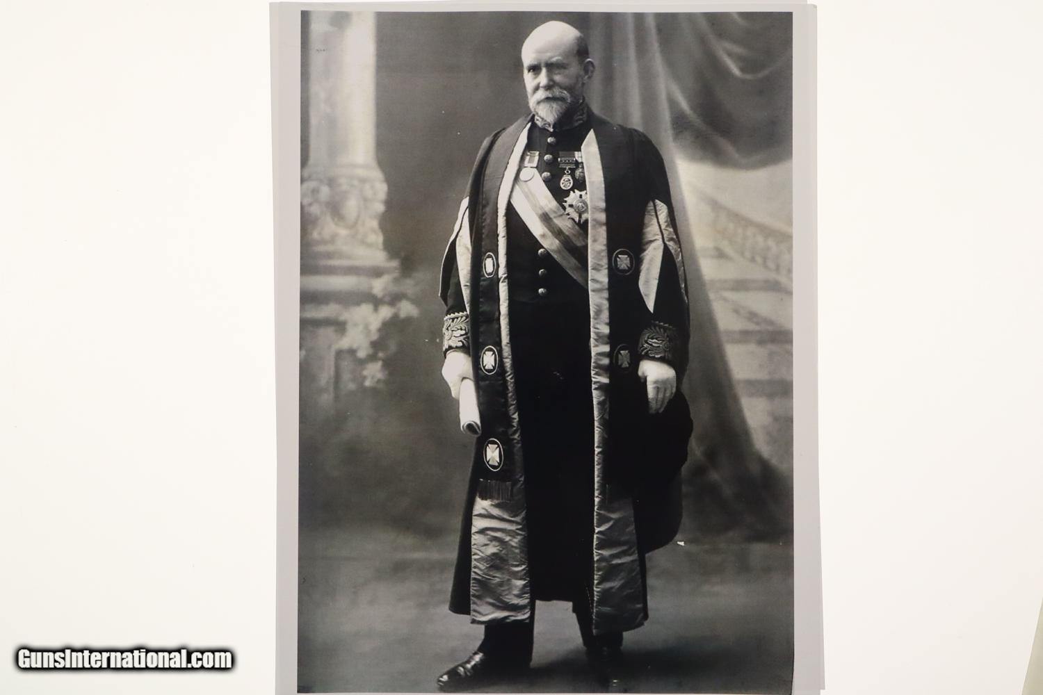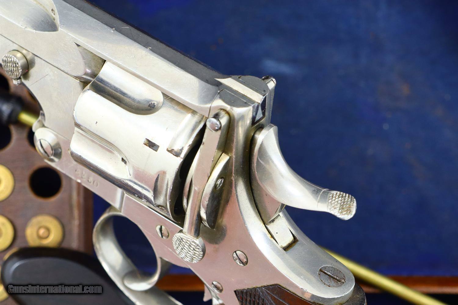 Description: Synopsis: Beautiful high condition, well documented, and all matching British Webley Pryse Revolver, retailed by Wilkinson & Son in London, cased with accessories and replete with documentation relevant to the original purchaser W. MacGregor, a doctor turned Governor of Fiji, New Guinea, Lagos, Newfoundland and Queensland in his later years. Check out his Wikipedia page! Description: This large frame, single action/double action nickel revolver with fixed sights and 5 5/8-inch barrel, was retailed by Wilkinson & Son, and sold to W.McGregor in 1885. Documentation provided by Richard Milner LTD, well-known British historian, includes a letter and a scan from the Wilkinson sales book that specifically showed this revolver as sold to MacGregor under entry #7947 in February, 1885. As typical of that period, the retailer name has been neatly scribed on top of the barrel rib. Ownership to MacGregor, in a very similar style, was applied to the bottom barrel flat. Rear face of the cylinder, marked with a matching '350' along with 2 other inspection numbers. Fitted with a single piece wraparound walnut grip whose surface was largely checkered. On the bottom of the left side is number '7947' that corresponds to the sales entry. Revolver is complete with walnut case, compartmentalized with the revolver, oil bottle, ebony handled turn screw, cleaning rod, and an ammo block partially filled with 11 cartridges. The research dossier for Sir William MacGregor shows he became an MD in 1872, accepted the post of medical officer to the Seychelles in 1873 and had an illustrious career in colonial administration including governorships of Fiji, New Guinea, Lagos, Newfoundland and Queensland. He became a Privy Counsellor in 1914. He was praised as a colonial governor for his humanitarian leadership and scientific approach to addressing problems. Condition: Near excellent original nickel finish, approximately 95-97% coverage, with expected sharp edge wear, light scuffing, and superficial oxidation (especially on buttcap) as one might expect from a carefully carried handgun after nearly 150 years. Comparable condition grips, oil darkened, with a scattering light handling marks and superficial bruising. Very bright bore, minimal oxidation, sharp rifling. Correct manual mechanics. Now in walnut case, whose interior seems to have been re-purposed for this revolver, and associated accouterments, with accessories in excellent condition. Your opportunity to own a significant piece of British history with solid attribution to a historical figure! ~~Insured shipping fee of $155; most packages shipped using FedEx 2nd Day.~~ SOLD Manufacturer: Webley Serial Number: 6350 Caliber Info: 455/476 CF |