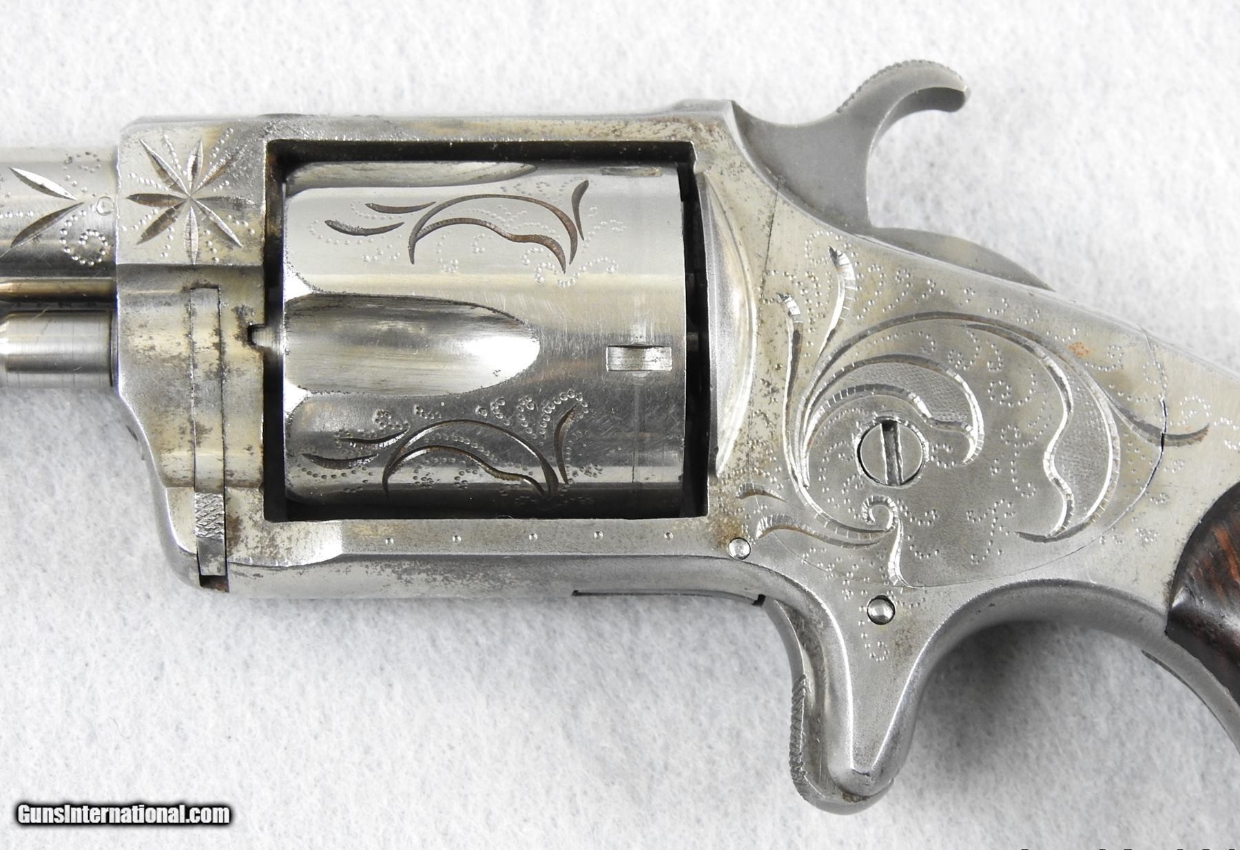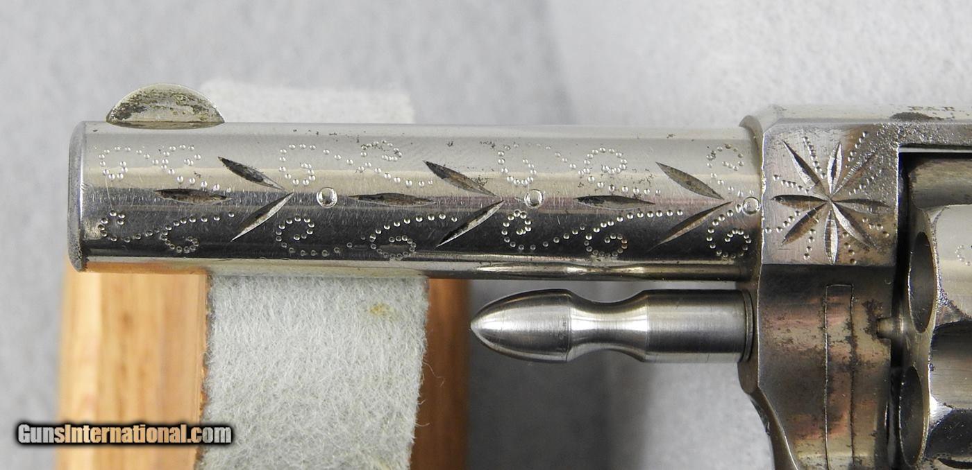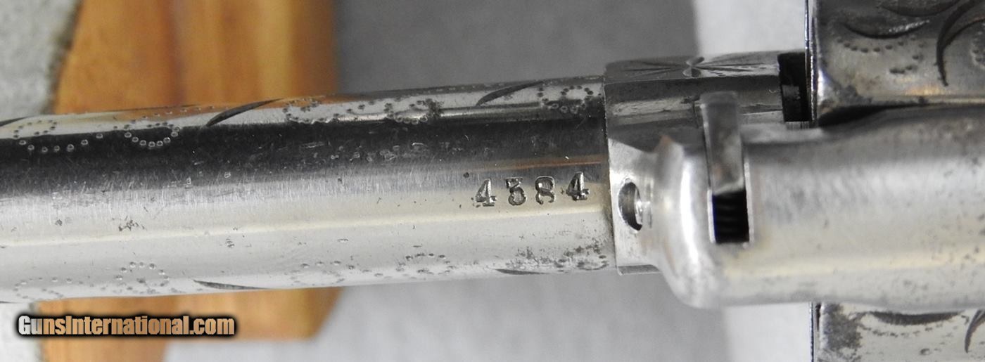 Description: This is an engraved Hopkins & Allen Blue Jacket 32 rimfire spur trigger revolver. The mechanical function is very good and tight and the bore is bright and shiny but shows traces of fine corrosion in several spots. The right side of the frame shows over 80% original finish, and the left 75% finish. The cylinder 85-90% except for two spots near the end of the cylinder has worn off. The serial number is 4384 with frame and barrel numbers matching. The grips are not numbered. This is the first engraved one for me. I would consider trades for pre 1899 ANTIQUE PISTOLS and rifles on any of my items.. WHAT DO YOU HAVE TO TRADE? Ask about our 30-90 day lay-away program. We accept Bank Check, Money order, Personal checks or wire transfer. SOLD Curio/Relic: Yes Antique: Yes Manufacturer: Hopkins & Allen |