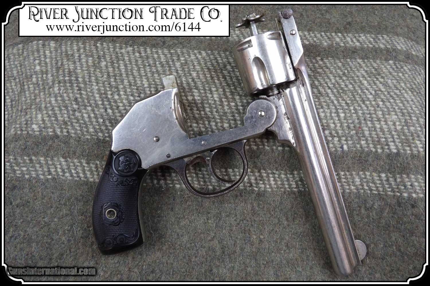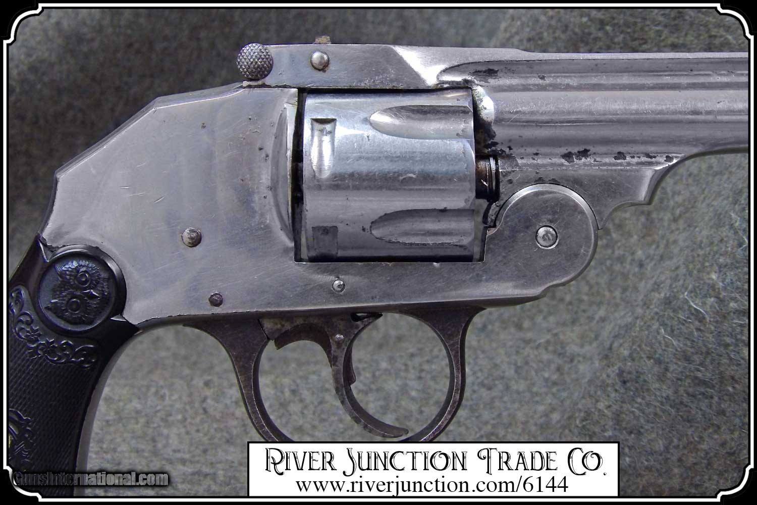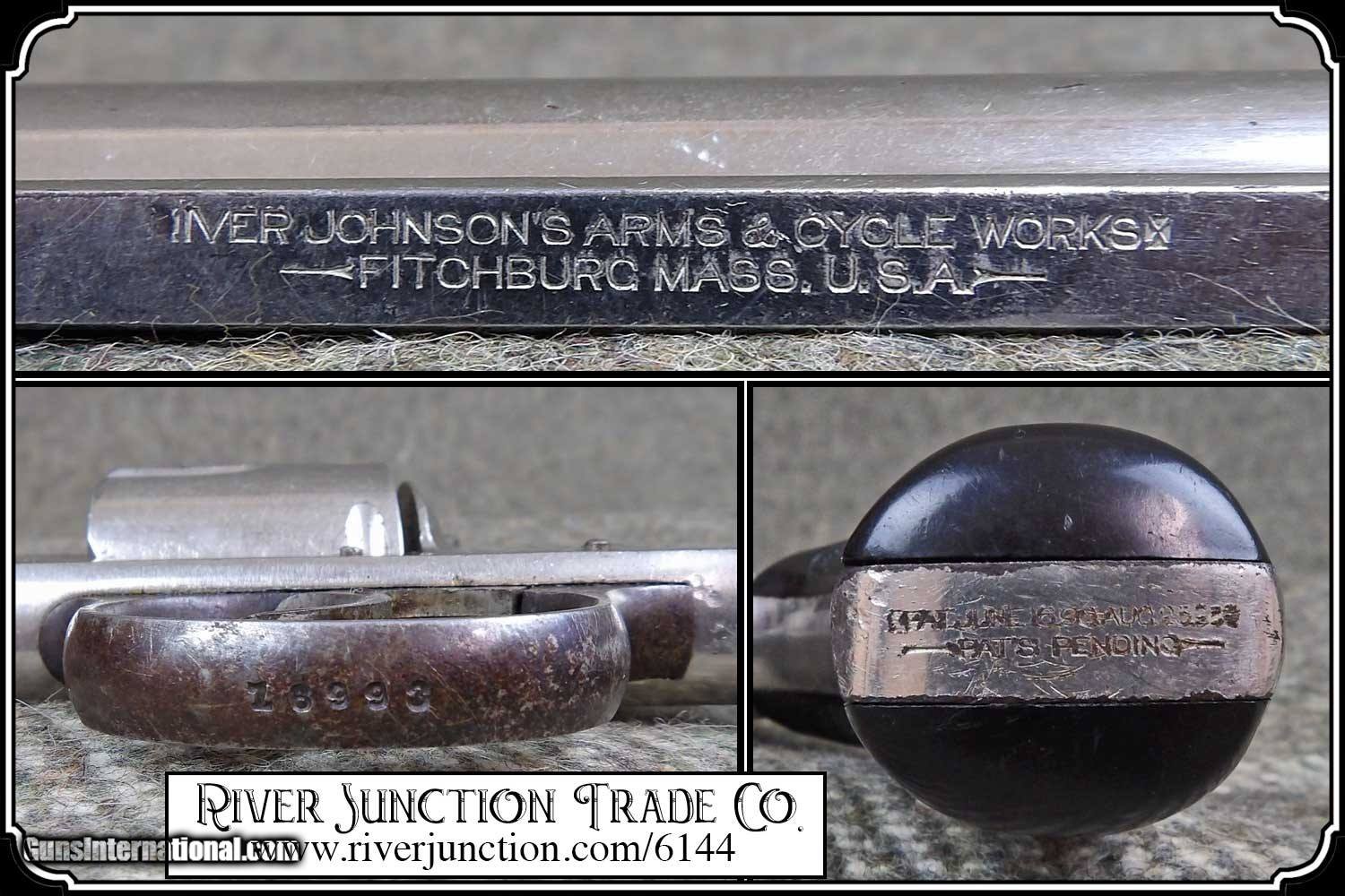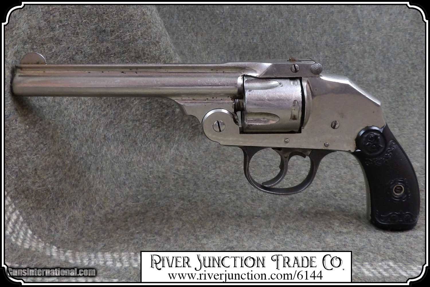 Description: Marked on the top of the barrel rib IVER JOHNSON'S ARMS & CYCLE WORKS FITCHBURG. MASS.U.S.A. Looks good and functions well. This revolver has 99% original nickle. This fine piece of workmanship has been around before airplanes, cars and telephones. The overall condition is very smooth. Gun locks up very tight, and functions perfectly. Grips show almost no wear. This is the scarce version of the hammerless with the short 5 inch barrel. Chambered in .38 S&W center fire. The action is perfect, with bright shiny bore very sharp rifling. All markings are sharp and clear. Ship to your dealer. Payment: Item, can be ordered on line with a credit card or paypal on our sight. Just Google (riverjunction) and type in the River Junction Trade Co. item number (6144) in the search box. Before you checkout you will see shipping cost and total. OR If you prefer: Pay by cash, postal money order, cashiers check, personal & business checks. We wait for checks to clear. We always answer questions and entertain offers. Have questions? Call me 563-880-4588. Jim SOLD |