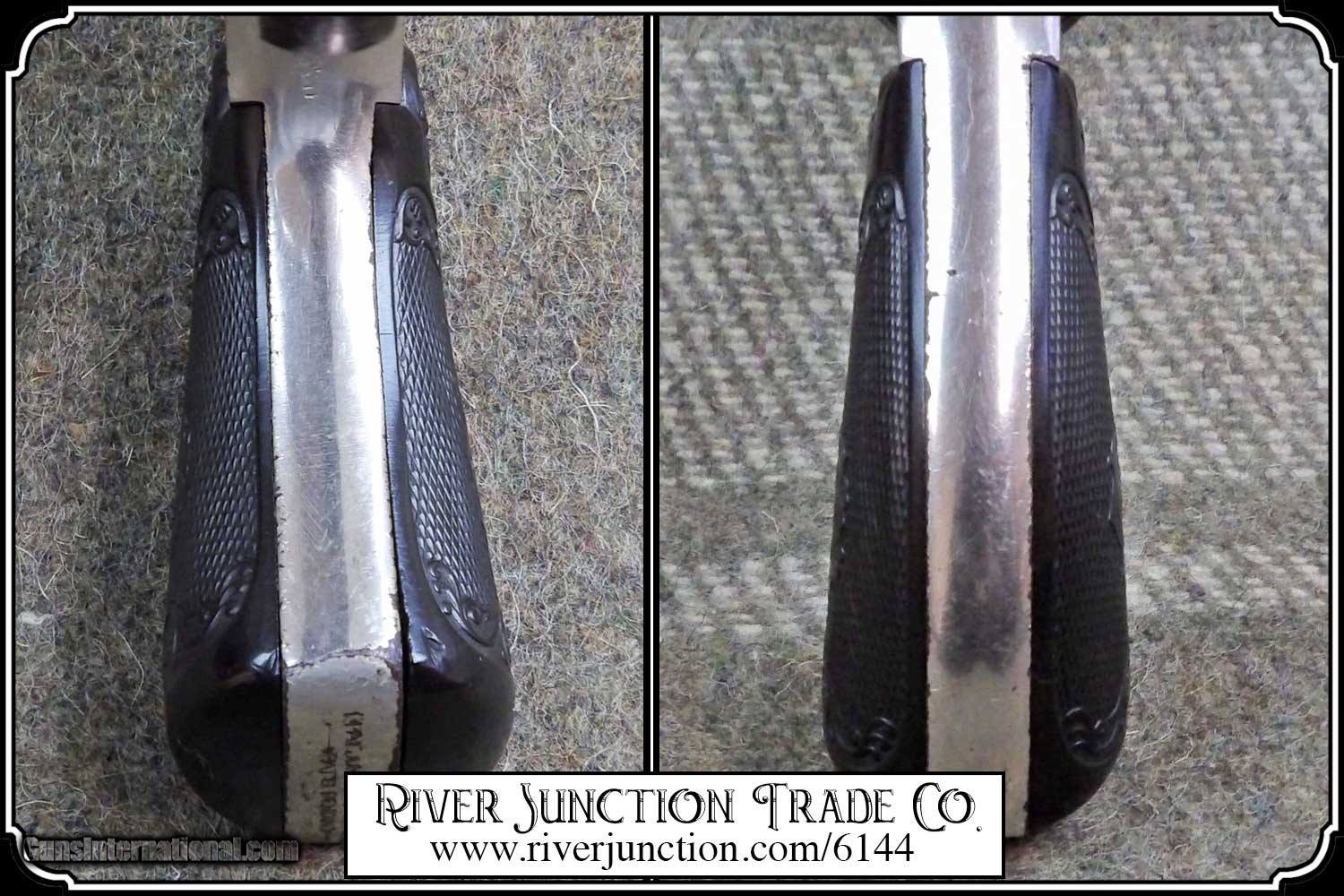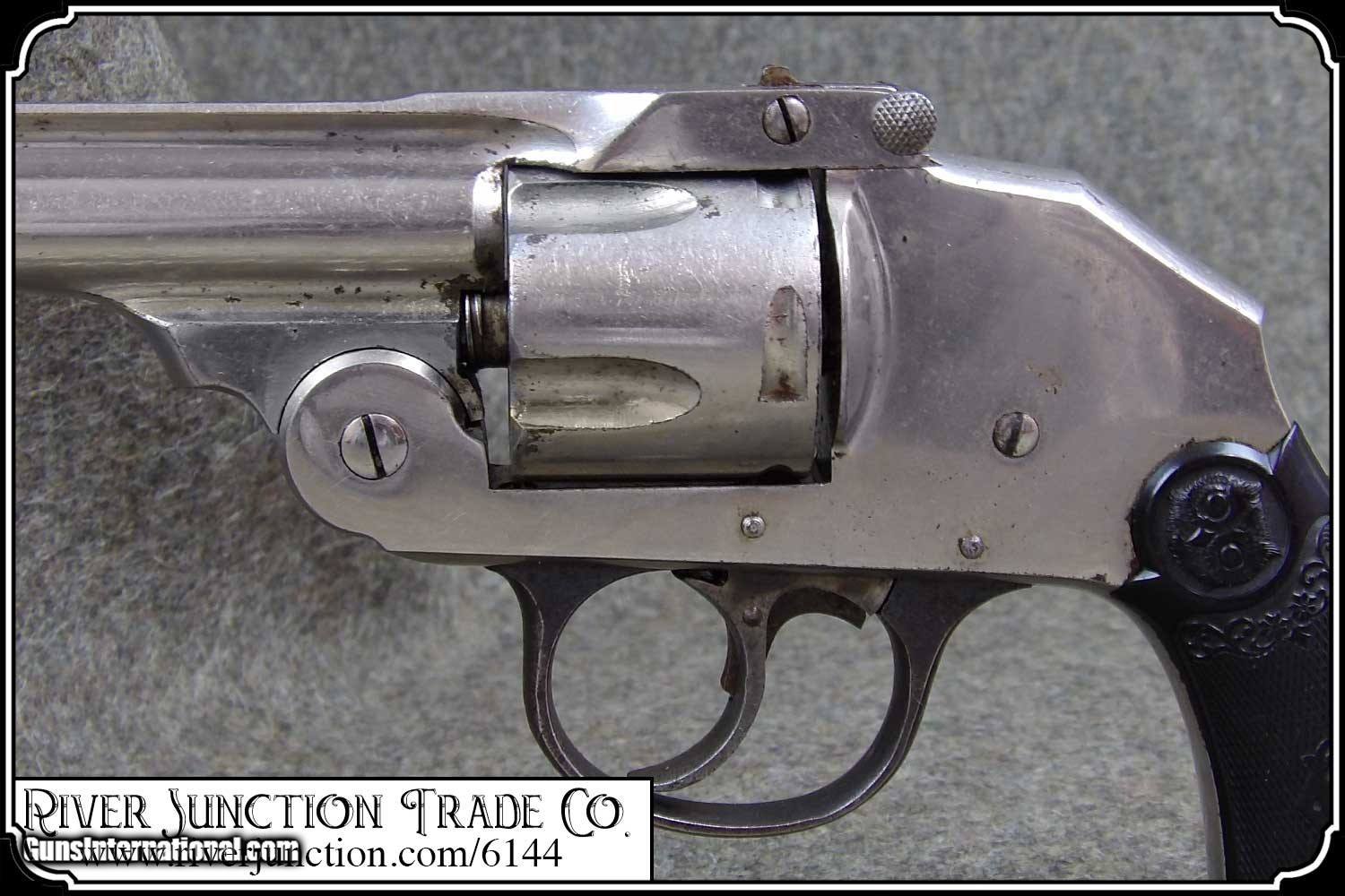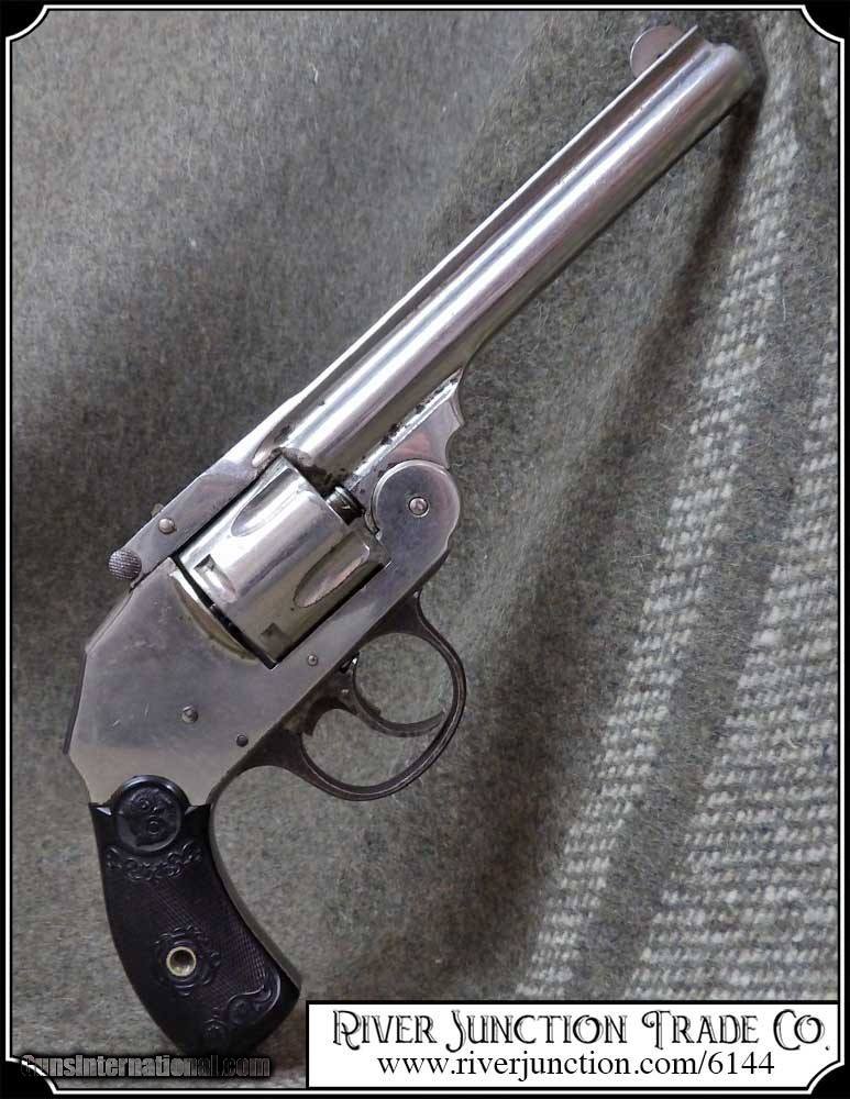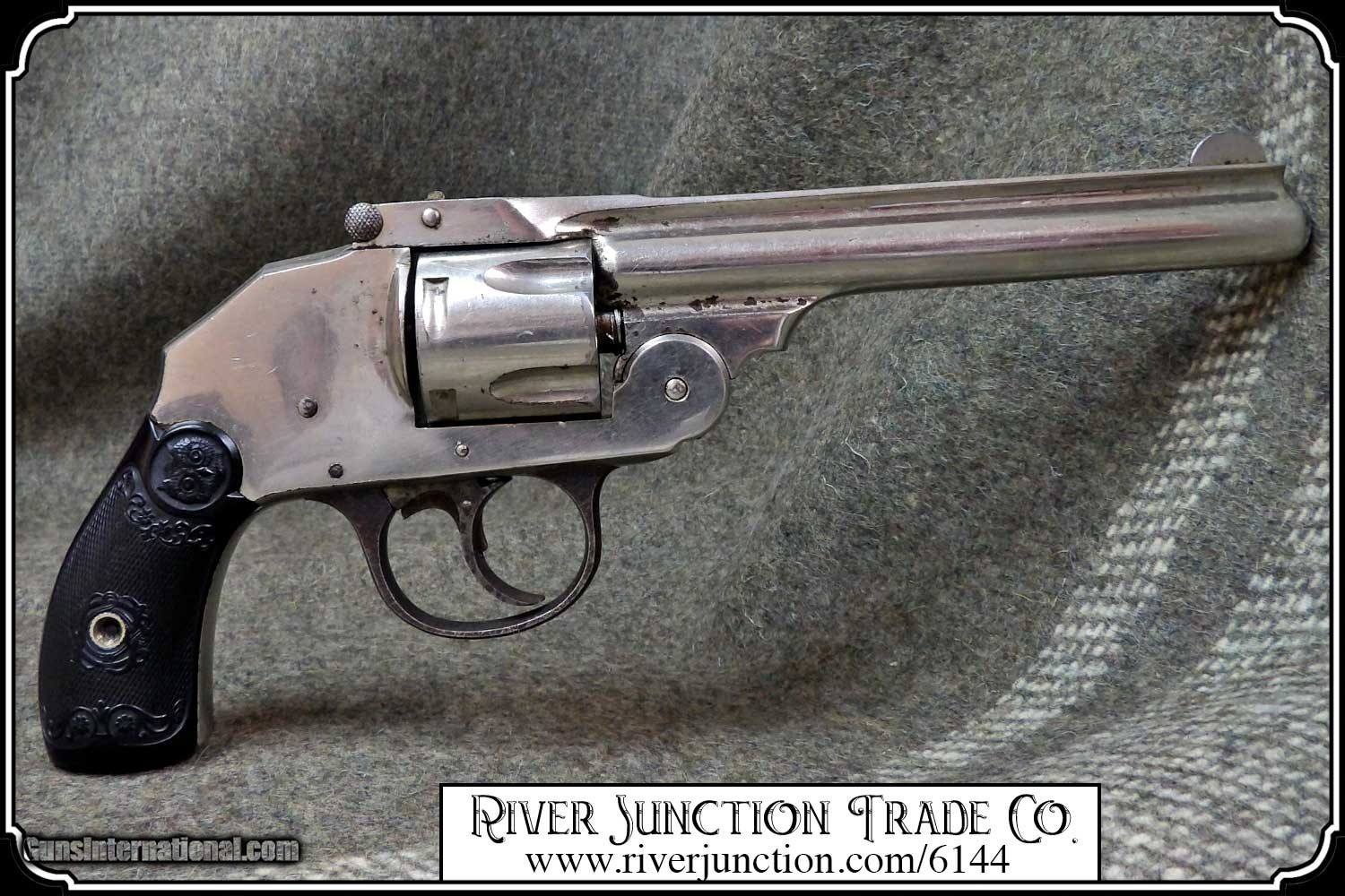 Description: Marked on the top of the barrel rib IVER JOHNSON'S ARMS & CYCLE WORKS FITCHBURG. MASS.U.S.A. Looks good and functions well. This revolver has 99% original nickle. This fine piece of workmanship has been around before airplanes, cars and telephones. The overall condition is very smooth. Gun locks up very tight, and functions perfectly. Grips show almost no wear. This is the scarce version of the hammerless with the short 5 inch barrel. Chambered in .38 S&W center fire. The action is perfect, with bright shiny bore very sharp rifling. All markings are sharp and clear. Ship to your dealer. Payment: Item, can be ordered on line with a credit card or paypal on our sight. Just Google (riverjunction) and type in the River Junction Trade Co. item number (6144) in the search box. Before you checkout you will see shipping cost and total. OR If you prefer: Pay by cash, postal money order, cashiers check, personal & business checks. We wait for checks to clear. We always answer questions and entertain offers. Have questions? Call me 563-880-4588. Jim SOLD |