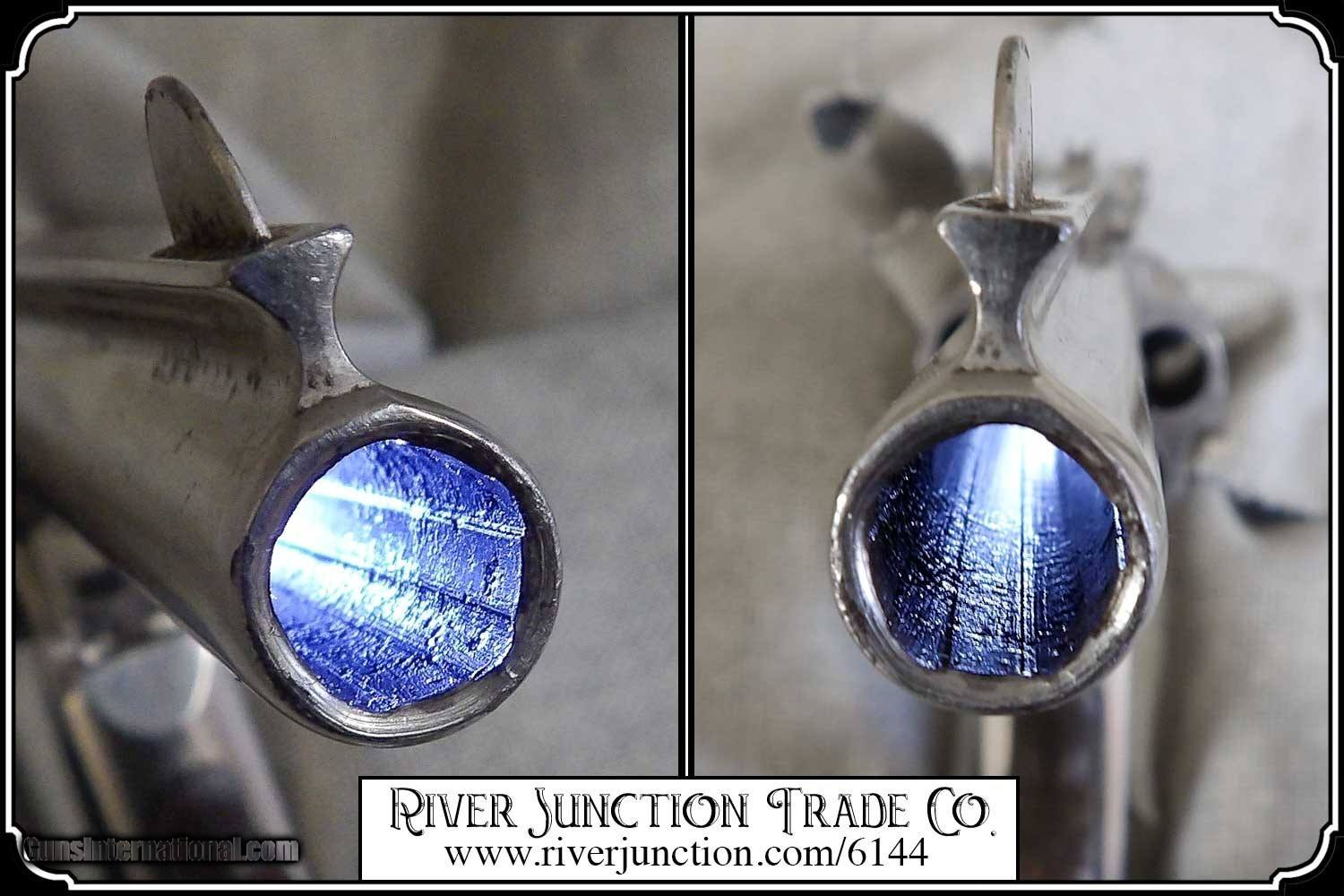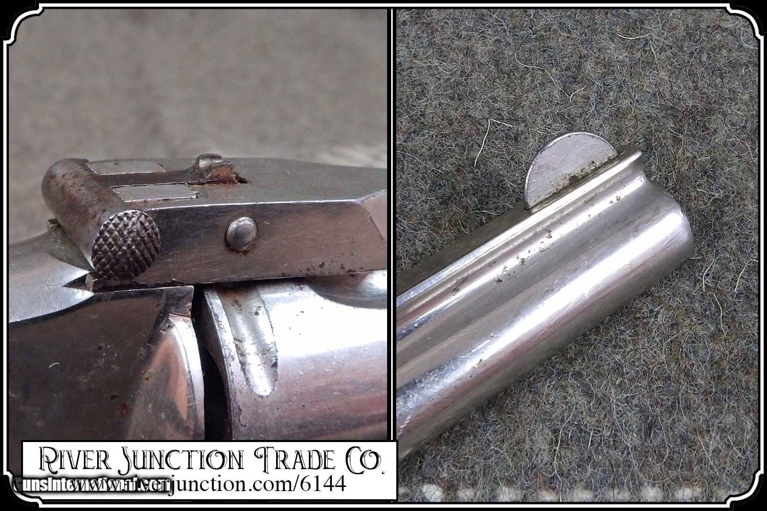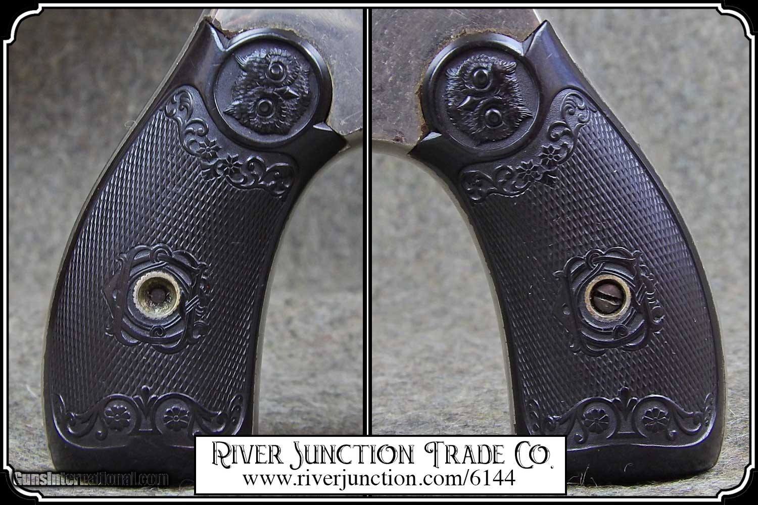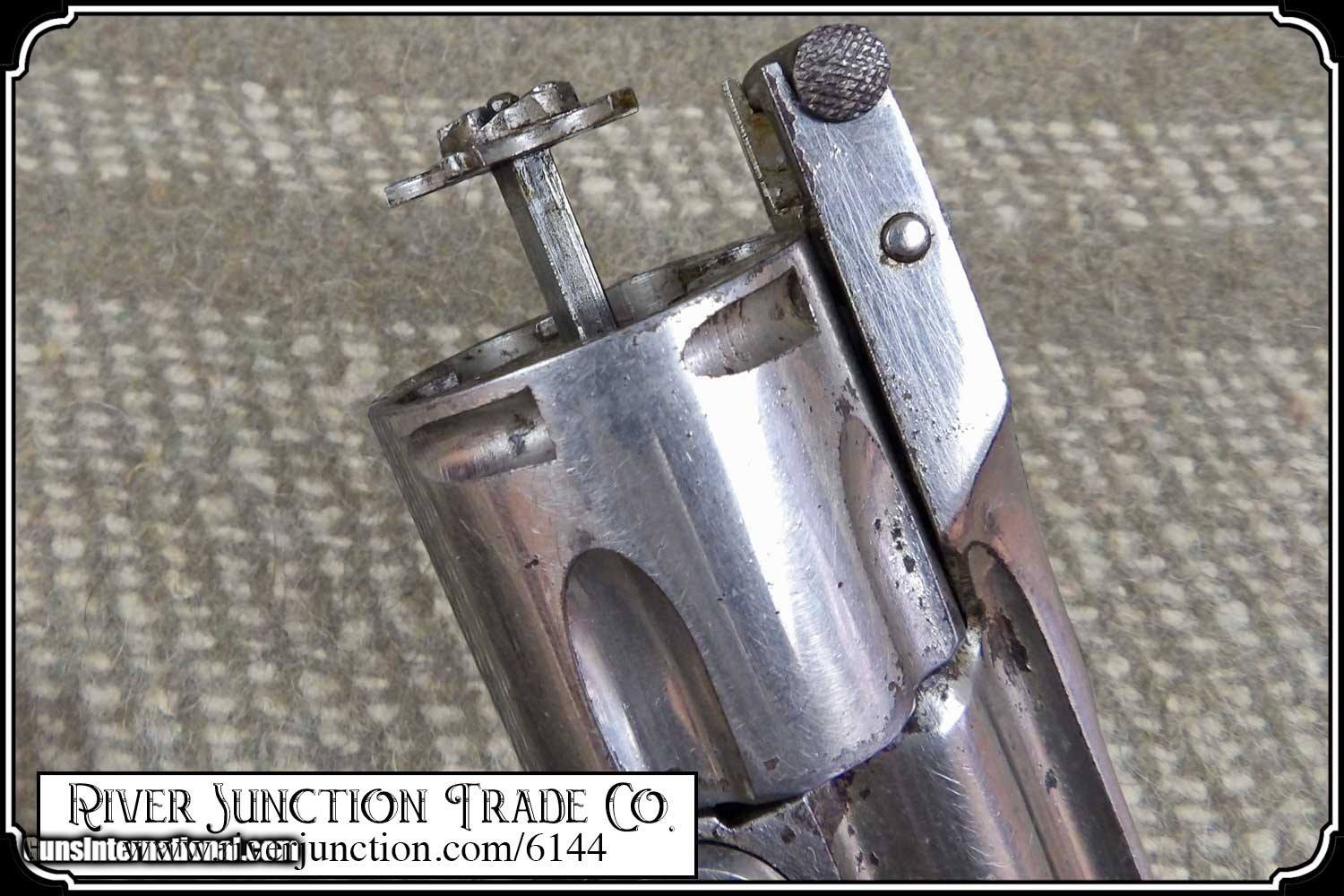 Description: Marked on the top of the barrel rib IVER JOHNSON'S ARMS & CYCLE WORKS FITCHBURG. MASS.U.S.A. Looks good and functions well. This revolver has 99% original nickle. This fine piece of workmanship has been around before airplanes, cars and telephones. The overall condition is very smooth. Gun locks up very tight, and functions perfectly. Grips show almost no wear. This is the scarce version of the hammerless with the short 5 inch barrel. Chambered in .38 S&W center fire. The action is perfect, with bright shiny bore very sharp rifling. All markings are sharp and clear. Ship to your dealer. Payment: Item, can be ordered on line with a credit card or paypal on our sight. Just Google (riverjunction) and type in the River Junction Trade Co. item number (6144) in the search box. Before you checkout you will see shipping cost and total. OR If you prefer: Pay by cash, postal money order, cashiers check, personal & business checks. We wait for checks to clear. We always answer questions and entertain offers. Have questions? Call me 563-880-4588. Jim SOLD |