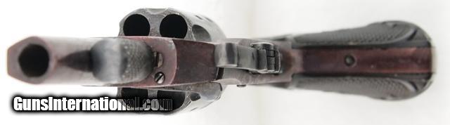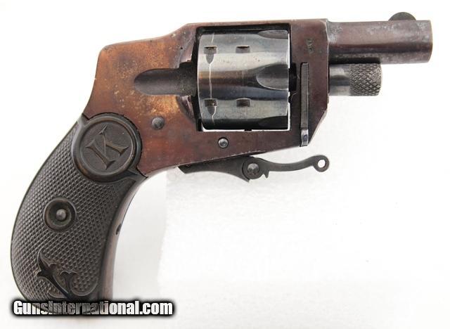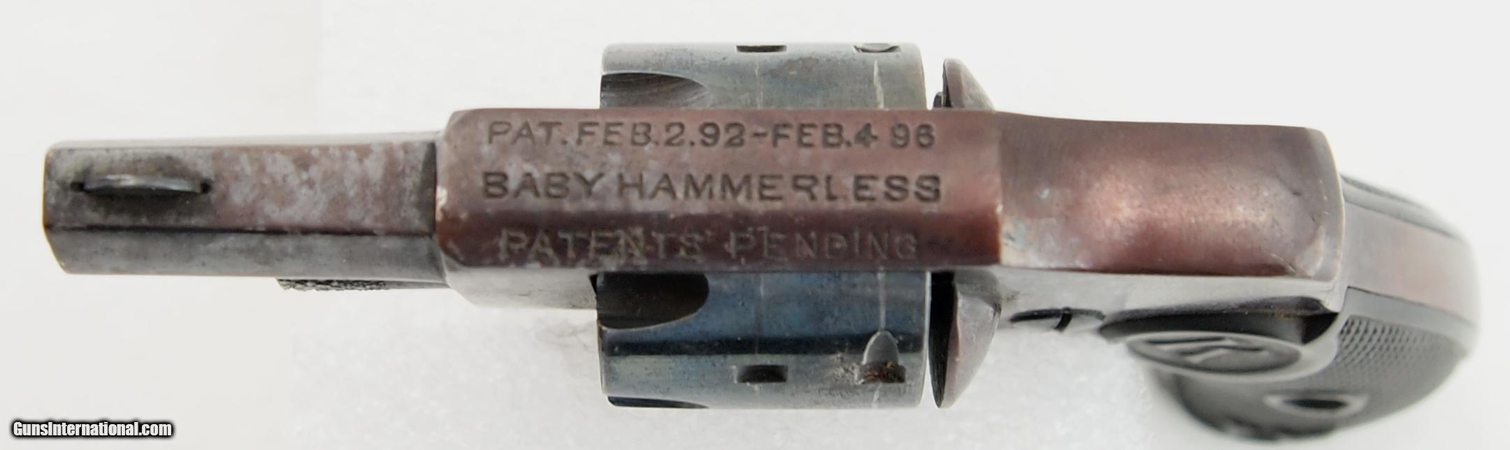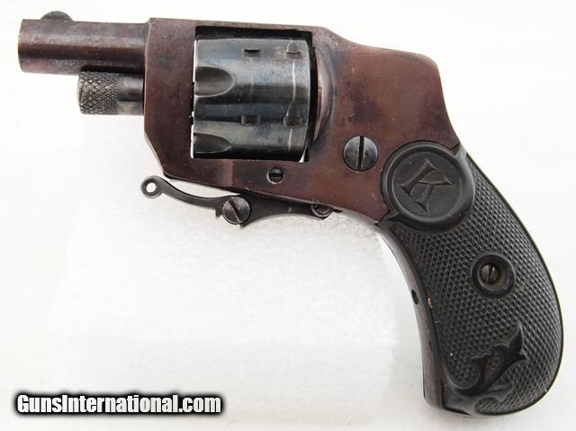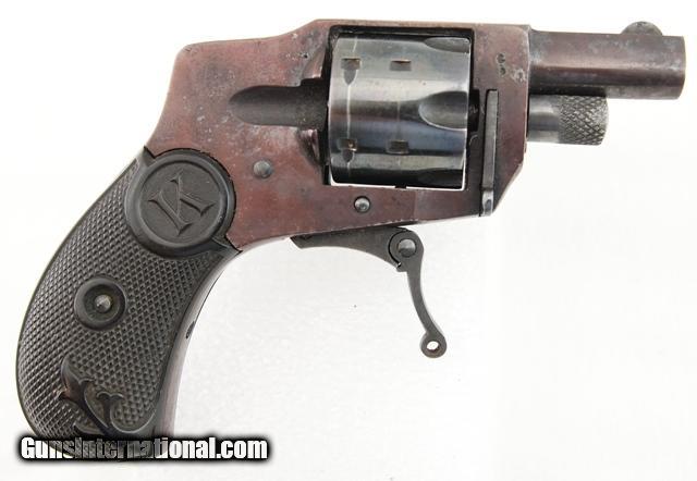 Description: Kolb, Baby Hammerlesss, .22 Cal, 1 1/4" bbl, blued finish with nice plum color, blade front sight, "BABY HAMMERLESS" "PAT.FEB.2.92-FEB.4 96" "PATENTS PENDING" clearly stamped in top of frame, folding trigger, double action works, and has original Kolb checkered black plastic grips. Refinished antique sold AS-IS-ONLY. Add 3% for Credit Card Shipping $25.00 SOLD |